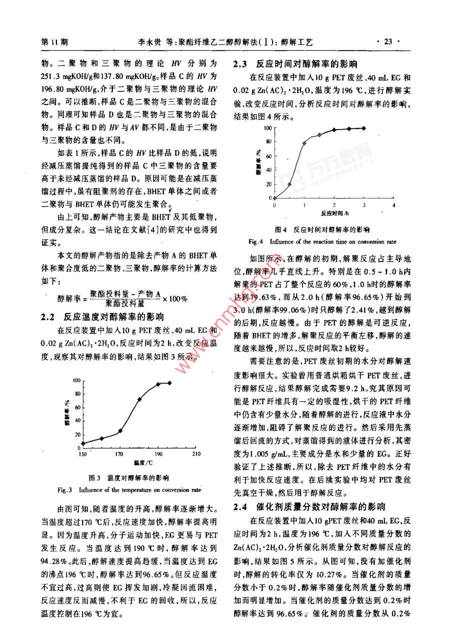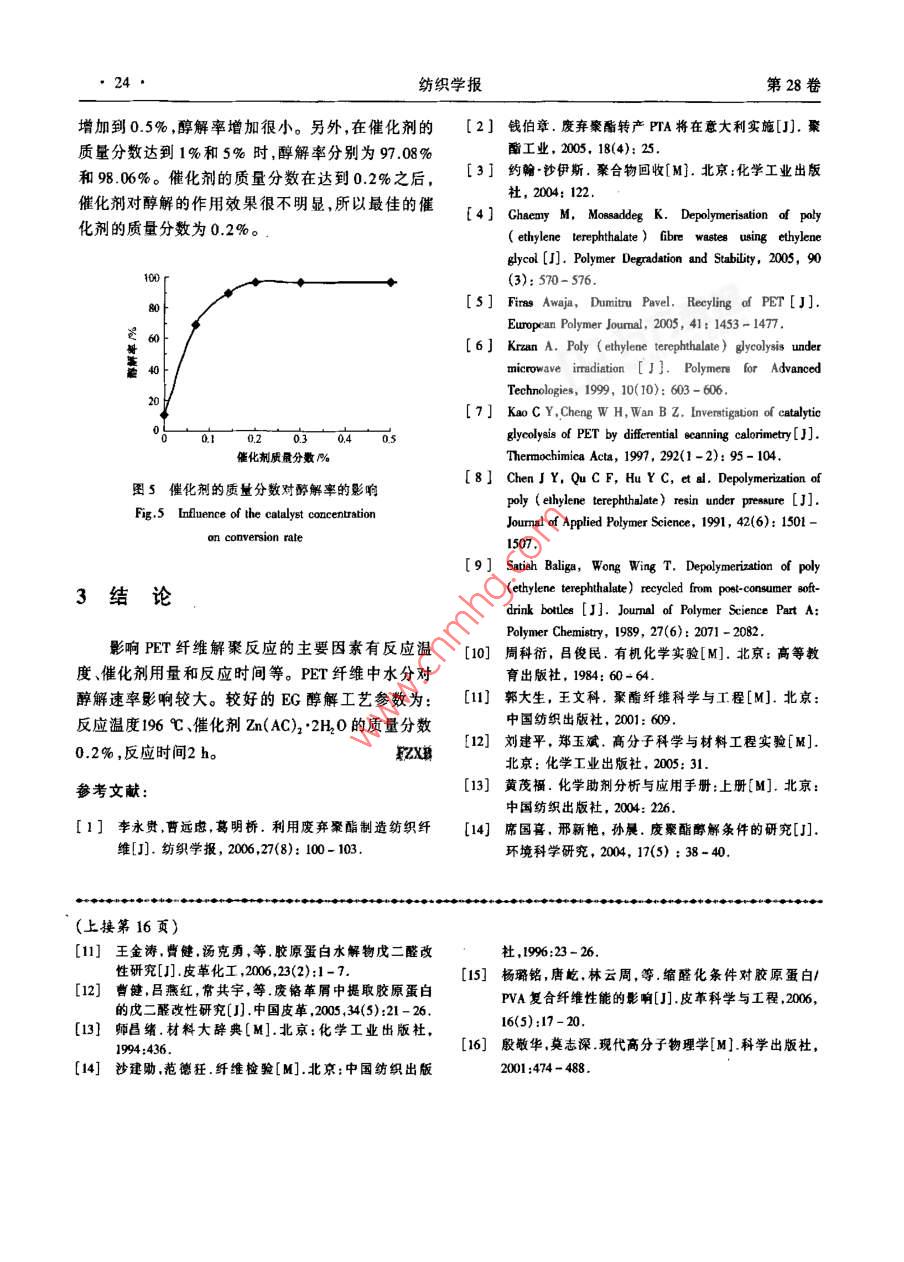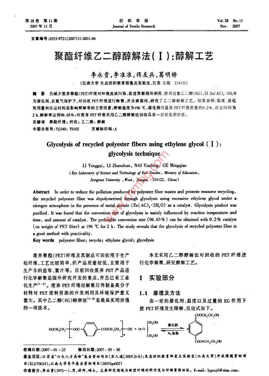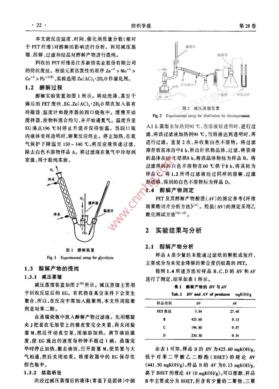 第28卷第11期織學(xué)報Vol 28 No 11200年1月Joumal of Textile Research文章編號:02539721{20071002104聚酯纖維乙二醇醇解法(I):醇解工藝?yán)钣蕾F,李準(zhǔn)準(zhǔn),佴友兵,葛明橋(江南大學(xué)生態(tài)紡織教育部重點實驗室,江蘇無錫214122)摘要為減少廢棄聚酯(PET)纖維對環(huán)境造成污染,促進(jìn)資源循環(huán)利用,使用過量乙二醇(EG),以zn(AC)2·2H20為催化劑,在氮氣保護(hù)下,對回收PET纖維進(jìn)行解聚,并分離提純,研究了乙二醇醇解工藝。結(jié)果表明:溫度、催化劑用量和反應(yīng)時間是影響醇解率的主要因素;醇解溫度為196℃,催化劑用量是PET纖維質(zhì)量的02%,反應(yīng)時間為2h醇解率達(dá)到965%;對廢棄PET纖維采用乙二醇醇解法回收具有一定的實用價值。關(guān)鍵詞聚酯纖維;回收;乙二醇;醇解中圖分類號:TQ340;TS02文獻(xiàn)標(biāo)識碼:AGlycolysis of recycled polyester fibers using ethylene glycol(I):glycolysis techniqueLI Yonggui, LI Zhunzhun, NAI Youbing, GE MingqiaoKey Laboratory of Science and Technology of Eco-Textiles, Ministry of EducationJiangnan Uninersity, Wuxi, Jiangnu 214122, China)Abstract In order to reduce the pollution produced by polyester fiber wastes and promote resource recyclingthe recycled polyester fiber was depolymerized through glycolysis using excessive ethylene glycol under anitrogen atmosphere in the presence of metal acetate(Zn( AC)2' 2H,0)as a catalyst. Glycolysis product wasurified. It was found that the conversion rate of glycolysis is mainly influenced by reaction temperature andtime,and amount of catalyst. The preferable conversion rate(96. 65%)can be obtained with 0. 2% catalyst(on weight of PET fiber)at 196C for 2 h. The study reveals that the glycolysis of recycled polyester fiber isa good method with practicalityKey words polysxylene glycol; gly廢棄聚酯(PET)纖維及其制品可回收用于生產(chǎn)本文采用乙二醇醇解法對回收的PET纖維進(jìn)短纖維,工藝比較簡單,但產(chǎn)品質(zhì)量較低,主要用于行化學(xué)解聚,研究醇解工藝。生產(chǎn)非織造布、絮片等。目前回收廢棄PET產(chǎn)品進(jìn)行化學(xué)解聚是國外研究開發(fā)的重點并且已有工業(yè)1實驗部分化生產(chǎn)-。廢棄PET纖維經(jīng)解來后再制備高分子材料對PET廢料資源的開發(fā)利用及環(huán)境保護(hù)意義1.1原理及方法重大。其中乙二醇(EG)醇解法“是最具實用價值在一定的催化劑、溫度以及過量的EG作用下的一項技術(shù)。使PET纖維發(fā)生降解,反應(yīng)式如下。tCOOCH CH,TOH +(-lCOOHCH, CH, OF收稿日期:2007-01-23修回日期:200-05-30基金項目:江蘇省“六大人才高峰”基金資助項目(蘇人邏[2005J66);生態(tài)劫織教育部重點實驗宣(江南大學(xué))開放課題資勦項目(KIEI624);江南大學(xué)青年基金資助項目(2005lq00作者簡介;李永貴(1972-),男,講師,碩士。主要研究領(lǐng)域為新型纖維材料開發(fā)與纖維資源四收。Emil:lgwd@sin,com22紡織學(xué)報第28卷本文就反應(yīng)溫度、時間、催化劑質(zhì)量分?jǐn)?shù)(相對于PET纖維)對醇解的影響進(jìn)行分析。利用減壓蒸溫度計餾、溶解、過濾和結(jié)品對醇解產(chǎn)物進(jìn)行提純。抽真空回收的PET纖維是江蘇新紡實業(yè)股份有限公司的紡絲廢絲。根據(jù)元素活潑性的順序Zn2>Mn2Co2>Pb2,實驗選用Zn(AC)22H10作催化劑。x棗兒1.2醇解過程醇解實驗裝置如圖1所示。將經(jīng)洗滌、真空干干燥塔型壓力計燥后的PET廢絲、EG、Zn(AC)22H2O順次加入裝有冷凝器、溫度計和攪拌器的四口燒瓶中。緩慢開動圖2減壓蒸餾裝置Fig 2 Experimental setup for distillation by decompression攪拌器,使物料混合均勻,并開始通氮氣。溫度升至EG沸點196℃時停止升溫并保持恒溫。當(dāng)四口瓶人1L蒸餾水加熱到90℃,當(dāng)溶液較透明時進(jìn)行過內(nèi)液體變得透明時解聚反應(yīng)終止。停止加熱,在氮濾,將該過濾液加熱到90℃,當(dāng)溶液達(dá)到透明時再氣保護(hù)下降溫至130-140℃。將反應(yīng)液快速過濾進(jìn)行過濾。重復(fù)2次,并收集白色不溶物。將過濾除去白色不溶物樣品A。將過濾液在氮氣中冷卻到液存放在冰浴中8h析出針狀物晶體,過濾將獲得室溫,用于提純實驗。的晶體在60℃焙烘8h,將該晶體物標(biāo)為樣品B。將過濾得到的白色不溶物在60℃烘于8h,將其標(biāo)為樣品C。將12所得過濾液經(jīng)過同樣的溶解、過濾和焙烘,得到的白色不溶物標(biāo)為樣品D1.4醇解產(chǎn)物測定PET及其醇解產(chǎn)物酸值(AV)的測定參考《纖維級聚酯切片分析方法》。羥值(HV)的測定采用乙溫度計?;瘻y試方法2-1。2實驗結(jié)果與分析圖1醇解裝置2.1醇解產(chǎn)物分析Fig. I Experimental setup for glycolysis樣品A是少量的未能通過濾紙的顆?;蚨汤w主要成分為未完全降解的聚合度仍較高的PET。13醇解產(chǎn)物的提純按照14所述方法對樣品B、C、D的BV和AV減壓蒸餾裝置如圖2所示。減壓蒸餾主要用進(jìn)行了測定結(jié)果如表1所示。1.3.1減壓蒸餾表1醇解產(chǎn)物的V與Av于回收反應(yīng)后的EG。有機(jī)物在真空條件下會發(fā)生Tab 1 HV and AV of produces mgKOH/ g聚合,所以,在反應(yīng)中需加入阻聚劑,本文所用阻聚樣品類別劑是對苯二酚。PET廢絲在蒸餾燒瓶中放入醇解產(chǎn)物過濾液。先用螺旋夾J把套在毛細(xì)管上的橡皮管完全夾緊,再關(guān)閉旋塞M,然后開動真空泵,用油浴加熱。調(diào)節(jié)油浴溫度,使EG流出的速度每秒鐘不超過1滴。蒸餾完D20.300y4畢時停止加熱,撤去油浴,