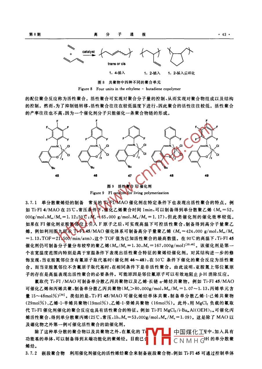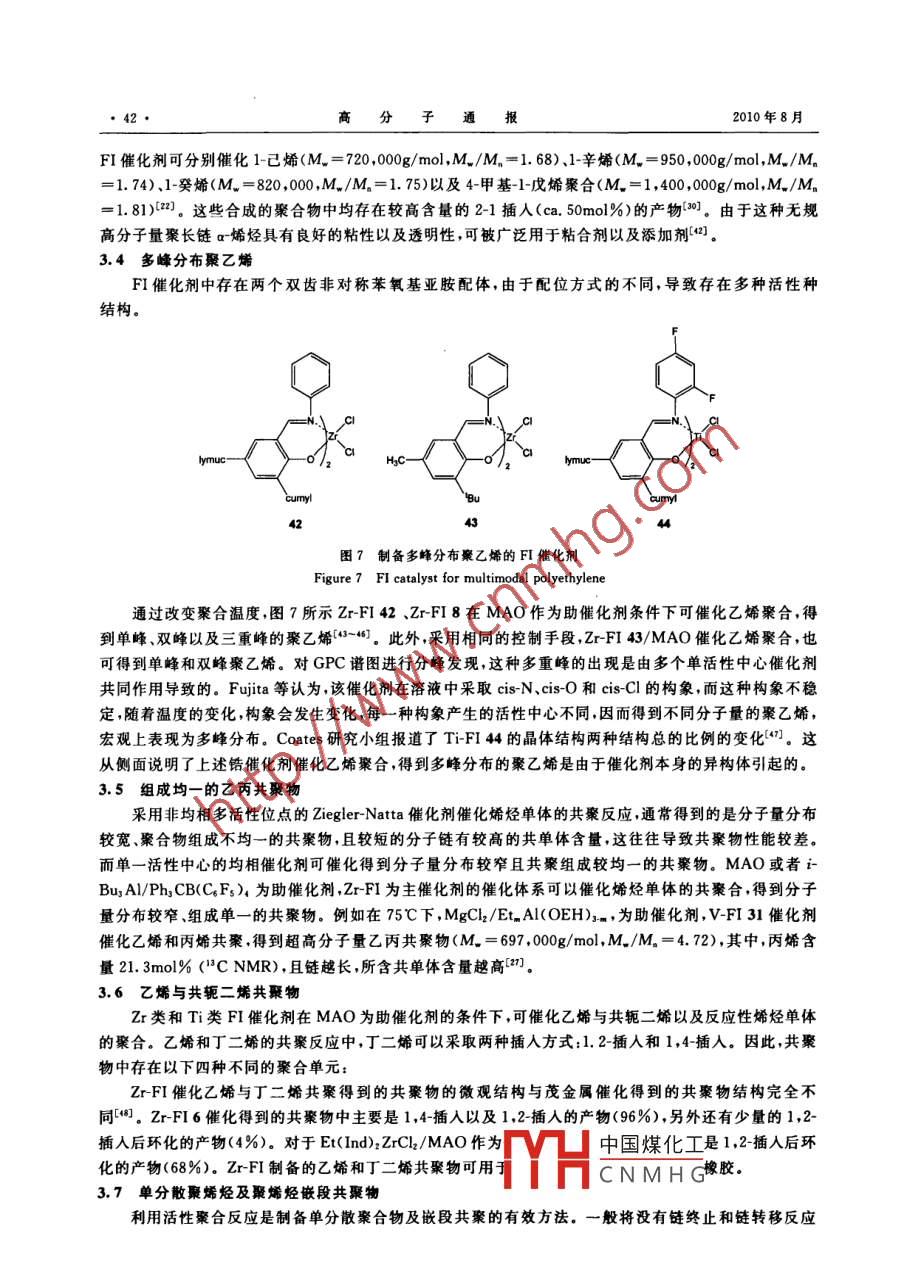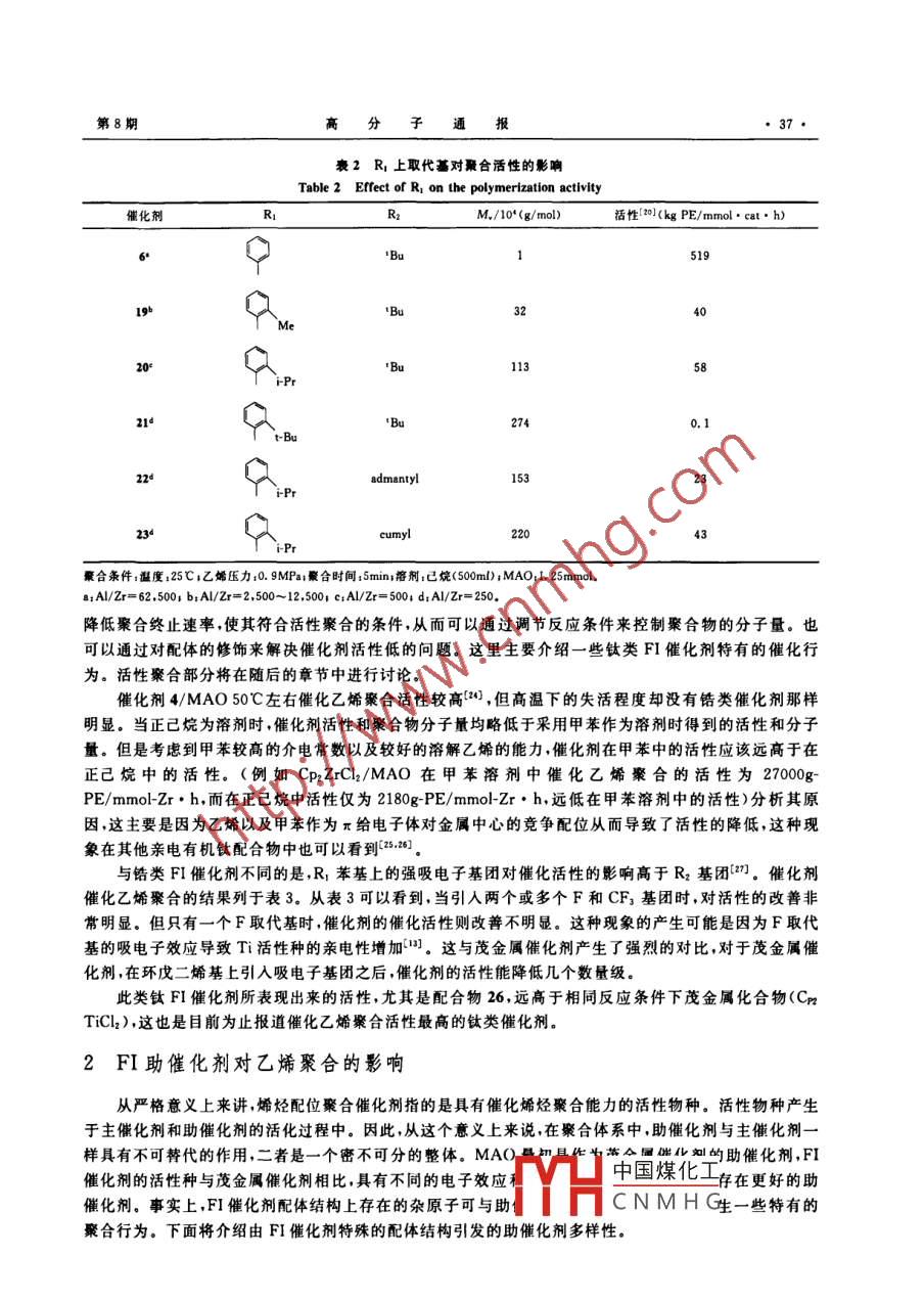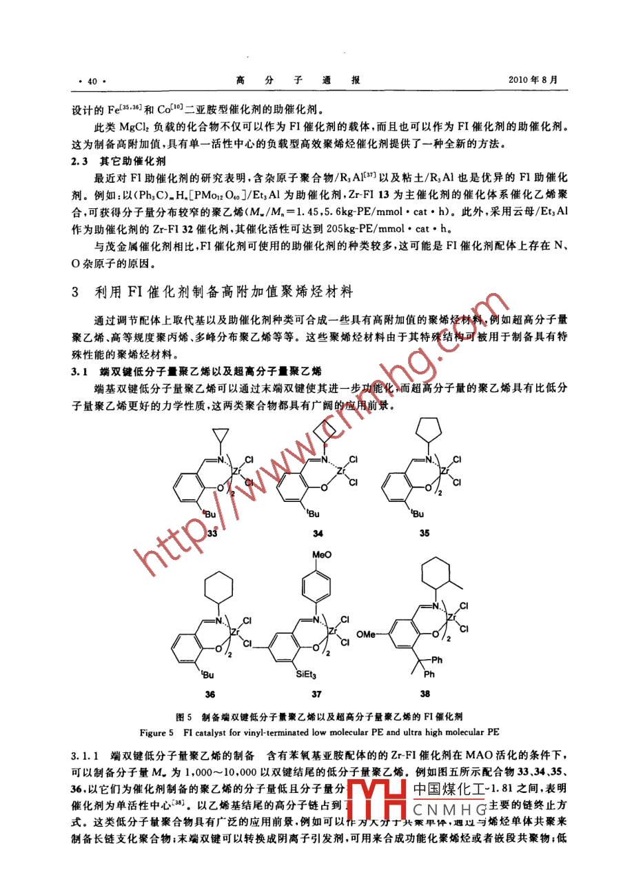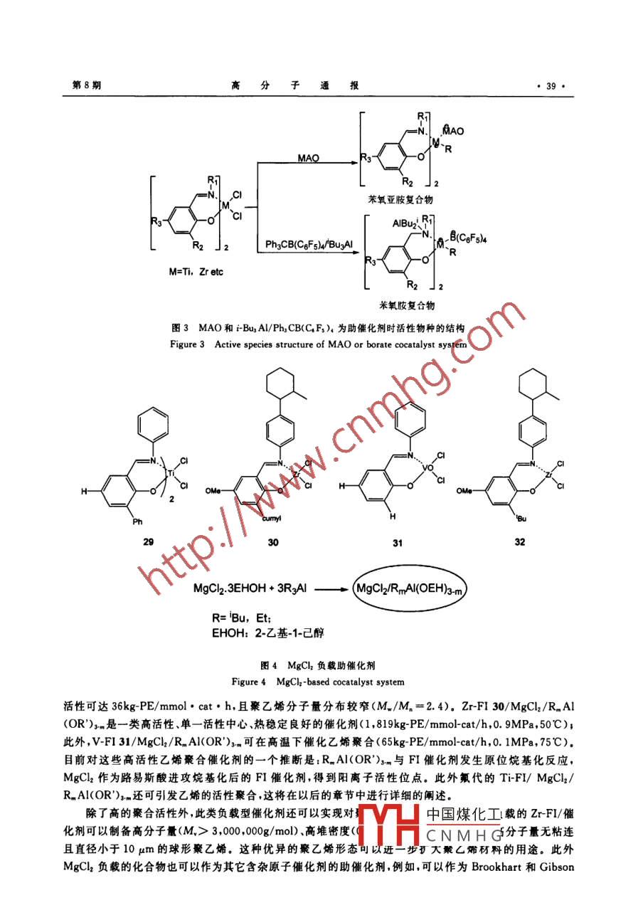 34高分子通報(bào)2010年8月用苯氧基亞胺型ⅣB族催化劑制備高附加值聚烯烴材料曾婉,李化毅2,李金閣2,張遼云1*,胡友良2(1.中國科學(xué)院研究生院,北京10049;2,中國科學(xué)院化學(xué)研究所,北京分子科學(xué)國家實(shí)驗(yàn)室,高分子科學(xué)與材料聯(lián)合實(shí)驗(yàn)室,工程塑料重點(diǎn)實(shí)驗(yàn)宣,北京100190)摘要:苯氧某亞胺型前過渡金屬烯烴聚合催化劑是近年來發(fā)展起來的一種非茂前過渡金屬烯烴聚合催化劑。該類催化劑由于具有催化烯烴合活性高、結(jié)構(gòu)可調(diào)性強(qiáng)、制備的聚合物可控性好等特點(diǎn)受到了廣泛的關(guān)注。本文綜述了此類催化劑的設(shè)計(jì)合成,介紹了FI主催化劑上不同取代基對(duì)催化劑活性、分子量的影響以及采用不同助催化劑條件時(shí)催化劑表現(xiàn)出來的特殊性能,重點(diǎn)介紹通過調(diào)節(jié)配體上取代基助催化劑以制備不同種類的高附加值聚烯烴材料。關(guān)鍵詞:前過渡金屬催化劑;苯氧基亞胺配體;烯烴聚合;高附加值聚烯烴材料引言聚烯烴材料由于具有性價(jià)比高、力學(xué)性能好、熱性能穩(wěn)定、加工性能優(yōu)異以及可循環(huán)利用等特點(diǎn)被廣泛應(yīng)用于工業(yè)、農(nóng)業(yè)建筑醫(yī)療衛(wèi)生、軍事科技以及日常生活等多個(gè)領(lǐng)域口,據(jù)統(tǒng)計(jì),2003年全世界聚烯烴年產(chǎn)量已超過一億噸,估計(jì)到2012年全球聚烯烴產(chǎn)量將達(dá)到1.7億噸口聚烯烴工業(yè)持續(xù)發(fā)展的一個(gè)關(guān)鍵因素在于聚烯烴催化劑的不斷革新。每一類新型催化劑的出現(xiàn)都會(huì)帶來新聚合工藝的變革以及聚烯烴新材料的發(fā)展。20世紀(jì)50年代初, Ziegler和 Natta5先后采用TC4-AEt催化劑體系合成了高密度聚乙烯以及利用 TiCl,-AlEt2Cl催化劑體系合成了全同立構(gòu)聚丙烯,開辟了聚烯烴工業(yè)的新紀(jì)元。20世紀(jì)80年代初 Kaminsky和Sinn(發(fā)現(xiàn)了甲基鋁氧烷,以其為助催化劑,大大推動(dòng)了茂金屬催化劑的發(fā)展。茂金屬催化劑不僅能制備高密度聚乙烯、線型低密度聚乙烯、全同立構(gòu)聚丙烯,而且能合成傳統(tǒng)催化劑難以合成的間同立構(gòu)聚丙烯、間同立構(gòu)聚苯乙烯等多種新型結(jié)構(gòu)的聚烯烴。在茂金屬催化劑發(fā)展的基礎(chǔ)上,人們又合成出了非茂過渡金屬催化劑用于烯烴聚合。1991年,Dow化學(xué)公司和 Exxon公司研制開發(fā)了新型單茂金屬的限定幾何構(gòu)型催化劑—CGC催化劑( Constrained Geometry Catalyst),配體含有一個(gè)環(huán)戊二烯和一個(gè)N雜原子。此后發(fā)展了不含環(huán)戊二烯配體的非茂過渡金屬催化劑,如1995年 Brookhart和 Gibson10分別報(bào)道了鐵、鉆為中心金屬的多亞胺類化合物,在甲基鋁氧烷(MAO)存在下具有催化烯烴聚合和齊聚的能力。1999年,日本三井化學(xué)公司 Fujita領(lǐng)導(dǎo)的研究小組報(bào)道了苯氧基亞胺型ⅣB前過渡金屬烯烴聚合催化劑山:,其通式如圖1。該類催化劑具有多種特殊的性能引起了人們廣泛的關(guān)注。該類催化劑也稱為F催化劑。國內(nèi)關(guān)于F1催化劑的綜述還較少中國科學(xué)院化學(xué)研究所的李化毅等研究了F催化劑的中心金屬電荷對(duì)催化劑活性的影響,金鷹泰等山重點(diǎn)總結(jié)催化劑的主要特征和催化機(jī)理。本文介紹了不同取代基對(duì)催化劑活性、分子量等的影響以及不同助催化劑的作用,重點(diǎn)介紹通過調(diào)節(jié)配體上取代基以及助催化劑種類制備具有高附加值的聚烯烴材料。1FI主催化劑配體取代基對(duì)催化性能的影響催化劑體系分為四個(gè)部分:過渡金屬配體、增長鏈以及單體配位位點(diǎn)。與傳統(tǒng)的以過渡金屬為催化基金項(xiàng)目:國家自然科學(xué)基金資助項(xiàng)目(No.20334030,No.5040302中國煤化工新基金研究項(xiàng)目(No.2008D5006-0501)和中國科學(xué)院研究生院院長基金A資助項(xiàng)CNMHG作者簡介:曾婉(1985-),女,中國科學(xué)院研究生院碩土研究生,主要從事烯烴催化劑合成的研究;通訊聯(lián)系人: E-mail: huylgiccasi zhangye第8期高分子通報(bào)劑設(shè)計(jì)中心觀念不同的是, Fujita等將注意力集中R于配體結(jié)構(gòu)設(shè)計(jì)上,認(rèn)為在催化過程中,配體以種更主動(dòng)的方式與金屬一起作用61,他們?cè)O(shè)計(jì)了以下幾種配合物(見圖2),發(fā)現(xiàn)配合物1無法合成,RM=TiZr Hf.V在MAO作用下,配合物2和3催化乙烯聚合活性RR3=烷基,芳香團(tuán)較低(見表1),含有苯氧亞胺配體的第IVB族過渡R2」2磯烷基,含雜原了基團(tuán)金屬配合物在催化乙烯聚合時(shí),卻表現(xiàn)了很高的催化活性,例如配合物4和5的催化活性也分別達(dá)到圖1FI催化劑通式了3.3kg/mmol·Zr·h和6.5kg/mmol·Zr;h,Figure 1 The general formula of the FI catalyst而配合物6的活性竟達(dá)到了519kg/mmol·zr·h,比相同反應(yīng)條件下Cp2ZrCl2/MAO(27kg/mmol·Zrh)的活性高近20多倍), Fujita等把這種苯氧基亞胺型前過渡金屬化合物命名為F催化劑。圖2設(shè)計(jì)的配合物結(jié)構(gòu)Figure 2 Structure of the complex designed by FujitaFI催化劑配體一般通過水楊醛與伯胺之間的席夫堿縮合反應(yīng)生成。在苯氧基亞胺的結(jié)構(gòu)中,主要存在三個(gè)可調(diào)節(jié)的取代基R1、R2和R3(如圖1所示)這三個(gè)取代基通過位阻效