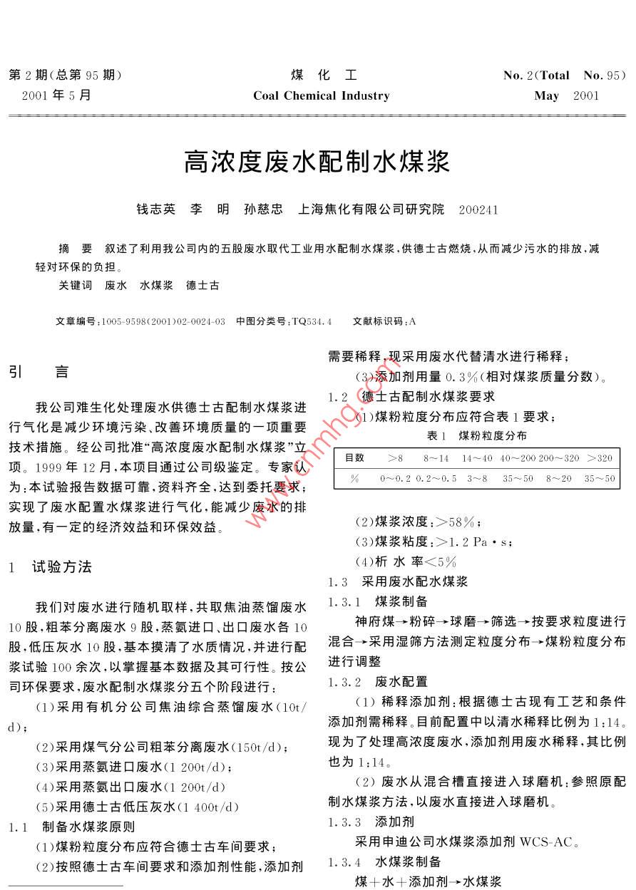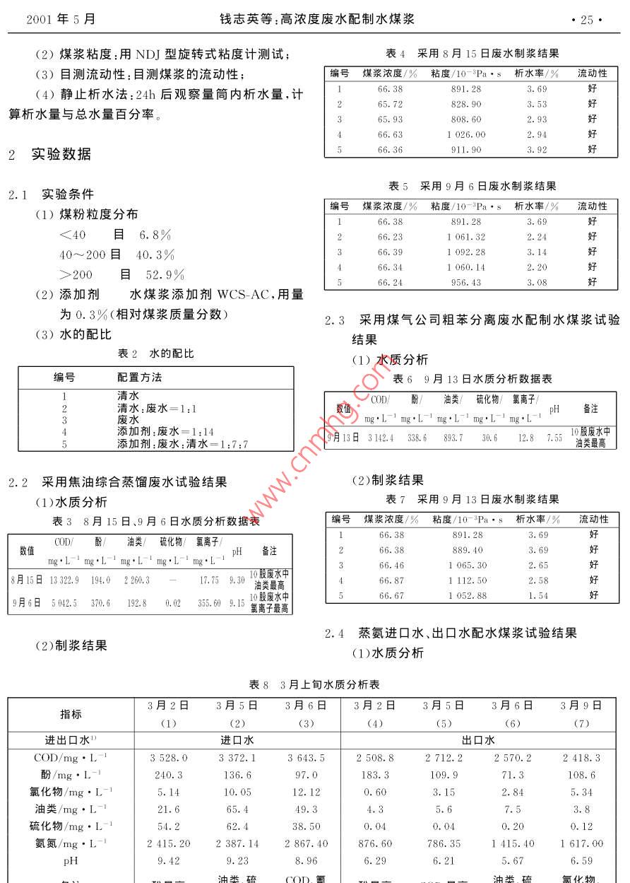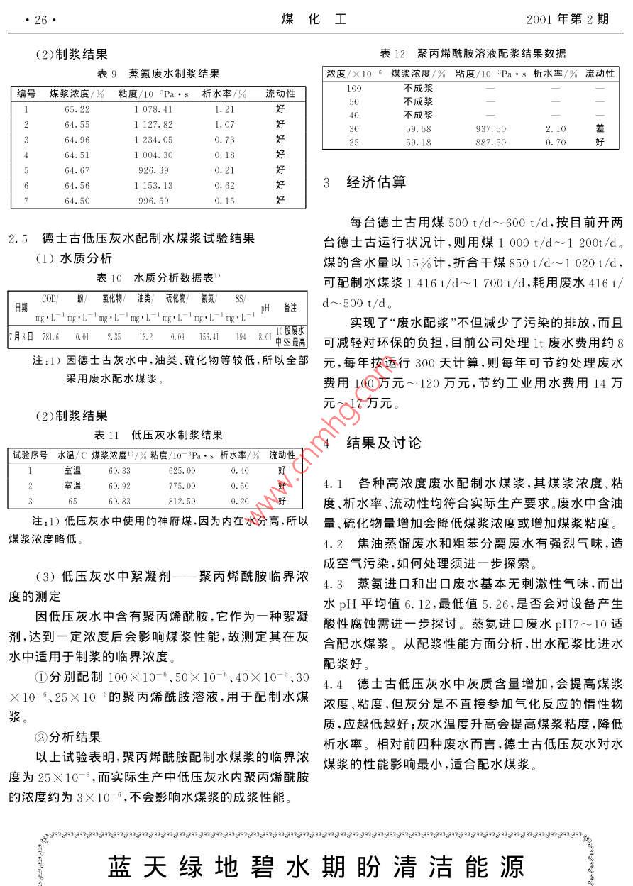 第2期(總第95期)煤化工No. 2(Total No 95)2001年5月Coal Chemical IndustryMay 2001高濃度廢水配制水煤漿錢志英李明孫慈忠上海焦化有限公司研究院200241摘要敘述了利用我公司內(nèi)的五股廢水取代工業(yè)用水配制水煤漿,供德士古燃燒,從而減少污水的排放,減輕對(duì)環(huán)保的負(fù)擔(dān)關(guān)鍵詞廢水水煤漿德士古文章編號(hào):1005-9598(2001)02-0024-03中圖分類號(hào):TQ534.4文獻(xiàn)標(biāo)識(shí)碼:A需要稀釋,現(xiàn)采用廢水代替清水進(jìn)行稀釋;引言(3)添加劑用量0.3%(相對(duì)煤漿質(zhì)量分?jǐn)?shù))。我公司難生化處理廢水供德士古配制水煤漿進(jìn)12德士古配制水煤漿要求行氣化是減少環(huán)境污染、改善環(huán)境質(zhì)量的一項(xiàng)重要(1)煤粉粒度分布應(yīng)符合表1要求技術(shù)措施。經(jīng)公司批準(zhǔn)“高濃度廢水配制水煤漿”立表1煤粉粒度分布目數(shù)88-1414~4040~200200~320>320項(xiàng)。1999年12月,本項(xiàng)目通過(guò)公司級(jí)鑒定。專家認(rèn)為:本試驗(yàn)報(bào)告數(shù)據(jù)可靠,資料齊全,達(dá)到委托要求0~0.20,2~0.53~835~508~2035~50實(shí)現(xiàn)了廢水配置水煤漿進(jìn)行氣化,能減少?gòu)U水的排放量,有一定的經(jīng)濟(jì)效益和環(huán)保效益(2)煤漿濃度:>58%;(3)煤漿粘度:>1.2Pa·s;試驗(yàn)方法(4)析水率<5%1.3采用廢水配水煤漿我們對(duì)廢水進(jìn)行隨機(jī)取樣,共取焦油蒸餾廢水3.1煤漿制備10股,粗苯分離廢水9股,蒸氨進(jìn)口、出囗廢水各10神府煤→粉碎→球磨→篩選→按要求粒度進(jìn)行股,低壓灰水10股,基本摸清了水質(zhì)情況,并進(jìn)行配混合→采用濕篩方法測(cè)定粒度分布→煤粉粒度分布漿試驗(yàn)100余次,以掌握基本數(shù)據(jù)及其可行性。按公進(jìn)行調(diào)整司環(huán)保要求,廢水配制水煤漿分五個(gè)階段進(jìn)行1.3.2廢水配置(1)采用有機(jī)分公司焦油綜合蒸餾廢水(10t/1)稀釋添加劑:根據(jù)德士古現(xiàn)有工藝和條件添加劑需稀釋。目前配置中以清水稀釋比例為1:14。(2)采用煤氣分公司粗苯分離廢水(150t/d);現(xiàn)為了處理高濃度廢水,添加劑用廢水稀釋,其比例(3)采用蒸氨進(jìn)口廢水(1200t/d);也為1:14(4)采用蒸氨出口廢水(1200t/d)(2)廢水從混合槽直接進(jìn)入球磨機(jī):參照原配(5)采用德士古低壓灰水(1400t/d)制水煤漿方法,以廢水直接進(jìn)入球磨機(jī)。1.1制備水煤漿原則1.3.3添加劑(1)煤粉粒度分布應(yīng)符合德士古車間要求采用申迪公司水煤漿添加劑wCS-AC(2)按照德士古車間要求和添加劑性能,添加劑1.3.4水煤漿制備煤+水十添加劑→水煤漿2001年5月錢志英等:高濃度廢水配制水煤漿(2)煤漿粘度:用NDJ型旋轉(zhuǎn)式粘度計(jì)測(cè)試表4采用8月15日廢水制漿結(jié)果(3)目測(cè)流動(dòng)性:目測(cè)煤漿的流動(dòng)性;「編號(hào)煤漿濃度/%粘度/10P·析水率/%流動(dòng)性(4)靜止析水法:24h后觀察量筒內(nèi)析水量,計(jì)66.38891.2865.72828.90算析水量與總水量百分率。65.93808.60好好好好66.631026.002實(shí)驗(yàn)數(shù)據(jù)66.36911.902.1實(shí)驗(yàn)條件表5采用9月6日廢水制漿結(jié)果(1)煤粉粒度分布編號(hào)煤漿濃度/%粘度10P·s析水率/%流動(dòng)性<40目6.8%1061.3210~200目40.3%l092.28目52.9%66.342.20好好好好好66,24956.43(2)添加劑水煤漿添加劑WCS-AC,用量為0.3%(相對(duì)煤漿質(zhì)量分?jǐn)?shù))2.3采用煤氣公司粗苯分離廢水配制水煤漿試驗(yàn)(3)水的配比結(jié)果表2水的配比(1)水質(zhì)分析配置方法表69月13日水質(zhì)分析數(shù)據(jù)表清水CD)酚/油類/硫化物/氯離子清水:廢水=1:1pH備注添加劑:廢水10殷廢水中添加劑:廢水:清水=1:7:79月13日3142436893723061.81,3油類最高2.2采用焦油綜合蒸餾廢水試驗(yàn)結(jié)果(2)制漿結(jié)果(1)水質(zhì)分析表7采用9月13日廢水制漿結(jié)果表38月15日、9月6日水質(zhì)分析數(shù)據(jù)表編號(hào)煤漿濃度/%粘度/10-Pa·析水率/%流動(dòng)性CD/酚/油類/硫化物/氯離子/數(shù)值pH備注66.38889.403.69好1065.30好8月15日1332.9194.02260.317.759油類最高1112.50月日503306B80235.60A10股廢水中1.54好2.4蒸氨進(jìn)口水、出口水配水煤漿試驗(yàn)結(jié)果(2)制漿結(jié)果(1)水質(zhì)分析表83月上旬水質(zhì)分析表指標(biāo)3月2日3月5日3月6日3月2日3月5日3月6日3月9日(3)進(jìn)出口水1進(jìn)囗水出囗水COD/mg.L3528.03372,13643.52508.82712,22570.22418,3酚/mg:L240.3136.697.0183.3108.6氯化物/mg·L110.0512.120.603.152.845.34油類/mg·L49.35.67.5硫化物/mg:L-54.238.500,040.200.12氨氮/mg·L.12415.2023872867.40786.351415.41617.006.296.215.676.59煤化工001年第2期(2)制漿結(jié)果表12聚丙烯酰胺溶液配漿結(jié)果數(shù)據(jù)表9蒸氨廢水制漿結(jié)果濃度/X10煤漿濃度/%粘度/10-Pa析水率/%流動(dòng)性編號(hào)煤漿濃度/%粘度/10-3Pa·s析水率/%流動(dòng)性不成漿不成漿65.221078.41好40不成漿64.551127.821234.05887.好67好3經(jīng)濟(jì)估算996.59好每臺(tái)德士古用煤500t/d~600t/d,按目前開(kāi)兩2.5德士古低壓灰水配制水煤漿試驗(yàn)結(jié)果臺(tái)德土古運(yùn)行狀況計(jì),則用煤1000t/d~1200t/d。(1)水質(zhì)分析煤的含水量以15%計(jì),折合干煤850t/d~1020t/d表10水質(zhì)分析數(shù)據(jù)表可配制水煤漿1416t/d~1700t/d,耗用廢水416t/COD/酌/氯化物/油類/破化物/氦氮SS日哥時(shí)H備注d~500t/d實(shí)現(xiàn)了“廢水配漿”不但減少了污染的排放,而且月:日61451:日1叫中可減輕對(du