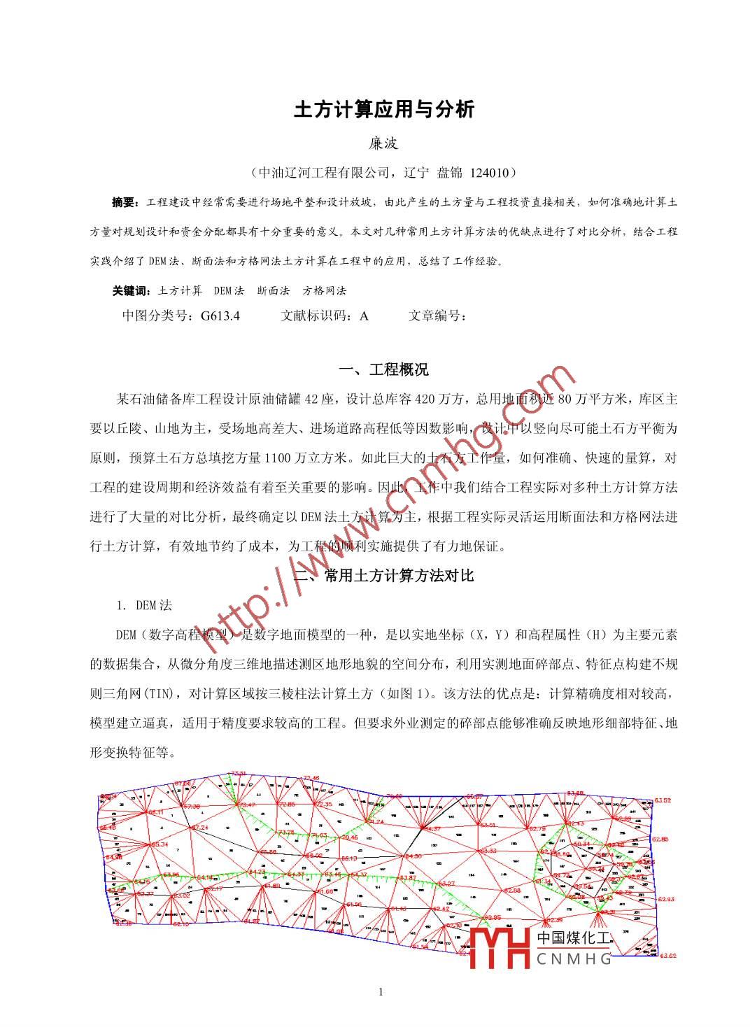 土方計(jì)算應(yīng)用與分析廉波(中油遼河工程有限公司,遼寧盤錦124010)商要: 工程建設(shè)中經(jīng)常需要進(jìn)行場地平整和設(shè)計(jì)放坡,由此產(chǎn)生的土方量與工程投資直接相關(guān),如何準(zhǔn)確地計(jì)算土方量對規(guī)劃設(shè)計(jì)和資金分配都具有十分重要的意義。本文對幾種常用土方計(jì)算方法的優(yōu)缺點(diǎn)進(jìn)行了對比分析,結(jié)合工程實(shí)踐介紹了DEM法、斷面法和方格網(wǎng)法土方計(jì)算在工程中的應(yīng)用,總結(jié)了工作經(jīng)驗(yàn)。關(guān)鍵詞:土方計(jì)算DEM法 斷面法方格網(wǎng)法中圖分類號: G613.4文獻(xiàn)標(biāo)識碼: A文章編號:一、工程概況某石油儲備庫工程設(shè)計(jì)原油儲罐42座,設(shè)計(jì)總庫容420萬方,總用地面積近80萬平方米,庫區(qū)主.要以丘陵、山地為主,受場地高差大、進(jìn)場道路高程低等因數(shù)影響,設(shè)計(jì)中以豎向盡可能土石方平衡為原則,預(yù)算土石方總填挖方量1100萬立方米。如此巨大的土石方工作量,如何準(zhǔn)確、快速的量算,對工程的建設(shè)周期和經(jīng)濟(jì)效益有著至關(guān)重要的影響。因此,工作中我們結(jié)合工程實(shí)際對多種土方計(jì)算方法進(jìn)行了大量的對比分析,最終確定以DEM法土方計(jì)算為主,根據(jù)工程實(shí)際靈活運(yùn)用斷面法和方格網(wǎng)法進(jìn)行土方計(jì)算,有效地節(jié)約了成本,為工程的順利實(shí)施提供了有力地保證。二、常用土方計(jì)算方法對比1. DEM法DEM (數(shù)字高程模型)是數(shù)字地面模型的一種,是以實(shí)地坐標(biāo)(X, Y) 和高程屬性(H)為主要元素的數(shù)據(jù)集合,從微分角度三維地描述測區(qū)地形地貌的空間分布,利用實(shí)測地面碎部點(diǎn)、特征點(diǎn)構(gòu)建不規(guī)則三角網(wǎng)(TIN),對計(jì)算區(qū)域按三棱柱法計(jì)算土方(如圖1)。該方法的優(yōu)點(diǎn)是:計(jì)算精確度相對較高,模型建立逼真,適用于精度要求較高的工程。但要求外業(yè)測定的碎部點(diǎn)能夠準(zhǔn)確反映地形細(xì)部特征、地形變換特征等。4611- ,2+中國煤化工。MHCNMHGY2a22圖1 DEM法土方計(jì)算模型2.斷面法斷面法是根據(jù)土方計(jì)算范圍將場地劃分為若干平行的橫截面,由兩斷面的平均截面積和斷面間距計(jì)算斷面間土方量,各斷面間土方量之和為總土方量(如圖2)。該方法主要應(yīng)用于道路、河流等狹長帶狀區(qū)域的方量計(jì)算,在大面積復(fù)雜區(qū)域和計(jì)算區(qū)域隨時變化的情況下,外業(yè)操作復(fù)雜,計(jì)算效率低,粗差較大。Sn+ ;v1v3|。 ..D1DDn圖2斷面法 土方計(jì)算模型3.方格網(wǎng)法方格網(wǎng)法是按照計(jì)算范圍將場地劃分為一定間距的方格,從地形圖或?qū)崪y得到每個方格角點(diǎn)的高程,對每個格網(wǎng)面按四角高程取平均值計(jì)算土方,各方格土方量之和為總土方量。該方法直觀、易懂、計(jì)算簡單,適用于大面積相對平緩的區(qū)域,但方格網(wǎng)四角高程多為內(nèi)插求得,計(jì)算中也未考慮地性線,所以在計(jì)算前必須手工加密高程點(diǎn),對于復(fù)雜地形加密點(diǎn)工作量大、計(jì)算精度與格網(wǎng)間距有關(guān)。三、工程應(yīng)用該石油儲備庫工程涉及土石方工程量巨大,場區(qū)內(nèi)地形復(fù)雜,地貌相對破碎,要求土方量算工作準(zhǔn)確快速,并且給出簡單、直觀容易判讀的土石方開挖前后場地高程數(shù)據(jù),以便準(zhǔn)確的按照設(shè)計(jì)要求施工.經(jīng)過現(xiàn)場對比分析我們發(fā)現(xiàn),場區(qū)內(nèi)土石方工作區(qū)域按地形變化特點(diǎn)可大致分為三個類型,工作中結(jié)合不同的地形特點(diǎn)采用合適的量算方法,節(jié)省了大量的人力物力,也為工程建設(shè)贏得了寶貴的時間。(1)北側(cè)邊坡爆破區(qū)、罐區(qū)山體表層植被土清理區(qū)、儲罐基礎(chǔ)巖石爆破區(qū)以及場區(qū)內(nèi)土石方二次倒運(yùn)土方集中了整個工程的大部分土石方量,這些區(qū)域共同表現(xiàn)為地形復(fù)雜、高程變化大,填挖方范圍不規(guī)則且涉及土石方量大,計(jì)算精度要求較高,比較符合DEM法的計(jì)算特點(diǎn),因此我們對這部分土石方采用了DEM法進(jìn)行計(jì)算,為了直觀起見我們配以方格網(wǎng)數(shù)據(jù)作為爆破和開挖的參考依據(jù)。(2)網(wǎng)箱基礎(chǔ)碾壓區(qū)、儲罐環(huán)梁開挖爆破、進(jìn)場道路以及排洪渠開挖部分均呈規(guī)則的條帶狀分布,采用斷面法土方計(jì)算更為方便快捷,為了使計(jì)算土方量準(zhǔn)確可靠,我們對部分土方以斷面法和DEM法分別進(jìn)行了量算對比,結(jié)果顯示兩種方法計(jì)算結(jié)果誤差率均小于3%,符合土方計(jì)算相關(guān)要求。(3)罐組區(qū)域場地平整、消防水池開挖都是在平緩區(qū)域進(jìn)行中國煤化工現(xiàn)場數(shù)據(jù)以便指導(dǎo)現(xiàn)場施工,對此我們采用方格網(wǎng)法進(jìn)了土方計(jì)算,計(jì)算精度MYHCNMH G四、結(jié)論(1) DEM法土石方計(jì)算中每-一個現(xiàn)場測量點(diǎn)都直接參與了計(jì)算,土石方測量精度與外業(yè)采集點(diǎn)的密度和準(zhǔn)確性密切相關(guān)。(2) 內(nèi)業(yè)計(jì)算前連接地性線,生成等高線,適當(dāng)加密地性線上高程點(diǎn),能有效提高計(jì)算精度。
