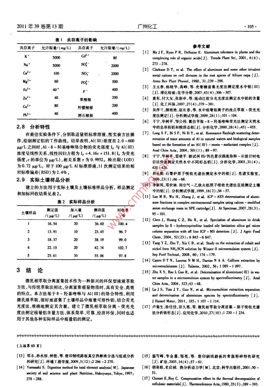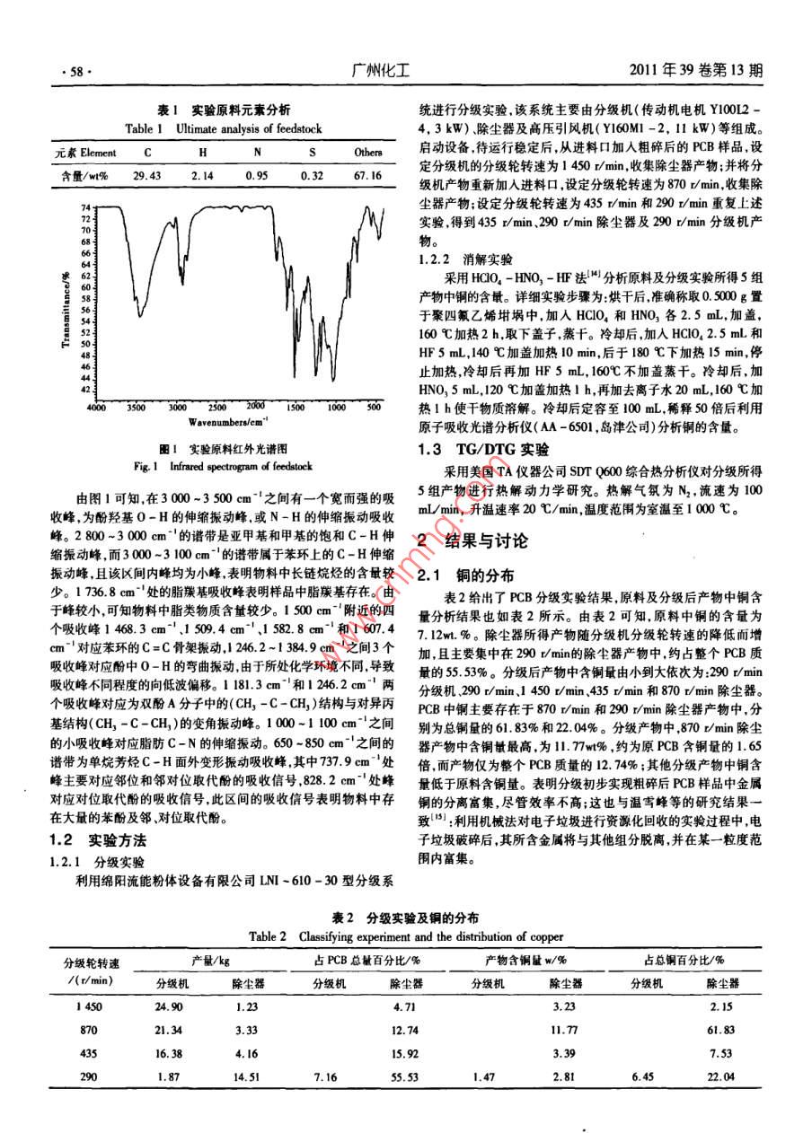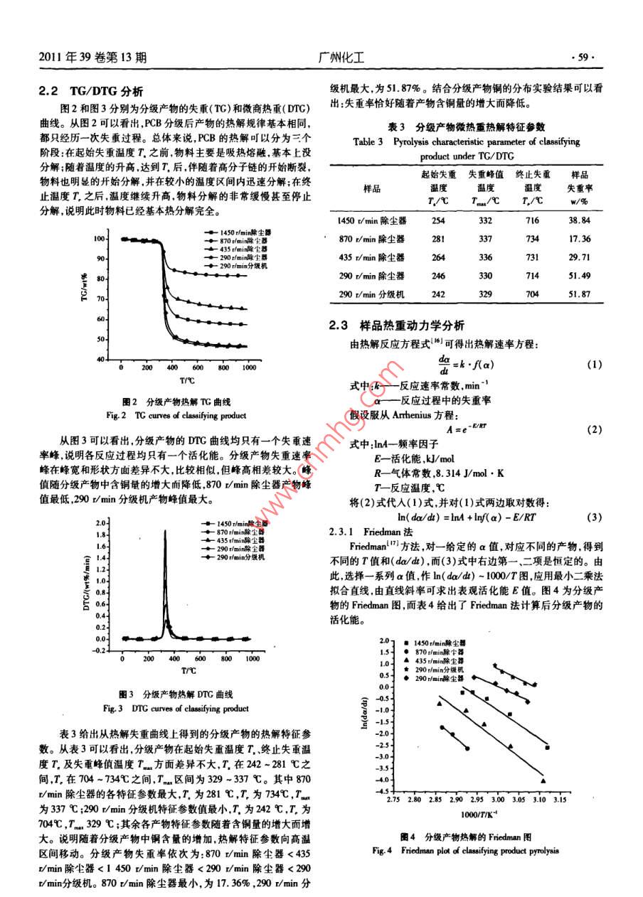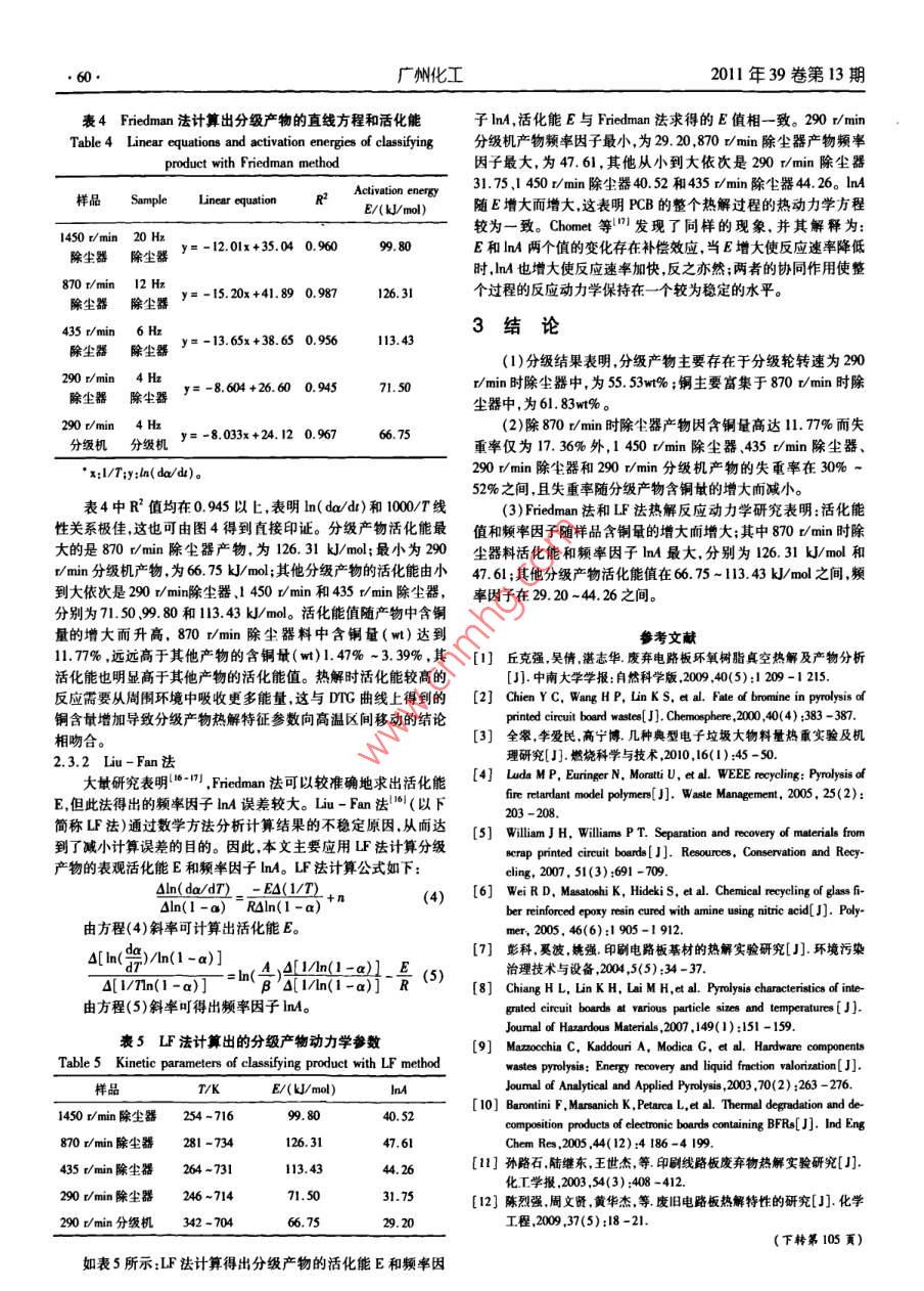 2011年39卷第13期廣州化工5PCB分級產(chǎn)物熱解動力學(xué)研究姜鵬飛,陳海焱,陳夢君(西南科技大學(xué)固體廢物處理與賚源化教育部重點(diǎn)實(shí)驗(yàn)室,四川綿陽621010)摘要以粗破碎后的PCB為例利用分級機(jī)對其進(jìn)行分級研究PCB中銅的分布與分級的關(guān)系,并對分級后產(chǎn)物進(jìn)行熱解動力學(xué)研究。分級結(jié)果表明,分級產(chǎn)物主要存在于分級輪轉(zhuǎn)速為290r/min的除塵器中,為553w%;銅主要富集于80r/mn除塵器中,為61.83w%。TG-DTG分析表明:除870r/min除塵器產(chǎn)物因含銅量高達(dá)1.77%而失重率僅為17.36%外,1450r/min除塵器435r/min除塵器、290r/min除塵器和290r/min分級機(jī)產(chǎn)物的失重率在30%-52%之間,且失重率隨分級產(chǎn)物含銅量的增大而減小。通過 Friedman法和UF法建立熱解反應(yīng)動力學(xué)模型,分別得出5組產(chǎn)物的熱解表觀活化能E和頻率因子lnA關(guān)鍵詞:PCB;分級;熱解;動力學(xué)Pyrolytically Dynamic Investigation on PCB Classifying ProductsJIANG Peng-fei, CHEN Hai-yan, CHEN Meng-jun( Key Laboratory of Solid Waste Treatment and Resource Recycle(SWUST), Ministry of Education, SouthwestUniversity of Science and Technology, Sichuan Mianyang 621010, China)Abstract: Coarsely crushed PCB sample was firstly classified to investigate the connection of copper distribution andclassification. The classified products were studied by pyrolysis kinetics analysis. The results showed that, after classifica-tion, the main product obtained at 290 r/min dust catcher was 55. 53wt%, while copper was mainly in the product of 870r/min dust catcher, 61. 83wt%. TG-DTA results indicated that the weight-loss ratio of the five classified products werein range of 30%-52%, except for the product obtained at 870 r/min dust catcher, only 17. 36%, which may be causeby its higher copper content(11. 77%). Finally, apparent activation energy(E)and frequency factor( InA)of this fiveproducts were investigated by Friedman and LF methodKey words: PCB; classification; pyrolysis; kinetics隨著科學(xué)技術(shù)的不斷發(fā)展電子產(chǎn)品更新?lián)Q代日益頻繁,電30.35w.%,玻璃纖維56.21wt.%和炭黑13.45w.%??偟膩碜訌U棄物的數(shù)量也不斷增加,其中廢棄印刷電路板(PCB)問題說,目前研究大多是對PCB熱解產(chǎn)物進(jìn)行分析來了解其中的反尤為顯著。PCB是一種熱固性復(fù)合材料,由覆銅薄板壓制而成,應(yīng)機(jī)理,而很少涉及原料成分對熱解反應(yīng)影響的探討。主要組成為:玻璃纖維、環(huán)氧樹脂銅箔和其他金屬(Sn、Pb,Fe本研究首先是利用分級機(jī)對粗碎后的PCB進(jìn)行分級,研究N等)。PCB廣泛應(yīng)用于電子工業(yè)、自動控制等領(lǐng)域據(jù)統(tǒng)計,分級機(jī)在分級輪轉(zhuǎn)速不同的情況下所產(chǎn)出的各產(chǎn)物細(xì)度與其各PCB在1994年的全球銷售額達(dá)到了200億美元,其中用于計算分級產(chǎn)物中銅的分布關(guān)系;再運(yùn)用TC/DTA法研究分級產(chǎn)物的機(jī)的銷售占46.6%2l。PCB的處理處置已經(jīng)成為當(dāng)前固體廢物熱解特性在此基礎(chǔ)上利用 Friedman法和LF法建立熱解動力學(xué)處理處置與資源化的難點(diǎn)之一,若處理不當(dāng)將會對環(huán)境和人類模型得出反應(yīng)動力學(xué)參數(shù)為電子廢棄物熱解處理技術(shù)的應(yīng)用健康構(gòu)成極大的威脅。因此,PB的高效快速處理成為了當(dāng)前提供理論依據(jù)。研究的一個熱點(diǎn)問題°熱解是一種比較合適的PCB處理技術(shù),它不僅能夠?qū)崿F(xiàn)環(huán)1原料與方法氧樹脂玻璃纖維等非金屬成分的資源化而且有利于其中金屬1.1原料成分的回收。目前已有大量文獻(xiàn)報道了PCB的熱解技術(shù)處實(shí)驗(yàn)原料PCB由廣東某電子垃圾處理公司提供,并已粗碎理10。孫路石等和陳烈強(qiáng)等對PCB樣品在N2氣氛下至0.25-0.5mm。PCB粉末元素分析結(jié)果和紅外光譜分別如的熱解反應(yīng)進(jìn)行研究,認(rèn)為熱解分為兩個階段并分別給出了兩表1和圖1所示。由表1可知實(shí)驗(yàn)原料中碳含量接近30%,并個階段的反應(yīng)動力學(xué)參數(shù)。 DENG Feng等對PB真空熱解含有少量的氮和硫其他為金屬(如銅等),玻璃纖維等。渣進(jìn)行分選和成分分析,結(jié)果表明熱解產(chǎn)物71.06%為固體渣308%為液體和25.86%為氣體。固體渣的主要成分為:金屬銅基金項(xiàng)目:四川省教育廳攻關(guān)項(xiàng)目(NO.08005);西南科技大學(xué)科研基金(09x7116)。作者簡介:姜鵬飛(1987-),男碩士研究生,從事固體廢棄物處理處置與資源化。E-msl: williams524@sina,com通訊作者陳海森男,教授博士。E-mal:chenhai-yan@163.com廣州化工2011年39卷第13期表1實(shí)驗(yàn)原料元素分析統(tǒng)進(jìn)行分級實(shí)驗(yàn),該系統(tǒng)主要由分級機(jī)(傳動機(jī)電機(jī)Y00L2-Table 1 Ultimate analysis of feedstock4,3kW)、除塵器及高壓引風(fēng)機(jī)(Y60MI-2,11kW)等組成。元素 Element C啟動設(shè)備,待運(yùn)行穩(wěn)定后,從進(jìn)料口加入粗碎后的PCB樣品,設(shè)含量/wt%29.432.140.950.3267l6定分級機(jī)的分級輪轉(zhuǎn)速為1450v/min,收集除塵器產(chǎn)物;并將分級機(jī)產(chǎn)物重新加入進(jìn)料口,設(shè)定分級輪轉(zhuǎn)速為870r/min,收集除塵器產(chǎn)物;設(shè)定分級輪轉(zhuǎn)速為435v/min和290v/min重復(fù)上述實(shí)驗(yàn)得到435r/min、290r/min除塵器及290r/min分級機(jī)產(chǎn)1.2.2消解實(shí)驗(yàn)采用HQO4-HNO-HF法分析原料及分級實(shí)驗(