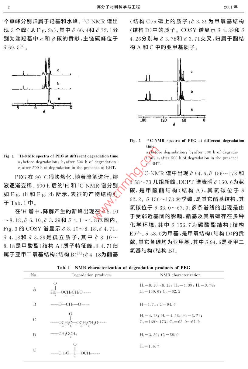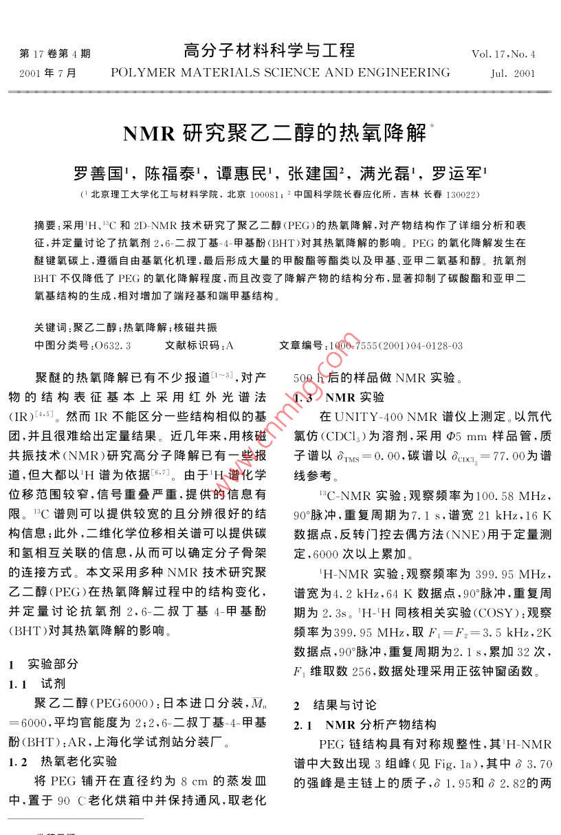 第17卷第4期高分子材料科學(xué)與工程Vol. 17. No. 42001年7月POLYMER MATERIALS SCIENCE AND ENGINEERINGJul.2001NMR研究聚乙二醇的熱氧降解羅善國',陳福泰1,譚惠民1,張建國2,滿光磊1,羅運(yùn)軍1北京理工大學(xué)化工與材料學(xué)院,北京100081;2中國科學(xué)院長春應(yīng)化所,吉林長春130022)摘要:采用H、C和2DNMR技術(shù)研究了聚乙二醇(PEG)的熱氧降解,對產(chǎn)物結(jié)構(gòu)作了詳細(xì)分析和表征,并定量討論了抗氧劑2,6-二叔丁基-4-甲基酚(BHT)對其熱氧降解的影響。PEG的氧化降解發(fā)生在醚鍵氧碳上遵循自由基氧化機(jī)理,最后形成大量的甲酸酯等酯類以及甲基、亞甲二氧基和醇??寡鮿〣HT不僅降低了PEG的氧化降解程度,而且改變了降解產(chǎn)物的結(jié)構(gòu)分布,顯著抑制了碳酸酯和亞甲二氧基結(jié)構(gòu)的生成,相對增加了端羥基和端甲基結(jié)構(gòu)關(guān)鍵詞:聚乙二醇;熱氧降解;核磁共振中圖分類號(hào):O632.3文獻(xiàn)標(biāo)識(shí)碼:A文章編號(hào):1000-7555(2001)04-0128-0聚醚的熱氧降解已有不少報(bào)道~3,對產(chǎn)500h后的樣品做NMR實(shí)驗(yàn)物的結(jié)構(gòu)表征基本上采用紅外光譜法1.3NMR實(shí)驗(yàn)(IR)4:5。然而IR不能區(qū)分一些結(jié)構(gòu)相似的基在 UNITY-400NMR譜儀上測定。以氘代團(tuán),并且很難給出定量結(jié)果。近幾年來,用核磁氯仿(CDCl3)為溶劑,采用φ5mm樣品管,質(zhì)共振技術(shù)(NMR)研究高分子降解已有一些報(bào)子譜以ns=0.0,碳譜以acn=77.00為譜道,但大都以H譜為依據(jù)。由于H譜化學(xué)線參考位移范圍較窄,信號(hào)重疊嚴(yán)重,提供的信息有C-NMR實(shí)驗(yàn):觀察頻率為100.58MHz限。C譜則可以提供較寬的且分辨很好的結(jié)90°脈沖,重復(fù)周期為7.1s,譜寬21kHz,16K構(gòu)信息;此外,二維化學(xué)位移相關(guān)譜可以提供碳數(shù)據(jù)點(diǎn),反轉(zhuǎn)門控去偶方法(NNE)用于定量測和氫相互關(guān)聯(lián)的信息,從而可以確定分子骨架定,6000次以上累加。的連接方式。本文采用多種NMR技術(shù)研究聚H-NMR實(shí)驗(yàn):觀察頻率為399.95MHz乙二醇(PEG)在熱氧降解過程中的結(jié)構(gòu)變化,譜寬為4.2kHz,64K數(shù)據(jù)點(diǎn),90·脈沖,重復(fù)周并定量討論抗氧劑2,6-二叔丁基4甲基酚期為2.3。H-H同核相關(guān)實(shí)驗(yàn)COsY):觀察(BHT)對其熱氧降解的影響頻率為399.95MHz,取F1=F2=3.5kHz,2K數(shù)據(jù)點(diǎn),90°脈沖,重復(fù)周期為2.1s,累加32次1實(shí)驗(yàn)部分F1維取數(shù)256,數(shù)據(jù)處理采用正弦鐘窗函數(shù)1.1試劑聚乙二醇(PEG6000):日本進(jìn)口分裝,M2結(jié)果與討論6000,平均官能度為2;2,6-二叔丁基4-甲基1NMR分析產(chǎn)物結(jié)構(gòu)酚(BHT):AR,上?;瘜W(xué)試劑站分裝廠。PEG鏈結(jié)構(gòu)具有對稱規(guī)整性,其H-NMR1.2熱氧老化實(shí)驗(yàn)譜中大致出現(xiàn)3組峰(見Fig.1a),其中δ3.70將PEG鋪開在直徑約為8cm的蒸發(fā)皿的強(qiáng)峰是主鏈上的質(zhì)子,δ1.95和δ2.82的兩中,置于90C老化烘箱中并保持通風(fēng),取老化2高分子材料科學(xué)與工程2001年個(gè)單峰分別歸屬于羥基和水峰。C-NMR譜岀(結(jié)構(gòu)C)a碳上的質(zhì)子;?3.39為甲氧基結(jié)構(gòu)現(xiàn)3個(gè)峰(見Fig.2a),其中δ60.4和δ72.1分(結(jié)構(gòu)D)中的質(zhì)子。COSY譜顯示δ4.39和δ別為端羥基中α和β碳的貢獻(xiàn),主鏈碳峰位于4.26分別與δ3.78和δ3.71交叉,歸屬于酯結(jié)構(gòu)A和C中的亞甲基質(zhì)子。Fig. 2 3C-NMR spectra of PEG at different degradationFig. 1H-NMR spectra of PEG at different degradation timea: before degradation i b: after 500 h of degradation:c: after 500 h of degradation in the presencea: before degradation: b: after 500 h of degradationof BHIc: after 500 h of degradation in the presence of Bht.PEG在90C很快熔化,隨著降解進(jìn)行,熔C-NMR譜中出現(xiàn)δ94.6、6156~173和液逐漸變稀。500h后的H和NMR譜分別58~73幾組新峰。DEPT譜表明160.6為叔如Fig.1b和Fig.2b所示,表征的產(chǎn)物結(jié)構(gòu)列碳,是甲酸酯結(jié)構(gòu)(結(jié)構(gòu)A),其氧碳位于δ于Tab.1中62.2。δ156~173為季碳,是其它酯基結(jié)構(gòu),其在H譜中,降解產(chǎn)生的新峰岀現(xiàn)在δ8.10氧碳位于δ63.0~67.9;多條譜線的出現(xiàn)是由8.18、06.10、03.39和δ4.1~4.8范圍內(nèi)于受鄰近基團(tuán)的影響,酯基及其氧碳存在多種Fig.3的COSY譜顯示δ8.10~8.18、64.71、化學(xué)環(huán)境,其中δ156.7為碳酸酯結(jié)構(gòu)(結(jié)構(gòu)64.18和δ3.39是孤立質(zhì)子,其中δ8.10E)。858.0為甲基,是甲氧結(jié)構(gòu)(結(jié)構(gòu)D)的貢8.18是甲酸酯(結(jié)構(gòu)A)質(zhì)子特征峰:04.71歸獻(xiàn)其它各碳均為亞甲基其中94.6是亞甲二屬于亞甲二氧基結(jié)構(gòu)(結(jié)構(gòu)B);04.18為酯基氧基結(jié)構(gòu)(結(jié)構(gòu)B)。Tab 1 NMR characterization of degradation products of PEGDegradation productsNMR characterizationH2=8.10~8.18;Hb=4.39;H=3.78;HC-OCH, CHO-Ca=160.6;Ch=62.2wO-CH2-OH=4.71;C=94.6wOCH C-OCH,CHOvCb=169~173;C=63.0~67.9Ca=156.7CH,OC-OCH第4期羅善國等:NMR研究聚乙二醇的熱氧降解Tab. 2 Effect of BHT on the degradation products of PEGSample compositionCarbonate MethylenedioxyFormateOther estersNo BHT2.752.131.589.182.050.20ontaining 0. 2% BHT1.250.16Based on the total peak area of oxygen-linked crabons[3 Hahner U, Habicher W D, Schwetlick K. PolymerDegradation and Stability, 1991. 34: 111-118.Polymer.1991,32(11):2014~2019[5 Wolfram Schnabel. Polymer Degradation: PrinciplesBkademie- verla3.0[6 