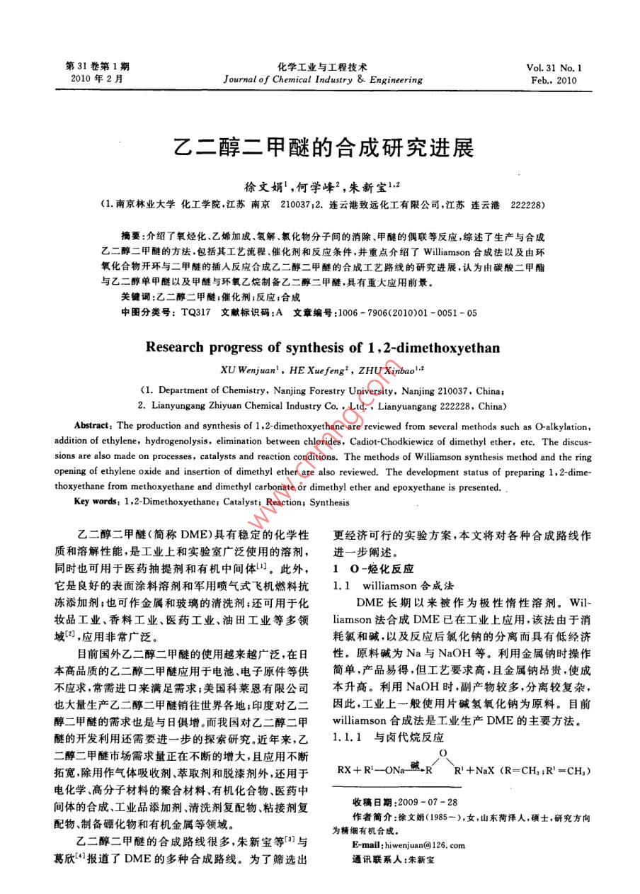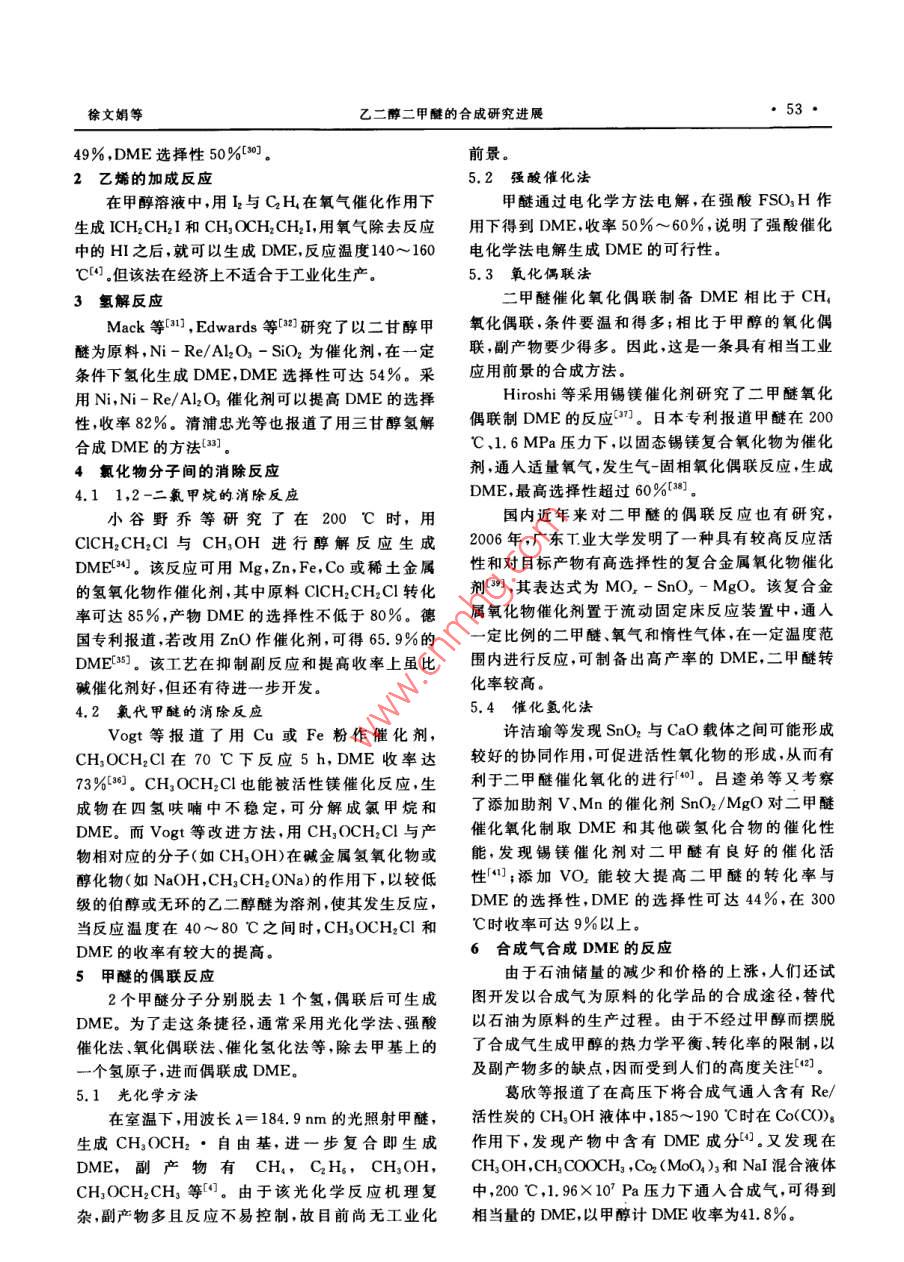 第31卷第1期化學(xué)工業(yè)與工程技術(shù)Vol. 31 No. 12010年2月Journal of Chemical Industry &engineeringFeb.2010乙二醇二甲醚的合成研究進(jìn)展徐文娟,何學(xué)峰2,朱新寶12(1.南京林業(yè)大學(xué)化工學(xué)院江蘇南京210037;2.連云港致遠(yuǎn)化工有限公司,江蘇連云港222228摘要:介紹了氧烴化、乙烯加成氫解氯化物分子間的消除、甲醚的偶聯(lián)等反應(yīng),綜述了生產(chǎn)與合成醇二甲醚的方法包括其工藝流程催化劑和反應(yīng)條件,并重點(diǎn)介紹了 williamson合成法以及由環(huán)氧化合物開環(huán)與二甲醚的插入反應(yīng)合成乙二醇二甲醚的合成工藝路線的研究進(jìn)展,認(rèn)為由碳酸二甲酯與乙二醇單甲醚以及甲醚與環(huán)氧乙烷制備乙二醇二甲醚具有重大應(yīng)用前景。關(guān)鍵詞:乙二醇二甲醚;催化劑;反應(yīng);合成中圖分類號(hào):TQ317文獻(xiàn)標(biāo)識(shí)碼:A文章編號(hào):1006-7906(2010)01-0051-05Research progress of synthesis of 1, 2-dimethoxyethanXU Wenjuan', HE Xuefeng, ZHU Xinbao.(1. Department oftry,Nanjing Forestry University, N2. Lianyungang Zhiyuan Chemical Industry Co, Ltd, Lianyuangang 222228, ChinaAbstract: The production and synthesis of 1, 2-dimethoxyethane are reviewed from several methods such as O-alkylationaddition of ethylene, hydrogenolysis, elimination between chlorides, Cadiot-Chodkiewicz of dimethyl ether, etc. The discus-sions are also made on processes, catalysts and reaction conditions. The methods of Williamson synthesis method and the ringopening of ethylene oxide and insertion of dimethyl ether are also reviewed. The development status of preparing 1,2-dime-thoxyethane from methoxyethane and dimethyl carbonate or dimethyl ether and epoxyethane is presented.Key words: 1, 2-Dimethoxyethane: Catalyst: Reaction: Synthesis乙二醇二甲醚(簡稱DME)具有穩(wěn)定的化學(xué)性更經(jīng)濟(jì)可行的實(shí)驗(yàn)方案,本文將對各種合成路線作質(zhì)和溶解性能,是工業(yè)上和實(shí)驗(yàn)室廣泛使用的溶劑,進(jìn)一步闡述同時(shí)也可用于醫(yī)藥抽提劑和有機(jī)中間體山。此外,1O-烴化反應(yīng)它是良好的表面涂料溶劑和軍用噴氣式飛機(jī)燃料抗1.1 williamson合成法凍添加劑;也可作金屬和玻璃的清洗劑;還可用于化DME長期以來被作為極性情性溶劑。wil-妝品工業(yè)、香料工業(yè)、醫(yī)藥工業(yè)、油田工業(yè)等多領(lǐng) lamson法合成DME已在工業(yè)上應(yīng)用,該法由于消域(,應(yīng)用非常廣泛耗氯和堿,以及反應(yīng)后氯化鈉的分離而具有低經(jīng)濟(jì)目前國外乙二醇二甲醚的使用越來越廣泛,在日性。原料堿為Na與NaOH等。利用金屬鈉時(shí)操作本高品質(zhì)的乙二醇二甲醚應(yīng)用于電池電子原件等供簡單,產(chǎn)品易得,但工藝要求高,且金屬鈉昂貴,使成不應(yīng)求常需進(jìn)口來滿足需求;美國科萊恩有限公司本升高。利用NaOH時(shí),副產(chǎn)物較多,分離較復(fù)雜,也大量生產(chǎn)乙二醇二甲醚銷往世界各地;印度對乙二因此,工業(yè)上一般使用片堿氫氧化鈉為原料。日前醇二甲醚的需求也是與日俱增。而我國對乙二醇二甲 williamson合成法是工業(yè)生產(chǎn)DME的主要方法。醚的開發(fā)利用還需要進(jìn)一步的探索研究。近年來,乙1.1.1與鹵代烷反應(yīng)二醇二甲醚市場需求量正在不斷的增大,且應(yīng)用不斷拓寬,除用作氣體吸收劑、萃取劑和脫漆劑外,還用于RX+Rl-ONa R-R R!+NaX(R-CH, R-CH,電化學(xué)、高分子材料的聚合材料、有機(jī)化合物醫(yī)藥中間體的合成、工業(yè)品添加劑清洗劑復(fù)配物粘接劑復(fù)收稿日期:2009-07-28配物、制備硼化物和有機(jī)金屬等領(lǐng)域作者簡介:徐文娟(1985-),女,山東菏澤人,碩士,研究方向精細(xì)有機(jī)合成乙二醇二甲醚的合成路線很多,朱新寶等與Ermail:hiwenjuan@126.com葛欣“報(bào)道了DME的多種合成路線。為了篩選出通訊聯(lián)系人:朱新寶化學(xué)T業(yè)與工程技術(shù)2010年第31卷第1期在堿性條件下,醇鈉與鹵代烴發(fā)生反應(yīng)生成醚,率與選擇性,發(fā)明了一種新型的復(fù)合催化劑1,該大部分為不對稱醚。鹵代烴可用氯甲烷、氯丁烷、氯化催化劑組成為:HBF4/BF3與H2SO4、HNO3芐等合成不同的醚該法已應(yīng)用于工業(yè)化生產(chǎn),但副H2PO4的質(zhì)量比優(yōu)選1:(0.3~5)。特別優(yōu)選的酸產(chǎn)物多需要大量的有機(jī)介質(zhì),增大了能耗。中國專利是H2SO4和H3PO4。利用這種催化劑體系,形成報(bào)道了以氯甲烷為甲基化劑合成DME的方法。較低量的副產(chǎn)物如二噶烷或三甘醇二甲醚,和較高1.1.2與烷基的無機(jī)酸酯的反應(yīng)比例的有價(jià)值物質(zhì)DME和二甘醇二甲醚2RONa+(R')2 CO3-2ROR+Na, cO1.3分子間的縮合反應(yīng)2RONa+(R),SO -2ROR+Na, SO.1.3.1縮醛還原法式中:R=CH3,R=CH3單醚與甲醛反應(yīng)生成縮醛化合物,后還原縮醛即用Na與乙二醇單甲醚(EM)在適當(dāng)配比下反可得到雙醚類化合物。常用的還原劑有金屬氫化物應(yīng),再加入硫酸二甲酯為催化劑,在85~90℃時(shí)恒溫金屬氫化物與三氯化鋁的混合物、三烷基硅烷、格式15min可得到DME雖然硫酸二甲酯活性高、易控化試劑與催化氫化還原。金屬催化劑一般較昂貴,實(shí)制但毒性大。碳酸二甲酯是一種反應(yīng)活性高無毒又際生產(chǎn)應(yīng)用較少,已有二甘醇醚縮甲醛氫化的廉價(jià)的甲基化劑,日本專利報(bào)道了以碳酸二甲酯為甲報(bào)道)基化劑,將乙