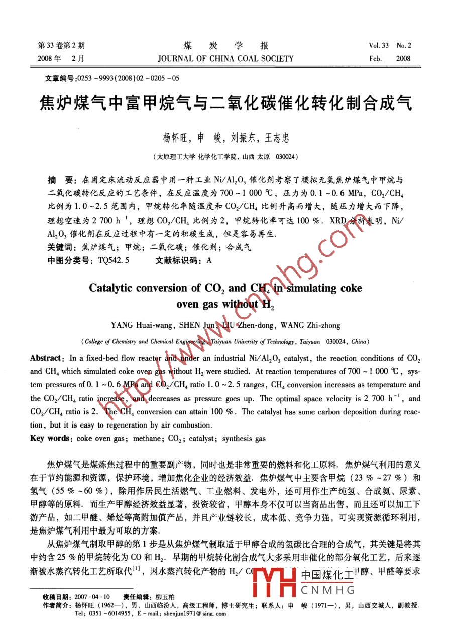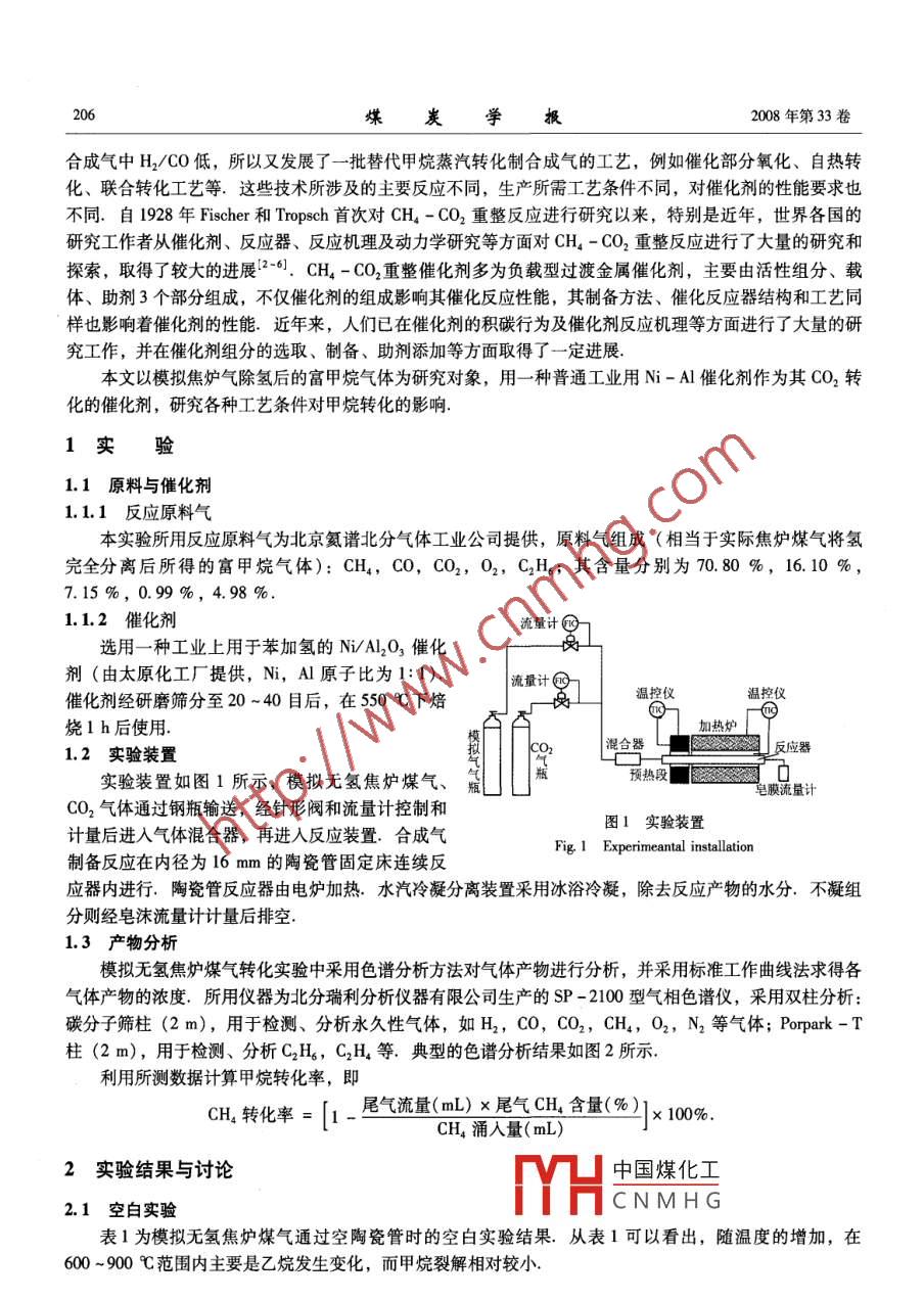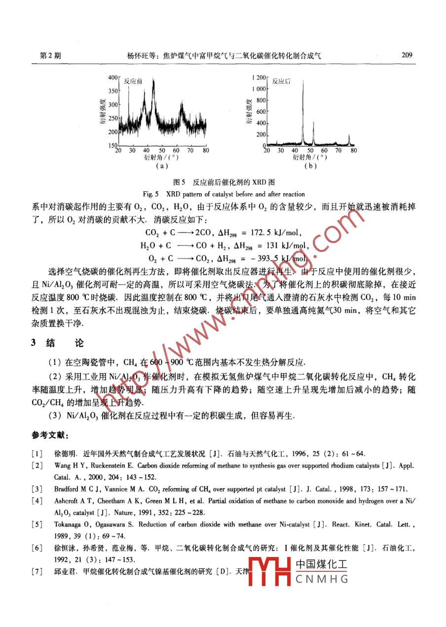 第33卷第2期煤炭學報Vol 33 No. 22008年2月JOURNAL OF CHINA COAL SOCIETYFeb2008文章編號:0253-9993(2008)02-0205-05焦爐煤氣中富甲烷氣與二氧化碳催化轉化制合成氣楊懷旺,申峻,劉振東,王志忠(太原理工大學化學化工學院,山西太原030024)摘要:在固定床流動反應器中用一種工業(yè)NiAO3催化劑考察了模擬無氫焦爐煤氣中甲烷與二氧化碳轉化反應的工藝條件,在反應溫度為700~1000℃,壓力為0.1~0.6MPa,CO2/CH4比例為1.0~2.5范圍內,甲烷轉化率隨溫度和CO2/CH比例升高而增大,隨壓力增大而下降,理想空速為2700h-1,理想CO2/CH4比例為2,甲烷轉化率可達100%,XRD分析表明,Ni/Al2O3催化劑在反應過程中有一定的積碳生成,但是容易再生關鍵詞:焦爐煤氣;甲炕;二氧化碳;催化劑;合成氣中圖分類號:TQ542.5文獻標識碼:ACatalytic conversion of CO, and CHa in simulating cokeoven gas without H 2YANG Huai-wang, SHEN Jun, LIU Zhen-dong, WANG Zhi-zhongCollege of Chemistry and Chemical Engineering, Taiyuan University of Technology, Taiyuan 030024, China)Abstract: In a fixed-bed flow reactor and under an industrial Ni/A2O, catalyst, the reaction conditions of CO 2and CHA which simulated coke oven gas without H2 were studied. At reaction temperatures of 700-1 000C, sys-tem pressures of 0. 1-0. 6 MPa and CO2/CHA ratio 1. 0-2. 5 ranges, CH. conversion increases as temperature andthe Co2/CH4 ratio increase, and decreases as pressure goes up. The optimal space velocity is 2 700 h", andCO,/CH ratio is 2. The CHa conversion can attain 100 % The catalyst has some carbon deposition during reaction, but it is easy to regeneration by air combustionKey words: coke oven gas; methane; CO2 catalyst; synthesis gas焦爐煤氣是煤煉焦過程中的重要副產(chǎn)物,同時也是非常重要的燃料和化工原料.焦爐煤氣利用的意義在于節(jié)約能源和資源,保護環(huán)境,增加焦化企業(yè)的經(jīng)濟效益,焦爐煤氣中主要含甲烷(23%~27%)和氫氣(55%~60%),除用作居民生活燃氣、工業(yè)燃料、發(fā)電外,還可用作生產(chǎn)純氫、合成氨、尿素、甲醇等的原料.而生產(chǎn)甲醇經(jīng)濟效益顯著,投資較省,甲醇本身不僅可以當商品出售,而且還可以加工下游產(chǎn)品,如二甲醚、烯烴等高附加值產(chǎn)品,并且產(chǎn)業(yè)鏈較長,成本低、競爭力強,可實現(xiàn)資源循環(huán)利用,是焦爐煤氣利用中最為可取的方案從焦爐煤氣制取甲醇的第1步是從焦爐煤氣制取適于甲醇合成的氫碳比合理的合成氣,其關鍵是將其中約含25%的甲烷轉化為CO和H2,早期的甲烷轉化制合成氣大多采用非催化的部分氧化工藝,后來逐漸被水蒸汽轉化工藝所取代,因水蒸汽轉化產(chǎn)物的H2/CH中國煤化工甲醇、甲醛等要求CNMHG收稿日期:2007-04-10責任編輯:柳玉柏作者簡介:楊懷旺(1962—),男,山西臨汾人,高級工程師,博土研究生;聯(lián)系人:申峻(1971-),男,山西交城人,副教授Tel:0351-6014955,E-mail:shenjun1971@sina.com堞炭學報2008年第33卷合成氣中H2CO低,所以又發(fā)展了一批替代甲烷蒸汽轉化制合成氣的工藝,例如催化部分氧化、自熱轉化、聯(lián)合轉化工藝等.這些技術所涉及的主要反應不同,生產(chǎn)所需工藝條件不同,對催化劑的性能要求也不同.自1928年 Fischer和 Tropsch首次對CH4-CO2重整反應進行研究以來,特別是近年,世界各國的研究工作者從催化劑、反應器、反應機理及動力學研究等方面對CH4-CO2重整反應進行了大量的研究和探索,取得了較大的進展26,CH4-CO2重整催化劑多為負載型過渡金屬催化劑,主要由活性組分、載體、助劑3個部分組成,不僅催化劑的組成影響其催化反應性能,其制備方法、催化反應器結構和工藝同樣也影響著催化劑的性能.近年來,人們已在催化劑的積碳行為及催化劑反應機理等方面進行了大量的研究工作,并在催化劑組分的選取、制備、助劑添加等方面取得了一定進展本文以模擬焦爐氣除氫后的富甲烷氣體為研究對象,用一種普通工業(yè)用N-A催化劑作為其CO2轉化的催化劑,研究各種工藝條件對甲烷轉化的影響1實驗1.1原料與催化劑1.1.1反應原料氣本實驗所用反應原料氣為北京氦譜北分氣體工業(yè)公司提供,原料氣組成(相當于實際焦爐煤氣將氫完全分離后所得的富甲烷氣體):CH4,CO,CO2,O2,C2H6;其含量分別為70.80%,16.10%,7.15%,0.99%,4.98%1.1.2催化劑流量計選用一種工業(yè)上用于苯加氫的N/Al2O3催化劑(由太原化工廠提供,N,AI原子比為1:1流量計催化劑經(jīng)研磨篩分至20~40目后,在550℃下焙溫控儀燒lh后使用模1.2實驗裝置混合器實驗裝置如圖1所示,模擬無氫焦爐煤氣、預熱段一皂膜流量計CO2氣體通過鋼瓶輸送,經(jīng)針形閥和流量計控制和圖1實驗裝置計量后進入氣體混合器,再進入反應裝置.合成氣Fig 1 Experimeantal installation制備反應在內徑為16mm的陶瓷管固定床連續(xù)反應器內進行.陶瓷管反應器由電爐加熱.水汽冷凝分離裝置采用冰浴冷凝,除去反應產(chǎn)物的水分.不凝組分則經(jīng)皂沫流量計計量后排空1.3產(chǎn)物分析模擬無氫焦爐煤氣轉化實驗中采用色譜分析方法對氣體產(chǎn)物進行分析,并采用標準工作曲線法求得各氣體產(chǎn)物的濃度.所用儀器為北分瑞利分析儀器有限公司生產(chǎn)的SP-2100型氣相色譜儀,采用雙柱分析:碳分子篩柱(2m),用于檢測、分析永久性氣體,如H2,CO,CO2,CH4,O2,N2等氣體; Carpark-T柱(2m),用于檢測、分析C2H6,C2H4等.典型的色譜分析結果如圖2所示利用所測數(shù)據(jù)計算甲烷轉化率,即CH4轉化率=尾氣流量(mL)x尾氣CH,含量(%)1×100%CH4涌入量(mL)2實驗