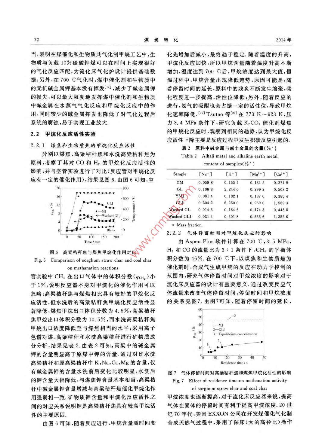 第37卷第2期煤炭轉(zhuǎn)化 Vol.37 No.22014年4月 COAL CONVERSION Apr. 201煤與生物質(zhì)共氣化制甲烷實驗研究劉園春1)李克忠2)熊志建3張榮3畢繼誠甘中學(xué)5摘要以煙煤和高粱秸稈為研究對象,在小型加壓固定床反應(yīng)器上考察了壓力3.5Ma及溫度700℃條件下制焦方式、煤/生物質(zhì)混合比和氣固接觸時間對煤與生物質(zhì)共氣化制取富甲烷氣體過程中水蒸氣氣化反應(yīng)和甲烷化反應(yīng)的影響結(jié)果表明,對于水蒸氣氣化反應(yīng),煤焦和生物質(zhì)焦共氣化時不能觀察到明顯的協(xié)同作用;對于甲烷化反應(yīng),高粱秸稈焦的甲烷化反應(yīng)活性高于煤焦的甲烷化反應(yīng)活性,當(dāng)對高粱秸稈水洗后,高粱秸稈焦的甲烷化反應(yīng)活性降低至與煤焦的甲烷化反應(yīng)活性相當(dāng),分析表明,水洗后高粱秸稈焦堿金屬鉀的含量顯著降低,說明高粱秸稈焦中堿金屬鉀的存在是高粱秸稈焦甲烷化反應(yīng)活性較高的主要原因增加氣固接觸時間,有利于提高甲烷產(chǎn)率關(guān)鍵詞生物質(zhì),共氣化,甲烷化,堿金屬中圖分類號TQ546.2能耗,若利用堿金屬含量相對較高的生物質(zhì)與煤進0引言行共氣化,不僅可避免催化劑回收或降低催化劑回我國是一個富煤、貧油、少氣的國家,在一次能收成本,而且可為生物質(zhì)規(guī)模高效利用提供一條有源結(jié)構(gòu)中,煤炭約占70%,石油約占23%,而天然氣效途徑,具有較好的經(jīng)濟效益和環(huán)境效益國內(nèi)外學(xué)僅占2%近年來,我國天然氣消費量以近1%的速者對煤和生物質(zhì)共氣化進行了較多的研究,重點是度增長,預(yù)計2020年缺口將達到2000億m3,對外從煤和生物質(zhì)混合顆粒的流化特性3、反應(yīng)過程依存度也將達到50%,嚴重影響了我國的能源安的協(xié)同效應(yīng)5和共氣化的工藝條件優(yōu)化[012等方全,并將制約我國經(jīng)濟和社會的發(fā)展.同時,我國煤面進行較為系統(tǒng)的研究,主要是以合成氣為目標(biāo)產(chǎn)炭傳統(tǒng)利用模式以燃燒利用為主,存在能量利用率物,研究的溫度范圍在800℃~1000℃,壓力一般低和污染重等諸多問題.利用我國豐富的煤炭資源,小于0.6MPa,而以甲烷為目標(biāo)產(chǎn)物時,要求反應(yīng)在將煤轉(zhuǎn)化為天然氣,不僅可以填補傳統(tǒng)天然氣市場低溫(小于800℃)、高壓(大于3.0Mpa)及催化劑的供求缺口,更好地滿足城鎮(zhèn)化擴大的需求,而且可存在下進行,以甲烷為目標(biāo)產(chǎn)物的煤和生物質(zhì)共氣以較好地改善我國能源消費結(jié)構(gòu).煤制合成天然氣化研究未見文獻報道.本研究使用固定床反應(yīng)器,考過程主要有煤經(jīng)“氣化后再催化合成”的兩步法和煤察了在低溫高壓及不同操作條件下,生物質(zhì)中堿金“原位直接轉(zhuǎn)化”的一步法.兩步法的主要特點是先屬對水蒸氣氣化反應(yīng)和甲烷化反應(yīng)活性的影響,為流在高溫氣化爐中氣化得到H2和CO,然后在甲烷化化床共氣化反應(yīng)器的設(shè)計和操作提供理論依據(jù).反應(yīng)器中把H2和CO合成為甲烷,過程的計算熱1實驗部分效率約60%;煤催化氣化屬于“原位直接轉(zhuǎn)化”的一步法,主要特點是煤在較低溫度(650℃~750℃)和1.1原料較高壓力(3.0MPa~4.0MPa)下,通過催化劑的選用內(nèi)蒙古不連溝煙煤(YM)和山西太原郊區(qū)催化作用,將煤在氣化爐內(nèi)直接轉(zhuǎn)化為富含CH4的的高粱秸稈(GL)為原料,將煤和生物質(zhì)在壓力合成氣,此過程的計算熱效率比兩步法的計算熱效3.5MPa,溫度700℃的氮氣氣氛固定床內(nèi)熱解率約高10%.2煤催化氣化產(chǎn)業(yè)化的難點之一是催60min后得到不連溝煤焦(MJ)和高粱秸稈焦化劑的回收獲取較高的催化劑回收率需要較高的(GLJ),粉碎至60目~80目(180m~250m)備國際科技合作計劃資助項目(2011DFA60610)和煤轉(zhuǎn)化國家重點實驗室自主研究課題(2011BWZ002)1)碩生中國科學(xué)院山西煤炭化學(xué)研究所煤轉(zhuǎn)化國家重點實驗0301太原中國科學(xué)院大100049北京2助理研究員3)副研究員;4)研究員,中國科學(xué)院山西煤炭化學(xué)研究所煤轉(zhuǎn)化國家重點實驗室,030001太原;5)博士、教授新奧科技發(fā)展有限公司煤基低碳能源國家重點實驗室,65001河北廊坊收稿日期:2013-04-04;修回日期:2013-05-0670煤炭轉(zhuǎn)化2014年用,原料的工業(yè)分析和元素分析結(jié)果見表1表1原料的工業(yè)分析和元素分析(%1.2實驗裝置 Table Proximate and ultimate analysis of samples(%)P固定床反應(yīng)器由內(nèi)徑D20mm不銹鋼反應(yīng)管 Proximate analysis,ad Ultimate analysis,d Sample M V A CH NS制成,長度900mm,其中溫度均勻段250mm,采用y10.6526.2214.1967.424.0510.861.140.65三段電加熱;設(shè)計溫度800℃,設(shè)計壓力4MPa.固G7.2470.5512.44.85.3635.650.990.21定床反應(yīng)器裝置見圖1,去離子水和反應(yīng)氣體分別mj0.13.57.227.01.390.491.040.82glJ0.3811.8233.7662.721.150.910.800.53由雙柱塞泵和質(zhì)量流量計控制,經(jīng)過預(yù)熱器和氣化10%K2CO3MJ5.279.5426.8966.120.822.811.030.84器輸入反應(yīng)器系統(tǒng)水蒸氣和少量的焦油經(jīng)過氣液分 Mass fraction.離罐冷凝,氣相產(chǎn)物經(jīng)濕式流量計計量后收集分析. Hopper Fitter4① Fitter3①H Fitter Collect H. Liquid/gas Filter Wet gas meter separator Water pump5圖1固定床反應(yīng)器裝置 Fig. Schematic diagram of the fixed-bed reactor apparatus 1-Relief valve; 2-Globe valve; 3-Stop valve: 4-Check v