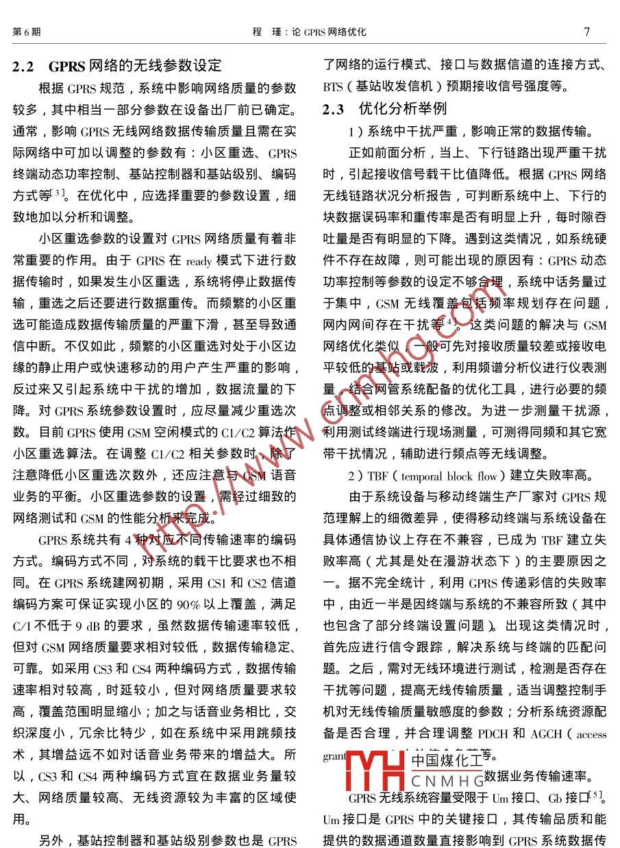 第20卷第6期江蘇通信技7Vol.20 No.62004年12月Jiangsu Communication TechnologyDec.2004文章編號:1007-9513( 2004 06-0005-04論GPRS網(wǎng)絡優(yōu)化程瑾(江蘇移動通信有限責任公司,江蘇南京210029 )摘要:GPRS(通用分組無線業(yè)務)將移動通信與分組交換技術相結合,為移動客戶提供因特網(wǎng)等數(shù)據(jù)通信業(yè)務,在近年來得到快速發(fā)展。簡要介紹了GPRS網(wǎng)絡優(yōu)化特點,分析了優(yōu)化原理,最后給出部分優(yōu)化實例。關鍵詞:通用分組無線業(yè)務;全球移動通信系統(tǒng);優(yōu)化中圖分類號: TN929.53文獻標識碼: A與原有的GSM相比, GPRS具有永遠在線、按等級的服務, GPRS網(wǎng)絡優(yōu)化是必不可缺的環(huán)節(jié)。量計費、快速登錄、高速傳送數(shù)據(jù)等特點??蔀橛?.1 GPRS 對GSM網(wǎng)絡資源的影響戶提供WAP(無線應用協(xié)議)承載、電子郵件、GPRS是利用GSM網(wǎng)絡的空閑資源來提供服務掌上接入因特網(wǎng)、KJava 應用服務,以及支持諸如的,其占用的無線信道資源有專用PDCH(packet.為任意的企業(yè)集團客戶建立虛擬專網(wǎng)等行業(yè)應用。data taffic channel )與隨機的PDCH。由于在系統(tǒng)設由于其較為突出的性能和廣泛的應用范圍,CPRS計時話音業(yè)務優(yōu)先于數(shù)據(jù)業(yè)務,如果小區(qū)中沒有設在國內外受到了用戶的普遍喜愛,在近年來得到了定FPDCH( fixed PDCH),當TCH ( taffece channel )較為迅速的增長。發(fā)生擁塞時,系統(tǒng)將關閉GPRS服務,此時進行的GPRS也將被中止,包括在PCU ( packet control unit )1 GPRS 網(wǎng)絡優(yōu)化的特點中等待傳輸?shù)臄?shù)據(jù)將會被丟棄;如果小區(qū)中設定了由于話音和GPRS業(yè)務共享相同的無線資源,FPDCH,話音業(yè)務的擁塞不會造成CPRS的停止,如何有效地利用資源; GPRS以GSM作為其承載但是數(shù)據(jù)傳輸速率將受到影響。顯然,由于2網(wǎng)共網(wǎng),這決定了GPRS網(wǎng)絡優(yōu)化具有與GSM網(wǎng)絡優(yōu)化享相同的無線資源,存在著根據(jù)業(yè)務量進行資源合相互關聯(lián)、相互制約的特點,因此,加強GSM無理優(yōu)化分配的問題。線環(huán)境的優(yōu)化又對GPRS 優(yōu)化起到非常重要的作如何有效地利用信道資源,動態(tài)地向每個用戶用;GPRS在具體應用時,又會受到網(wǎng)絡和終端現(xiàn)分配位于同一載頻上的時隙,支持上下行不對稱的實條件的制約,存在轉接時延;數(shù)據(jù)在通過無線鏈傳輸;如何根據(jù)業(yè)務流量,合理分配話音和數(shù)據(jù)業(yè)路傳輸?shù)倪^程中,易受到干擾或網(wǎng)絡資源配置問務固定信道數(shù),滿足2項業(yè)務的均衡發(fā)展,從而滿題,可能發(fā)生分組數(shù)據(jù)丟失或出錯的情況,影響網(wǎng)足用戶對0nS和傳輸諫率的需求,均為CPRS網(wǎng)絡中國煤化工絡傳播質量。提高CPRS服務質量,為用戶提供高優(yōu)化Y片CNMHG收稿日期: 2004-10-09作者簡介:程瑾(1962--),女,江蘇南京人,工程師,曾任江蘇移動通信有限責任公司網(wǎng)絡部副經(jīng)理,多年從事移動通信網(wǎng)絡建設和維護工作。6江蘇通信技術2004年1.2 GPRS 對網(wǎng)絡干擾的分析生影響?;贕PRS網(wǎng)絡的特殊性,GPRS的優(yōu)化任何移動通信系統(tǒng)都存在干擾問題。干擾造成工作應基于網(wǎng)絡完好、無硬件故障前提下, 從網(wǎng)絡了系統(tǒng)接收信號載干比(C/I)下降、接收信號失資源配置和統(tǒng)計分析、關鍵參數(shù)設置、干擾分析及真,影響到通信的正常進行1。對GSM而言,干消除等幾個方面來進行。擾將引起話音通信質量下降;而對GPRS則造成數(shù)2.1 GPRS 網(wǎng)絡配置和話務統(tǒng)計據(jù)包錯誤傳送而引發(fā)數(shù)據(jù)重傳,引起系統(tǒng)流量大幅GPRS網(wǎng)絡由GPRS服務區(qū)、GSM移動網(wǎng)絡、下降。如果干擾時間過長,還可能造成服務中斷。SGSN ( serving GPRS support node)服務區(qū)、SGSN 路GPRS信號通過GSM系統(tǒng)信道傳輸,增加了由區(qū)、位置更新區(qū)、BSC (基站控制器)控制區(qū)、GSM信道的利用率。當傳輸流媒體等視頻信號時,基站小區(qū)等主要區(qū)域組成。根據(jù)區(qū)域設置、數(shù)據(jù)用對GSM系統(tǒng)容量要求更大。而突發(fā)傳輸?shù)腉PRS數(shù)戶類型以及用戶對網(wǎng)絡時延、速率等服務要求等級據(jù)塊所產生的傳輸干擾,比處于穩(wěn)定狀態(tài)的GSM的不同,系統(tǒng)網(wǎng)絡配置有所不同。在資源配置上語音傳輸干擾更大。由于信道利用率的提高,系統(tǒng)還根據(jù)數(shù)據(jù)業(yè)務量的大小,決定GPRS系統(tǒng)容量和中產生同頻干擾的概率提高,導致在小區(qū)邊緣的通網(wǎng)絡的系統(tǒng)配置。例如PCU數(shù)量的配置、Gb接口信質量下降、基站覆蓋范圍縮小、越區(qū)切換掉話率(SCSN與BSS (基站子系統(tǒng))之間的接口)數(shù)量的上升。而GSM語音業(yè)務優(yōu)先選擇高品質信道,而配置和最大支持PDCH的數(shù)量等。將傳輸品質較差的信道用于GPRS傳輸,對GPRSGPRS話務統(tǒng)計分析是網(wǎng)絡優(yōu)化的必要環(huán)節(jié)。數(shù)據(jù)業(yè)務傳輸帶來不利影響,造成部分小區(qū)的通過CPRS話務統(tǒng)計分析,可掌握網(wǎng)絡資源配置情GPRS信號傳輸誤碼率、誤幀率較大,信號重傳率況,分析并解決網(wǎng)絡存在問題,并為下階段的上升,導致數(shù)據(jù)傳輸時延加大,甚至中斷21。其次,由于兩者使用相同無線資源,根據(