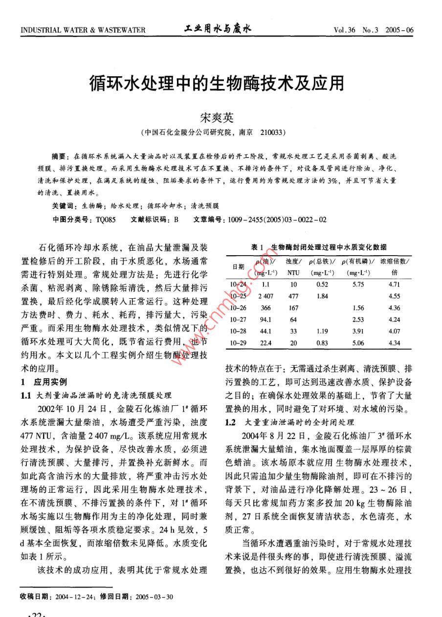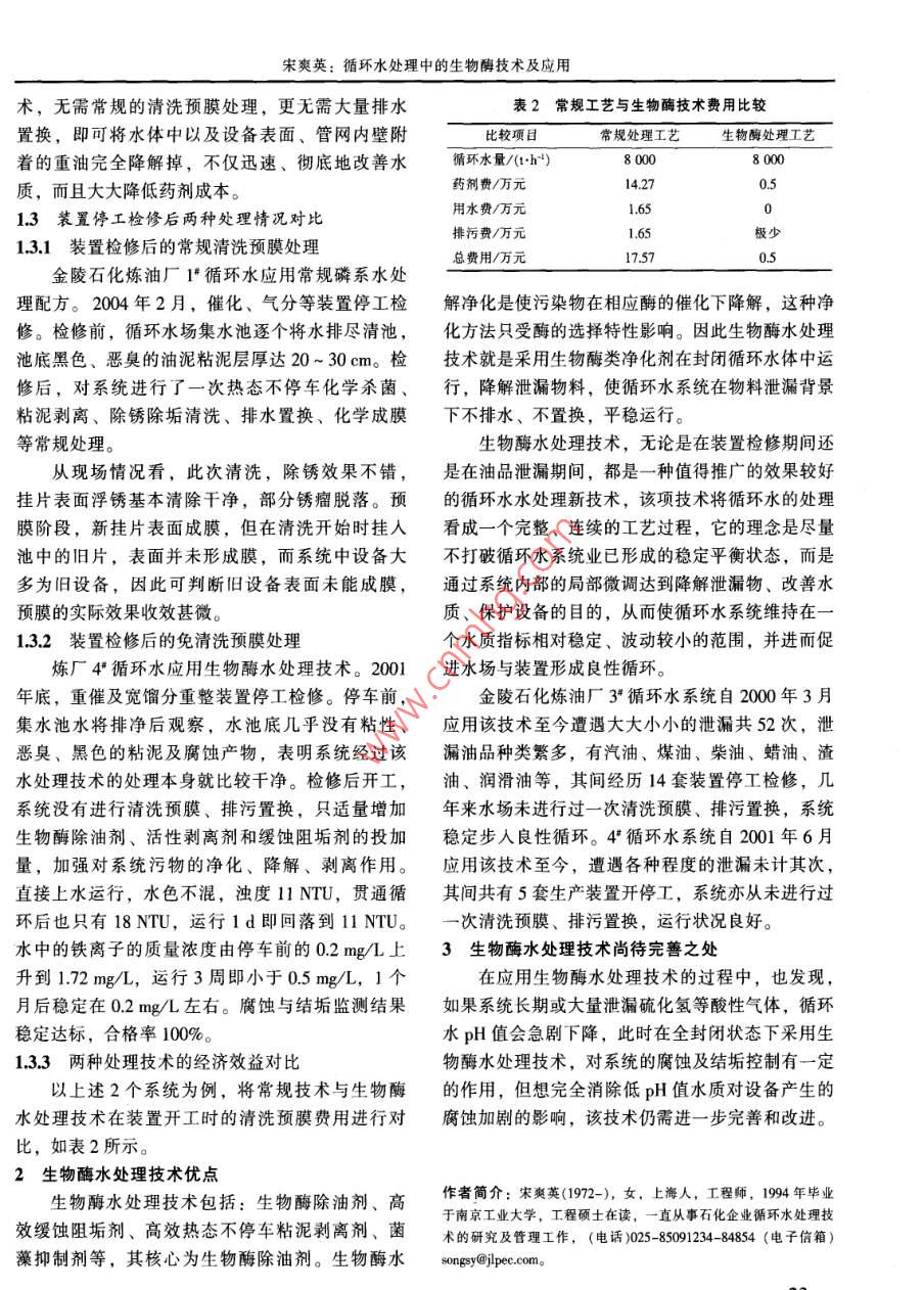 INDUSTRIAL WATER & WASTEWATER工業(yè)用水與廢水Vol.36 No.3 2005-06循環(huán)水處理中的生物酶技術及應用宋爽英(中國石化金陵分公司研究院,南京210033)摘要:在循環(huán)水系統(tǒng)漏入大量油品時以及裝置在栓修后的開工階段,常規(guī)水處理工藝是采用殺菌利離、酸洗預膜、排污置換處理。而采用生物酶水處理技術可在不置換、不排污的條件下,對設備及管網(wǎng)進行除油、凈化、清洗和保護處理,在滿足系統(tǒng)的緩蝕、阻垢要求的條件下,運行費用約為常規(guī)處理方法的3%,并且可節(jié)省大量的清洗、置換用水。關鍵詞:生物酶;給水處理;循環(huán)冷卻水;清洗預膜中圖分類號: TQ085文獻標識碼: B文章編號: 1009 -2455<2005)03 -0022-02石化循環(huán)冷卻水系統(tǒng),在油品大量泄漏及裝表1生物酶封 閉處理過程中水質變化數(shù)據(jù)置檢修后的開工階段,由于水質惡化,水場通常3期ρ(油)/濁度/ p(總鐵)/ p(有機磷)/ 濃縮倍數(shù)/需進行特別處理。常規(guī)處理方法是:先進行化學(mg1L") NTU(mg:L") (mg-L-)信殺菌、粘泥剝離、除銹除垢清洗,然后大量排污10-241.10.525.754.710-25 2 4074771.844.55置換,最后經化學成膜轉入正常運行。這種處理10-26 3661671.56方法費時、費力、耗水、耗藥,排污量大,污染10-2794.162.534.24嚴重。而采用生物酶水處理技術,類似情況下的10-28 .44.1331.193.914.07循環(huán)水處理可大大簡化,既節(jié)省運行費用,也節(jié)10-2922.42(0.835.064.34約用水。本文以幾個工程實例介紹生物酶處理技術的應用。技術的特點在于:無需通過殺生剝離、清洗預膜、排1應用實例污置換的工藝,即可達到迅速改善水質、保護設備1.1大劑量油品泄漏時的免清洗預膜處理之目的;在確保水處理效果的基礎上,節(jié)省了大量2002年10月24日,金陵石化煉油廠1° 循環(huán)置換的用水,同時避免了對環(huán)境、對水域的污染。水系統(tǒng)泄漏大量柴油,水場遭受嚴重污染,濁度1.2大量重油泄 漏時的全封閉處理477 NTU,含油量2407 mg/L。該系統(tǒng)應用常規(guī)水2004年8月22日,金陵石化煉油廠3* 循環(huán)水處理技術,為保護設備,盡快改善水質,必須進系統(tǒng)泄漏大量蠟油,集水池面覆蓋一層厚厚的棕黃行清洗預膜、大量排污,并置換補充新鮮水。而色蠟油。該水場原本就應用生物酶水處理技術,如此高含油污水的大量排放,將嚴重沖擊污水處因此只需追加少量生物酶除油劑,即可在不排污的理場的正常運行,因此采用生物酶水處理技術,背景下,對油品進行凈化降解處理。23~ 26日,在不清洗預膜、不排污置換的條件下,對1" 循環(huán)每天只比常規(guī)加藥方案多投加20kg生物酶除油水場實施以生物酶作用為主的凈化處理,同時兼劑,27日系統(tǒng)全面恢復清潔狀態(tài),水色清亮,水顧緩蝕、阻垢等各項水質穩(wěn)定要求。24h見效,5質正常。d基本全面恢復,而濃縮倍數(shù)未見降低。水質變化當循環(huán)水遭遇重油污染時,對于常規(guī)水處理技如表1所示。術來說是件很頭疼的事,即使進行清洗預膜、溢流該技術的成功應用,表明其優(yōu)于常規(guī)水處理置換, 也達不到很好的效果。應用生物酶水處理技收稿日期: 2004-12-24;修回日期: 2005-03-30宋爽英:循環(huán)水處理中的生物酶技術及應用術,無需常規(guī)的清洗預膜處理,更無需大量排水表2常規(guī)工藝與生物酶技術費 用比較置換,即可將水體中以及設備表面、管網(wǎng)內壁附比較項目常規(guī)處理工藝生物酶處理工藝著的重油完全降解掉,不僅迅速、徹底地改善水循環(huán)水量/(+h")8 0008000質,而且大大降低藥劑成本。藥劑費/萬元14.270.5用水費/萬元1.651.3 裝置停工檢修后兩種處理情況對比排污費/萬元極少1.3.1裝置檢修后的常規(guī)清洗預膜處理總費用/萬元17.57金陵石化煉油廠1* 循環(huán)水應用常規(guī)磷系水處理配方。2004年2月, 催化、氣分等裝置停工檢解凈化是使污染物在相應酶的催化下降解,這種凈修。檢修前,循環(huán)水場集水池逐個將水排盡清池,化方法只受酶的選擇特性影響。因此生物酶水處理池底黑色、惡臭的油泥粘泥層厚達20~30cm。檢技術就是采用生 物酶類凈化劑在封閉循環(huán)水體中運修后,對系統(tǒng)進行了一次熱態(tài)不停車化學殺菌、行,降解泄漏物料,使循環(huán)水系統(tǒng)在物料泄漏背景粘泥剝離、除銹除垢清洗、排水置換、化學成膜下不排水、不置換,平穩(wěn)運行。等常規(guī)處理。生物酶水處理技術,無論是在裝置檢修期間還從現(xiàn)場情況看,此次清洗,除銹效果不錯,是在油品泄漏期間,都是一種值得推廣的效果較好掛片表面浮銹基本清除干凈,部分銹瘤脫落。預的循環(huán)水水處理新技術,該項技術將循環(huán)水的處理膜階段,新掛片表面成膜,但在清洗開始時掛入看成一個完整、連續(xù)的工藝過程,它的理念是盡量池中的舊片,表面并未形成膜,而系統(tǒng)中設備大不打破循環(huán)水系統(tǒng)業(yè)已形成的穩(wěn)定平衡狀態(tài),而是多為舊設備,因此可判斷舊設備表面未能成膜,通過系統(tǒng)內部的局部微調達到降解泄漏物、改善水預膜的實際效果收效甚微。質、保護設備的目的,從而使循環(huán)水系統(tǒng)維持在一1.3.2裝置檢修后的免清洗預膜處理個水質指標相對穩(wěn)定、波動較小的范圍,并進而促煉廠4*循環(huán)水應用生物酶水處理技術。2001進水場與裝置形成良性循環(huán)。年底