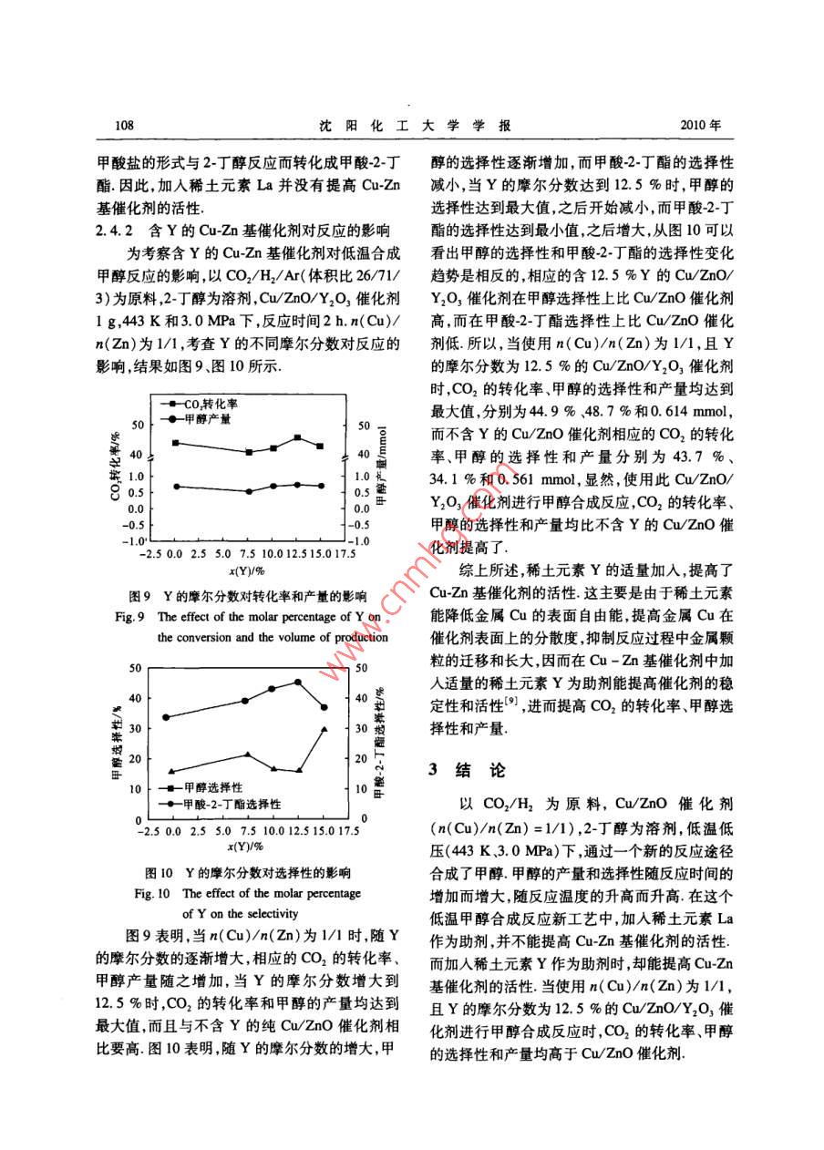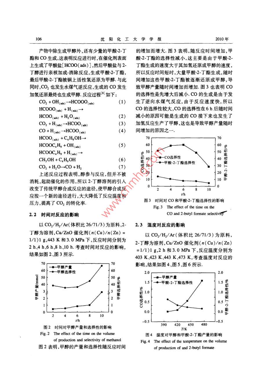 第24卷第2期沈陽化工大學(xué)學(xué)報VoL 24 No. 22010.06JOURNAL OF SHENYANG UNTVERSITY OF CHEMICAL TECHNOLOGYJun.2010文章編號:1004-4639(2010)02-0104-06cO2/H2低溫合成甲醇的研究金玉洲,楊瑞芹,肖林久,李文澤(沈陽化工大學(xué)應(yīng)用化學(xué)學(xué)院,遼寧沈陽110142)摘要:以CO2/H2為原料,Cuzn基催化劑,醇溶劑,低溫低壓(43K、3.0MPa)下合成甲醇.考察時間、溫度、催化劑對反應(yīng)的影響.結(jié)粟表明,隨反應(yīng)時間的增加,甲醇的產(chǎn)量和選擇性增加,隨反應(yīng)溫度的增加,甲醇的產(chǎn)量和選擇性也逐漸增加,當使用稀土元素La作為助劑時,并不能提高Cu-Zn基催化劑的活性,而稀土元素Y作為助劑,當使用n(Cu)/n(zn)為1/1,且Y的摩爾分數(shù)為12.5%的Cu/ZnOY2O3催化劑進行甲醇合成反應(yīng)時,CO2的轉(zhuǎn)化率、甲醇的選擇性和產(chǎn)量均高于使用 Cu/zno催化劑關(guān)鍵詞:CO2/Hl2;甲醇;2丁醇;Cuzn基催化劑;稀土元素La、Y中圖分類號:TQ214文獻標識碼:A隨著全球人口的增加和人民生活水平的不壓、氣固相條件下進行二氧化碳加氫合成甲醇反斷提高,對能源的需求日趨強勁但是傳統(tǒng)的石應(yīng),選擇性低、產(chǎn)量小6”,因此,在低溫、低壓條油、天然氣資源日漸匱乏,石油短缺已關(guān)系到國件下研究新的催化劑提高催化劑的選擇性、甲醇家的能源安全戰(zhàn)略所以尋求替代能源將成為未的產(chǎn)量來優(yōu)化二氧化碳資源的利用十分必要來世界經(jīng)濟發(fā)展的關(guān)鍵-2.甲醇是一種重要的由于二氧化碳加氫在低溫低壓條件下還未有機化工原料又是新型代能源無論是作為車找到合適的工業(yè)化工藝條件,所以本實驗采用低用燃料還是燃料電池的燃料甲醇除了具有良溫、低壓及氣、固、液三相反應(yīng)做為基本條件,考好的性能和環(huán)保效果外更重要的是產(chǎn)品價格及察不同反應(yīng)時間反應(yīng)溫度對甲醇合成反應(yīng)的影儲運等方面也具有競爭優(yōu)勢,因此市場前景看響并在目前現(xiàn)有的CuZn基催化劑中加入稀好3-,從我國石油接續(xù)資源考慮適度發(fā)展甲土元素做為助劑以提高催化劑的選擇性和甲醇醇工業(yè)具有重要的戰(zhàn)略意義和可觀的社會應(yīng)用的產(chǎn)量前景.二氧化碳是含碳化合物氧化的最終產(chǎn)物,是1實驗部分自然界最豐富的潛在碳源,也是環(huán)境主要的污染物之一因此研究二氧化碳的綜合利用消除二1.1催化劑的制備氧化碳對環(huán)境的污染具有十分重要的意義.二氧化碳加氫合成甲醇是合理利用二氧化碳的途徑實驗中采用的銅基催化劑通過傳統(tǒng)的共沉之一.二氧化碳資源的利用、固化,特別是二氧化淀方法制備稱取一定質(zhì)量的硝酸鹽無水碳酸碳加氫合成甲醇引起了各國科學(xué)家的關(guān)注,成為鈉分別用300mL蒸餾水溶解將配好的硝酸鹽甲醇合成的一個新的研究方向5.由于二氧化溶液和碳酸鈉溶液同時滴加到裝有300mL蒸碳的化學(xué)隋性較大,難以活化,目前的高溫、高餾水的大燒杯中,并快速攪拌,通過對2種溶液收稿日期:200908-2基金項目:遼寧省教育廳A類計劃項目(2009A583)作者簡介:金玉洲(1983-),蒙古族男,遼寧風(fēng)城人,碩士研究生在讀,主要從事工業(yè)催化的研究聯(lián)系人:楊瑞芹(1963-),蒙古族,女吉林松原人,教授博士,主要從事有機合成中間體,工業(yè)催化的研究第2期金玉洲等:CO2/H2低溫合成甲醇的研究105滴加速度的調(diào)節(jié)控制溶液的pH值在8.5左右,控制溫度在33K,滴加時間控制在2h左右,溶2結(jié)果與討論液滴加完后,333K攪拌30min,然后室溫下老化12h.21低溫合成甲醇新工藝的研究將老化后的沉淀物用333K的蒸餾水洗滌以CO2/H2/A(體積比26/71/3)為原料4次,以去除溶液中的鈉離子沉淀物濾出后u/ZnO催化劑,2-丁醇為溶劑,443K和3.0MPa393K干燥6h脫水然后623K焙燒1h,得到下,反應(yīng)2h反應(yīng)后氣相和液相中各組分的氣相催化劑的前驅(qū)體將催化劑的前驅(qū)體造粒(20-色譜圖如圖1所示采用已知標準物質(zhì)對反應(yīng)后40日)后,用體積分數(shù)為5%的氫氣(HN2)在氣相和液相中各組分進行確認在反應(yīng)后的氣相493K下還原10h還原后的催化劑用體積分數(shù)中保留時間1.45min的峰是Co,2.5mm是為1%的氧氣(O2/N2)室溫下表面鈍化8h左CO2,4.3min是內(nèi)標物C2H4;在反應(yīng)后的液相右.即得Cu基氧化物催化劑中,保留時間3.7min的峰是甲醇,7.4mn是內(nèi)1.2催化劑的活性評價標物1-丙醇,8.3min是溶劑2丁醇,13.9min是甲酸2丁酯這個實驗結(jié)果表明,以2-丁醇為催化劑的活性評價在漿態(tài)床間歇式反應(yīng)器溶劑czao催化劑,以cO/H2為原料在低上進行在外加磁力攪拌器的不銹鋼高壓反應(yīng)釜溫低壓(443K、30MPa)下能夠進行甲醇合成(150m)中,加人一定量的溶劑和催化劑樣品,反應(yīng),反應(yīng)后Co2的轉(zhuǎn)化率為437%,甲醇的用原料氣CO2/H2Ar(體積比為26/71/3)置換選擇性為341%,甲醇的產(chǎn)量為0.561mmol釜內(nèi)空氣3次,每次充氣壓力為10MPa.釜內(nèi)空氣排除后,室溫下向反應(yīng)釜內(nèi)充氣至3.0MPa,攪拌下升溫至443K,443K保持一定時間后,將反應(yīng)釜冷卻至室溫用氣袋收集反應(yīng)后氣體,加人乙烷做內(nèi)標,用帶有甲烷轉(zhuǎn)化器的氣相色譜(FID),在柱溫323K,檢測器溫度443K下進行氣相成分和含量分析.液相中加人1-丙醇為內(nèi)標,用帶有甲烷轉(zhuǎn)化器的氣相色譜(FID),在柱溫443K,檢測器溫度443K下進行液相成分