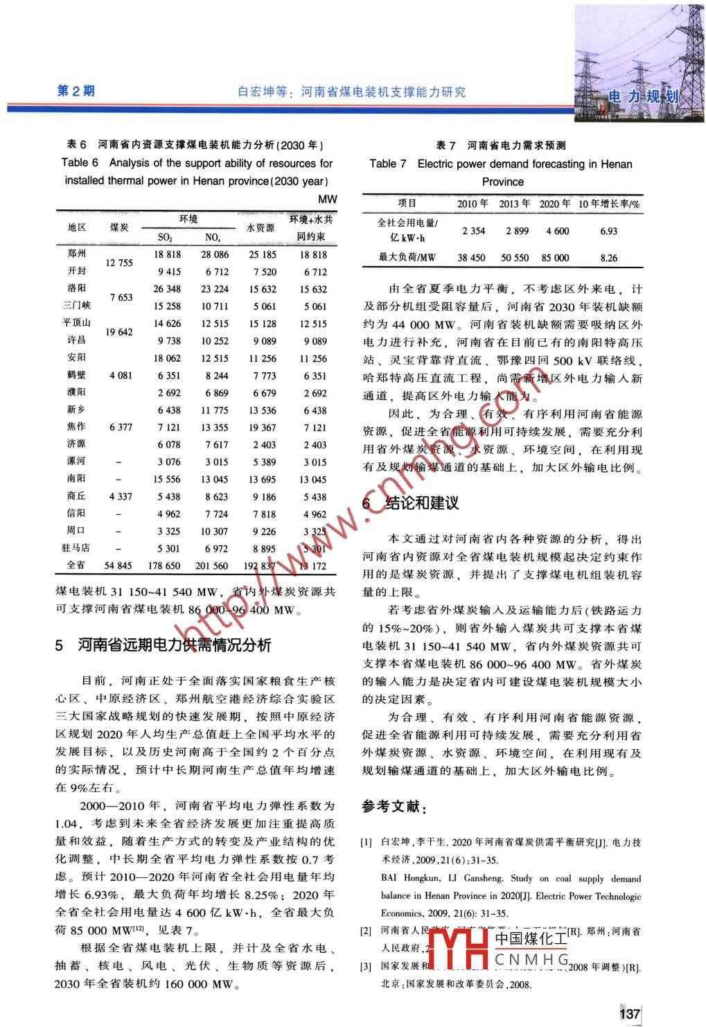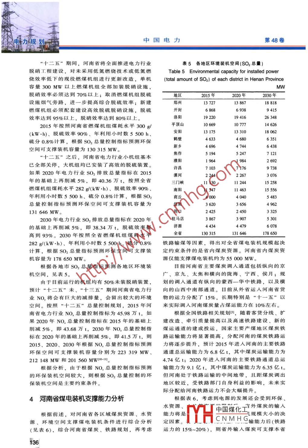 第48卷第2期中國電力Vol.48, No. 2電力規(guī)劃2015年2月ELECTRIC POWERFeb.2015河南省煤電裝機支撐能力研究白宏坤1,李干生2,牛中敏2,韋迎旭2,司炳金2 ,許軼2,王宇新2(1.國網(wǎng)河南省電力公司經(jīng)濟技術(shù)研究院,河南鄭州450052;2. 河南省電力勘測設計院,河南鄭州450007)摘要:河南省作為能源資源大省,在“十一五”末期已經(jīng)變成能源凈輸人省。對河南省內(nèi)資源及其支撐能力的分析表明,煤炭資源對省內(nèi)煤電裝機規(guī)模起決定作用,并得出資源支撐煤電裝機容量上限的范圍,提出.為促進全省能源利用可持續(xù)發(fā)展,需要充分利用省外煤炭資源、水資源、環(huán)境空間,在利用現(xiàn)有及規(guī)劃輸煤通道的基礎(chǔ)上,加大輸人區(qū)外電力比例。該成果可為制定河南中長期能源發(fā)展戰(zhàn)略提供決策參考。關(guān)鍵詞:能源;電力供需;支撐條件;煤炭資源;水資源;環(huán)保中圖分類號: TM715;TK01+9文獻標志碼: A文章編號: 1004-9649(2015)02-0132-070引言表1 河南全省各區(qū)域煤炭產(chǎn)量Table 1 Regional coal production of Henan Province隨著經(jīng)濟社會的持續(xù)快速發(fā)展,河南省能源萬t供應和電力供需在“十一五”末出現(xiàn)了拐點,已大型礦區(qū)區(qū)域內(nèi)煤礦實際及規(guī)劃產(chǎn)量由煤炭和電力凈輸出省轉(zhuǎn)變?yōu)閮糨斎耸?。本文?011年實際2015 年規(guī)劃2020年規(guī)劃2030 年規(guī)劃過對河南省內(nèi)各地區(qū)煤炭資源、水資源和環(huán)境空鶴壁12521 61316461 600間支撐當?shù)孛弘娧b機規(guī)模的研究表明,煤炭資源焦作2 0392 4832 5452 500對全省煤電裝機規(guī)模起決定約束作用。并根據(jù)各義馬3006.3 0323 000地區(qū)受最大資源約束的煤電裝機規(guī)模,得出了支鄭州6 19467285 1555 000撐全省煤電機組裝機容量的上限,提出需要充分永夏1 7881 7651 8241 700利用省外煤炭資源、水資源、環(huán)境空間,在利用平頂山6 1637 0417 8707 700現(xiàn)有及規(guī)劃輸煤通道的基礎(chǔ)上,加大區(qū)外輸電比例。1計算得出2015年、2020年和2030年河南省各區(qū)域電煤資源量,見表2。1河南省煤炭支撐能力分析1.2省內(nèi)煤炭資源可支撐裝機分析2015年河南省內(nèi)電煤總量約1.24 億t,按1.1省內(nèi)煤炭資源分析照發(fā)電標準煤耗300 g/(kW.h),年利用小時數(shù)根據(jù)河南省煤炭需求預測",河南省2015年、5 500h計算,可支撐裝機約53 897 MW。2020年和2030年煤炭需求總量將分別達到2.9億t.2020年省內(nèi)電煤總量約1.21 億t,按照發(fā)電3.4億t和4.0億t,電煤需求比例分別為53%、標準煤耗282 g/(kW.h),年利用小時數(shù)5 500 h61%和64%,需求量分別為1.52億t、2.1億t和計算,可支撐裝機約55 903 MW。2.56億t。2030年省內(nèi)電煤總量約1.18億t,按照發(fā)電河南省內(nèi)各區(qū)域煤炭產(chǎn)量見表1。根據(jù)2015標準煤耗280 g/(kW.h),年利用小時數(shù)5500 h年、2020年和2030年河南省煤炭供應能力分別計算,可支撐裝機約54 844 MW14-9]。為2.26億t、2.2億t和2.15億t,電煤比例按照55%考慮,省內(nèi)電煤供應量分別可達1.24億t.2河南省水資源支撐能力分析1.21億t和1.18億t,屆時電煤缺口分別達到0.31億t、0.89億t和1.38億t,均需從省外調(diào)人口-31。2.1 省內(nèi)礦井水資源及利用按照所產(chǎn)電煤量占原煤產(chǎn)量55%計,根據(jù)表河南省共有六大礦區(qū),煤田分布面積廣、地中國煤化工收稿日期: 2014-11-09作者簡介:白宏坤(1971-),女,河南開封人,博士,高級工程師,從事電MYHCNMHG研究工作。E-mail: baihongkun@sohu.com132|第2期白宏坤等:河南省煤電裝機支撐能力研究電力規(guī)劃表3河南全省中水可利用水量預測Table 3 Prediction of usable recycled water resources of Henan Province地區(qū)2015年中水總2020年中水總 2030年中水總可用水量/已用水量/規(guī)劃建成后可利用量規(guī)模萬m’規(guī)模/萬m'規(guī)模/萬m2'(萬m'd)(萬m'.d+)萬 m'd萬m/a鄭州95.5168.527.5139.624.00115.642 194.0開封41.068.092.054.99.4045.516 608.0洛陽76.5134.5181.5110.721.5089.232 558.0平頂山42.077.0104.062.610.7051.918 944.038.970.595.057.83.5054.319 820.0鶴壁21.540.555.033.60.0012 264.0新鄉(xiāng)150.090.920.0070.925 879.0焦作41.581.0109.565.39.2856.020 447.0濮陽30.053.071.542.95.7537.213 560.0許昌35.565.088.051.83.0048.817 812.0漯河23.533.74.0029.710 841.0南陽50.590.5122.072.469.425 331.0三門峽21.046.062.036.47.0029.410 731.0商丘32.564.587.051.19.5041.615 184.0信陽31.074.0100.056.:47.317 265.0周口3573.098.56.63.6053.(19 345.0駐馬店37.072.598.06.75.4051.318 725.0濟源市15.027.036.516.50.01 825.0全省1 355.51 834.01 095.3165.60929.7339 329.6表4河南全省電力可利用水量分析Table 4 Analysis of available water resources used for electric power in Henan引外水源可計算總量/可支撐裝機容量/ ”城市礦井水/萬m'地表水/萬m'中水萬m'南水北調(diào)/萬m’黃河/萬 m'萬m'MW82561 0995 1702 18642 19455 62025 1856523 08416 6087 5201 96416711 42932 55834 52215 63211 9658062 50018 94433 40915128安陽1 6996993 34053319 82024 85911 2563 2631 64012 26417 1677 7738284 016499025 87929 8951353619 5054562 82098720 44742 77219 3672691 190380213 56014 75066795162 26028017 81220 07290892901 06010 84111 90153893 0824 91425 33130 24513 69544684758910 73111 1775 061510413201 57015 18420 2889 186461117 2657 8181 4081 03025219 34520 3759 2269201 65918 72519 6458895濟源3481275298中國煤化工240356 60320 79229 94020 000MYHCNMHG_ 192837。注:由于水庫水和黃河水分配的靈活性較大,未計人可計算總量,可以作為中水的備用水源。耗水指標取0.7
