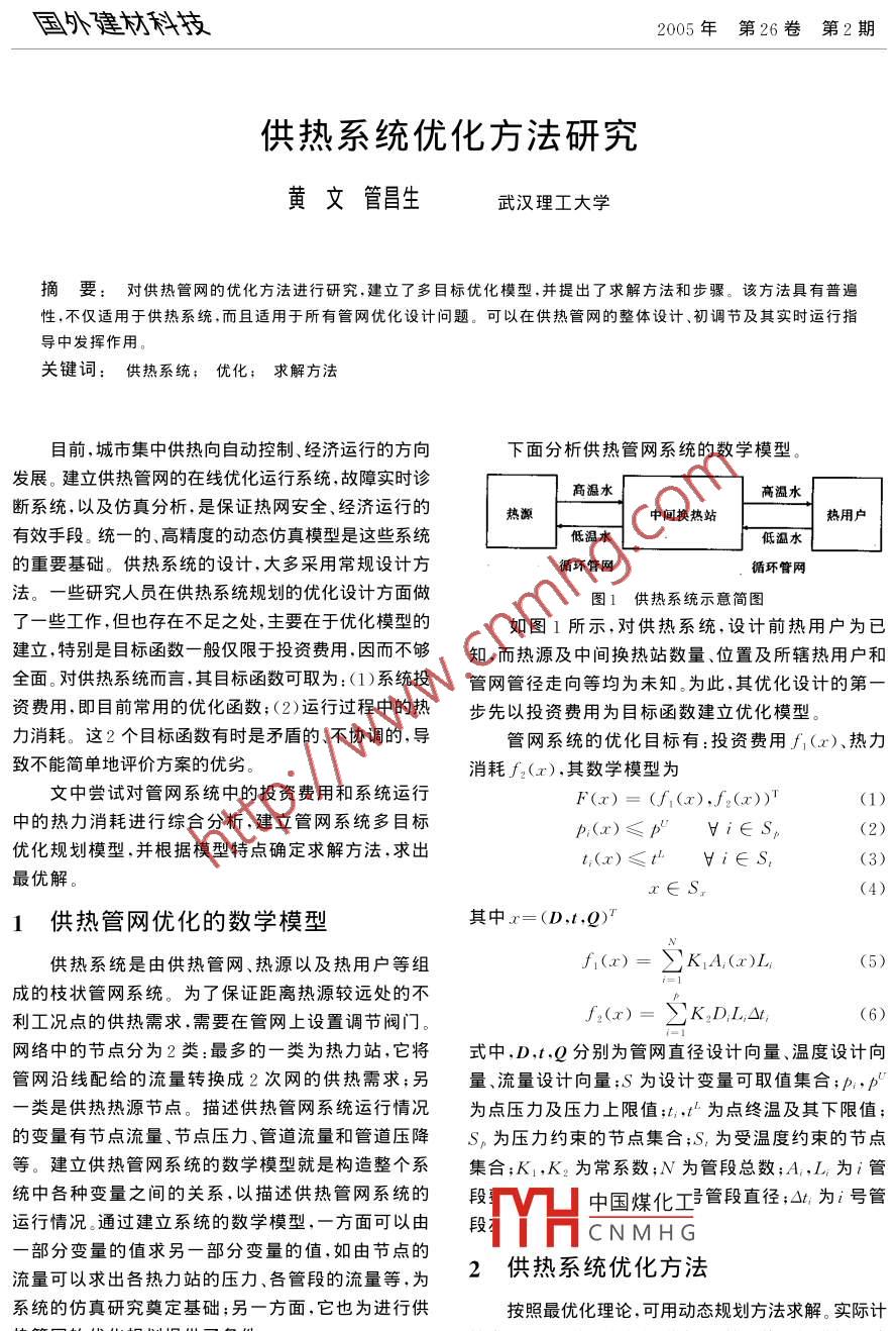 國(guó)外建村科技2005年第26卷 第2期供熱系統(tǒng)優(yōu)化方法研究黃文管昌生武漢理工大學(xué)摘要:對(duì)供熱管網(wǎng)的優(yōu)化方法進(jìn)行研究,建立了多目標(biāo)優(yōu)化模型,并提出了求解方法和步驟。該方法具有普遍性,不僅適用于供熱系統(tǒng),而且適用于所有管網(wǎng)優(yōu)化設(shè)計(jì)問(wèn)題??梢栽诠峁芫W(wǎng)的整體設(shè)計(jì)、初調(diào)節(jié)及其實(shí)時(shí)運(yùn)行指導(dǎo)中發(fā)揮作用。關(guān)鍵詞:供熱系統(tǒng); 優(yōu)化; 求解方法目前,城市集中供熱向自動(dòng)控制、經(jīng)濟(jì)運(yùn)行的方向下面分析供熱管網(wǎng)系統(tǒng)的數(shù)學(xué)模型。發(fā)展。建立供熱管網(wǎng)的在線優(yōu)化運(yùn)行系統(tǒng),故障實(shí)時(shí)診高溫水?dāng)嘞到y(tǒng),以及仿真分析,是保證熱網(wǎng)安全、經(jīng)濟(jì)運(yùn)行的熱源中間換熱站熱用戶.有效手段。統(tǒng)一的、高精度的動(dòng)態(tài)仿真模型是這些系統(tǒng)低溫水的重要基礎(chǔ)。供熱系統(tǒng)的設(shè)計(jì),大多采用常規(guī)設(shè)計(jì)方循環(huán)管網(wǎng)循環(huán)管網(wǎng).法。-些研究人員在供熱系統(tǒng)規(guī)劃的優(yōu)化設(shè)計(jì)方面做圖1供熱系統(tǒng)示意簡(jiǎn)圖.了一些工作,但也存在不足之處,主要在于優(yōu)化模型的如圖1所示,對(duì)供熱系統(tǒng),設(shè)計(jì)前熱用戶為已建立,特別是目標(biāo)函數(shù)-般僅限于投資費(fèi)用,因而不夠知,而熱源及中間換熱站數(shù)量、位置及所轄熱用戶和全面。對(duì)供熱系統(tǒng)而言,其目標(biāo)函數(shù)可取為:(1)系統(tǒng)投管網(wǎng)管徑走向等均為未知。為此,其優(yōu)化設(shè)計(jì)的第資費(fèi)用,即目前常用的優(yōu)化函數(shù);(2)運(yùn)行過(guò)程中的熱步先以投資費(fèi)用為目標(biāo)函數(shù)建立優(yōu)化模型。力消耗。這2個(gè)目標(biāo)函數(shù)有時(shí)是矛盾的、不協(xié)調(diào)的,導(dǎo)管網(wǎng)系統(tǒng)的優(yōu)化目標(biāo)有:投資費(fèi)用f(x)、熱力致不能簡(jiǎn)單地評(píng)價(jià)方案的優(yōu)劣。消耗f。(x),其數(shù)學(xué)模型為文中嘗試對(duì)管網(wǎng)系統(tǒng)中的投資費(fèi)用和系統(tǒng)運(yùn)行F(x)= (f,(x),f(x))T(1)中的熱力消耗進(jìn)行綜合分析,建立管網(wǎng)系統(tǒng)多目標(biāo)p,(x)≤p"Vi∈Sp(2)優(yōu)化規(guī)劃模型,并根據(jù)模型特點(diǎn)確定求解方法,求出t;(x)≤t° V i∈S,(3)最優(yōu)解。x∈S,(4) .1供熱管網(wǎng)優(yōu)化的數(shù)學(xué)模型其中x=(D,t,Q)T供熱系統(tǒng)是由供熱管網(wǎng)、熱源以及熱用戶等組f(x)= 2KlA,(x)L;成的枝狀管網(wǎng)系統(tǒng)。為了保證距離熱源較遠(yuǎn)處的不.利工況點(diǎn)的供熱需求,需要在管網(wǎng).上設(shè)置調(diào)節(jié)閥門(mén)。f;(x)= K.D.L,0,網(wǎng)絡(luò)中的節(jié)點(diǎn)分為2類:最多的一-類為熱力站,它將式中,D,t,Q分別為管網(wǎng)直徑設(shè)計(jì)向量、溫度設(shè)計(jì)向管網(wǎng)沿線配給的流量轉(zhuǎn)換成2次網(wǎng)的供熱需求;另量、流量設(shè)計(jì)向量;s為設(shè)計(jì)變量可取值集合;p,p"--類是供熱熱源節(jié)點(diǎn)。描述供熱管網(wǎng)系統(tǒng)運(yùn)行情況為點(diǎn)壓力及壓力上限值;t,t為點(diǎn)終溫及其下限值;的變量有節(jié)點(diǎn)流量、節(jié)點(diǎn)壓力、管道流量和管道壓降Sp為壓力約束的節(jié)點(diǎn)集合;S,為受溫度約束的節(jié)點(diǎn)等。建立供熱管網(wǎng)系統(tǒng)的數(shù)學(xué)模型就是構(gòu)造整個(gè)系集合;K,K。為常系數(shù);N為管段總數(shù);A,L;為i管統(tǒng)中各種變量之間的關(guān)系,以描述供熱管網(wǎng)系統(tǒng)的段中國(guó)煤化工號(hào)管段直徑;Ot,為i號(hào)管運(yùn)行情況。通過(guò)建立系統(tǒng)的數(shù)學(xué)模型,-方面可以由MHCNM HG一部分變量的值求另一部分變量的值,如由節(jié)點(diǎn)的2供熱系統(tǒng)優(yōu)化方法流量可以求出各熱力站的壓力、各管段的流量等,為系統(tǒng)的仿真研究奠定基礎(chǔ);另-方面,它也為進(jìn)行供按照最優(yōu)化理論,可用動(dòng)態(tài)規(guī)劃方法求解。實(shí)際計(jì)熱管網(wǎng)的優(yōu)化規(guī)劃提供了條件。算中發(fā)現(xiàn),隨著階段數(shù)的增多,運(yùn)算量將巨幅增加而消81國(guó)外建材科技2005年 第26卷第2期耗大量計(jì)算機(jī)內(nèi)存和計(jì)算機(jī)時(shí)間,故將其轉(zhuǎn)化成線性(3)檢驗(yàn)分層數(shù)規(guī)劃問(wèn)題,以快速求解。對(duì)于該線性規(guī)劃問(wèn)題可用內(nèi)點(diǎn)當(dāng)k=m時(shí),輸出xr=x"當(dāng)k