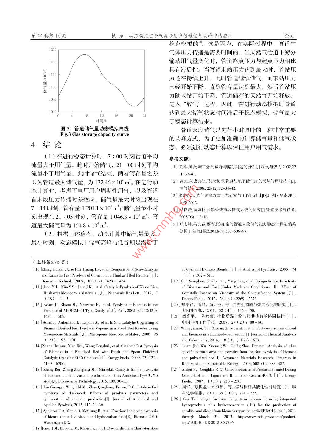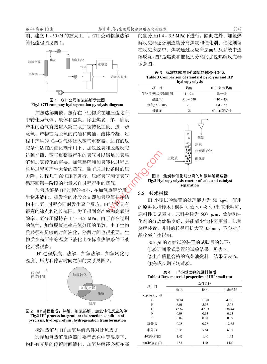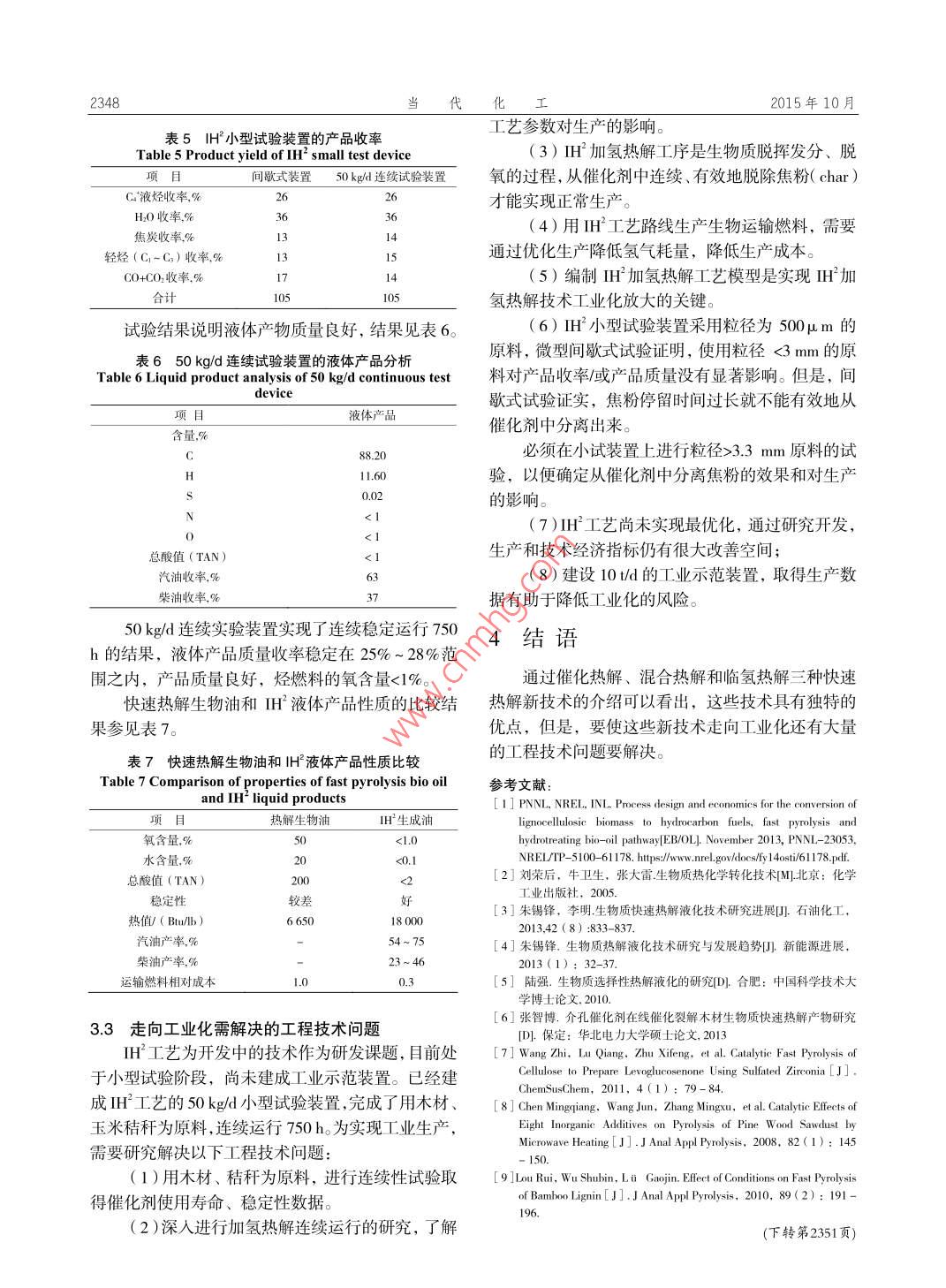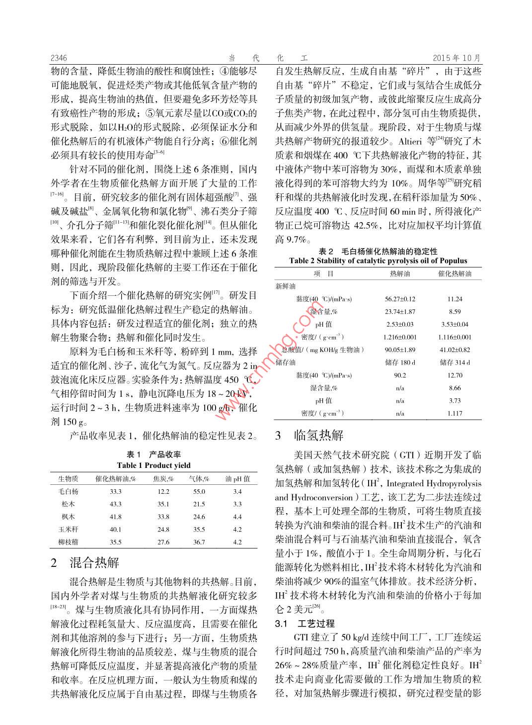 第44卷第10期當(dāng)代化工Vo1.44,No.102015年10月Contemporary Chemical IndustryOctober, 2015生物質(zhì)快速熱解液化新技術(shù)郝許峰,孫紹暉,趙科,孫培勤(1.鄭州市科技情報(bào)研究所,河南鄭州450007;2.鄭州大學(xué)化工與能源學(xué)院,河南鄭州450001)要:介紹了催化熱解、混合熱解、臨氫熱解三種生物質(zhì)快速熱解液化新技術(shù)。分析了成功的催化熱觚過程需要滿足的準(zhǔn)則,介紹了一些催化熱解的催化劑。報(bào)道了生物質(zhì)與煤共熱解液化的部分結(jié)果。對(duì)美國(guó)天然氣技術(shù)研究院近期開發(fā)的臨氫熱解(或加氫熱解)技術(shù)進(jìn)行了詳細(xì)報(bào)道,列出了主要的技術(shù)指標(biāo)。要使這些新技術(shù)走向工業(yè)化,還有大量的工程技術(shù)問題要解決。關(guān)鍵詞:生物質(zhì);快速熱解:催化熱解;混合熱解;臨氫熱解中圖分類號(hào):TQ028文獻(xiàn)標(biāo)識(shí)碼:A文章編號(hào):1671-0460(2015)10-2345-04New Fast Pyrolysis Liquefaction Technologies of BiomassHAO Xv-feng, SUN Shao-hui, ZHAo Ke, SUN Pei-qin(1. Zhengzhou Science& Technology Information Institute, He'nan Zhengzhou 450007, China;2. School of Chemical Engineering and Energy, Zhengzhou University, He'nan Zhengzhou 450001, China)Abstract: Three kinds of new fast pyrolysis liquefaction technologies including catalytic pyrolysis, mixed pyrolysisand hydrogenation pyrolysis were introduced. The requisite conditions for successful catalytic pyrolysis were analyzedthe catalysts for the catalytic pyrolysis were introduced. Partial results of the copyrolysis liquefaction of biomass andcoal were reported. Recent development of the hydrogenation pyrolysis technology developed by the United StatesResearch Institute of Natural Gas technology and its main technical indexes were introduced. It's point out that thereare many engineering technical problems that need be resolved before these technologies can be industrializedKey words: Biomass; Fast pyrolysis; Catalytic pyrolysis; Mixed pyrolysis; Hydrogenation pyrolysis人類大量使用石油、煤炭、天然氣化石能源造設(shè)備和使用條件等提出了較高的要求,不利于大范成了嚴(yán)重的能源危機(jī)和環(huán)境污染問題,使用可再生圍普及和推廣;同時(shí)再加工提質(zhì)為高級(jí)燃料方面能源是解決上述問題的必然選擇。生物質(zhì)是可轉(zhuǎn)化作為原料對(duì)進(jìn)一步加工的工藝條件:溫度、壓力,為燃料和化學(xué)品的清潔的可再生能源。生物質(zhì)快速以及設(shè)備也有著較高要求,因此國(guó)內(nèi)外工作者寄希熱解轉(zhuǎn)化為運(yùn)輸燃料途徑是近期可實(shí)現(xiàn)工業(yè)化的途望于生物質(zhì)熱解階段能夠獲得品質(zhì)較高的、易于應(yīng)徑之用和加工的生物油,通過控制溫度、壓力,或者使生物質(zhì)快速熱解是指生物質(zhì)原料在無氧條件用催化劑,達(dá)到控制物料反應(yīng)歷程,來探索提高生下,在較高的升溫速率(lo?~10?℃/s)下,熱解溫物油質(zhì)量的途徑。岀現(xiàn)了催化熱解、混合熱解、臨度500℃左右,較短的停留時(shí)間(<2s)下,發(fā)生氫熱解等新興創(chuàng)新性的熱解技術(shù),下面介紹催化熱快速裂解,然后熱解蒸汽快速冷凝得到不可冷凝氣、解、混合熱解和臨氫熱解新技術(shù)。液體生物質(zhì)油及固體炭的過程,目的是獲得髙產(chǎn)率高品質(zhì)的生物質(zhì)油,如果反應(yīng)條件合適,生物原油催化熱解產(chǎn)率可達(dá)70%以上。熱解生物原油經(jīng)過加氫改質(zhì)為了改進(jìn)生物質(zhì)常規(guī)熱解液化生物油品質(zhì)低的可生產(chǎn)的燃料品種包括汽油、柴油和航空煤油。缺點(diǎn),產(chǎn)生了在催化劑的參與下以實(shí)現(xiàn)生物油高收生物質(zhì)快速熱解技術(shù)的研究開發(fā)已進(jìn)行了30率和高品質(zhì)的催化熱解。根據(jù)常規(guī)生物油品質(zhì)需要多年。常規(guī)快速熱解技術(shù)已經(jīng)實(shí)現(xiàn)了工業(yè)示范;已改進(jìn)的方面,以及催化熱解能夠?qū)崿F(xiàn)工業(yè)化的需要研發(fā)了多種型式的熱解反應(yīng)器。循環(huán)流化床等幾種成功的催化熱解過程需要滿足以下6條準(zhǔn)則:①能夠熱解反應(yīng)器適用于工業(yè)規(guī)模生產(chǎn)應(yīng)用。常規(guī)的熱解促進(jìn)裂解降低生物油的平均相對(duì)分子質(zhì)量和黏度,技術(shù)熱解產(chǎn)生的生物油,由于其水分含量高、黏度提高生物油的熱安定性;②能夠降低醛類產(chǎn)物的含大、熱值低、酸度大等缺點(diǎn),工業(yè)上直接應(yīng)用時(shí)對(duì)量,提高生物油的化學(xué)安定性;③能夠降低酸類產(chǎn)基金項(xiàng)目:國(guó)家自然科學(xué)基金:項(xiàng)目號(hào):21376226。收稿日期:2015-07-21作者簡(jiǎn)介:郝許峰(1964-),男,高級(jí)工程師,主要從事情報(bào)研究和科技開發(fā)工作。上-mai:ha1618@163.~0m通訊作者:孫培勤(1963-),女,博士,教授,主要從事石油補(bǔ)充替代能源研究工作。E-maih:psun@zzu.edu.cn015年10月物的含量,降低生物油的酸性和腐蝕性;④能夠盡自發(fā)生熱解反應(yīng),生成自由基“碎片”,由于這些可能地脫氧,促進(jìn)烴類產(chǎn)物或其他低氧含量產(chǎn)物的自由基“碎片”不穩(wěn)定,它們或與氫結(jié)合生成低分形成,提高生物油的熱值,但要避免多環(huán)芳烴等具子質(zhì)量的初級(jí)加氫產(chǎn)物,或彼此縮聚反應(yīng)生成髙分有致癌性產(chǎn)物的形成;⑤氧元素盡量以CO或CO的子