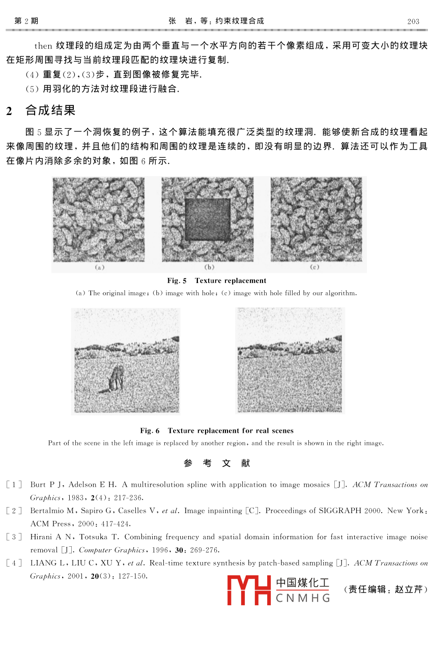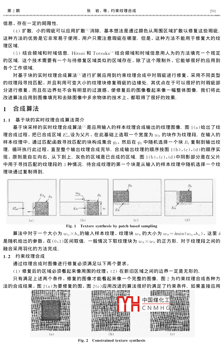 第42卷第2期吉林大學(xué)學(xué)報(bào)(理學(xué)版)Vol. 42 No. 22 004年4月JOURNAL OF JILIN UNIVERSITY (SCIENCE EDITION)Apr 2004約束紋理合成張巖,孟宇,李文輝,龐云階(吉林大學(xué)計(jì)算機(jī)科學(xué)與技術(shù)學(xué)院,長春130012)摘要:對基于塊的實(shí)時(shí)紋理合成算法進(jìn)行擴(kuò)展并應(yīng)用到約束紋理合成中,對瑕疵進(jìn)行修復(fù),在紋理合成的過程中采用不同類型的紋理段尋找匹配,并且利用可變大小的紋理塊修復(fù)瑕疵的邊緣處,使修復(fù)后的圖像在原來瑕疵的邊界處沒有明顯邊界感.關(guān)鍵詞:基于塊的采樣;紋理合成;約束紋理合成中圖分類號: TP391. 41文獻(xiàn)標(biāo)識碼: A文章編號: 1671-5489( 2004 )02-0200-04Constrained texture synthesisZHANG Yan, MENG Yu, LI Wen-hui, PANG Yun jie(College of Computer Science and Technology, Jilin University, Changchun 130012, China)Abstract: Extending the real time texture synthesis by patch-based sampling and applying it toconstrained texture synthesis, we repaired the blemish. By means of different types of texturesegment to find matching and the texture patch which can change in size, we repaired the boundary ofthe blemish, making no obvious sense of fringe in the boundary of the repaired picture.Keywords : patch-based sampling; texture synthesis; constrained texture synthesis在照片和電影底片上通常有一-些區(qū)域,看上去感覺有瑕疵,這些瑕疵可能是在-張掃描的圖片上缺少一個(gè)區(qū)域,也可能是電影底片中存在多余的道具,還可能是一個(gè)圖片上存在不該有的物體.因?yàn)橐疬@些瑕疵的過程通常是不可逆的,所以能夠修復(fù)這些瑕疵的算法有很大用處.通常這些瑕疵部分的位置處在一些紋理區(qū)域中,從而可以應(yīng)用紋理合成的方法進(jìn)行修復(fù).因?yàn)橐迯?fù)的區(qū)域必須包括在紋理區(qū)域中,所以把這種擴(kuò)展的紋理合成算法稱為約束紋理合成.目前對于圖像修復(fù)的方法有很多種,歸納起來,大致可以分為如下幾類:(1)頻域技術(shù).圖像信息大部分都集中在幅度譜的低頻和中頻段,而在較高的頻段,感興趣的信息常被噪聲淹沒.因此,一個(gè)能降低高頻成分幅度的濾波器就能減弱噪聲看得見的影響.但是頻域技術(shù)不能很好的適合去除人造的空間局部區(qū)域.(2)幀間技術(shù),可以依靠圖像的運(yùn)動(dòng)順序,利用鄰近的幀間順序把損失的幀插入到應(yīng)有的位置,基本想法是從鄰近的幀中找到正確的像素點(diǎn)進(jìn)行修復(fù).但是這種技術(shù)不能應(yīng)用到靜止的圖像或跨越很多幀的電影底片上.(3)基于塊的技術(shù).修復(fù)圖像中的瑕疵最簡單的中國煤化工1的像素塊,在新塊與現(xiàn)存的圖像區(qū)域平滑可以采用多分辨率樣條凹實(shí)現(xiàn).但YHCNMHG會包括有用的控制結(jié)構(gòu)收稿日期: 203-09-22.作者簡介:張巖(1980~), 女,博士研究生,從事計(jì)算機(jī)圖形學(xué)和圖像處理的研究,E mail: zhangyanjlu@ yahoo. com. cn.聯(lián)系人:李文輝(1961~),男,教授,博士生導(dǎo)師,從事計(jì)算機(jī)圖形學(xué)、圖像處理和智能CAD的研究,E -mail: liwh@ public. cc. jl. cn.基金項(xiàng)目:國家自然科學(xué)基金(批準(zhǔn)號:69883004)和教育部博士點(diǎn)基金(批準(zhǔn)號:20010183041).第2期張巖, 等:約束紋理合成201信息,存在-定的局限性.(4)擴(kuò)散.小的瑕疵可以應(yīng)用擴(kuò)散[41消除.基本想法是通過顏色從周圍區(qū)域擴(kuò)散以修復(fù)這些瑕疵.這種方法的優(yōu)勢是它非常易于使用,用戶只需注意瑕疵在哪里.但是,這種方法不能用于修復(fù)大的紋理區(qū)域.(5)結(jié)合頻域和時(shí)域信息Hirani 和Totsuka[3結(jié)合頻域和時(shí)域信息用人為的方法填充一個(gè)規(guī)定的區(qū)域.這個(gè)技術(shù)需要有一個(gè)與待修復(fù)區(qū)域類似的區(qū)域存在,除了這個(gè)限制外,它能夠很好的應(yīng)用到各個(gè)工作領(lǐng)域.對基于塊的實(shí)時(shí)紋理合成算法[1進(jìn)行擴(kuò)展應(yīng)用到約束紋理合成中對瑕疵進(jìn)行修復(fù),采用不同類型的紋理段尋找匹配,并且利用可變大小的紋理塊修復(fù)瑕疵的邊緣處.其優(yōu)點(diǎn)在于可以很好的對瑕疵部分進(jìn)行修復(fù),而且在邊界處不會有明顯的過渡感,使修復(fù)后的圖像看起來像一幅整體圖像.我們將此改進(jìn)算法應(yīng)用到圖像填充和去除圖像中多余物體的技術(shù)上,都取得了很好的效果.1合成算法1.1 基于塊的實(shí)時(shí)紋理合成算法簡介基于塊采樣的實(shí)時(shí)紋理合成算法[4]是應(yīng)用輸入的樣本紋理合成輸出的紋理圖像.圖1(a)給出了紋.理合成過程,把已合成區(qū)域E設(shè)為父片,在此基礎(chǔ)上選取一個(gè)寬度為wE的塊作為紋理段.在輸入的樣本紋理中,通過匹配函數(shù)尋找匹配的塊構(gòu)成集合9u,然后在9%中隨機(jī)選擇-個(gè)塊B,復(fù)制到輸出紋理、循環(huán)執(zhí)行此過程,直至整個(gè)輸出紋理合成完畢.合成輸出紋理的順序按圖1(b),(c),(d)的順序?qū)崿F(xiàn),原則是自左向右、從下到上.灰色的區(qū)域是已合成的區(qū)域、圖1(b),(c),(d)中陰影部分是在父片中用于尋找匹配的紋理段的3種情況.待合成紋理的第一個(gè)塊是從輸入的樣本紋理中隨機(jī)選擇一個(gè)紋理塊通過復(fù)制得到.B3Est(a)(b)(d)Fig.1 Texture synthesis by patch- based sampling算法中對于一個(gè)大小為winXhim的輸入樣本紋理,紋理塊wB的大小為w