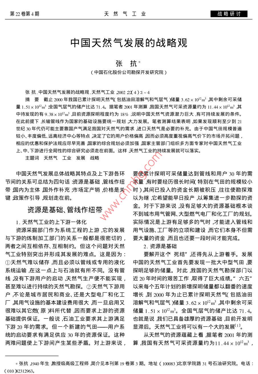 第22卷第4期天然氣工業(yè)戰(zhàn)略研討中國(guó)天然氣發(fā)展的戰(zhàn)略觀張抗(中國(guó)石化股份公司勘探開發(fā)研究院)張抗.中國(guó)天然氣發(fā)展的戰(zhàn)略觀.天然氣工業(yè)2002 22 4)1~4摘要截止2000年我國(guó)已累計(jì)探明天然氣(包括油田溶解氣和氣層氣)儲(chǔ)量3.62x 102m2其中剩余可采儲(chǔ)量1.51x 10-2m2全國(guó)氣層氣的儲(chǔ)產(chǎn)比達(dá)71.40據(jù)筆者2001年測(cè)算我國(guó)天然氣可采資源量約為11.44x102m3其中待發(fā)現(xiàn)的有9. 38 x 102m3 ,目前資源探明程度約為18% ,說明中國(guó)天然氣資源潛力巨大,有可持續(xù)發(fā)展的條件。在此前提下,長(zhǎng)輸管線作為國(guó)家的基礎(chǔ)設(shè)施要統(tǒng)-規(guī)劃,大力發(fā)展。筆者測(cè)算結(jié)果表明,如果發(fā)現(xiàn)順利至少到21世紀(jì)30年代仍可能主要靠國(guó)產(chǎn)氣滿足我國(guó)對(duì)天然氣的需求進(jìn)口天然氣是必要的補(bǔ)充。由于中國(guó)氣田規(guī)模普遍較小、豐度偏低、遠(yuǎn)離經(jīng)濟(jì)中心等特點(diǎn)決定了它的用戶價(jià)格偏高,因而必須高度重視偏高氣價(jià)下的市場(chǎng)開拓問題,相應(yīng)的優(yōu)惠和保護(hù)法規(guī)應(yīng)盡早完善國(guó)家的綜合規(guī)劃必須加強(qiáng),國(guó)家主管部門組織多方面專家對(duì)中國(guó)天然氣工業(yè)上、中、下游進(jìn)行全局性的綜合研究必須走在前面。這樣天然氣工業(yè)的持續(xù)發(fā)展就可以落實(shí)。主題詞天然氣工業(yè)發(fā)展戰(zhàn)略中國(guó)天然氣發(fā)展總體戰(zhàn)略其特點(diǎn)及上下游各環(huán)要使累計(jì)探明可采儲(chǔ)量達(dá)到管 線和用戶30年的需節(jié)間的關(guān)系可總結(jié)為四句話資源是基礎(chǔ)管線作紐求量有時(shí)要經(jīng)歷很長(zhǎng)時(shí)間(特別在氣田的規(guī)模較小帶國(guó)內(nèi)為主體國(guó)外作補(bǔ)充;市場(chǎng)定產(chǎn)銷,價(jià)格是關(guān)時(shí) )其間已投入的資金長(zhǎng)期被積壓,往往使勘探難鍵政策作引導(dǎo)規(guī)劃走在前。.以為繼,它希望能早日投產(chǎn),以籌集進(jìn)-步勘探的資資源是基礎(chǔ)、管線作紐帶金。對(duì)于下游來說,沒有足夠大的資源基礎(chǔ)根本談不到城市用氣管網(wǎng)、大型燃?xì)怆姀S和化工廠的規(guī)劃。1.天然氣工業(yè)的上下游一-體化實(shí)際情況是.上游有足夠多的氣時(shí),才能進(jìn)入管線和資源采掘部門作為系統(tǒng)工程的上游,它的發(fā)展用氣設(shè)施、工廠等的立項(xiàng)和建設(shè),而它們本身不但需與下游的煉制加工部門的關(guān)系一般都是很密切的,要大量的資 金而且也還要一段時(shí)間才能完成。兩者之間互相依存、互相制約。但這個(gè)問題對(duì)天然2.資源是基礎(chǔ)氣工業(yè)特別突出并形成其發(fā)展的難點(diǎn)。這是因?yàn)?要解開這個(gè)死結(jié)”,還得先從上游著手。發(fā)展①天然氣難以儲(chǔ)存,而且必須以管線或?qū)S玫囊夯袊?guó)的天然氣工業(yè)首 先要發(fā)現(xiàn)一批大中型氣田要系統(tǒng)運(yùn)輸,在這一點(diǎn)上與石油就有所不同。沒有管探明足夠的儲(chǔ)量。 對(duì)此,我國(guó)的天然氣勘探部門以線沒有下游用戶的啟動(dòng),天然氣生產(chǎn)便不能實(shí)現(xiàn),近20年時(shí)間的艱苦工作取得了巨大成績(jī)?!绷濉鄙踔岭y以進(jìn)行持續(xù)的天然氣勘探。②天然氣下游用以來每個(gè)五年計(jì)劃的新增探明儲(chǔ)量都以翻番的速度戶不論是城市居民和商業(yè)、還是大型電廠和化工增長(zhǎng)到2000年為止已累計(jì)探明天然氣(包括油田廠其用氣設(shè)施的基本建設(shè)費(fèi)用很大而一旦啟用又溶解氣和氣層氣)儲(chǔ)量3.62x 102m3其中剩余可采很難以其它燃(原)料所代替,因而要求上游的資源儲(chǔ)量1.51x 1042m。全國(guó)氣層氣的儲(chǔ)產(chǎn)比達(dá)71.40 .基礎(chǔ)提供保證。一般說,石油工業(yè)要求其上游滿足也就是說我們已具備雄厚的資源基礎(chǔ),目前開發(fā)明下游20年的需求。但一個(gè)新建的氣田一用戶系顯滯后。天然氣工業(yè)將可以有一個(gè)大的發(fā)展1。統(tǒng)的啟動(dòng)要求有滿足供應(yīng)30年的資源保證。這種從天然氣的資源蘊(yùn)藏上看據(jù)筆者2001 年的測(cè)兩難問題使上下游間產(chǎn)生某些矛盾。對(duì)上游來說,算 ,我國(guó)有天然氣可采資源量約為11.44x 102m3 ,*張抗,1940年生教授級(jí)高級(jí)工程師簡(jiǎn)介見本刊第19卷第3期。地址( 10083 )北京學(xué)院路31號(hào)石油研究院。電話:( 010 )82312963。戰(zhàn)略研討天然氣工業(yè)2002年7月其中待發(fā)現(xiàn)的有9. 38x 102m'。目前的資源探明程態(tài)度。一是我國(guó)天然氣有光明的發(fā)展前途將在國(guó)度約為18% ,中國(guó)天然氣資源潛力巨大,有可持續(xù)發(fā)民經(jīng)濟(jì)發(fā)展中起越來越大的作用。二是我國(guó)天然氣展的條件。資源(包括資源量、儲(chǔ)量、產(chǎn)量)的豐度(單位國(guó)土面3.管線是紐帶積的擁有量)明顯低于世界均值,如果以人均擁有量天然氣難以大規(guī)模儲(chǔ)存,而在氣田和用戶之間計(jì)算 則大大低于世界均值(表2)%從這一點(diǎn)出發(fā),必須有管線聯(lián)結(jié)。在氣田遠(yuǎn)離用戶(如塔里木到長(zhǎng)我國(guó)的天然氣資源應(yīng)是相對(duì)貧乏的國(