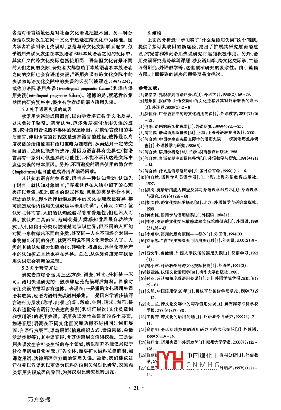 2002年第3外語與外語教學(xué)2002總第156期oreign Languages and Their Teaching語用失誤研究在中國孫亞戴凌(復(fù)旦大學(xué)外文系,上海200433摘要:本文考察了國內(nèi)語用失誤研究,指出了作者的觀點,進(jìn)一步說明了“什么是語用失誤”提供了探討其成因的新路徑,并建議擴展其研究層面關(guān)鍵詞:語用失誤;國內(nèi)研究Abstract: The paper attempts a survey of pragmatic failure study in China. While giving an account of pragmatic failure study in Chi-na, the paper clarifies the definition of pragmatic failure, provides new approaches to the cause of pragmatic failure and suggests wideningthe scope of pragmatic failure studyKey words: pragmatic failure, study in China中圖分類號:H00文獻(xiàn)標(biāo)識碼:A文章編號:1004-6038(2002)03-00191引言意圖和對對方的話語的理解都可能不同,因而某一不合適的珍妮·托瑪斯( Jenry Thomas)“跨文化語用失誤”(Cos話語從一個角度看,可能是語用語言方面的失誤,但從另cultural Pragmatic Failure)一文“為分析語用失誤和文化遷移建個角度看,也可能是社交語用方面的失誤”。(何自然,立起了理論框架,這一理論框架與其他社會語言學(xué)的研究成1988:203)果一起為國內(nèi)外的學(xué)者指明了方向,學(xué)者們紛紛著書立說使這一領(lǐng)域的研究呈現(xiàn)出欣欣向榮的景象”。(戴煒棟、張紅3語用失誤的成因及其研究方法玲,000語用失誤研究對于跨文化交際、外語教學(xué)、二語習(xí)首先,國內(nèi)學(xué)者的研究多局限于跨文化交際失誤或語際得等學(xué)科都有重要意義。文旭在“中國語用學(xué)20年”一文中語用失誤,自然把語用失誤的首位原因歸結(jié)為文化差異。在將語用失誤歸為語用學(xué)理論的應(yīng)用但因篇幅限制未有詳細(xì)跨文化交際中,由于一方(或雙方)對另一方的社會文化傳統(tǒng)論述。所以本文先就“什么是語用失誤”“語用失誤的成因缺乏了解交際雙方各持不同的文化觀點參與跨文化交際及研究方法”、“如何對待語用失誤及外語教學(xué)”三個問題做從自己的文化角度去揣度其他文化背景的人,結(jié)果兩種文化綜述,然后再談?wù)劰P者的看法。觀念不能相互融合,發(fā)現(xiàn)與自己的預(yù)期不同,就會產(chǎn)生文化沖突,出現(xiàn)不恰當(dāng)?shù)难孕小?王得杏,1990;莊恩平,1997;胡文2什么是語用失誤仲,1999:184;何兆熊,2000265具體表現(xiàn)為:兩種文化中舉一般認(rèn)為,當(dāng)說話人在言語交際中使用了符號關(guān)系正確止方式差異稱呼差異、價值觀念差異、社交因素(如談話時的句子,但說話不合適宜,或者說話方式不妥、表達(dá)不合習(xí)慣空位置、談話對象的身份或社會地位等)理解差異。(張巨等,具體說來,說話人不自覺地違反了人際規(guī)范、社會規(guī)約,文,2000何可自然,1997:206)由此“具有不同文化規(guī)范系統(tǒng)的或者不合時間空間、不看對象、不顧交際雙方的身份、地位、人所采取的交際策略也存有差異因而也會產(chǎn)生交際誤解”。場合等,違背目的語特有的文化價值觀念,使交際行為中斷(李剛,1999)或失敗使語言交際遇到障礙,導(dǎo)致交際不能取得預(yù)期效果第二,從二語習(xí)得的角度看,文化差異是語言使用中的或達(dá)到完滿的交際效果,這樣性質(zhì)的錯誤就叫語用失誤。干擾源,造成了負(fù)遷移,是產(chǎn)生語用失誤的根源。呂文華、魯(何自然,1997:205;錢冠連,1997:223;張巨文,20)語用失誤健驥(1993)認(rèn)為“由于學(xué)生的母語語用規(guī)則和文化因素是自有語用語言失誤( pragmalinguistic failure)和社交語用失誤(s幼習(xí)得的,已是他們的思維方式和行為準(zhǔn)則”,對學(xué)習(xí)和使用cialpragmatic failure)之分。“語用語言失誤指對語言語境把握外語形成干擾。戴煒棟、張紅玲(200指出“文化遷移是指不當(dāng)導(dǎo)致的語用失誤”(張巨文,2000);“社交語用方面的失由文化差異而引起的文化干擾,它表現(xiàn)為在跨文化交際中誤指交際中因不了解或忽視談話雙方的社會、文化背景差異或外語們下意識地用自己的文化準(zhǔn)則和價值觀來而出現(xiàn)的語言表達(dá)失誤?!?何自然,1997:207)但是“兩類語指導(dǎo)自中國煤化工:來評判他人的言行和用失誤的區(qū)分不是絕對的,由于語境不同,雙方各自的話語思想CNMHG解甚至仇恨”。一般作者簡介:孫亞(1973-),博士生,研究方向:認(rèn)知語言學(xué),語用學(xué)收稿日期:2001-09-10認(rèn)為母語文化因素和語用規(guī)則負(fù)遷移是語用失誤的原因,但應(yīng)甚至模仿對方那些所謂離格現(xiàn)象,達(dá)到交際上的成功,這是何自然(1996)認(rèn)為語用的負(fù)遷移不一定會導(dǎo)致語用失誤。正是語用移情導(dǎo)致的語言順應(yīng)策略”??缥幕浑H要取得成第三,文化差異、母語文化因素和語用規(guī)則遷移必定反功和和諧,有賴于交際雙方都重視語用移情。映在語言使用上?!翱缥幕浑H的過程既涉及文化的規(guī)約也但是,作為說話人當(dāng)然最好避免語用失誤,這也是研究涉及語言的規(guī)約?!?王得杏,1990)逾越語言規(guī)約致使語用失語用失誤的最終目的。因為文化差異是跨文化交際的主要誤體現(xiàn)在語言的各個層面。如在詞匯層面語用者“誤將漢、障礙,所以為了達(dá)到交際目的必須忽略文化差異,而這是可英詞匯一一對等,認(rèn)為英語詞匯在文化內(nèi)涵、外延上完全等能的