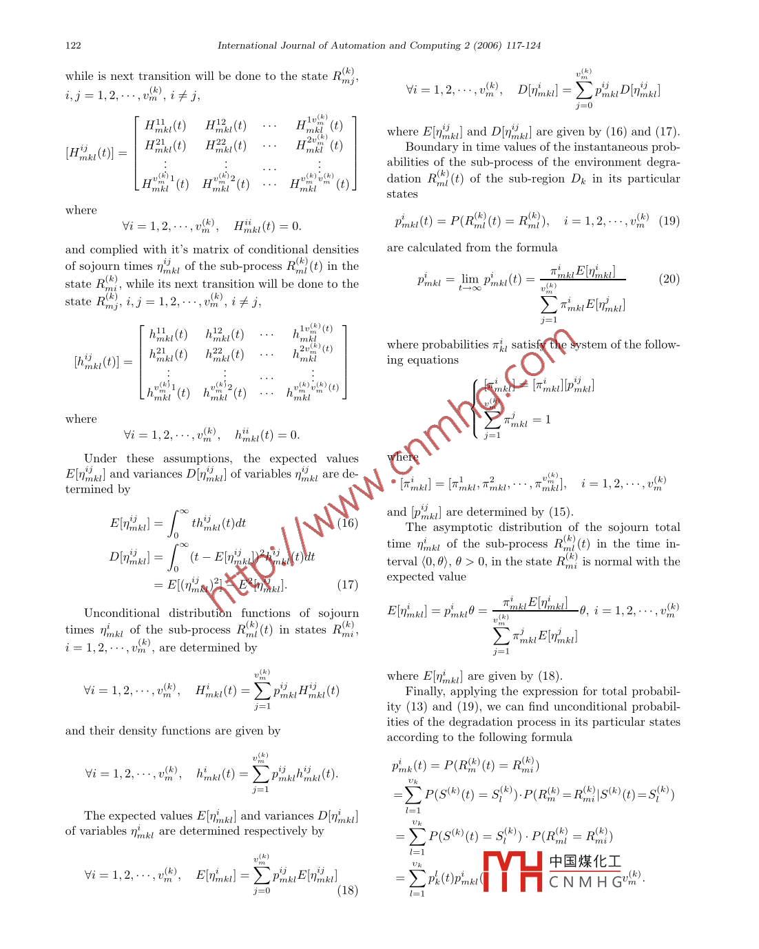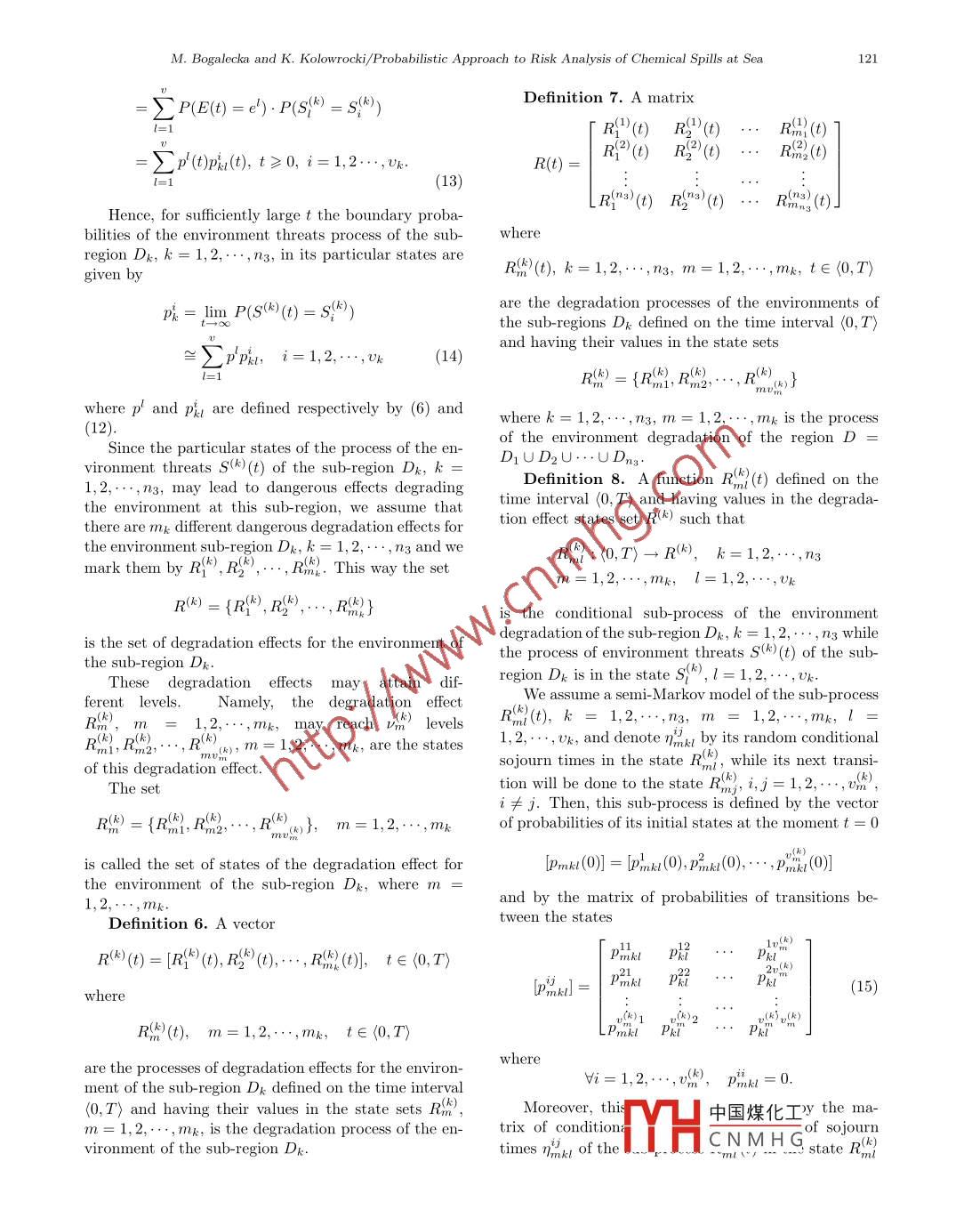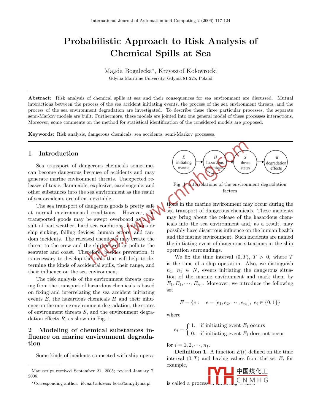 International Journal of Automation and Computing 2 (2006) 117-124Probabilistic A pproach to Risk Analysis ofChemical Spills at SeaMagda Bogalecka*, Krzysztof KolowrockiGdynia Maritime University, Gdynia 81-225, PolandAbstract: Risk analysis of chemical spills at sea and their consequences for sea environment are discussed. Mutualinteractions between the process of the sea accident initiating events, the process of the sea environment threats, and theprocess of the sea environment degradation are investigated. To describe these three particular processes, the separatesemi-Markov models are built. Furthermore, these models are jointed into one general model of these processes interactions.Moreover, some comments on the method for statistical identification of the considered models are proposed.Keywords: Risk analysis, dangerous chemicals, sea accidents, semi- Markov processes.1 IntroductioninitiatinghazardousthreatdegradatiorSea transport of dangerous chemicals sometimeseventschemicalsstateseffctsan become dangerous because of accidents and maygenerate marine environment threats. Unexpected re-leases of toxiAammable, explosive, carcinogenic, andFig. 1 Interrelations of the environment degradationother substances into the sea environment as the resultfactorsof sea accidents are often inevitable.The sea transport of dangerous goods is pretty safetions in the marine environment may occur during theat normal environmental conditions. However, thesea transport of dangerous chemicals. These incidentsnay bring abouttransported goods may be swept overboard as a re-sult of bad weather, hard sea conditions, collisions oricals into the sea environment and, as a result, mayship sinking, failing devices, human errors, and ran-possibly have disastrous influence on the human healthdom incidents. The released chemicals may create theand the marine environment. Such incidents are namedthreat to the crew and the ship as well as pollute thethe initiating event of dangerous situations in the shipseawater and coast. Therefore, besides prevention, itoperation surroundings.is necessary to develop the tools that will help to de-We fix the time interval (0,T), T > 0, where Ttermine the kinds of accidental spills, their range, andis the time of a ship operation. Also, we distinguishn1,n1∈N, events initiating the dangerous situa-their infuence on the sea environment.The risk analysis of the environment threats com-tion of the marine environment and mark them bying from the transport of hazardous chemicals is basedE1, E1,., En. Moreover, we introduce the followingon fixing and interrelating the sea accident initiatingseevents E, the hazardous chemicals H and their influ-E={e: e=[e,e,-,en], ei∈{0,1}}ence on the marine environment degradation, the statesof environment threats s, and the environment degra-wheredation effects R, as shown in Fig. 1.( 1,if initiating event E; occurs2 Modeling of chemical substances in-i={if initiating event E; does not occurfluence on marine environment degrada-tionDefinition 1. A function E(t) defined on the timeSome kinds of incidents connected with ship opera-interval (0,T〉 and having values from the set E, forexample,Manuscript received September 21, 2005; revised January 7,中國煤化工2006.*Corresponding author. E- mail address: kota@am.gdyniaplis called a processJMHCNMHG118International Journal of Automation and Computing 2 (2006) 117-124The vectors from the set E are called the states ofwherethe process E(t), while the set E is called the set ofVk= 1,2,..v,hK()=0.states of the process E(t).Under these assumptions about the process of the .We number the states of the process of initiatinginitiating events E(t), its selected parameters can beevents E(t) and have assumed that this process has Vfound.different states from the set. As such, we assume thatNamely, the expected values E[0kl] and variancesE={e,e,.,e"}D[0k] of variables 0hl are determined byE[0%]= th"(t)dt(2)e*=le',e.,,ef], k= 1,2..,0D(0%=|~ (t- E()h2()dtandej∈{0,1},j= 1,2..,n1.= E(0(k)2]- EB2[0的]。(3)Furthermore, we assume a semi-Markov model1] ofUnconditional distribution functions of sojournthe process E(t) and denote by θkl its random condi-times θk of the process E(t) in statesek, k= 1,2...,v,tional sojourn time in the state ek,while its next tran-are determined bysition will be done to the state e'. kh,l = 1,2,..,U,k:≠l. Then, the process is described by the vector ofVk= 1,2..0,H*()= >p"Hk(t)probabilities of its initial states at the moment t = 0[p(0)] = [p(0),2(20),,,p"(0)] .and their corresponding density functions are given byand by the matrix of probabilities of transitions be-tween the statesVk=1,2..,o,h*(t)= Sphk(t).1=p21The expected values E[0*] and variances D[0k] of[們=1)variables 0k are given respectively byVk=1,2..,u,E(0%]=>pE[0}] (4)Vk= 1,2,..,v,phk=0.Moreover, this process is defined by the matrix of-12.,,-.. D[的1=二D州conditional distribution functions of sojourn times 0klof the process E(t) in the state ek while its next tran-where E[0k] and D[0k] are defined by (2) and (3).sition will be done to the state e', k,l = 1,2,.., U,Boundary values of the instantaneous probabilitiesk:≠l,of the process of initiating events E(t) in its particularstates「Hl"(t) H12(t)Hl"(t)H21(t) H22(t)H20(t)p"(t)= P(E(t)=e*),k=1,2,..,0(5)[Hk(t)]=are calculated from the formula。H"l(t) H2(t) ...HO"()」p*= limp"(t)=-πk E[0幻]-, k= 1,2,.,0 (6)Vk= 1,2..,0,Hk*(t)=0.乙r' E[0]1=1This matrix is complied with the matrix of condi-tional densities of sojourn times Oet of the process E(t)where probabilities πk satisfy the system of the follow-in the state ek , while its next transition will be done toing equations .the statee', k,l= 1,2,,.,0, k≠l,[n"]= [π*]p們]「h1(t) hl2(t) .... h20(t)]h21(t) h22(t) .... h2(t)[h()]=中國煤化工[hl(t) h"2(t) ... h0(t)」JYHCNMH G .M. Bogalecka and K. Kolowrocki/Probabilistic Approach to Risk Analysis of Chemical Spills at Sea119and [pkI] is given by (1whereThe asymptot
