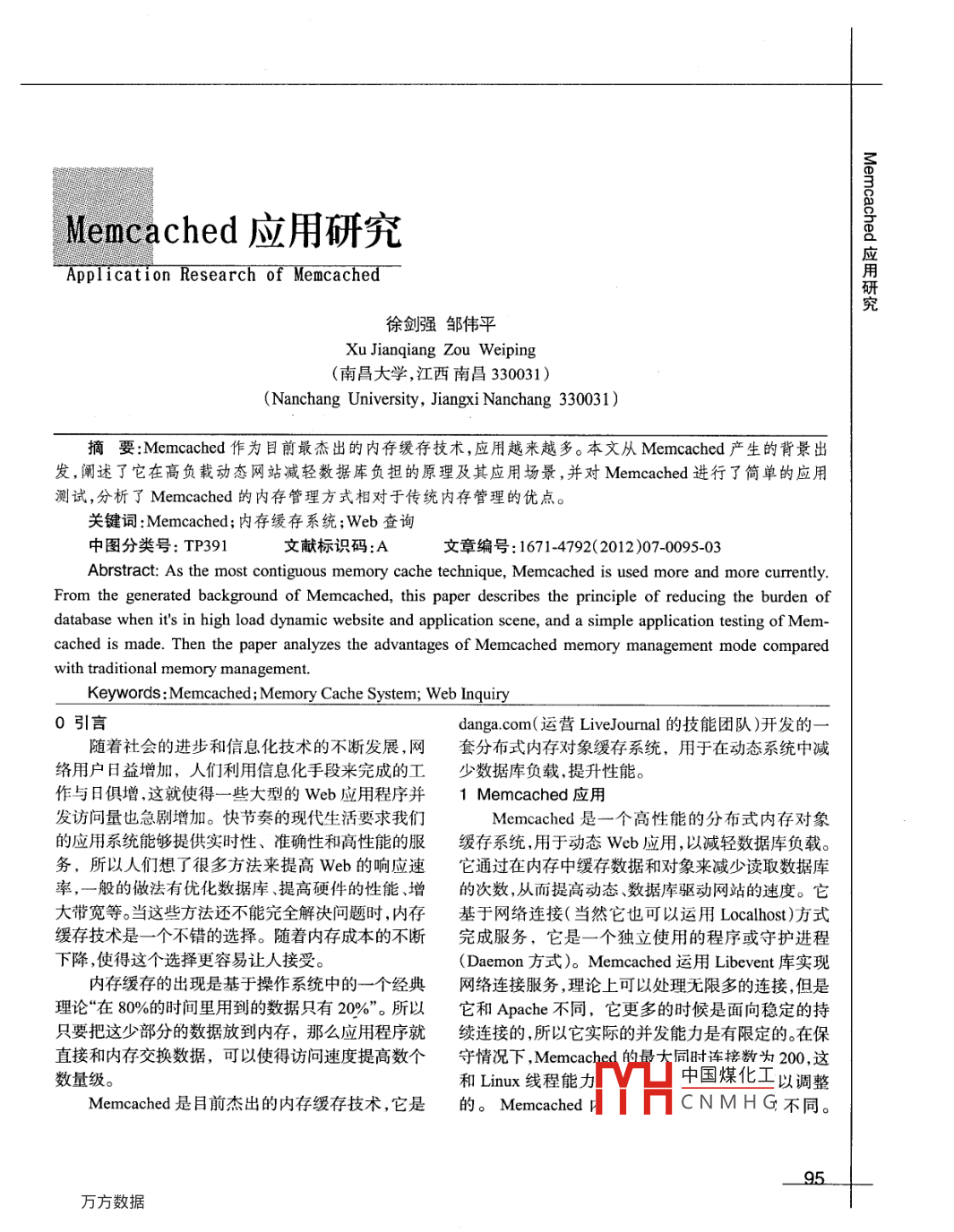 Memcached應(yīng)用研究Application Research of Memcached應(yīng)用研究徐劍強鄒偉平Xu Jianqiang Zou Weiping(南昌大學(xué),江西南昌330031)( Nanchang University, Jiangxi Nanchang 330031摘要: Memcached作為目前最杰出的內(nèi)存緩存技術(shù),應(yīng)用越來越多。本文從 Memcached產(chǎn)生的背景出發(fā),闡述了它在髙負載動態(tài)網(wǎng)站減輕數(shù)據(jù)庫負擔(dān)的原理及其應(yīng)用場景,并對 Memcached進行了簡單的應(yīng)用測試,分析了 Memcached的內(nèi)存管理方式相對于傳統(tǒng)內(nèi)存管理的優(yōu)點。關(guān)鍵詞: Memcached;內(nèi)存緩存系統(tǒng);Web查詢中圖分類號:TP391文獻標識碼:A文章編號:1671-4792(2012)07-009503Abrstract: As the most contiguous memory cache technique, Memcached is used more and more currentlyFrom the generated background of Memcached, this paper describes the principle of reducing the burden ofdatabase when it's in high load dynamic website and application scene, and a simple application testing of Memcached is made. Then the paper analyzes the advantages of Memcached memory management mode comparedwith traditional memory managementKeywords: Memcached; Memory Cache System; Web Inquiry0引言danga con(運營 LiveJournal I的技能團隊)開發(fā)的隨著社會的進步和信息化技術(shù)的不斷發(fā)展,網(wǎng)套分布式內(nèi)存對象緩存系統(tǒng),用于在動態(tài)系統(tǒng)中減絡(luò)用戶日益增加,人們利用信息化手段來完成的工少數(shù)據(jù)庫負載,提升性能。作與日俱增,這就使得一些大型的Web應(yīng)用程序并1 Memcached應(yīng)用發(fā)訪問量也急劇增加。快節(jié)奏的現(xiàn)代生活要求我們Memcached是一個高性能的分布式內(nèi)存對象的應(yīng)用系統(tǒng)能夠提供實時性、準確性和高性能的服緩存系統(tǒng),用于動態(tài)Web應(yīng)用,以減輕數(shù)據(jù)庫負載。務(wù),所以人們想了很多方法來提高Web的響應(yīng)速它通過在內(nèi)存中緩存數(shù)據(jù)和對象來減少讀取數(shù)據(jù)庫率,一般的做法有優(yōu)化數(shù)據(jù)庫、提高硬件的性能、增的次數(shù),從而提高動態(tài)、數(shù)據(jù)庫驅(qū)動網(wǎng)站的速度。它大帶寬等。當(dāng)這些方法還不能完全解決問題時,內(nèi)存基于網(wǎng)絡(luò)連接(當(dāng)然它也可以運用 Localhost)方式緩存技術(shù)是一個不錯的選擇。隨著內(nèi)存成本的不斷完成服務(wù),它是一個獨立使用的程序或守護進程下降,使得這個選擇更容易讓人接受( Daemon方式)。 Memcached運用 Libevent庫實現(xiàn)內(nèi)存緩存的出現(xiàn)是基于操作系統(tǒng)中的一個經(jīng)典網(wǎng)絡(luò)連接服務(wù),理論上可以處理無限多的連接,但是理論“在80%的時間里用到的數(shù)據(jù)只有20%”。所以它和 Apache不同,它更多的時候是面向穩(wěn)定的持只要把這少部分的數(shù)據(jù)放到內(nèi)存,那么應(yīng)用程序就續(xù)連接的所以它實際的并發(fā)能力是有限定的。在保直接和內(nèi)存交換數(shù)據(jù),可以使得訪問速度提高數(shù)個守情況下, Memcached i的大同時連接數(shù)為20,這數(shù)量級。和 Linux線程能力中國煤化工以調(diào)整Memcached是目前杰出的內(nèi)存緩存技術(shù),它是的。 Memcached FCNMHG不同。APC是基于共享內(nèi)存和MMAP的, Memcache有自echo"n"str pad (Read datas from MySQL. 60己的內(nèi)存分配算法和管理方式,它和共享內(nèi)存沒有聯(lián)系,也沒有共享內(nèi)存的限定。通常情況下,每個Sconnnect-mysql connect(localhost, 'root, ) /Memcached進程可以管理2GB的內(nèi)存空間。如果連接到mysq需要更多的空間,可以添加進程數(shù)。mysql select db(test;∥/選擇數(shù)據(jù)庫Memcached僅適用于“分布式”的內(nèi)存對象緩Result= mysql query($sql);∥/執(zhí)行查詢存系統(tǒng),也就是說,對于那些不需要“分布”的,不需while(Srow =mysql fetch row(Sresult)要共享的,或者說規(guī)模小到只有一臺服務(wù)器的使用,Sdatas[]= Row;Memcached不會帶來任何優(yōu)點,相反還會降低系統(tǒng)∥將數(shù)據(jù)庫中獲取到的結(jié)果集數(shù)據(jù)保存到效率。因為網(wǎng)絡(luò)連接同樣需要資源,即使是UNX本 memcached中,以供下次訪問時使用。地連接也一樣,所以,如果只是本地級緩存,運用Smc->add(skey, Datas);Memcached是非常不劃算的。3 elseMemcached的工作方式是:當(dāng)用戶第一次調(diào)用echo"n"str pad (Read datas from memcached程序時,首先查看 Memcached中是否有所需要的數(shù)60,)."n";據(jù),如果有直接調(diào)用,如果沒有則從數(shù)據(jù)庫訪問,并}同時寫入 Memcached之中,以備日后調(diào)用。它的var dump( Datas);∥/輸出讀取的數(shù)據(jù)般工作方式可以用圖一來表示2 Memcached的鏈接和測試客戶端連接 Memcached和對已寫入Mercached的數(shù)據(jù)的簡單操作代碼如下∥連接Smem test= new Memcache.S mem test ->connect("localhost", 11211)S mem test ->set (keyl, This is first value, 0,第一次取數(shù)據(jù)60);∥/保存數(shù)據(jù)Sval=$ mem test-get(key 1);echo"Get keyl value: Sval.