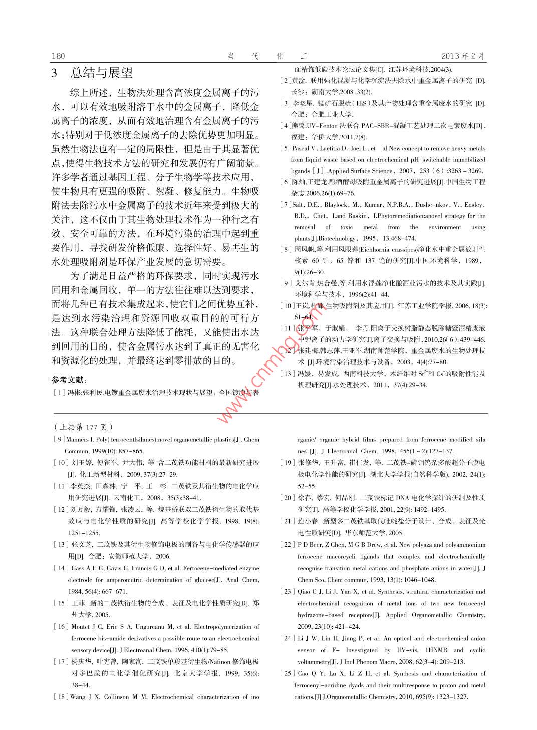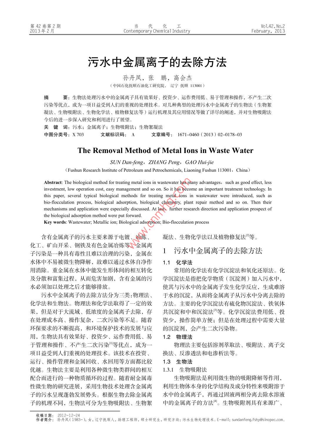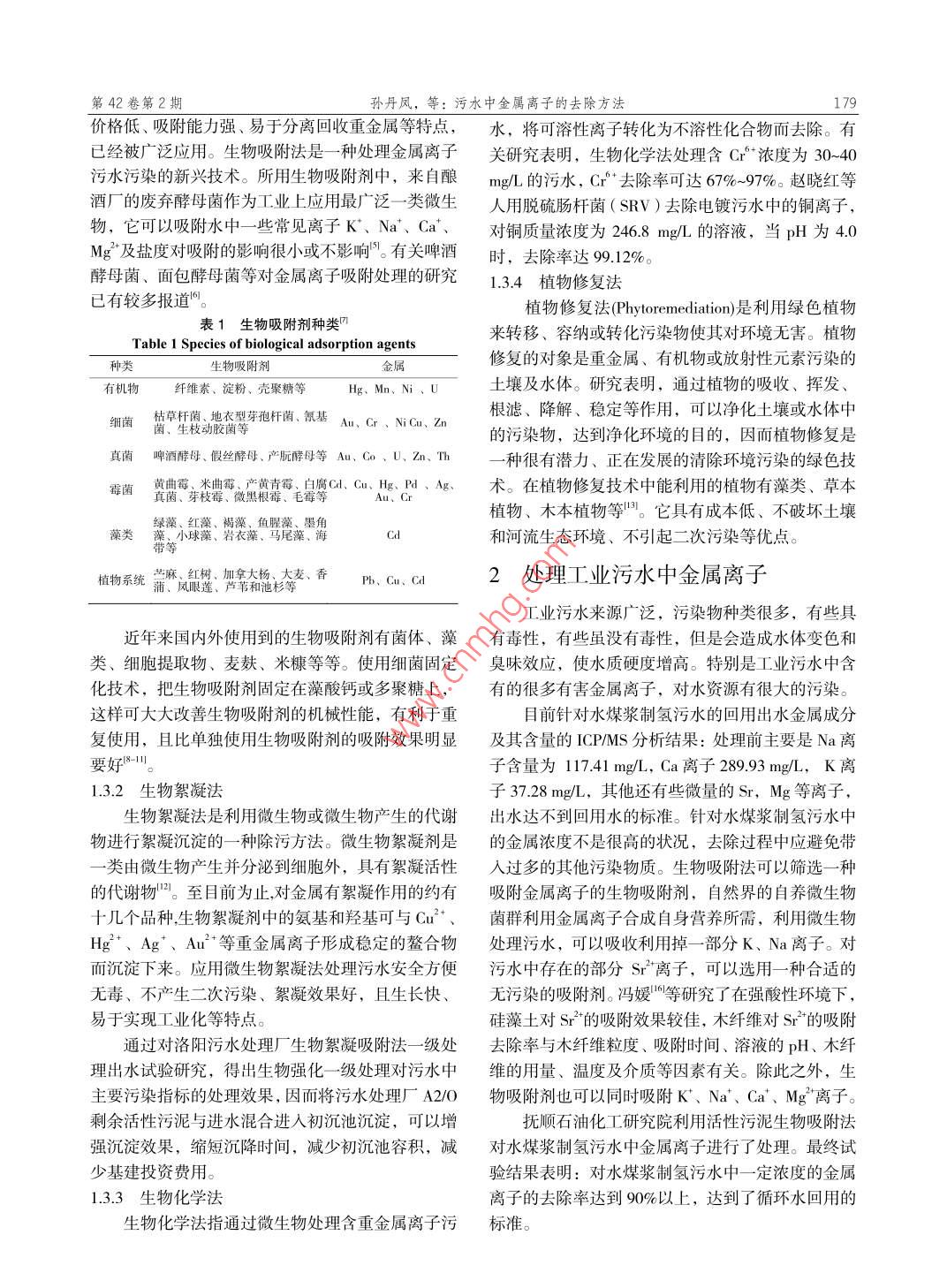 第42卷第2期當Vo1.42, No.22013年2月Contemporary Chemica 1 IndustryFebruary, 2013污水中金屬離子的去除方法孫丹鳳,張鵬,高會杰(中國石化撫順石油化工研究院,遼寧撫順13001 )摘要:生物法處理污水中的金屬離子具有效果好、投資少、運作費用低、易于管理和操作,不產(chǎn)生二次污染等優(yōu)點,成為一項日益受到人們的重視的處理技術(shù)。對幾種典型的處理污水中金屬離子的生物法(生物絮凝法、生物吸附法、生物化學(xué)法、植物修復(fù)法等)運行機理及其應(yīng)用情況等做了詳盡的闡述,并對生物吸附法今后的進一-步深入研究和利用進行了展望。關(guān)鍵詞:污水;金屬離子;生物吸附法;生物絮凝法中圖分類號: X 703文獻標識碼: A文章編號: 1671-0460 (2013) 02 -0178-03The Removal Method of Metal Ions in Waste WaterSUN Dan-feng,ZHANG Peng, GAO Hui-jie( Fushun Research Institute of Petroleum and Petrochemicals, Liaoning Fushun 113001,China)Abstract: The biological method for treating metal ions in wastewater has many advantages, such as good effect, lessthis paper, several typical biological methods for treating metal ions in wastewater were introduced, such asbio-flocculation process, biological adsorption, biological chemistry, plant repair method and so on. Then theirmechanisms and application were especially discussed. At last, further research direction and application prospect ofthe biological adsorption method were put forward.Key words: Wastewater; Metallic ion; Biological adsorption; Bio-flocculation process含有金屬離子的污水主要來源于電鍍、冶煉、凝法、生物化學(xué)法以及植物修復(fù)法甲等?;?、礦山開采、鋼鐵及有色金屬冶煉等。金屬離1污水中金屬離子的去除方法子污染是一一種具有毒性且難以治理的污染,金屬在水體中不易被微生物降解,故難以通過水體自凈作1.1化學(xué)法用消除。重金屬在水體中能發(fā)生形體間的相互轉(zhuǎn)化常用的化學(xué)法有化學(xué)沉淀法和氧化還原法?;胺稚⒑透患^程,從而危害加劇,含有金屬的污學(xué)沉淀法是指把化學(xué)物質(zhì)(沉淀劑)加入污水中,水必須加以處理之后才能夠排放。使其與污水中的金屬離子發(fā)生化學(xué)反應(yīng),生成難溶污水中金屬離子的去除方法分為三類:物理法、于水的沉淀,從而將金屬離子從污水中分離去除的化學(xué)法和生物法。物理法和化學(xué)法取得了- -定的效方法。主要的化學(xué)沉淀法有硫化物沉淀法、鐵氧體果,但是對于大流域、低濃度的金屬離子去除,存共沉淀和中和沉淀法等。化學(xué)沉淀法費用低、投在處理成本高、操作復(fù)雜,二次污染等不足。隨著資少,操作簡單方便;但是在處理過程中需要大量環(huán)保要求的不斷提高,和環(huán)境保護技術(shù)的發(fā)展與應(yīng)的沉淀劑,會產(chǎn)生二次污染物。用,生物法具有效果好、投資少、運作費用低、易.2 物理法于管理和操作、不產(chǎn)生二次污染"等優(yōu)點,成為一物理法主要包括溶劑萃取法、吸附法、離子交項8益受到人們重視的處理技術(shù)。該技術(shù)在投資、換法、反滲透法和電滲析法等。運行、操作管理和金屬回收、水回用等方面都比較1.3 生物法優(yōu)越。生物法主要是利用各種微生物類群間的相互1.3.1生 物吸附法配合而進行的一-種物質(zhì)循環(huán)的過程。隨著耐金屬毒生物吸附法是利用微生物的吸附降解等作用,性微生物的研究進展,采用生物技術(shù)處理含金屬離利用生物體本身的化學(xué)結(jié)構(gòu)及成分特性來吸附溶于子的污水呈現(xiàn)蓬勃發(fā)展勢頭。根據(jù)生物去除金屬離水中的金屬離子,再通過固液兩相分離去除水溶液子的機理不同,生物法可分為生物吸附法、生物絮中的金屬離子的方法"。生物吸附劑具有來源廣、收稿日期: 2012-12-24作者簡介:孫丹鳳( 1983-),女,遼寧撫順人,助理工程師,碩士研究生,研究方向:污水生物處理技術(shù)。E-mail: sundanfeng.fshy@sinopec.com.第42卷第2期孫丹鳳,等:污水中金屬離子的去除方法179價格低、吸附能力強、易于分離回收重金屬等特點,水,將可溶性離子轉(zhuǎn)化為不溶性化合物而去除。有已經(jīng)被廣泛應(yīng)用。生物吸附法是-一種處理金屬離子關(guān)研究表明,生物化學(xué)法處理含Cr+濃度為30~40污水污染的新興技術(shù)。所用生物吸附劑中,來自釀mg/L的污水,Cr *去除率可達67%~97%。趙曉紅等酒廠的廢棄酵母菌作為工業(yè)上應(yīng)用最廣泛一類微生人用脫硫腸桿菌( SRV )去除電鍍污水中的銅離子,物,它可以吸附水中一些常見離子K"、Na、Ca*、對銅質(zhì)量濃度為246.8 mg/L的溶液,當pH為4.0Mg°及鹽度對吸附的影響很小或不影響”。有關(guān)啤酒時,去除率達99.12%。酵母菌、面包酵母菌等對金屬離子吸附處理的研究1.3.4植物修 復(fù)法已有較多報道”。植物修復(fù)法(Phytoremediation)是利用綠色植物表1生物吸附劑種類'來轉(zhuǎn)移、容納或轉(zhuǎn)化污染物使其對環(huán)境無害。植物Table 1 Species of biological adsorption agents修復(fù)的對象是重金屬、有機物或放射性元素污染的種類生物吸附劑有機物纖維素、淀粉、殼聚糖等Hg、Mn、Ni、U土壤及水體。研究表明,通過植物的吸收、揮發(fā)、細菌枯草桿菌、地衣型芽孢桿菌、氰基 An,Cr、NiCu、Zn根濾、降解、穩(wěn)定等作用,可以凈化土壤或水體中菌、生枝動膠菌等的污染物,達到凈化環(huán)境的目的,因而植物修復(fù)是真菌啤酒酵母.假絲