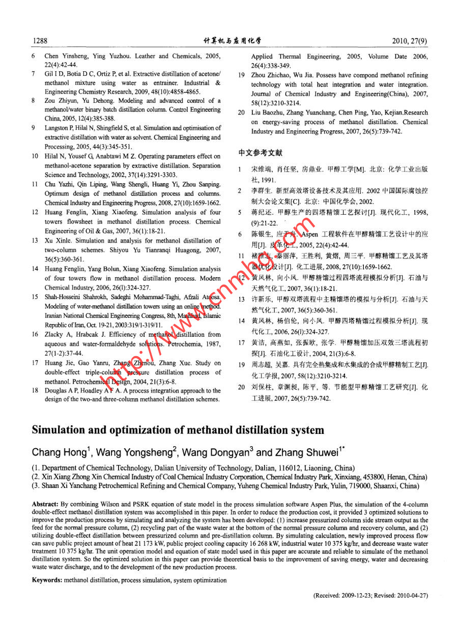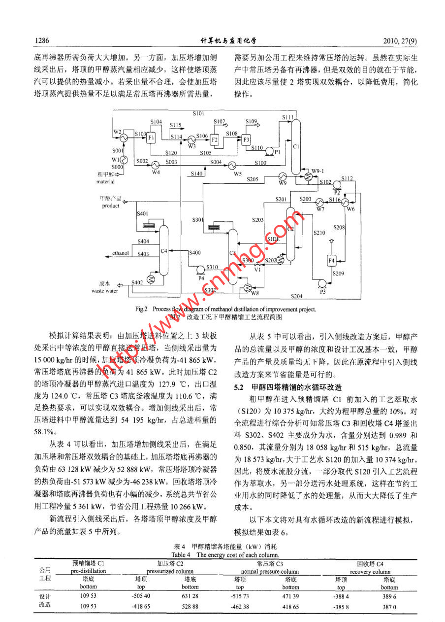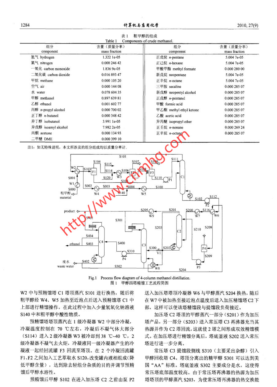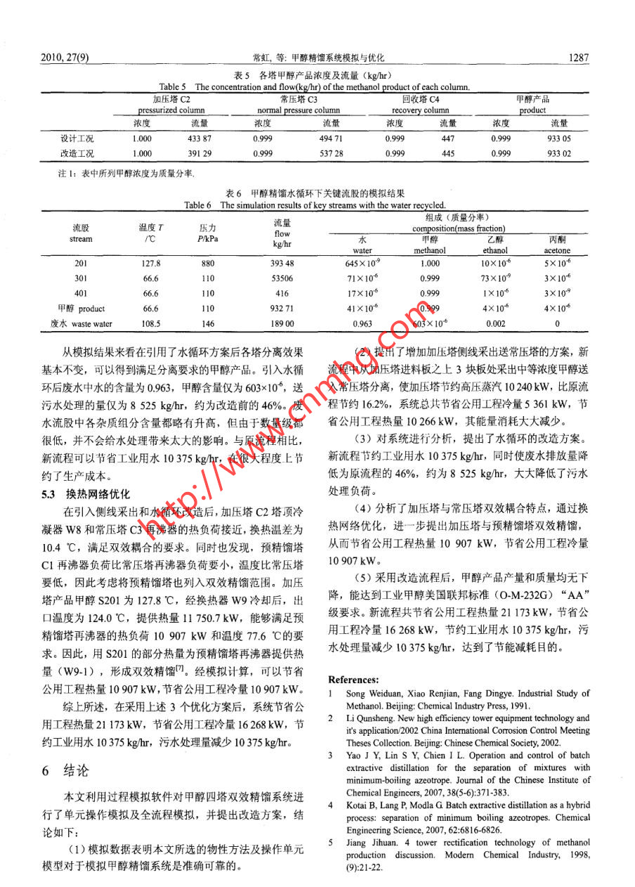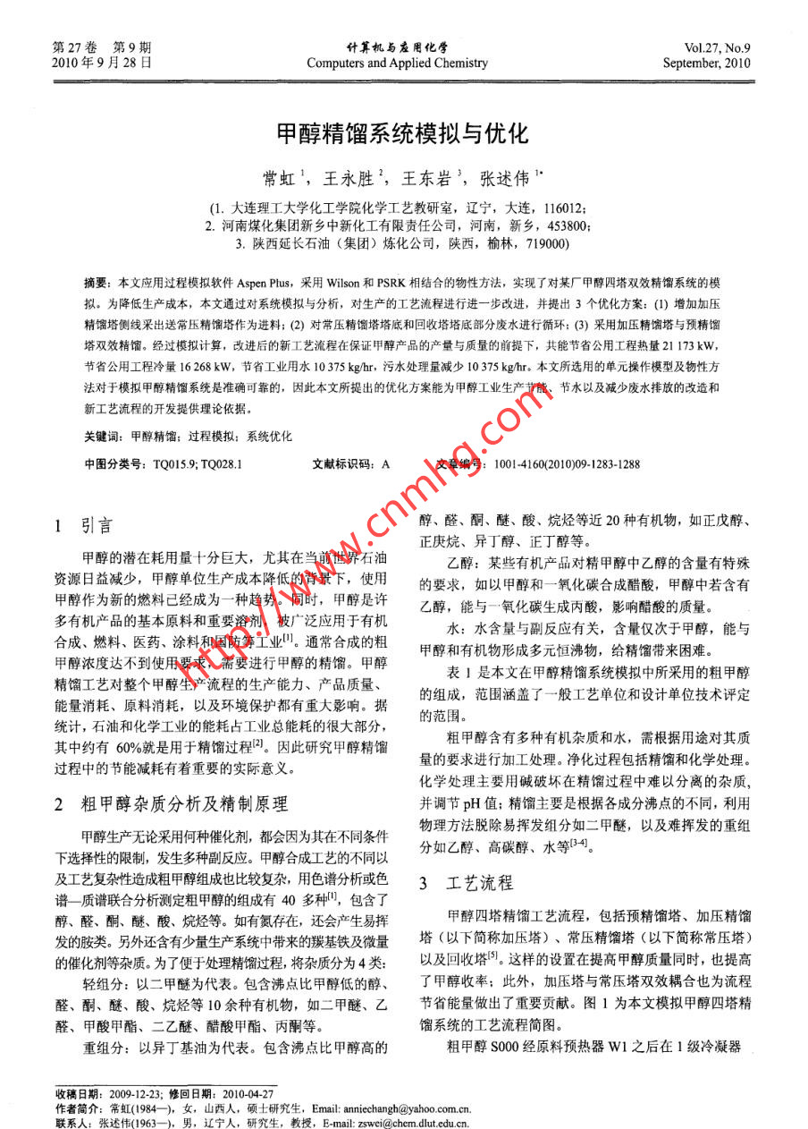 第27卷第9期計算機(jī)與應(yīng)用化學(xué)Vol.27, No.92010年9月28日Computers and Applied ChemistrySeptember, 2010甲醇精餾系統(tǒng)模擬與優(yōu)化常虹',王永勝”,王東巖’,張述偉”(1.大連理工大學(xué)化工學(xué)院化學(xué)工藝教研室,遼寧,大連,116012;2.河南煤化集團(tuán)新鄉(xiāng)中新化工有限責(zé)任公司,河南,新鄉(xiāng),453800;3.陜西延長石油(集團(tuán))煉化公司,陜西,榆林,719000)摘要;本文應(yīng)用過程模擬軟件Aspen Plus,采用Wilson和PSRK相結(jié)合的物性方法,實(shí)現(xiàn)了對某廠甲醇四塔雙效精餾系統(tǒng)的模擬。為降低生產(chǎn)成本,本文通過對系統(tǒng)模擬與分析,對生產(chǎn)的工藝流程進(jìn)行進(jìn)一步改進(jìn),并提出3個優(yōu)化方案: (1) 增加加壓精餾塔側(cè)線采出送常壓精餾塔作為進(jìn)料; (2) 對常壓精餾塔塔底和回收塔塔底部分廢水進(jìn)行循環(huán): (3) 采用加壓精餾塔與預(yù)精餾塔雙效精餾。經(jīng)過模擬計算,改進(jìn)后的新工藝流程在保證甲醇產(chǎn)品的產(chǎn)量與質(zhì)量的前提下,共能節(jié)省公用工程熱量21 173 kW,節(jié)省公用工程冷量16 268 kW,節(jié)省工業(yè)用水10 375 kg/hr,污水處理量減少10 375 kg/hr.本文所選用的單元操作模型及物性方法對于模擬甲醇精餾系統(tǒng)是準(zhǔn)確可靠的,因此本文所提出的優(yōu)化方案能為甲醇工業(yè)生產(chǎn)節(jié)能、節(jié)水以及減少廢水排放的改造和新工藝流程的開發(fā)提供理論依據(jù)。關(guān)鍵詞:甲醇精餾;過程模擬;系統(tǒng)優(yōu)化中圖分類號: TQ015.9; TQ028.1文獻(xiàn)標(biāo)識碼: A文章編號: 1010109-1283-12881引言醇、醛、酮、醚、酸、烷烴等近20種有機(jī)物,如正戊醇、正庚烷、異丁醇、正丁醇等。甲醇的潛在耗用量十分巨大,尤其在當(dāng)前世界石油乙醇:某些有機(jī)產(chǎn)品對精甲醇中乙醇的含量有特殊資源日益減少,甲醇單位生產(chǎn)成本降低的背景下,使用的要求,如以甲醇和-氧化碳合成醋酸,甲醇中若含有甲醇作為新的燃料已經(jīng)成為一種趨勢。 同時,甲醇是許乙醇,能與-氧化碳生成丙酸,影響醋酸的質(zhì)量。多有機(jī)產(chǎn)品的基本原料和重要溶劑,被廣泛應(yīng)用于有機(jī)水:水含量與副反應(yīng)有關(guān),含量僅次于甲醇,能與合成、燃料、醫(yī)藥、涂料和國防等工業(yè)"。通常合成的粗甲醇和有機(jī)物形成多元恒沸物,給精餾帶來困難。甲醇濃度達(dá)不到使用要求,需要進(jìn)行甲醇的精餾。甲醇表1是本文在甲醇精餾系統(tǒng)模擬中所采用的粗甲醇精餾工藝對整個甲醇生產(chǎn)流程的生產(chǎn)能力、產(chǎn)品質(zhì)量、的組成,范圍涵蓋了一般工藝單位和設(shè)計單位技術(shù)評定能量消耗、原料消耗,以及環(huán)境保護(hù)都有重大影響。據(jù)的范圍。統(tǒng)計,石油和化學(xué)工業(yè)的能耗占工業(yè)總能耗的很大部分,粗甲醇含有多種有機(jī)雜質(zhì)和水,需根據(jù)用途對其質(zhì)其中約有60%就是用于精餾過程2。因此研究甲醇精餾量的要求進(jìn)行加工處理。凈化過程包括精餾和化學(xué)處理。過程中的節(jié)能減耗有著重要的實(shí)際意義?;瘜W(xué)處理主要用堿破壞在精餾過程中難以分離的雜質(zhì),2粗甲醇雜質(zhì)分析及精制原理并調(diào)節(jié)pH值;精餾主要是根據(jù)各成分沸點(diǎn)的不同,利用甲醇生產(chǎn)無論采用何種催化劑,都會因?yàn)槠湓诓煌瑮l件物理方法脫除易揮發(fā)組分如二甲醚,以及難揮發(fā)的重組下選擇性的限制,發(fā)生多種副反應(yīng)。甲醇合成工藝的不同以分如乙醇、高碳醇、水等34。及工藝復(fù)雜性造成粗甲醇組成也比較復(fù)雜,用色譜分析或色3工藝流程譜-質(zhì)譜聯(lián)合分析測定粗甲醇的組成有40多種",包含了醇、醛、酮、醚酸、烷烴等。如有氮存在,還會產(chǎn)生易揮甲醇四塔精餾工藝流程,包括預(yù)精餾塔、加壓精餾發(fā)的胺類。另外還含有少量生產(chǎn)系統(tǒng)中帶來的羰基鐵及微量塔(以下簡稱加壓塔)、常壓精餾塔(以下簡稱常壓塔)的催化劑等雜質(zhì)。為了便于處理精餾過程,將雜質(zhì)分為4類:以及回收塔"5]。這樣的設(shè)置在提高甲醇質(zhì)量同時,也提高輕組分:以二甲醚為代表。包含沸點(diǎn)比甲醇低的醇、了甲醇收率:此外,加壓塔與常壓塔雙效耦合也為流程醛、酮、醚、酸、烷烴等10余種有機(jī)物,如二甲醚、乙節(jié)省能量做出了重要貢獻(xiàn)。圖1為本文模擬甲醇四塔精醛、甲酸甲酯、二乙醚、醋酸甲酯、丙酮等。餾系統(tǒng)的工藝流程簡圖。重組分:以異丁基油為代表。包含沸點(diǎn)比甲醇高的粗甲醇S000經(jīng)原料預(yù)熱器W1之后在1級冷凝器收稿日期: 2009-12-23; 修回日期: 2010-04-27作者簡介:常虹(1984- -),女山西人,碩士研究生,Email: aniechangh@yahoo .com.cn.聯(lián)系人:張述偉(1963- -)。男,遼寧人,研究生,教授,E-mail: zswei@chem dlut.edu.cn.1284計算機(jī)與應(yīng)用化學(xué)2010, 27(9)表1 粗甲醇的組成Table l Components of crude methanol.含量(質(zhì)量分率)組分componentmass fraction氫氣hydrogen1.322 1e-05正戊烷n-pentane5.004 7e-05氦氣nitrogen0.000 246 42正已烷n-hexane-氧化carbon monoxide1.836 9e-05甲酸甲酯methyl formate0.000 280 00二氧化碳carbon dioxide0.016 893 47.新戊烷neopentane甲烷methane0.000 105 20正辛烷noctane空氣air0.000 144 08三甲胺secaline0.000 285 07水water0.078 60