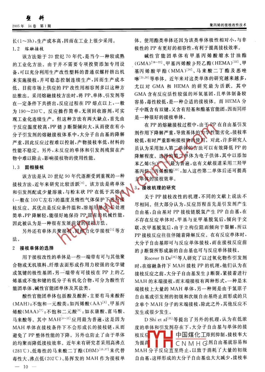 塑料豪內(nèi)烯的接枝改性技術(shù)2005年34卷第1期聚丙烯的接枝改性技術(shù)梁淑君,李東紅,趙洪池(1.華北工學(xué)院分院材料科學(xué)與工程系,山西,太原030008;2.保定師范專科學(xué)?;瘜W(xué)系,河北,保定071051)摘要:近年來,聚丙烯的化學(xué)改性研究引起了廣泛的關(guān)注,其中以接枝改性為主。綜述了聚丙烯接枝改性的幾種常用方法,總結(jié)了聚丙烯接枝改性的機理、接枝單體的選擇以及接枝產(chǎn)物的表征手段。關(guān)鍵詞:聚丙烯;本體接枝;改性中圖分類號:TQ325.14文獻標(biāo)識碼:A文章編號:1001-9456(2005)01-0009-05Modification of Polypropylene with Grafting TechniquesLIANG Shu-jun', LI Dong-hong, ZHAO Hong-chi(1. Department of Material Engineering, College Branch of North China Institute of Technology, Taiyuan, Shanxi 030008, China;2 Department of Chemistry, Baoding Teachers College, Baoding, Hebei 071051, China)Abstract: In recent years, the chemical modification of polypropylene has gained increasing re-search interest. Of the several modification ways, grafting techniques has been performed intensively.The studies on grafting of polypropylene are reviewed, including the characteristics of several mainmethods, selections of monomers, the grafting theories and the characterization of the graft polymer.Key words: polypropylene; mass grafting; modification前言多學(xué)者和技術(shù)人員在PP改性用相容劑的研究和開發(fā)聚丙烯(P)是一種綜合性能優(yōu)異的熱塑性通用方面做了大量的工作。其中研究最多的相容劑是通過塑料,加之密度小、易加工、生產(chǎn)成本低,使PP在日常接枝共聚-3的方法得到各種PP接枝物用品、包裝材料、家用電器、汽車工業(yè)、建筑施工等行業(yè)通過接枝得到PP共聚物的方法分為本體接枝和得到了廣泛的應(yīng)用,成為近十幾年來增長速度最快的表面接枝,兩者的區(qū)別在于后者只是對PP材料的表塑料之一。但是PP也有一些缺點,如:熔點較低、熱面性能加以改善,而不影響其本體性能??梢杂米鱿嘧冃螠囟鹊?、抗蠕變性差、尺寸穩(wěn)定性不好、低溫脆性容劑的PP接枝物主要是本體接枝產(chǎn)物等,限制了其作為工程受力材料的使用。1接枝方法近年來,采用合金化或復(fù)合化等改性技術(shù)得到高PP的接枝改性方法主要有溶液法、熔融法、固相性能PP材料的研究引起了廣泛的關(guān)注。但由于PP法等。的非極性,使其與極性聚合物、無機填料以及增強性纖1.1溶液接枝維之間的相容性差,從而極大地阻礙了PP高性能化該方法是在20世紀(jì)60年代發(fā)展起來的,其過程的進程。到目前為止,常用的提高聚合物改性體系相是首先在100~140℃溫度下,將PP溶解在沸騰的甲容性的方法主要是在體系中加入接枝、嵌段共聚物或苯、二甲苯或苯溶液中,然后加入單體和引發(fā)劑進行接低分子量化合物作相容劑。相容劑的加入可以使不相枝反應(yīng),接枝物經(jīng)丙酮萃取未反應(yīng)的單體后形成最終容的兩相通過物理作用或化學(xué)反應(yīng)取得協(xié)同效應(yīng),增產(chǎn)中國煤化工P降解輕接枝率高加混容性,并提高改性體系的性能。因此,國內(nèi)外很但CNMHG不境污染,且反應(yīng)時間收稿日期:2004-09-06作者簡介:梁淑君(1970—),女,碩士,從事教學(xué)工作,主要研究方向為聚烯烴類高分子材料加工及共混改性料2005年34卷第期聚丙烯的接枝改性技術(shù)長(1~3h),生產(chǎn)成本高,因而在工業(yè)上很少采用。體。使用酯類單體還因為該類單體極性相對小與非1.2熔融接枝極性的PP有更好的相容性,有利于提高接枝效率該方法始于20世紀(jì)70年代,是當(dāng)今一種較成熟堿性官能團單體有甲基丙烯酸縮水甘油酯的工業(yè)化方法。由于并不需要專項投資添加專用設(shè)(GMA)3-2、甲基丙烯酸β羥乙酯(HEMA)21、甲備,可以充分利用生產(chǎn)改性塑料的普通雙螺桿擠出機基丙烯酸甲酯(MMA)20、馬來酸二丁酯及惡唑來實施接枝,并可穩(wěn)態(tài)控制連續(xù)生產(chǎn),因而生產(chǎn)成本啉3等單體。近年來對這類單體的研究越來越多,低。目前市場上供應(yīng)的PP改性用相容劑多以這種方尤以對GMA和HEMA的研究最為活躍。其中法推出。采用熔融接枝方法時,將PP、單體、引發(fā)劑等GMA含有反應(yīng)活性較強的環(huán)氧基團,且單體制備較在一定條件下共擠出,反應(yīng)過程在PP熔點以上,一般容易,毒性較低,是一種合適的接枝體。而HEMA分為190~230℃。反應(yīng)操作簡單,無須回收溶劑,可實子中既含有雙鍵又含有羥基和酯基官能團因而同樣現(xiàn)工業(yè)化連續(xù)生產(chǎn)。但這種方法有兩大缺點,首先由是一種很好的接枝單體于反應(yīng)溫度較高,PP鏈β斷裂傾向大,從而使在有小在PP的熔融接枝過程中,由于PP在自由基引發(fā)分子引發(fā)劑的熔融接枝體系中,大分子自由基的降解劑作用下降解嚴重,導(dǎo)致基體的力學(xué)性能劣化接枝率嚴重,因此反應(yīng)過程難以控制,產(chǎn)物接枝率低,材料的較低,有時嚴重影響接枝物的使用。對此許多研究人性能不穩(wěn)定。另外,未反應(yīng)的單體和引發(fā)劑殘留在產(chǎn)員認為采用加入第二單體的方法可以有效降低P的物中難以除去,影響接枝物的使用性能。降解程度。選擇的第二單體為電子供體,其中以添加苯乙烯(St)-32最為普遍,也有文獻報道采用三羥甲1.3固相接枝基丙烷三丙烯酸酯3,加入這些第二單體后還可提高該方法是從20世紀(jì)90年