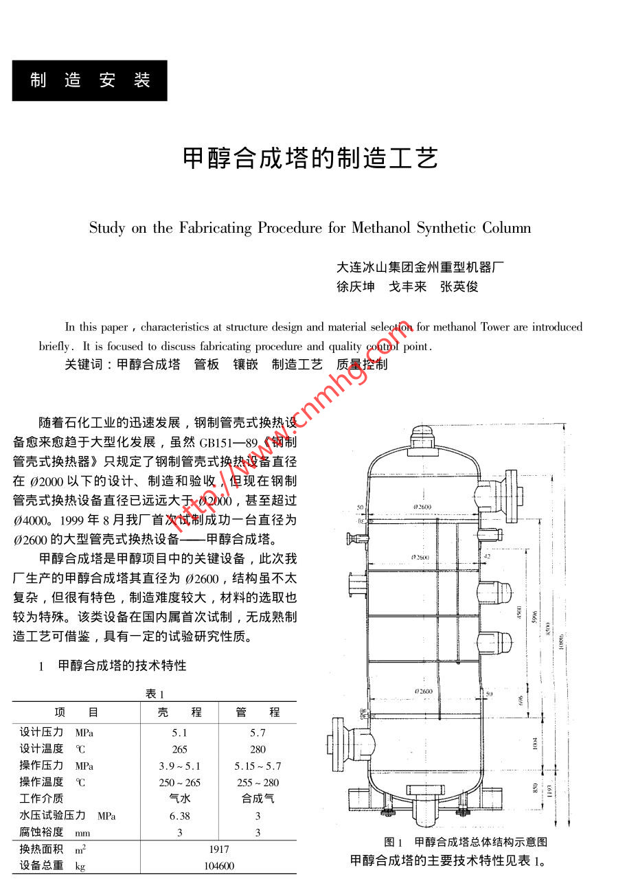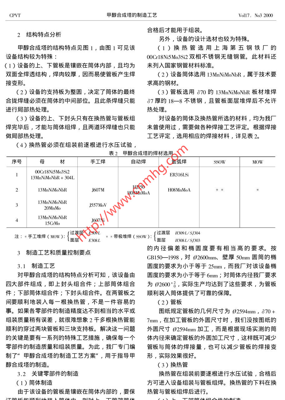 制造安裝甲醇合成塔的制造工藝Study on the Fabricating Procedure for Methanol Synthetic Column大連冰山集團金州重型機器廠徐慶坤戈豐來 張英俊In this paper,characteristics at structure design and material selection for methanol Tower are introducedbrielly. It is focused to discuss fabricating procedure and quality control point .關(guān)鍵詞:甲醇合成塔管板鑲嵌制造工藝 質(zhì)量控制隨著石化工業(yè)的迅速發(fā)展,鋼制管殼式換熱設(shè)備愈來愈趨于大型化發(fā)展,雖然GB151- -89《鋼制管殼式換熱器》只規(guī)定了鋼制管殼式換熱設(shè)備直徑在02000以下的設(shè)計、制造和驗收,但現(xiàn)在鋼制管殼式換熱設(shè)備直徑已遠遠大于02000 ,甚至超過0260004000。1999 年8月我廠首次試制成功- -臺直徑為02600的大型管殼式換熱設(shè)備-一甲醇合 成塔。甲醇合成塔是甲醇項目中的關(guān)鍵設(shè)備,此次我016廠生產(chǎn)的甲醇合成塔其直徑為02600,結(jié)構(gòu)雖不太復雜,但很有特色,制造難度較大,材料的選取也較為特殊。該類設(shè)備在國內(nèi)屬首次試制,無成熟制奏。造工藝可借鑒,具有一定 的試驗研究性質(zhì)。1甲醇合成塔的技術(shù)特性表1目殼程管設(shè)計壓力MPa5.15.7設(shè)計溫度C265280操作壓力MPa3.9~5.15.15~5.71-+操作溫度C250 ~ 265255 ~ 280工作介質(zhì)氣水合成氣水壓試驗壓力MPa6.38腐蝕裕度mm3圖1甲醇合成 塔總體結(jié)構(gòu)示意圖換熱面積m21917設(shè)備總重kg104600甲醇合成塔的主要技術(shù)特性見表1。37.CPVT甲醇合成塔的制造工藝Voll7. No3 2000合格后才能用于組裝。2結(jié)構(gòu)特點分析另外,設(shè)備的設(shè)計選材也較為特殊。甲醇合成塔的結(jié)構(gòu)特點見圖1,由圖1可見該(1)換熱管選用上海第五鋼鐵廠的設(shè)備結(jié)構(gòu)較為特殊:00Crl8Ni5Mo3Si2雙相不銹鋼無縫鋼管。此材料還(1)設(shè)備的上、下管板是鑲嵌在筒體內(nèi)部,且均為未列入國家鋼管材料標準。雙面全焊透結(jié)構(gòu), 焊肉較厚,因而易使管板產(chǎn)生焊(2)設(shè)備筒體選用13MnNiMoNbR ,屬于技術(shù)要接變形。求高的鋼材。(2)設(shè)備的支持板為整圓,決定了筒體的最終(3)管板選用870的13MnNiMoNbR板材堆焊合攏焊縫必須在筒體的中間部位。且此條焊縫只能δ7厚的18--8不銹鋼,且管板面層堆焊后不允許:進行局部熱處理。熱處理。(3)設(shè)備的上、下封頭只有在換熱管與管板組對設(shè)備的筒體及換熱管所選的材料,均為我廠焊完畢后,才能與筒體組焊,且兩道環(huán)焊縫也只能未曾使用過,需要做各種焊接工藝評定。根據(jù)焊接做局部熱處理。工藝評定,選用相應(yīng)的焊接材料,詳見表2。(4)換熱管必須在組裝前逐根進行水壓試驗,表2甲醇合成塔的焊材選用序號母手工焊自動焊氬弧焊SSowMOW100Cr18Ni5Mo3Si2ER316LSi13MnNiMoNbR + 304LHJ35013MnNiMoNbRJ607MH08MnMoA¥¥*3J557MoV20MnMo4J607Ni15CrMo注: *手工堆焊( MOw):f過渡層E309L* *帶極堆焊( ssow):s過渡層H309L/SJ/304l面層E308LH308L/S.J303的內(nèi)徑偏差和橢圓度要有相當高的要求。按3制造工藝和質(zhì)量控制要點.GB150- -1998 ,對02600mm、 壁厚50mm圓筒的橢3.1制造工藝圓度的要求為小于等于25mm,而我廠對該設(shè)備橢對甲醇合成塔的結(jié)構(gòu)特點分析可知,該設(shè)備由圓度的要求為小于等于6mm;對筒體內(nèi)徑我廠要求四大部件組成,即上封頭組合件;上部筒體組合為02600+ ,實際生產(chǎn)均達到了這些要求,為管板件;下部筒體組合件;下封頭組合件。在兩管板之順利裝入筒體提供了可靠的保障。間要順利地裝入每一根換熱管,不是一件容易的(2)管板事。如果各零部件的制造精度達不到相當?shù)乃交驁D紙規(guī)定管板的幾何尺寸為02594mm, δ70+組裝質(zhì)量稍有誤差,就很難想象2千多根換熱管能7mm ,在加工管板的外圓尺寸時,我們沒按圖紙的順利的穿過兩塊管板和三塊支持板。解決這一問題外圓尺寸02594mm加工,而是根據(jù)現(xiàn)場實測的筒的關(guān)鍵是要有-系列的特殊工藝措施,確保每一個體內(nèi)徑來確定管板的外圓加工尺寸,這樣既可減少零部件的制造質(zhì)量和組裝質(zhì)量。為此,我廠專門編管板與筒體的焊接量,也可以減少管板的焊接變制了”甲醇合成塔的制造工藝方案”,用于指導甲形,實際效果很好。醇合成塔的制造。(3)換熱管3.2關(guān)鍵零部件的制造換熱管在組裝前要逐根進行水壓試驗,合格后( 1)筒體制造方可進入設(shè)備組裝與管板組焊。換熱管的下料在換由于該設(shè)備的管板是鑲嵌在筒體內(nèi)部的,要保熱管與管板組焊后進行。證管板能順利地裝入筒體內(nèi),則對上、下 管箱筒體(4)上、下部筒體組合件的制造38.