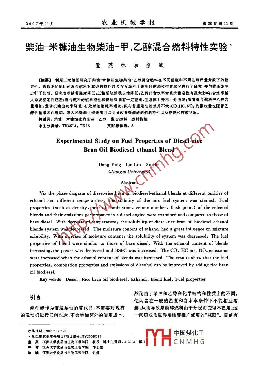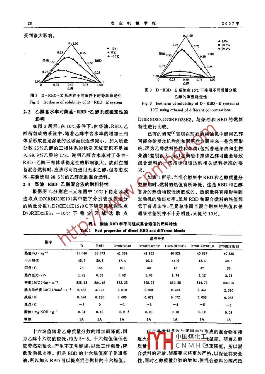 2007年11月農(nóng)業(yè)機械學(xué)報第38卷第11期柴油米糠油生物柴油-甲、乙醇混合燃料特性實驗董英林琳徐斌【摘要】利用三元相圖研究了柴油-米糠油生物柴油乙醇混合燃料在不同溫度和不同乙醇質(zhì)量分?jǐn)?shù)下的穩(wěn)定性。選取不同配比的混合燃料對其燃料特性以及在發(fā)動機上燃用時燃燒和排放狀況進(jìn)行了研究,并與普通柴油進(jìn)行了比較。研究表明隨著溫度降低,三相系統(tǒng)的穩(wěn)定性降低;乙醇的含水率對系統(tǒng)穩(wěn)定性有很大影響,含水率越大系統(tǒng)穩(wěn)定性越差;混合燃料的燃料特性和普通柴油有一定差別,但總體上并不十分明顯;隨著混合燃料中乙醇含量增加,發(fā)動機輸出功率降低,有效燃油消耗率增加,但與普通柴油相差并不大CO、HC、NO2的排放量也隨著乙醇含量增加而增加。摻入米糠油生物柴油可以明顯改善柴油醇的燃料特性以及燃燒和排放狀況。關(guān)鍵詞:柴油米糠油生物柴油乙醇混合燃料燃料特性中圖分類號:TK464TK16文獻(xiàn)標(biāo)識碼:AExperimental Study on Fuel Properties of Diesel-riceBran oil biodiesel-ethanol blendDong Ying Lin Lin Xu Bin(iangsu UniversVia the phase diagram of diesel-rice bran oil biodiesel-ethanol blends at different purities ofethanol and different temperatures, the stability of the mix fuel system was studied, Fuelproperties (such as density, heat of combustion, cetane number, flash point) of the selectedblends and their emissions performance in a diesel engine were examined and compared to those ofbase diesel. With decrease of temperature, the solubility of diesel-rice bran oil biodiesel-ethanolblends system was decreased. The moisture content of ethanol had a great influence on mixturesolubility. With increase of moisture content, the solubility of system was decreased. the fuelproperties of blend were similar to those of base diesel. with the ethanol content of blendsincreasing, the power was decreased and BSFC was increased. The CO, HC and NO, emissionswere increased when the ethanol content of blends was increased. The results show that the fuelcombustion properties and emissions of diesohol can be improved by adding rice branoil biodieselKey words Diesel, Rice bran oil biodiesel Ethanol, Blend fuel, Fuel properties引言然而由于柴油和乙醇在化學(xué)結(jié)構(gòu)和性質(zhì)上的不同使兩者在一般的溫度和含水率條件下不能相互溶柴油醇作為普通柴油的替代品,不需要對現(xiàn)有解,從而導(dǎo)致柴油醇燃料由于分層而變得不穩(wěn)定這的發(fā)動機進(jìn)行任何改造,不會增加額外的使用成本。一問題成為阻礙柴油醇推廣使用的“瓶頸”。目前有收稿日期:2006-12-20鎮(zhèn)江市農(nóng)業(yè)攻關(guān)項目(項目編號:NY2006018)中國煤化工董英江蘇大學(xué)食品與生物工程學(xué)院教授博士生導(dǎo)師,212013鎮(zhèn)江CNMHG林葉江蘇大學(xué)食品與生物工程學(xué)院博士生徐斌江蘇大學(xué)食品與生物工程學(xué)院講師第11期董英等:柴油米糠油生物柴油-甲、乙醇混合燃料特性實驗兩種方法可以防止柴油醇的分層:加入乳化劑可以照上面的方法與柴油、RBD混合并進(jìn)行攪拌將得幫助形成由柴油包妻乙醇的細(xì)小的懸浮液滴;加入到的樣品在10℃下靜置7d,觀察樣品分層情況,利助溶劑可以與乙醇形成可溶于柴油的分子間化合用三元相圖對混合溶液穩(wěn)定性進(jìn)行分析。物,從而增加乙醇在柴油中的溶解度,來制備均勻、1.2.4發(fā)動機燃燒及排放實驗穩(wěn)定的柴油醇溶液口。通常情況下,乳化液的配制需實驗采用常州柴油機廠186型風(fēng)冷直噴柴油機要加熱和攪拌的過程。然而加入助溶劑可以實現(xiàn)柴(轉(zhuǎn)速3600r/min,燃油消耗率300g/(kW·h),功油和乙醇的快速混合,簡化了混合的過程2。但是,率6kW),在全負(fù)荷工況下,選取不同配比的混合燃由于摻入了乙醇,使柴油醇燃料的十六烷值降低,使料與柴油RBD對不同發(fā)動機轉(zhuǎn)速下的燃燒及排放之很難在壓燃式發(fā)動機上應(yīng)用,發(fā)動機能否直接燃情況進(jìn)行比較實驗前發(fā)動機應(yīng)充分預(yù)熱,并調(diào)整噴用混合燃料將對發(fā)動機的動力性燃油經(jīng)濟性以及射壓力,保證每次實驗時發(fā)動機具有相同噴射壓力。排放指標(biāo)起決定性作用。生物柴油的十六烷值高利用 AVL AFA335型測功機測試發(fā)動機輸出功于普通柴油,在柴油醇中添加生物柴油,有望改善柴率,AVL735型油耗儀檢測發(fā)動機燃油消耗率。利用公油醇十六烷值低的狀況。因此對于柴油一生物柴油乙式:有效燃油消耗率=燃油消耗量(g)/(有效功率醇混合燃料的研究具有現(xiàn)實意義。kW)×柴油機工作時間(h),計算得到有效燃油本文對柴油生物柴油-乙醇三相系統(tǒng)的穩(wěn)定性消耗率。并用 Horiba meXA-7200D型氣體分析系以及相關(guān)的燃料特性如:十六烷值、密度、熱值、閃統(tǒng)對CO、HC、NO2排放情況進(jìn)行檢測。點、濁點等進(jìn)行研究。在發(fā)動機臺架上對混合燃料的燃燒及排放特性進(jìn)行實驗,并與普通柴油做比較,以結(jié)果與討論期找出不同配比對燃燒和排放性能的影響21柴油-RBD-甲醇系統(tǒng)穩(wěn)定性原料與實驗方法如圖1所示,在由柴油(D)、米糠油生物柴油(RBD)、甲醇(M所組成的系統(tǒng)中,柴油和RBD之1.1主要試劑及設(shè)備間可以完全相互溶解RBD和甲醇只能在很小的范實驗試劑:柴油(市場購得的-10號柴油),乙圍內(nèi)互溶,而柴油和甲醇之間則完