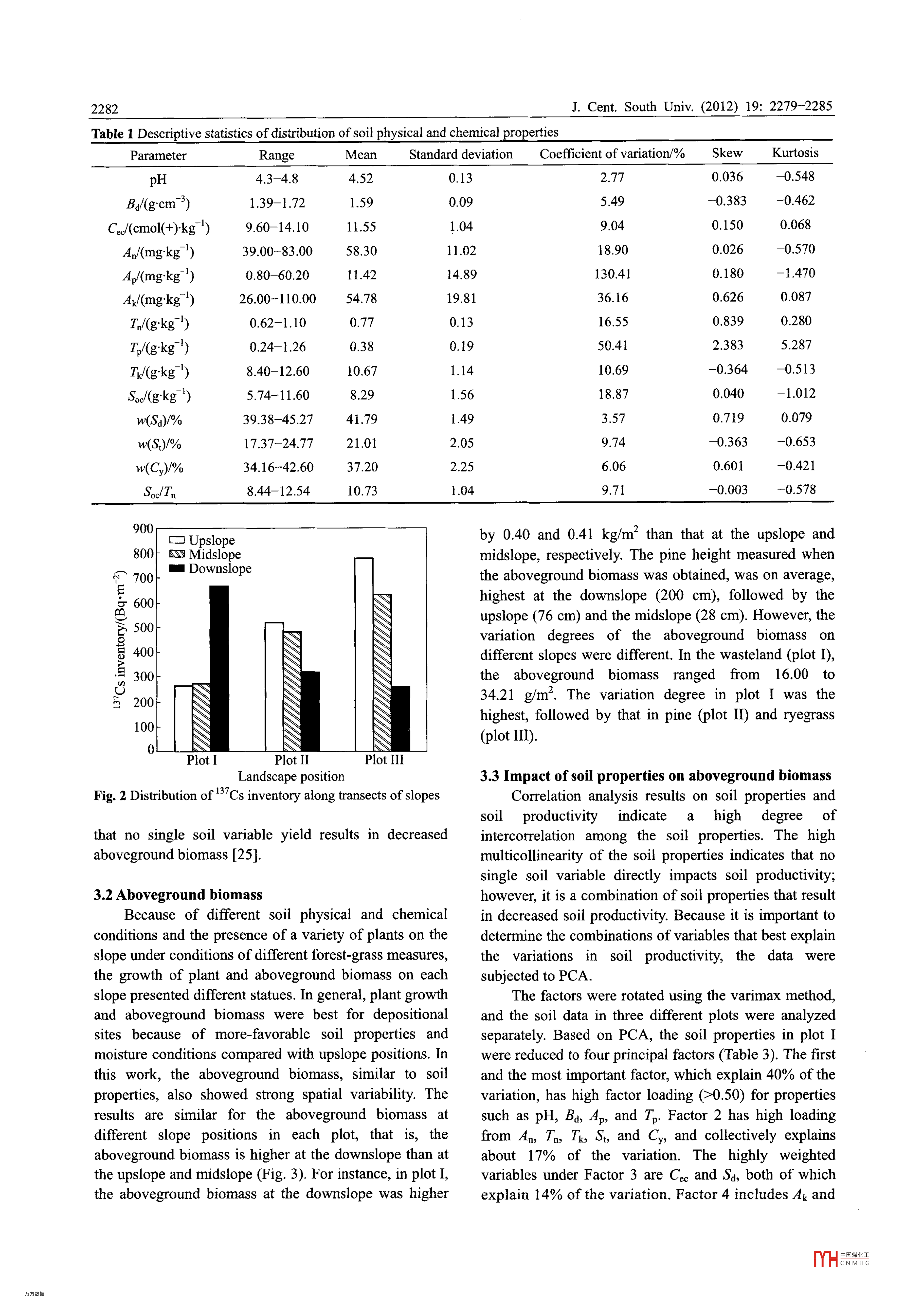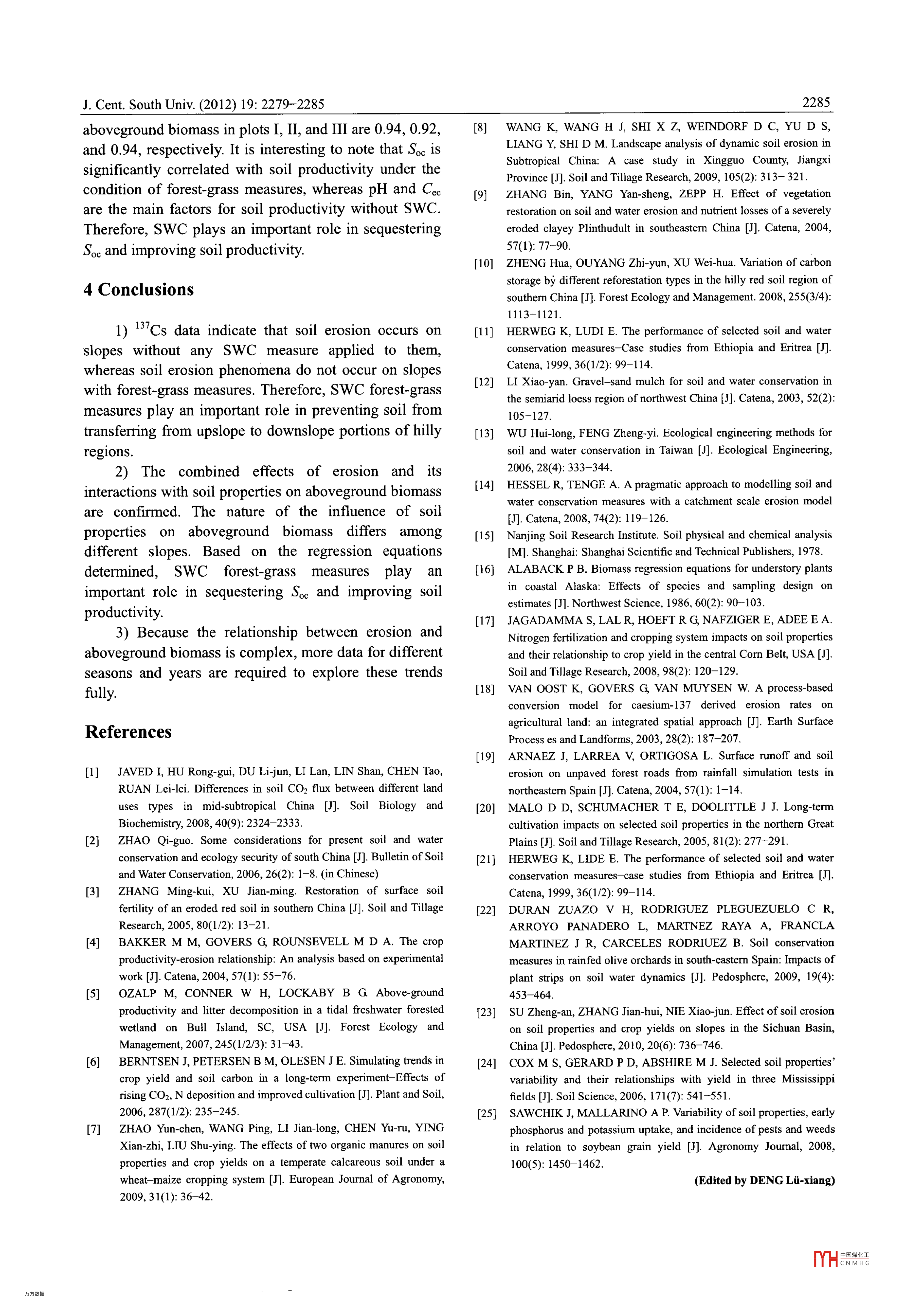 J Cent, South Univ(2012)19: 2279-2285DoI:10.1007/s11771-012-1272-22 SpringerEffects of soil and water conservation and its interactions withsoll properties on soil productivityGUO Wang(郭旺)2, LI Zhong-wur(李忠武)2, SHEN Wei-ping(申衛(wèi)平), WANG Xiao-yan(王曉燕)ZENG Guang-ming(曾光明}2, Chen Xiao-lin(陳曉琳)2, ZHANG Xue(張雪)2,ZHANG Yue-nan(張越男)2, LIU Gui-ping(劉桂平)3, WANG Shu- guang(王曙光)31. College of Environmental Science and Engineering, Hunan University, Changsha 410082, China;2. Key Laboratory of Environmental Biology and Pollution Control of Ministry of Education(Hunan University),Changsha 410082. China3. Soil and Water Conservation Research Institute, Shaoyang 422002, China4. College of Civil Engineering and Architecture, Changsha University of Science and Technology,Changsha 410076, chinaC Central South University Press and Springer-Verlag Berlin Heidelberg 2012Abstract: The effects of soil and water conservation(SwC)on soil properties are well documented. However, definitive andquantitative information of SwC and its interactions with soil properties on soil productivity is lacking for hilly red soil region ofouthern China. Experiments were conducted in the hilly red soil region of southem China for seven years in three runoff plots, eachof which represented different SwC forest-grass measures. Principal component analysis and multiple regression techniques werused to relate the aboveground biomass (representing soil productivity) to soil properties. Based on the final regression equations,soil organic carbon content(Soc)is significantly correlated with soil productivity under the condition of forest-grass Y,C playwhereas pH value and cation exchange capacity(Cec)are the main factors for soil productivity without swC. Therefore, swC playsan important role in sequestering Soc and improving soil productivityKey words: hilly red soil region; soil erosion; soil organic carbon; soil productivity1 IntroductionSoil productivity is defined as the capacity of soil toproduce a certain yield of crops or plants given aHilly red soil regions, which have abundant water specificd system of management. Soil erosion has longand heat resourccs, have the potential for high been recognized as an important factor in reducing theproductivity potential and could be essential in resolving productivity of many soils. In fact, the extent to whichgrowing concerns on food sufficiency [1]. In recent years, soil productivity responds to erosion depends on severaleconomic forests have developed rapidly in southern variables, such as crop or plant types, soil propertiesChina. However, farmers tend only trees and overlook management practices, and climate characteristics [4]the soil in which these trees were planted. Shrubs and Over the last 50 years, a significant amount of researcheslitter are completely cleaned by the use of herbicides, havc bcen carried out to study the relationship betweenand the original vegetation can become seriously erosion and soil productivity [4-7], but the conclusionsdamaged. Soil and water erosion under trees have of these works are inconsistent. Some studies reportedbecome more prominent. While the forest coverage rate that soil productivity responds strongly to erosion, whileincreases, closer inspection shows that soil erosion by others reported a much weaker effect [4]. Several studieswatcr is evident [2]. Long-term soil and water erosion, in the hilly red soil region of southern China have beentogether with the inherent fragility of hilly ecosystems, carried out [3, 8-10]. These studies generally focused onhas caused severe degradation of red soils, the results of estimating differences in soil organic carbon (Soc) inphich include high acidity and low nutrient content in relation to land use, vegetation restoration, climate, andthe soils [3]. As a result, soil and water erosion has topography. Extensive research that seeks to understandbecome one of the greatest limiting factors of soil the response of soil productivity to soil erosion has alsoproductivity in the hilly red soil regions of southern been undertaken. Soil and water conservation (SwC)hasFoundation item: Project(40971170)supported by the National Natural Science Foundation of China; Project(NCET-09-330)supported by the Program forNew Century Excellent Talents in University of ChinaReceived date: 2011-06 20; Accepted date: 2011-10-18Correspondingauthor:liZhong-wu,ProfessorPhD;Tcl:+86-731-88640078;E-mail:lizw@hnu.edu.cn2280J. Cent. South Univ.(2012)19: 2279-2285been found to play an important role in soil nutrients on aThe experiment was conducted in the Institute ofslope. As early as the 1970s, Swc campaigns under the Soil and Water Conservation in Shaoyang City of Hunanumbrella of the World Food Programme were initiated to Province, China(111 22E, 27 03'N)(Fig. 1)over acombat severe soil degradation [11]. Since then, the period of seven years. The altitude in the area rangesimportance of SwC and its effects on runoff and from 231. 18 m to 276.63 m above sea level. The area issedimentation reduction have been demonstrated all over characterized by a typical subtropical monsoon climatethe world [11-14]. HESSEL and TENGE [14] used a with an annual mean air temperature of 171C and anprocess-based erosion model to simulate the effects of annual frost-free period of 278 d. The annual rainfallSwC measures on catchment-scale runoff and erosion here in each year is concentrated between April andand found that their effects differed from those at the September and averages 1 397 mm. The soils in the areapixel scale. The studies, however, focused only on Swc are characterized by quaternary red and yellow soils withmodeling and its impacts on runoff and sedimentora soil texture of sandy loam. Serious soil and waterreduction. Limited information is available on the effects erosion is also found in this areaof swC on soil organic carbon and soil productivity. It isAn erosion-productivity s