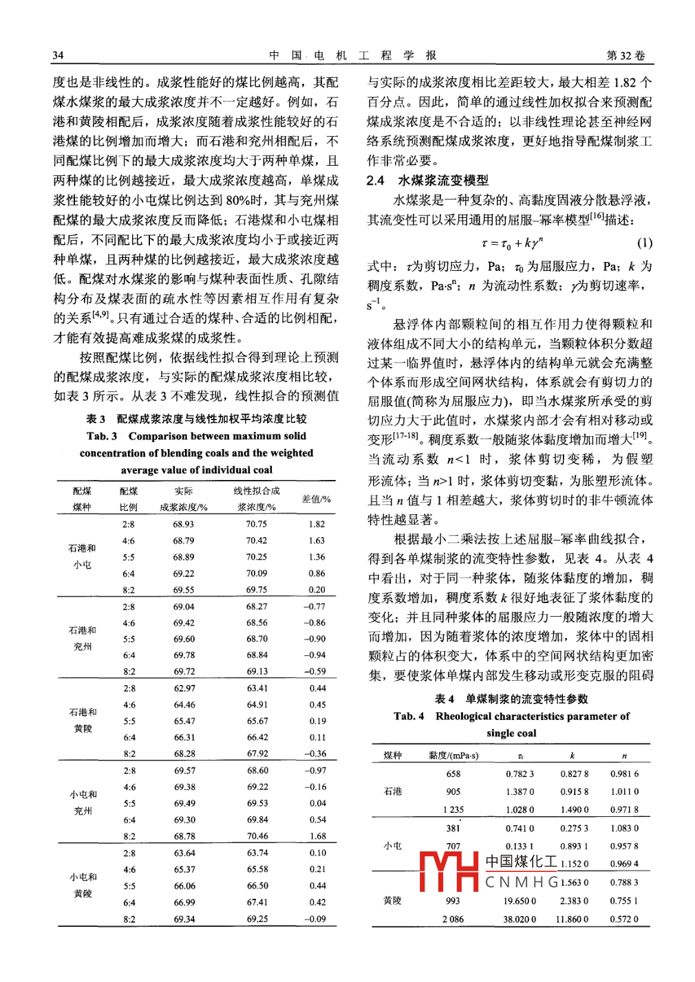 第32卷第2期中國(guó)電機(jī)工程學(xué)報(bào)Vol.32No.2Jan.15,20122012年1月15日Proceedings of the CSEEC2012 Chin. Soc. for Elec Eng. 31文章編號(hào):0258-8013(20102003108中圖分類號(hào):TQ530文獻(xiàn)標(biāo)志碼:A學(xué)科分類號(hào):47020配煤對(duì)水煤漿性質(zhì)的影響胡亞軒,劉建忠,王睿坤,虞育杰,周俊虎,岑可法能源清潔利用國(guó)家重點(diǎn)實(shí)驗(yàn)室(浙江大學(xué)),浙江省杭州市310027)Effects of Blending Coals on the Behavior of Coal Water SlurryHU Yaxuan, LIU Jianzhong, WANG Ruikun, Yu Yujie, ZHOU Junhu, CEN KefaState Key Laboratory of Clean Energy Utilization(Zhejiang University), Hangzhou 310027, Zhejiang Province, ChinaABSTRACT: Four different coals, Shigang, Xiaotun, Yanzhou,煤分別相配,以及配比的不同,對(duì)水煤漿的流變性及穩(wěn)定性and Huangling coals, were blended with each other in different影響不同;配煤制漿對(duì)漿體的成漿性影響具有明顯的非線性proportions, and the effect of blending coals on the slurry特點(diǎn),實(shí)驗(yàn)中配煤制漿的實(shí)際成漿濃度和線性加權(quán)平均得到ability, rheology and stability of coal water slurry(cWS)的最大成漿濃度間最大相差1.82個(gè)百分點(diǎn)。穩(wěn)定性試驗(yàn)表were studied. The slurry ability, rheology and stability of明,在正常的水煤漿濃度下,無(wú)論是單煤還是配煤制取的水Cws prepared by the single coal were also researche煤漿,20天后析水率都比較合理,在15%以下。不同的煤Results show that coals with lower o/c ratio have better種配煤制漿后對(duì)穩(wěn)定性有不同的影響slurry ability. The coal water slurries behave as the properties關(guān)鍵詞:水煤漿;最大成漿濃度:流變性:穩(wěn)定性;非線性of non-Newtonian fluids over certain range of concentrationand the shear thinning behavior is stronger with increasing 0 IEsolid concentration. Blending coals can influent the rheology水煤漿是一種新型的煤基代油清潔燃料,在and stability of CwS. However, blended with the same coaldifferent coal type and blending ratio have different effects or煤的氣化等潔凈煤技術(shù)上具有重要應(yīng)用2。它是約the rheology and stability. In addition, the effects of coal60%70%的煤粉和30%40%的水及少量添加劑組成的懸浮分散體系,具有低污染、易泵送、燃燒效concentration of blending coal water slurry is not equal to率高等優(yōu)點(diǎn)。研究表明煤質(zhì)因素對(duì)水煤漿的性質(zhì)weighted average value of indiⅳ vidual coal, with the maximum有很大影響,主要包括煤的碳質(zhì)量分?jǐn)?shù)、空氣平衡deviation reaching1.82 percentage points. Stability水分、可磨性指數(shù)、灰分質(zhì)量分?jǐn)?shù)、可溶礦物離子experiment shows that, water separation ratio after 20 days煤的比表面積、空隙結(jié)構(gòu)、煤表面的電位性質(zhì)、絲below 15% for either the single coal or the blending coal質(zhì)組分的質(zhì)量分?jǐn)?shù)及煤灰成分分析中SiO2的質(zhì)量water slurry. and blending different coals has different effectson the stability.分?jǐn)?shù)等47。因此水煤漿的制備對(duì)煤種的選擇有一定的要求,這也成為水煤漿技術(shù)應(yīng)用與推廣過程中的KEY WORDS: coal water slurry (CWS); maximum solid瓶頸,如何擴(kuò)大制漿用的煤種范圍,特別是采用難concentration; rheological characteristics; stability; non-linear制漿的煤種制得高濃度、低黏度、流動(dòng)性好的水煤摘要:通過對(duì)石港、小屯、兗州、黃陵4種煤進(jìn)行單煤制漿漿一直是人們關(guān)注的問題。配煤則是一種能改善及不同比例2種煤的配煤制漿實(shí)驗(yàn),研究配煤制漿對(duì)水煤漿難成漿煤的成漿性能、擴(kuò)大制漿煤種的簡(jiǎn)易而又經(jīng)的成漿性、流變性及穩(wěn)定性的影響。單煤的成漿性研究表明不同煤種成漿濃度有差異,氧碳比低的煤種成漿性較好,最濟(jì)的方法門。本文選取變質(zhì)程度不同的4種煤,按大成漿濃度較高:水煤漿在一定濃度范圍內(nèi)具有剪切變稀的照不同比例配比制漿,研究2種煤相配制得的水煤非牛頓流體特性,且濃度越高剪切變稀特性越明顯。配煤制漿的成漿性、流變性和穩(wěn)定性,從中獲得配煤制漿漿中,由于煤種間的相互作用效果不同,同一種煤與不同的對(duì)水煤漿性中國(guó)煤化工落金項(xiàng)日國(guó)家重點(diǎn)基礎(chǔ)研究發(fā)展計(jì)劃項(xiàng)日2項(xiàng)目X1實(shí)驗(yàn)CNMHG227001)。The National Basic Research Program of China (973 Program)1.1試驗(yàn)樣品及制備(2010CB227001)從表1中看到,各種煤的揮發(fā)分含量及氧碳比中國(guó)電機(jī)工程學(xué)報(bào)第32卷表14種試驗(yàn)用煤的煤質(zhì)分析2結(jié)果與討論Tab 1 Ultimate and proximate analysis offour coals for experiment2.1單煤成漿特性圖1為4種不同變質(zhì)程度的煤制取水煤漿的黏工業(yè)分析%發(fā)熱量元素分析%煤種度一濃度關(guān)系曲線。由圖1可見,4種煤的成漿規(guī)律一致,制取的水煤漿隨著濃度的增加,黏度增大。石港1.2731.4290358292250757612921.002.263.53其中,在相同的濃度下,變質(zhì)程度相對(duì)較低的兩種小屯1.4428.3911.1459032390661433021.260.344.11煤,黃陵煤和兗州煤的水煤漿黏度較髙。一般要求究州1.661423312852832827169584461.000.758.32黃陵34829.5723.0243.932247154883.530.850.47722水煤漿的黏度小于1200mPa:s2,而工業(yè)應(yīng)用的水不同。石港煤和小屯煤屬于煤階較高的無(wú)煙煤和貧煤漿黏度通常為1000mPas。將表觀黏度為煤,兗州和黃陵煤則是煤階較低的煙