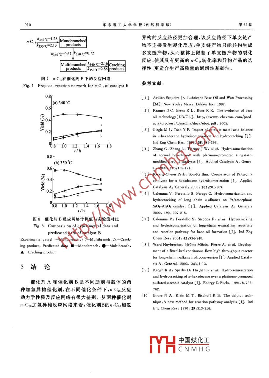 華東理工大學(xué)學(xué)報(bào)(自然科學(xué)版)Vol 32 No 8906Journal of East China University of Science and Technology(Natural Science Edition)2006-08文章編號(hào):1006-3080(2006)08-0906-05正十六烷加氫的異構(gòu)反應(yīng)動(dòng)力學(xué)王強(qiáng)·2,沈本賢,凌昊,賀產(chǎn)鴻2,李坤(1.華東理工大學(xué)化工學(xué)院,上海200237;2.中國(guó)石油化工股份有限公司茂名分公司,茂名525001)摘要:在連續(xù)微反裝置中,氫氣分壓9.0MPa,體積空速(LHSV)0.6~3h1條件下,以正十六烷為模型化合物評(píng)價(jià)了兩種催化劑的加氬異構(gòu)性能。研究了不同催化劑的正十六烷加氫異構(gòu)反應(yīng)動(dòng)力學(xué),并建立了相應(yīng)的反應(yīng)網(wǎng)絡(luò)。研究結(jié)果表明:在兩種不同助劑和載體的催化劑A、B作用下正十六烷的加氫異構(gòu)反應(yīng)網(wǎng)絡(luò)不同,催化劑B的反應(yīng)活性和異構(gòu)產(chǎn)物的選擇性較催化劑A高,更有利于生產(chǎn)高質(zhì)量的潤(rùn)滑油基礎(chǔ)油關(guān)鍵詞:正十六烷;加氫異構(gòu);反應(yīng)動(dòng)力學(xué);催化劑中圖分類號(hào):O643文獻(xiàn)標(biāo)識(shí)碼:AHydroisomerization Reaction Kinetics of n-Hexadecane' ANG Qiang. 2, SHEN Ben-xian', LING Hao, HE Chan-hong, LI Kun2(1. School of Chemical Engineering, East China University of Science and TechnologyShanghai 200237, China; 2. SINOPEC Maoming Petrochemical Co. Ltd, Maoming 525001, China)Abstract: n-Hexadecane was selected as model compound and investigated in a micro continuous reac-tor in the present of two kinds of catalysts. Experiments were conducted at the conditions of hydrogenpressure 9. 0 MPa, LHSV ranging from 0. 6 to 3 h -, and different reaction temperature for different cata-lysts. Then, hydroisomerization pathways and kinetics of normal hexadecane were established on the baseof productions yields for both catalysts. The results show that reaction networks are different in the pres-ence of catalyst A and B. Catalyst b has a higher conversion and the selectivity than A, which is suitableto produce high quality lube base oilKey words: n-hexadecane; hydroisomerization; reaction kinetics; catalysts自1993年 Chevron公司異構(gòu)脫蠟技術(shù)商業(yè)化的直鏈烴反應(yīng)動(dòng)力學(xué)行為和催化劑活性和選擇性,運(yùn)行以來口),潤(rùn)滑油基礎(chǔ)油的加氫異構(gòu)技術(shù)的開發(fā)通常選用正十六烷烴(nC1s)作為模型化合物。迄今和新型催化劑的研制受到了國(guó)內(nèi)外各大研究機(jī)構(gòu)和為止,國(guó)內(nèi)外對(duì)烷烴的加氫異構(gòu)化反應(yīng)進(jìn)行了大量潤(rùn)滑油生產(chǎn)廠商的高度重視。與催化脫蠟工藝不同,的研究2-。 Girgis等對(duì)nC在Pt/Z、Pt/si-A和潤(rùn)滑油基礎(chǔ)油的加氫異構(gòu)脫蠟過程主要以原料中的P/MCM41催化劑上的反應(yīng)行為通過 Degnan蠟異構(gòu)化反應(yīng)為主,反應(yīng)后的基礎(chǔ)油中的直鏈烷烴 Kennedy模型的研究得出不同類型催化劑載體上的的側(cè)鏈數(shù)明顯提高,產(chǎn)物具有收率高、粘度指數(shù)高和nC1異構(gòu)化反應(yīng)路徑有很大差異。 Calemma更好的低溫性能為了考察潤(rùn)滑油加氫異構(gòu)過程等“T凵中國(guó)煤化工C在P1SA催化CNMHG了潤(rùn)滑油原料中正收稿日期:2005-07-04作者簡(jiǎn)介;王強(qiáng)(1962),男,教授級(jí)高級(jí)工程師,博土研究生,研究構(gòu)烷烴的主要組成,得到了長(zhǎng)鏈烷烴的轉(zhuǎn)化規(guī)律。上方向?yàn)槭突すに囀鲅芯繉?duì)正構(gòu)烷烴的加氫異構(gòu)過程的反應(yīng)規(guī)律做出通訊聯(lián)系人:沈本賢,E-mail:sbx@ecust,edu.cn了詳細(xì)的研究,對(duì)催化劑的設(shè)計(jì)和實(shí)際潤(rùn)滑油的生第8期王強(qiáng),等:正十六烷加氫的異構(gòu)反應(yīng)動(dòng)力學(xué)907產(chǎn)具有十分重要的意義。本文選用兩種催化劑研究制微型反應(yīng)裝置(圖1),反應(yīng)器直徑10mm,恒溫段nC15加氫異構(gòu)反應(yīng),考察了各自的反應(yīng)動(dòng)力學(xué)性170mm。反應(yīng)系統(tǒng)溫度釆用計(jì)算機(jī)控制;壓力采用質(zhì),建立相應(yīng)的動(dòng)力學(xué)模型。背壓閥調(diào)節(jié);氫氣流量通過質(zhì)量流量計(jì)控制;模型化合物通過平流泵送入反應(yīng)系統(tǒng)。催化劑A和B為兩1實(shí)驗(yàn)部分種商業(yè)催化劑,兩種催化劑均以Pt為活性金屬,金屬助劑和載體各不相同。模型化合物為無水正十六1.1反應(yīng)裝置及催化劑烷(純度>98%,購(gòu)自 Aldrich公司)。采用撫順石油科學(xué)研究院的MRAP-2B自動(dòng)控Pressure-relief valve Mass flow controllerPressure detectionBy-pass valveFoot valveProduct recieverPumpDrainSafety valve圖1連續(xù)微反裝置流程圖ig. 1 Schematic of the micro continuous bed reactor apparatu1.2反應(yīng)系統(tǒng)操作步驟初溫50°C,停留時(shí)間5min;升溫速率5"C/min,終石英砂先用v=0.1的鹽酸溶液洗2~3次,然溫190°C,停留時(shí)間30min。液相產(chǎn)物采用 Micro-后用100mL去離子水洗滌5次。將洗滌好的石英 mass GCT色質(zhì)聯(lián)用儀器;色譜柱HP5MS0.25砂在馬弗爐中700℃焙燒3h除去水分和雜質(zhì),移mm×30m,初始溫度:35°C,停留時(shí)間3min;升溫至冷卻皿中冷卻至室溫待用。催化劑與20~40目石速率8℃/min,終溫240C,停留時(shí)間30min,氣化英砂按1:1體積比混和稀釋。將稀釋好的催化劑裝溫度280°℃入反應(yīng)器中,催化劑裝填量為9mL。兩端分別用20質(zhì)譜采用EI電離方式,電壓70eV,掃描范圍目石英砂和石棉填充