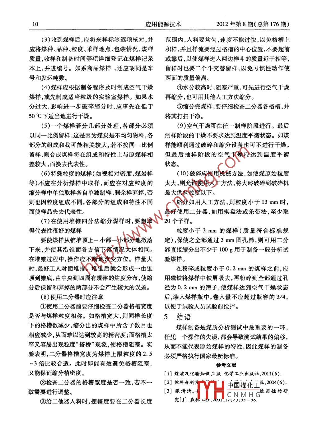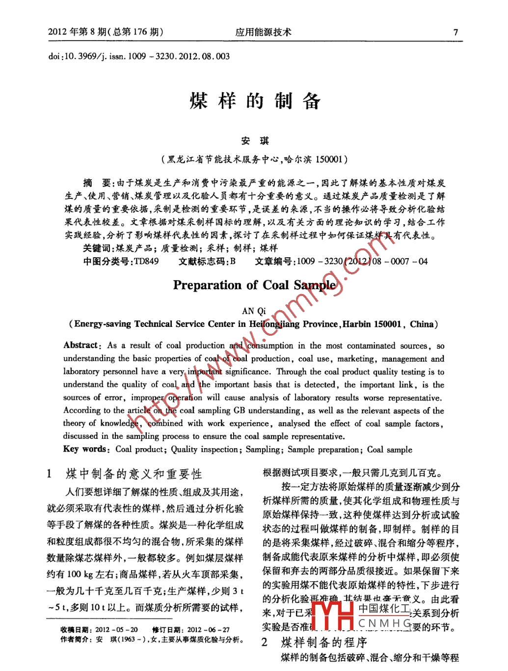 2012年第8期(總第176期)應用能源技術7doi :10.3969/j. issn. 1009 - 3230. 2012. 08.003煤樣的制備安琪(黑龍江省節(jié)能技術服務中心,哈爾濱150001)摘要:由于煤炭是生產和消費中污染最嚴重的能源之一,因此了解煤的基本性質對煤炭生產、使用、營銷、煤炭管理以及化驗人員都有十分重要的意義。通過煤炭產品質量檢測是了解煤的質量的重要依據,采制是檢測的重要環(huán)節(jié),是誤差的來源,不當的操作必將導致分析化驗結果代表性較差。文章根據對煤采制樣國標的理解,以及有關方面的理論知識的學習,結合工作實踐經驗,分析了影響煤樣代表性的因素,探討了在采制樣過程中如何保證煤樣具有代表性。關鍵詞:煤炭產品;質量檢測;采樣;制樣;煤樣中圖分類號:TD849文獻標志碼:B文章編號:1009 -3230(2012)08 -0007 -04Preparation of Coal SampleAN Qi( Energy-saving Technical Service Center in Heilongjiang Province, Harbin 150001,China)Abstract: As a result of coal production and consumption in the most contaminated sources, sounderstanding the basic properties of coal of coal production, coal use, marketing, management andlaboratory personnel have a very important significance. Through the coal product quality testing is tounderstand the quality of coal and the important basis that is detected, the important link, is thesources of error, improper operation will cause analysis of laboratory results worse representative.According to the article on the coal sampling CB understanding, as well as the relevant aspects of thetheory of knowledge, combined with work experience, analysed the effect of coal sample factors,discussed in the sampling process to ensure the coal sample representative.Key words: Coal product; Quality inspection; Sampling; Sample preparation; Coal sample1煤中制備的意義和重要性根據測試項目要求,- -般只需幾克到幾百克。人們要想詳細了解煤的性質、組成及其用途,按一定方法將原始煤樣的質量逐漸減少到分就必須采取有代表性的煤樣,然后通過分析化驗析煤樣所需的質量,使其化學組成和物理性質與原始煤樣保持-致,這種使煤樣達到分析或試驗等手段了解煤的各種性質。煤炭是一種化學組成狀態(tài)的過程叫做煤樣的制備,即制樣。制樣的目和粒度組成都很不均勻的混合物,所采集的煤樣的是將采集煤樣,經過破碎、混合和縮分等程序,數量除煤芯煤樣外, - -般都較多。例如煤層煤樣制備成能代表原來煤樣的分析中煤樣,即必須使約有100kg左右;商品煤樣,若從火車頂部采集,保留和棄去的兩部分品質很接近。如果保留下來-般為幾十千克至幾百千克;生產煤樣,少則3t的實驗用煤不能代表原始煤樣的特性,下步進行~5t,多則10t以上。而煤質分析所需要的試樣,的分析化驗再準確其結果也受干意義。由此看來,對于已采中國煤化化二關系到分析收稿日期: 2012-05-20修訂日期: 2012-06 -27實驗是否準MH.CN M. H G要的環(huán)節(jié)。作者簡介:安琪(1963 -),女,主要從事煤質化驗與分析。2煤樣制備的程序煤樣的制備包括破碎、混合、縮分和干燥等程8應用能源技術2012年第8期(總第176期)序。煤樣的制備實際上是按粒度不同分組進行人工縮分法包括堆錐四分法,棋盤式縮分法的。通常分為25 mm,13 mm,6 mm,3 mm,1 mm和九點式縮分法;機械縮分法可采用二分器,聯合五組,最后制成小于0.2 mm的分析用煤樣。煤破碎縮分機等工具和設備。的粒度越大,所保留的樣最越多。堆錐四分法:用堆錐法將物料堆成圓錐體后,2.1破碎用平板將料堆由中心向四周壓成厚度均勻的圓形破碎是用機械或人工方法減少煤樣粒度的操平堆。然后用十字分樣板通過平堆的圓心,將平作過程,目的是增加試樣顆粒度,減少縮分高級工堆分成四個相等的扇形,棄去其中相對的兩個扇程師誤差。同樣質量的試樣,顆粒越多,縮分誤差形體,另外兩個扇形體則進- -步破碎、混合縮分。越小。但破碎耗時間,耗體力,耗能量,而且會產棋盤縮分法:是以將物料排成--定厚度的均生試樣,特別是水分損失。因此,制樣時不應將大勻薄層,然后用鐵皮做成的有若千個長寬各為量大粒度試樣一次破碎到試驗試樣所要求的粒25mm~30mm的隔板醬瓜物料薄層分割成若干度,而尖采用多階段破碎縮分的方法來逐漸沒有個小方塊 ,再用平底方鏟每間隔-一個小方 塊鏟出減小粒度和試樣量,但縮分階段也不宜過多。-一個小方塊,將其他拋棄或保存,剩余部分繼續(xù)進破碎應該用機械設備,但允許用人工方法將行破碎、混合、縮分。大塊試樣破碎到第-破碎階段的最大供料粒度。九點縮法:此法只適合全水分煤樣的縮分。常見的破碎機械有:鄂式破碎機、錘式破碎縮分前稍加混合即可攤成圓餅,然后在上圓半徑機、光面對輥破碎機振動磨樣機、球磨機、聯合破1/2處和7/8處劃兩個同心圓,再通過圓心劃兩碎機等。組十字交差的直徑,使其夾角為45° ,然后在圓心2.2篩分上取一個子樣,在直徑為1/2 r、7/8 r為二個圓周篩分是用選孔徑的篩子從煤樣中分選出不的交點處取8個子樣(取樣點要交錯開)共九個同粒級煤的過程,目的是將不符合粒度要求的大子樣,合成-一個全水分樣。粒度煤分離出來,進一小破碎到規(guī)定粒度,保證不2.5 干燥均勻達到一定的分散度以降低縮分誤差。干燥是除去煤樣中大量水分的操作過程,其制樣室應備有各種尺寸篩孔,以備篩分時使目的在于使煤樣順利通過破碎機篩子縮分機或用,測定煤的最大粒度的篩子有孔徑25 mm,二分器。 干燥時,一般經自然干燥達到空氣干燥