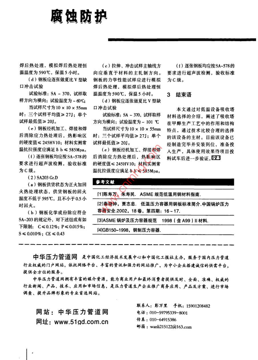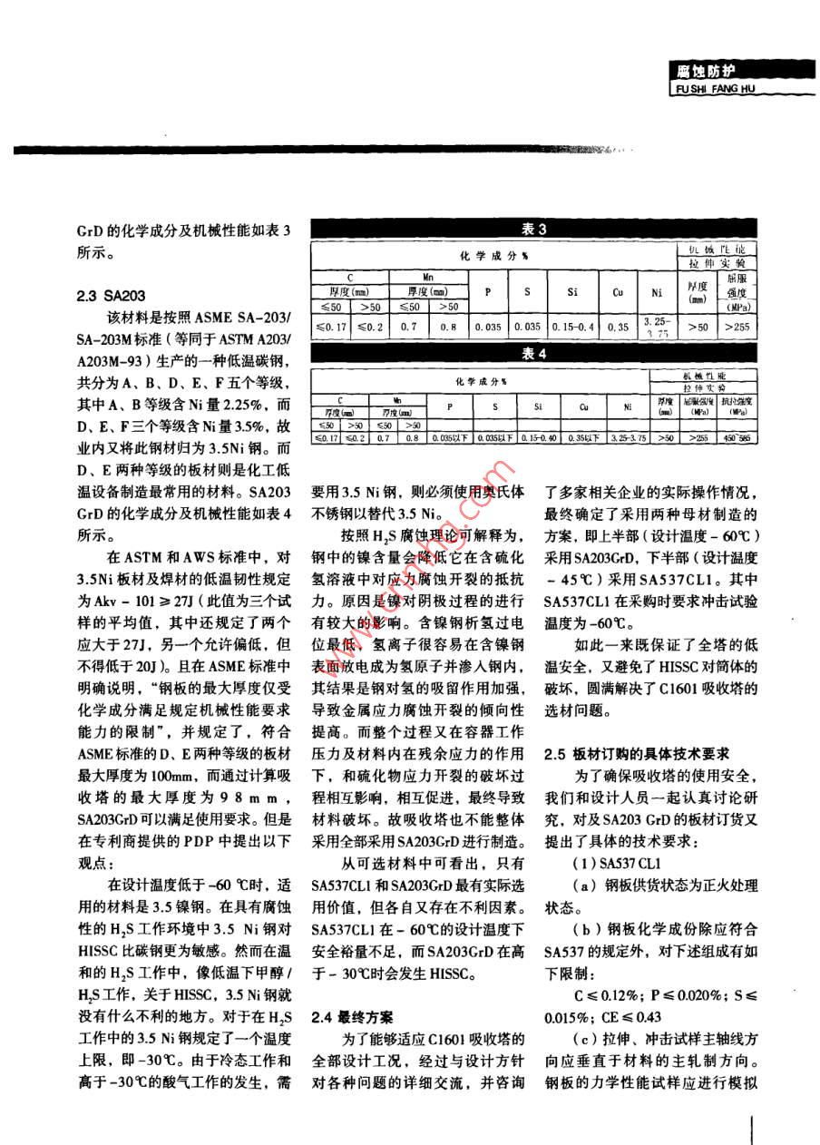 腐蝕防護(hù)LFUSHI FANGHUC1601低溫甲醇洗吸收塔的材料選擇馬洪光孫緒軍侯欽利(兗州煤業(yè)榆林能化有限公司陜西榆林719000)【摘要】本文簡要介紹了甲醇生產(chǎn)工藝中關(guān)鍵設(shè)備甲醇吸收塔的結(jié)構(gòu)特1點(diǎn)和該設(shè)備在甲醇生產(chǎn)中的作用,重點(diǎn)介紹了如何進(jìn)行吸收塔的村料選擇,對吸收塔板材的選用作了詳細(xì)的對比?!娟P(guān)鍵詞】吸收塔材料選用低溫材料1吸收塔在工藝流程中的作高,再生熱耗少,操作費(fèi)用低,能用和結(jié)構(gòu)特點(diǎn)綜合脫除氣體中的H、COS、CO,溶液不起泡、不腐蝕,H2S濃縮簡工藝氣體凈化是甲醇生產(chǎn)過單等優(yōu)點(diǎn),屬于先進(jìn)的凈化技術(shù)程中的重要環(huán)節(jié),目前國內(nèi)甲目前被大型甲醇廠普遍采用。生產(chǎn)所采用的主要凈化工藝主要吸收塔作為低溫甲醇洗系統(tǒng)有低溫甲醇洗法( Rectisol、聚乙-的關(guān)鍵核心設(shè)備,承擔(dān)著脫除工藝氣體中HS、CO2的任務(wù),結(jié)構(gòu)圖醇二甲醚法( Selexol法、NHD法)、見圖1。段I、Ⅱ、Ⅲ為CO2吸收MEDA法、栲膠法∩V法)、蒽醌二磺酸鈉法(ADA法)等。低溫甲醇洗段,段Ⅳ、V為H2S吸收段。法使用冷甲醇作為酸性氣體吸收液利用甲醇在-60℃左右的低溫2材料選擇下對酸性氣體溶解度極大的物理特性,同時分段選擇性地吸收原吸收塔設(shè)備數(shù)據(jù)表如下表1所料氣中的H、CO,及各種有機(jī)硫示。從表1可以看出,吸收塔的操等雜質(zhì)。該法具有溶劑吸收能力作壓力高、操作溫度低,工作介質(zhì)大,溶液循環(huán)量小,氣體凈化度復(fù)雜、均為易燃易爆,中度危害介質(zhì)。因此該設(shè)備的材料選擇是否合適將直接影響到設(shè)備的安全運(yùn)行。在目前中國煤化工低溫容器作者簡介制造材料主要有國標(biāo)牌號l6MnDR、O9 MnNiDr,ASME牌號的馬洪光(1976一)工程師,主要從事化工設(shè)備管理工作。SA537、SA203,以及SS304等奧氏體不銹鋼板材可供選擇,除了蝕防護(hù)表鋼板在-70℃的溫度下可證Akv≥設(shè)備總高m同時,根據(jù)GB150-98第1號修塔體分段改單,“09 MnNiDR厚度上限由60mm塔體段數(shù)段I+II段IIl段IV改為100mm(鋼板)段定義c2洗c冷洗段脫硫段預(yù)洗段從以上各方面來看,O9 MnNiDR介質(zhì)富甲醇,凈化氣(富甲醇,凈化氣富S甲醇,變換氣言HS甲醇變換氣;是可以滿足Cl60l吸收塔的選材要分段高度m求的,但是,設(shè)計方考慮到該材質(zhì)內(nèi)徑在-60℃的工作環(huán)境下,已經(jīng)接近其理論的極限低溫-70℃,安全裕最)·C362514310618061367844.014285714量不足,且業(yè)主對國產(chǎn)09 MnNiDR操作壓力(最厚板的質(zhì)量抱有少量顧慮,所以低/最高)!563/5.6456/5656/570570/571最終并未以09 MnNiDR作為c601MPa(g吸收塔的主體承壓材料設(shè)計溫度(最低最高)℃0.50.50.3750.37522SA537腐蝕成分c2H2S,CO2,HCN, H2S,C02,HCN該材料是一種壓力容器用并NH3, COS經(jīng)過熱處理的碳錳硅鋼板,分為氫蝕壓力Pa(a)3.86在-39·c3.051在-21·C2.506在-16·c「2.523在14·cCl、C2、Cl3三個等級,已經(jīng)在化表2工行業(yè)得到了廣泛的應(yīng)用,Cl1的化學(xué)成分(%)沖擊試驗(yàn)熱處理狀態(tài)為正火,Cl2、Cl3的熱標(biāo)準(zhǔn)鋼號s板厚溫度M處理狀態(tài)為淬火+回火。在低溫容器行業(yè)中,Cll、Cl2應(yīng)用的最為廣GB3531-19960 MnNiDr|≤0.025≤0.0206~60泛,而其中又以SA537C12居多。GB3531909 MnNi DR≤0.020≤0.0156~6低溫甲醇洗技術(shù)的專利商為1號修改單≥27業(yè)主提供的PDP中C1601吸收塔的Q/WG(ZB)05-WGD4≤0.020≤0.010≤60≥31主材就推薦選用SA537Cl1。根據(jù)ASME標(biāo)準(zhǔn),SA537在厚度64mm<8l6MnDR因使用溫度限制(30mm以GB3531-1996《低溫壓力容器用低≤75mm時,工作溫度可達(dá)到-60℃,上時僅能使用到-30℃)外,其余合金鋼鋼板》及第1號修改單的差在厚度75mm<8≤100m時,工作材料在適當(dāng)狀態(tài)下均可以作為本別中,同時對比國外標(biāo)準(zhǔn),我們已溫度可達(dá)到-46℃,如果高沖擊功設(shè)備的承壓主材。經(jīng)可以看到,目前國產(chǎn)09 MnNiDr值,可用到-68℃的主要性能指標(biāo)已經(jīng)優(yōu)于國外同業(yè)主及設(shè)計方均認(rèn)為該材料2.1 09MnNiDR類鋼號(表2)。同時,在容標(biāo)委的在C1601吸收塔的使用環(huán)境下低溫09 MnNiDR鋼板已經(jīng)是我國于建議下,武漢鋼鐵公司、舞陽鋼鐵安全裕量不足,且如果單獨(dú)定制1991年自行研制成功的-70℃級的公司、重慶鋼鐵公司等鋼板生產(chǎn)高沖擊功值的鋼板,國產(chǎn)成品率低溫壓力容器用鋼板,目前在國廠均制訂了技術(shù)指標(biāo)優(yōu)于GB3531低,進(jìn)口則相對成本相對過高,故內(nèi)得到了廣泛使用,性能優(yōu)良。經(jīng)標(biāo)準(zhǔn)的企業(yè)標(biāo)準(zhǔn)。以0 MnNiDR鋼沒有采用專利商建議的整個塔體過多年的生產(chǎn)應(yīng)用及改進(jìn),在板為例,在武鋼的企業(yè)標(biāo)準(zhǔn)中,該均采用SA537C1的方案。SA203腐蝕防護(hù)LRUSHI FANG HUGrD的化學(xué)成分及機(jī)械性能如表3所示。化學(xué)成分L仇苡「能」拉仲實(shí)枸厚度(m)厚度(m)≤50>50≤50>50該材料是按照 ASME SA-201|-s.20.7|.03510.0350150.40.35325->gSA-203M標(biāo)準(zhǔn)(等同于 ASTM A203A203M-93)生產(chǎn)的一種低溫碳鋼,共分為A、B、D、E、F五個等級,化學(xué)成分%其中A、B等級含N量2.25%,而厚度屈聚強(qiáng)抗小生度D、E、F三個等級含N量35%,故業(yè)內(nèi)又將此鋼材歸