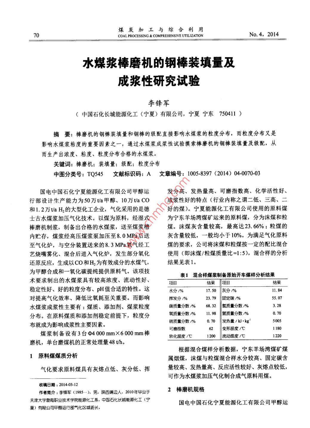 煤炭加工與綜合利用COAL PROCESSING COMPREHENSIVE UTILIZATIONNo.4,2014水煤漿棒磨機(jī)的鋼棒裝填量及成漿性研究試驗(yàn)李鋒軍(中國(guó)石化長(zhǎng)城能源化工(寧夏)有限公司,寧夏寧東750411)摘要:棒磨機(jī)的鋼棒裝填量和鋼棒的級(jí)配直接影響水煤漿的粒度分布,而粒度分布又是影響水煤漿粘度的重要因素之一,通過水煤漿成漿性試驗(yàn)摸索棒磨機(jī)的鋼棒裝填量及級(jí)配,從而生產(chǎn)出濃度、粘度、粒度分布合格的水煤漿。關(guān)鍵詞:棒磨機(jī);裝填量;級(jí)配;粒度分布中圖分類號(hào):TQ545文獻(xiàn)標(biāo)識(shí)碼:A文章編號(hào):10058397(2014)040070-03國(guó)電中國(guó)石化寧夏能源化工有限公司甲醇運(yùn)發(fā)分高、發(fā)熱量高、可磨指數(shù)高、化學(xué)活性好、行部設(shè)計(jì)生產(chǎn)能力為50萬(wàn)ta甲醇、10萬(wàn)taCO成漿性好的特點(diǎn)(行業(yè)內(nèi)稱之謂二低、三高、二和12萬(wàn)taH2的大型化工企業(yè),氣化采用的是德好的煤)。寧夏能源化工有限公司使用的原料煤士古水煤漿加壓氣化技術(shù)。以煤為原料,經(jīng)濕式為寧東羊場(chǎng)灣煤礦運(yùn)來的原料煤,分為沫煤和粒棒磨機(jī)制漿,制備出合格的水煤漿,送至煤漿槽煤。沫煤灰含量較高,最髙達(dá)23.66%;粒煤的內(nèi)貯存,煤漿經(jīng)高壓煤漿泵加壓至8.0MPa后送灰含量較低,一般均小于10%。為滿足氣化原料至氣化爐,與空分裝置送來的83MPa氧氣經(jīng)工煤的要求,公司將沫煤和粒煤按一定的配比混合藝燒嘴霧化、混合后進(jìn)入氣化爐,發(fā)生部分氧化使用(即沫煤/粒煤質(zhì)量比=1:5),混合樣的分析還原反應(yīng),生成以CO和H2為有效成分的水煤氣,結(jié)果見表1。為甲醇合成和一氧化碳提純提供原料氣。該項(xiàng)技表1混合樣煤漿制備原始開車煤樣分析結(jié)果術(shù)要求制出的水煤漿具有較高濃度、流動(dòng)性好、田T已穩(wěn)定性好、好的粒度分布、pH值合適的特性。這水分%1750灰分/%l1.84對(duì)提高氣化效率、降低比氧耗至關(guān)重要。而影響揮發(fā)分%23.9固定碳/%55.水煤漿成漿性主要有:煤質(zhì)、添加劑、煤漿粒度碳質(zhì)量分?jǐn)?shù)%68.32氫質(zhì)量分?jǐn)?shù)/%3.28分布。在原料煤質(zhì)和添加劑穩(wěn)定前提下,粒度分氧質(zhì)量分?jǐn)?shù)%1198氮質(zhì)量分?jǐn)?shù)%布就成為影響成漿性主要因素。硫質(zhì)量分?jǐn)?shù)0.70發(fā)熱量/婦kg62變形溫度/℃煤漿制備設(shè)有3臺(tái)Φ4000mm×6000mm棒可磨指數(shù)軟化溫度/℃1200流動(dòng)溫度/℃磨機(jī),單臺(tái)磨煤機(jī)的正常處理量48th根據(jù)混合煤樣分析數(shù)據(jù),寧東羊場(chǎng)灣煤礦煤1原料煤煤質(zhì)分析屬煙煤,沫煤與粒煤混合樣水分較髙、固定碳含氣化要求原料煤具有灰熔點(diǎn)低、灰分低、揮量較高、發(fā)熱量高、反應(yīng)活性較好、灰熔點(diǎn)較低,可作為水煤漿加壓氣化制合成氣原料用煤。收稿日期:201403-2作者簡(jiǎn)介:李鐸軍(1985),男,陜西靖邊人,2010年畢業(yè)于2棒磨機(jī)規(guī)格天津大學(xué)勁油職業(yè)技術(shù)學(xué)院能源化工系,中國(guó)石化長(zhǎng)城能源化工(寧國(guó)電中國(guó)石化寧夏能源化工有限公司甲醇運(yùn)夏)有限公司甲醇運(yùn)行邳氣化區(qū)域班長(zhǎng)2014年第4期李峰軍:水煤漿棒磨機(jī)的鋼棒裝填量及成漿性研究試驗(yàn)71行部采用的棒磨機(jī)為中信重工機(jī)械股份有限公司在一起時(shí),鋼棒之間縫隙較大,物料在其中的流制造的濕式溢流型棒磨機(jī);內(nèi)襯橡膠襯板。棒磨速較快,研磨時(shí)間變短。同時(shí),物料與磨煤機(jī)筒機(jī)的技術(shù)參數(shù)見表2。體之間接觸面較小,因而會(huì)出現(xiàn)研磨不充分的現(xiàn)表2棒磨機(jī)技術(shù)參數(shù)象。如果在粗棒之間添加細(xì)棒,鋼棒之間的縫隙數(shù)值就會(huì)變小。同時(shí),鋼棒與物料接觸面積會(huì)增大,筒體內(nèi)徑/m4000物料在磨煤機(jī)內(nèi)流速變慢,物料有較多的機(jī)會(huì)與筒體工傳轉(zhuǎn)鋼棒接觸從而使煤漿被研磨更細(xì)2。入口粒度/mm≤10為滿足水煤漿氣化工藝要求的粒度分布,首薦裝棒量/t先要解決的是棒磨機(jī)的鋼棒級(jí)配及裝填量。因此,磨棒直徑規(guī)格/mm在初次制漿時(shí),進(jìn)行了水煤漿成漿性試驗(yàn)(即粒筒體工作長(zhǎng)度/mm度分布與鋼棒級(jí)配及裝填量的工業(yè)試驗(yàn))。筒體有效容積/m369.81鈉棒最大裝填量/t5水煤漿成漿性試驗(yàn)最大處理能力/68.20磨煤機(jī)鋼棒的型號(hào)分別為:q75mm×5800mm、3氣化對(duì)水煤漿要求q65mm×5800mm、q50mm×5800mm。使用的是德士古氣化工藝對(duì)原料要求較高,相應(yīng)地對(duì)寧夏南益化工有限公司的水煤漿添加劑,添加劑的水煤漿的性質(zhì)也有以下五方面的要求,即:較高加入量為干煤質(zhì)量的0.26%,三種鋼棒的添加量依的濃度、較好的流動(dòng)性、較好的穩(wěn)定性、適宜的據(jù)以往的生產(chǎn)經(jīng)驗(yàn)比例為34:3,磨煤機(jī)鋼棒的添加pH值、適宜的粒度分布。其中,粒度分布是影量需根據(jù)水煤漿特性做出調(diào)整。響水煤漿成漿的關(guān)鍵因素。若水煤漿中粗顆粒較根據(jù)寧煤甲醇項(xiàng)目生產(chǎn)情況,借鑒一些生產(chǎn)多,煤漿表觀粘度下降,流動(dòng)性變好,但粒子的方面經(jīng)驗(yàn)(其與本裝置采用添加劑為同一生產