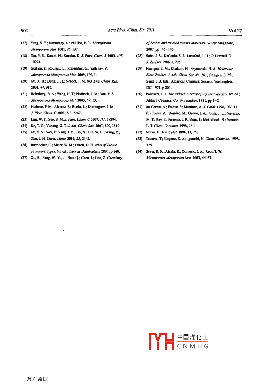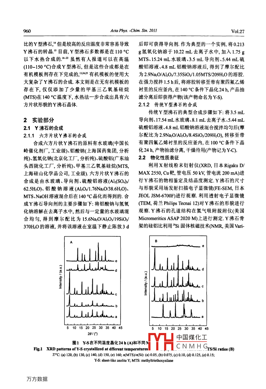 物理化學(xué)學(xué)報(bào)(Wuli Huaxue Xuebao)AprilActa Phys. -Chim. Sin. 2011, 27 (4), 959- -964959[Aticle]www.whxb.pku.edu.cnY沸石的高溫合成單志超1劉思宇1李彩今1朱龍鳳1孟祥舉2° .肖豐收”"(吉林大學(xué)化學(xué)學(xué)院,無機(jī)合成與制備化學(xué)國家重點(diǎn)實(shí)驗(yàn)室,長春130012;。浙江大學(xué) 催化研究所,杭州310028)摘要:采用甲基三乙氧基硅烷(MTS)為添加劑, 在高溫(140 °C)條件下水熱合成出具有六方片狀形貌的Y型沸石.相比于100。C左右合成的Y型沸石,高溫合成的Y沸石具有更高的硅鋁比值、更大的晶體寬厚比值以及對有機(jī)揮發(fā)物具有優(yōu)異的吸附性能.通過X射線衍射(XRD)、掃描電子顯微鏡(SEM)透射電子顯微鏡(TEM)、"Si固體核磁共振(NMR)、傅里葉變換紅外(FTIR)光譜、碳?xì)浒痹胤治?CHN)、水接觸角等表征證明了所合成的新型Y沸石具有甲基基團(tuán),它們的存在增強(qiáng)了疏水性能,提高了對有機(jī)揮發(fā)物的吸附能力.關(guān)鍵詞: Y沸石;高溫; 片狀形貌; 吸附; 有機(jī)硅烷中圖分類號: 0643High-Temperature Synthesis of Zeolite YSHAN Zhi-Chao' LIU Si-Yu'LI CaiJin' ZHU Long-Feng'MENG Xiang-Ju^*XIAO Feng-Shou.*(State Key Laboratory of Inorganic Synthesis and Preparative Chemistry, Collge ofChemistry, Jilin University,Changchun 130012, P. R. China; Institnte of Catalysis, Zhejiang Universit, Hangzhou, 310028, P R China)Abstract: We hydrothermally synthesized sheet-like crystals of zeolite Y at high temperature (140 °C)using methyltriethoxysilane (MTS) as an adivity. Compared with the zeolite Y synthesized at 100。C, thezeolite Y synthesized at high temperature has a high Si/AI ratio, a large crystalline width/thickness ratioand has good adsorption for organic volatile compounds. Characterization by Xray difaction (XRD),scanning electron microscopy (SEM), transmission electron microscopy (TEM), aSi nuclear magneticresonance (NMR), Fourier transform infrared (F TIR) spectroscopy, elemental analysis and water contactangle measurements suggests that the zeolite Y synthesized at high temperature contains methyl groups,which can be responsible for the improvement in sample hydrophobicity and adsorption capacity.Key Words: Zeolite Y; High-temperature; Shet-like morphology; Adsorption; Organosilane1引言附性能與其硅鋁摩爾比值有直接的關(guān)系例如,提高Y沸石具有三維暢通的孔道結(jié)構(gòu),優(yōu)異的熱和Y沸石的硅鋁比值可以顯著地提高沸石的水熱穩(wěn)定水熱穩(wěn)定性,廣泛地應(yīng)用于石油煉制與化學(xué)工業(yè)中,性,這更有利于制備性能優(yōu)異的FCC催化劑."但特別是在流動(dòng)床催化裂化(FCC)反應(yīng)中更是起到了是,常規(guī)的Y沸石合成溫度-般在100 °C左右,所不可替代的作用一同時(shí), Y沸石也對有機(jī)揮發(fā)物的獲得的硅鋁摩爾比值在5.0 -5.3,因此人們一直尋找吸附顯示出優(yōu)良性能..直接一步法合成高Si/Al比值的Y沸石的新方法.人作為工業(yè)催化劑和吸附劑,Y沸石的催化與吸們曾發(fā)中國煤化工得到具有高硅鋁Received: October 25, 2010; Revised: January 6, 2011; Published on Web: March&, 20Correspoding authors. XIAO Feng-Shou, Email: fsxiao@mailjlu.edu.cn; Tel: +86 4:YHC N M H GnmgijzjuoduajpTel: +86-571-88273698.The project was supprted by the National Naturnal Science Foundation of China (20973079).國家自然科學(xué)基金(20973079)資助項(xiàng)目Editorial fcr of Acta Plhysico-Chimica Sinica960Acta Phys. -Chim. Sin. 2011Vol.27比的Y型沸石,"但是較高的反應(yīng)溫度非常容易導(dǎo)致后即可獲得導(dǎo)向劑.作為典型的-一個(gè)實(shí)例,將0.213Y沸石的轉(zhuǎn)晶."目前, Y型沸石多數(shù)都是在110。Cg氫氧化鈉溶于10.22 mL去離子水中,加入1.75 g以下水熱合成的.10-23雖然有人報(bào)道可以在高溫MTS、15.24 mL水玻璃、3.5 mL導(dǎo)向劑、5.44 mL硫(110-150 °C)合成Y型沸石,但是這些合成都是在酸鋁溶液、4.8 mL鋁酸鈉溶液后,得到了摩爾配比有機(jī)模板劑存在下完成的12429有機(jī)模板的使用大為2.9Na2.O/AL20/7.35SiO/1.0SMTS/209H20的溶膠.大復(fù)雜了Y沸石的合成.本文則是在無有機(jī)模板的在強(qiáng)力攪拌1.5 h后,將溶膠轉(zhuǎn)移至帶有聚四氟乙烯存在下,僅僅添加了少量的甲基三乙氧基硅烷襯里的反應(yīng)釜內(nèi),在140°C條件下晶化24h,產(chǎn)品抽(MTS)在140°C溫度下,水熱法一步合成出具有六 .濾分離后即獲得產(chǎn)物(該產(chǎn)物命名為Y-S).方片狀形貌的Y沸石晶體.2.1.2傳統(tǒng)Y型沸石的合成傳統(tǒng)Y型沸石的典型合成步驟如下:將3.5mL2實(shí)驗(yàn)部分導(dǎo)向劑、17.54 mL水玻璃、8.1 mL去離子水、5.44 mL2.1 Y 沸石的合成硫酸鋁溶液.4.8 mL鋁酸鈉溶液混合攪拌均勻后(摩2.1.1六方片狀Y沸石的合成爾配比為2.9Na0/Al2O/8.4SiO./209H2O),轉(zhuǎn)移至帶合成六方片狀Y沸石的原料有水玻璃(中國長有聚四氟乙烯襯里的反應(yīng)釜內(nèi),在100 °C條件下晶嶺催化劑廠,工業(yè)級)、鋁酸鈉(.上海國藥集團(tuán),分析化24 h,產(chǎn)物抽濾分離,干燥待用(產(chǎn)物記為Y-C).純)、氫氧化鈉(北京化工廠,分析純)、硫酸鋁(廣東汕2.2 物化性質(zhì)表征頭西隴化工廠,分析純)、甲基三乙氧基硅烷(MTS,利用X射線粉末衍射儀(XRD,日本RigakuD/上海硅山化學(xué)品公司,工業(yè)級).六方片狀Y沸石的MAX2550,Cu靶,管電壓50kV,管電流200mA)進(jìn)合成是由水玻璃、導(dǎo)向劑、硫酸鋁溶液(Al.(SO)/行Y沸石的物相鑒定及結(jié)晶度測定.Y沸石的尺寸62.5H2O)、鋁酸鈉溶液(AlO/l.76Na2O/38.6H2O)、與形貌采用場發(fā)射掃描電子顯微