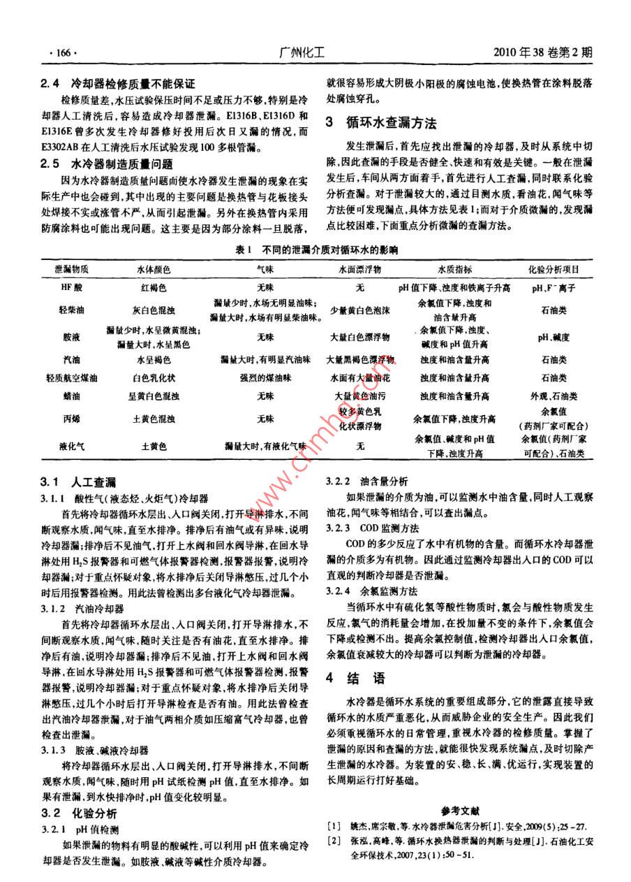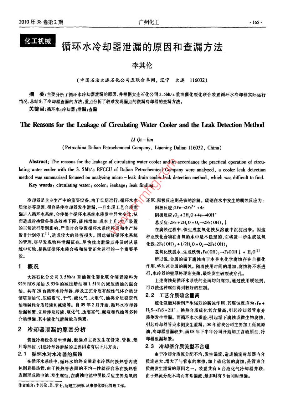 2010年38卷第2期廣州化工165化工機械循環(huán)水冷卻器泄漏的原因和查漏方法李其倫(中國石油大連石化公司五聯(lián)合車間,遼寧大連116032)摘要:主要分析了循環(huán)水冷卻器泄漏的原因,并根據(jù)大連石化公司35M/a重油催化裂化聯(lián)合裝置循環(huán)水冷卻器實際運行情況,總結出了冷卻器查漏的方法,重點分析了較難發(fā)現(xiàn)漏點的微漏冷卻器的查漏方法。關鍵詞:循環(huán)水;冷卻器;泄漏;查漏The Reasons for the Leakage of Circulating Water Cooler and the Leak Detection MethodLI Qi-lunPetrochina Dalian Petrochemical Company, Liaoning Dalian 116032, China)Abstract: The reasons for the leakage of circulating water cooler and in accordance the practical operation of circu-lating water cooler with the 3. 5Mv a RFCCU of Dalian Petrochemical Company were analyzed, a cooler leak detectionmethod was summarized focused on analyzing micro-leak drain cooler leak detection method, which was difficult to findKey words: circulating water; cooler; leakage; leak finding冷卻器是企業(yè)生產(chǎn)中的重要設備,由于長期運行,循環(huán)水水還原陽極反應則是鐵的溶解。碳鋼在水中發(fā)生的腐蝕反應為質(zhì)較差等原因很容易使冷卻器發(fā)生泄漏,一旦出現(xiàn)工藝介質(zhì)泄陽極反應:2Fe2Fe2+4e漏進入循環(huán)水系統(tǒng),會使整個循環(huán)水系統(tǒng)水質(zhì)發(fā)生異常變化,從陰極反應:O2+2H2O+4e+40H而造成冷換設備換熱效率下降能耗增加,成本上升,生產(chǎn)裝置總反應:2Fe+2H2O+O2→2Fe(OH)2↓的正常運行受到影響嚴重時會導致循環(huán)水系統(tǒng)停運和生產(chǎn)裝在腐蝕過程中,鐵生成氫氧化鐵從溶液中沉淀出來。因這置非計劃停工,造成較大的經(jīng)濟損失。因此做好循環(huán)水系統(tǒng)種亞鐵化合物在含氧的水中是不穩(wěn)定的它將進一步生成氫氧的管理,盡早發(fā)現(xiàn)物料泄漏征兆盡快找出泄漏點并及時從系化鐵2F(OH)2+1/2H2o+O2→2Fe(0H),統(tǒng)中切除,是保證循環(huán)水質(zhì)合格和裝置正常運行的一個重要手氫氧化鐵脫水,生成鐵銹:Fe(OH)3→ FeOOH↓+H2O21所以說金屬的垢下腐蝕由于本身電化學腐蝕存在自催化1概況作用將加速金屬的腐蝕。隨著使用時間的增加腐蝕將不斷進大連石化分公司3.5Ma重油催化裂化聯(lián)合裝置原料為行水冷器的壁厚將逐漸變薄最終發(fā)生破裂或穿孔92%RDs尾油553%的減壓蠟油和1.51%的減壓渣油的混合上述腐蝕是循環(huán)水系統(tǒng)的全面均勻腐蝕通過使用緩蝕劑,油。共有28臺循環(huán)水冷卻器涉及工藝介質(zhì)有酸性氣體介質(zhì)分可以使這種腐蝕得到較好的控制。餾塔頂油氣、壓縮富氣、干氣、液化氣、火炬氣,油類介質(zhì)穩(wěn)定汽22工藝介質(zhì)硫含量高油和堿性介質(zhì)胺液和堿液等。自09年2月開始循環(huán)水冷卻器硫化氫能對碳鋼產(chǎn)生強烈的腐蝕作用,其腐蝕反應為:Fe+泄漏頻繁,先后涉及胺液液化氣壓縮富氣、堿液和汽油等多種H15sFeS+2H。換熱介質(zhì)硫化氫含量高引起冷卻器管束介介質(zhì)泄漏其中液化氣泄漏最為頻繁。質(zhì)側發(fā)生泄漏。而循環(huán)水水質(zhì)差,引起垢下腐蝕或微生物腐蝕,引起冷卻器管束水側發(fā)生泄漏。08年前我公司主要加工低硫原2冷卻器泄漏的原因分析油冷卻器泄漏較少,而08年下半年公司開始加工含硫原油冷裝置冷換設備發(fā)生泄漏泄漏點主要發(fā)生在管束管板墊卻器泄漏頻繁。片等部位,引起冷卻器泄漏的主要因素有以下幾方面23冷卻器介質(zhì)流型不合理2.1循環(huán)水對水冷器的腐蝕由于冷卻介質(zhì)流分配不均發(fā)生偏流,造成偏流冷卻器內(nèi)介在循環(huán)水系統(tǒng)中循環(huán)水始終充滿著水冷器的換熱管內(nèi)或質(zhì)流速大增大了與管束的摩擦加上硫化氫的腐蝕,是管束介包圍著換熱管由于換熱管表面的不均一性就很容易在換熱管質(zhì)側發(fā)生泄漏的原因之一。裝置共有6臺液化氣冷卻器并聯(lián),表面形成微電池發(fā)生腐蝕在腐蝕電池中陰極反應主要是氧的由于熱流分配不均而常常偏流最多時有5臺同時泄漏。作者簡介:李其倫男學士,助理工程師從事催化裂化管理工作。廣州化工2010年38卷第2期24冷卻器檢修質(zhì)量不能保證就很容易形成大陰極小陽極的腐蝕電池,使換熱管在涂料脫落檢修質(zhì)量差,水壓試驗保壓時間不足或壓力不夠特別是冷處腐蝕穿孔。卻器人工清洗后,容易造成冷卻器泄漏。E1316BE1316D和E36E曾多次發(fā)生冷卻器修好投用后次日又漏的情況,而3循環(huán)水查漏方法E302AB在人工清洗后水壓試驗發(fā)現(xiàn)100多根管漏。發(fā)生泄漏后,首先應找出泄漏的冷卻器,及時從系統(tǒng)中切2.5水冷器制造質(zhì)量問題除因此查漏的手段是否健全、快速和有效是關鍵。一般在泄漏因為水冷器制造質(zhì)量問題而使水冷器發(fā)生泄漏的現(xiàn)象在實發(fā)生后車間從兩方面著手,首先進行人工查漏同時聯(lián)系化驗際生產(chǎn)中也會碰到其中出現(xiàn)的主要問題是換熱管與花板接頭分析查漏。對于泄漏較大的,通過目測水質(zhì)看油花聞氣味等處焊接不實或漲管不嚴,從而引起泄漏。另外在換熱管內(nèi)采用方法便叮發(fā)現(xiàn)漏點,具體方法見表1;而對于介質(zhì)微漏的發(fā)現(xiàn)漏防腐涂料也叮能出現(xiàn)問題。這主要是因為部分涂料一旦脫落,點比較困難,下面重點分析微漏的查漏方法。表1不同