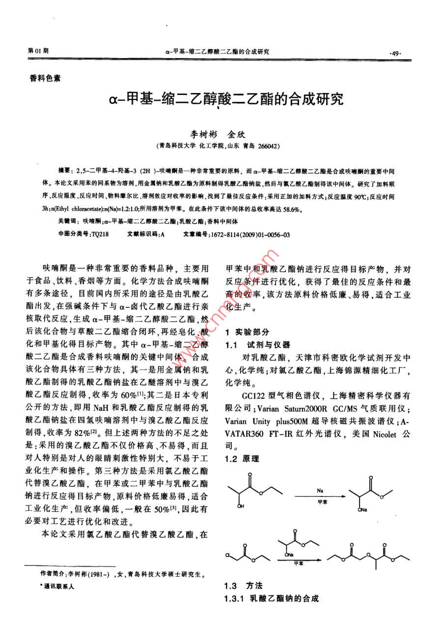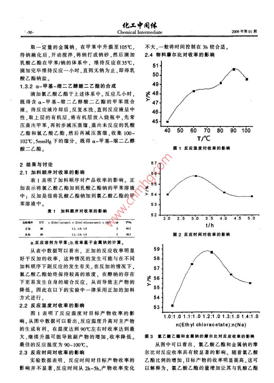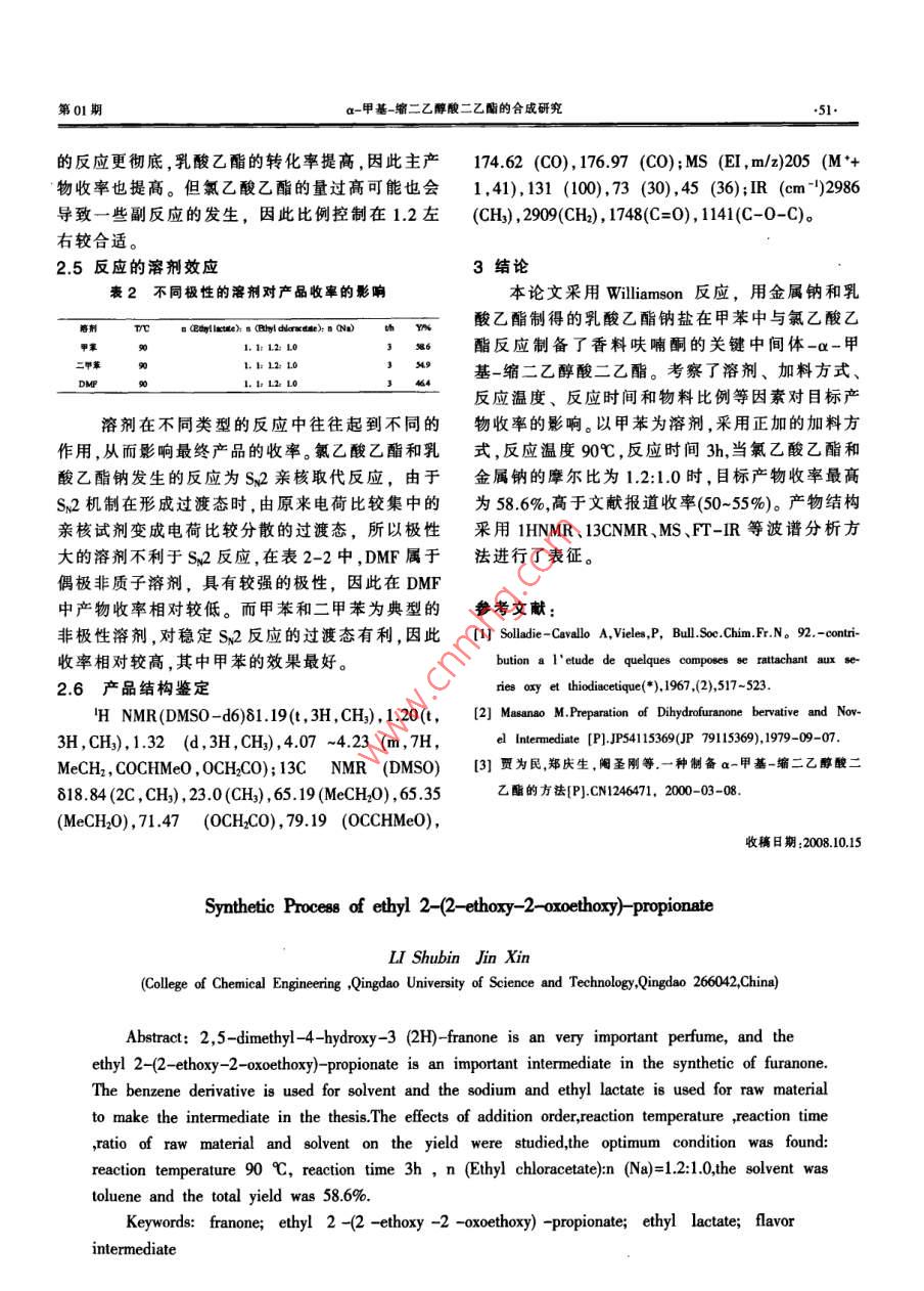 第01期a-甲基-縮二乙醇酸二乙酯的合成研究香料色素α-甲基-縮二乙醇酸二乙酯的合成研究李樹彬金欣(青島科技大學化工學院山東青島26042)摘要:25-二甲基4羥基-3(2H)-呋喃酮是一種非常重要的原料,而a-甲基-縮二乙醇酸二乙酯是合成呋喃酮的重要中間體。本論文采用苯的同系物為溶劑,用金屬鈉和乳酸乙酯為原料制得乳酸乙酯鈉鹽然后與氯乙酸乙酯制得該中間體。研究了加料順序、反應溫度、反應時間物料摩爾比溶劑效應對收率的影響,找到了最佳反應條件:采用正加的加料方式;反應溫度90℃;反應時間3h;n( Ethyl chloracetate)nNa=1210所用溶劑為甲苯。在此條件下該中間體的總收率高達586%。關鍵詞:呋喃酮;a-甲基-縮二乙醇酸二乙酯;乳酸乙酯;香料中間體分類號:TQ218文獻標識碼:A文章編號:1672-8114(2009)01-005603呋喃酮是一種非常重要的香料品種,主要用甲苯中和乳酸乙酯鈉進行反應得目標產物,并對于食品、飲料、香煙等方面。化學方法合成呋喃酮反應條件進行優(yōu)化,獲得了最佳的反應條件和最有多條途徑,目前國內所釆用的途徑是由乳酸乙高的收率,該方法原料價格低廉、易得,適合工業(yè)酯出發(fā),在強堿條件下與a-鹵代乙酸乙酯進行親化生產。核取代反應,生成α-甲基-縮二乙醇酸二乙酯,然后該化合物與草酸二乙酯縮合閉環(huán),再經皂化、酸1實驗部分化和甲基化得目標產物。其中a-甲基-縮二乙醇1.1試劑與儀器酸二乙酯是合成香料呋喃酮的關鍵中間體。合成對乳酸乙酯,天津市科密歐化學試劑開發(fā)中該化合物具體有三種方法,其一是用金屬鈉和乳心,化學純;對氯乙酸乙酯,上海錦源精細化工廠,酸乙酯制得的乳酸乙酯鈉鹽在乙醚溶劑中與溴乙化學純。酸乙酯反應制得,收率為60%;其二是日本專利GC122型氣相色譜儀,上海精密科學儀器有公開的方法,即用Na和乳酸乙酯反應制得的乳限公司; Varian Saturn200RCC/MS氣質聯(lián)用儀;酸乙酯鈉鹽在四氫呋喃溶劑中與溴乙酸乙酯反應 Varian Unity plus50M超導核磁共振波譜儀;A制得,收率為82%2。但上述兩種方法的不足之處 VATAR360FT-IR紅外光譜儀,美國 Nicolet公是:采用的溴乙酸乙酯不僅價格高、不易得,而且司。對人特別是對人的眼睛刺激性特別大,不易于工12原理業(yè)化生產和操作。第三種方法是采用氯乙酸乙酯代替溴乙酸乙酯,在甲苯或二甲苯中與乳酸乙酯鈉進行反應得目標產物,原料價格低廉易得,適合工業(yè)化生產,但收率偏低,一般在50%,因此有必要對工藝進行優(yōu)化和改進。本論文采用氯乙酸乙酯代替溴乙酸乙酯,在作者簡介:李樹彬(1981-),女,青島科技大學碩士研究生。13方法1.3.1乳酸乙酯鈉的合成化工中間體Chemical Intermediate009年第01期取一定量的金屬鈉,在甲苯中升溫至105℃,不大,一般將時間控制在3h較合適待鈉融化后,開動攪拌將鈉打成鈉砂,然后滴加24物料摩爾比對收率的影響乳酸乙酯在甲苯/鈉的體系中,維持反應在35℃,滴加完畢維持反應一小時,直到無鈉為止,即得乳酸乙酯鈉鹽。1.3.2α-甲基-縮二乙醇酸二乙酯的合成滴加氯乙酸乙酯于上述體系中。反應幾小時,受既得含α-甲基-縮二乙醇酸二乙酯的甲苯混合>47液。待反應液冷卻后,反復水洗,直到反應液呈中性,取上層的有機層,將有機層放入燒瓶中,先常壓蒸出甲苯,再初步減壓蒸餾,蒸出未反應的乳酸乙酯和氯乙酸乙酯,然后再減壓蒸餾,收集100~405060708090100102℃,5mmHg下的餾分,既得a-甲基-縮二乙醇T/C酸二乙酯。圖1反應溫度對收率的影響2結果與討論2.1加料順序對收率的影響表1表明了加料順序對產品收率的影響。正55加表示將氯乙酸乙酯加到乳酸乙酯鈉的甲苯溶液中;反加是指將乳酸乙酯鈉加到氯乙酸乙酯的甲苯溶液中表1加料順序對收率的影響2.02.53.03.54.04.55.0加料順序 T/e n (Ethyl lactate)n( thyl chloracetate)nt/h;I01.01:10:I圖2反應時間對收率的影響a反應溶荊為甲苯;b收率基于金屬鈉的計算從表中數據可以看出,正加的反應收率明顯好于反加的收率,這種情況的發(fā)生可能與在不同加料順序下副反應的發(fā)生有關。在反加的情況下氯乙酸乙酯始終保持較高的濃度,在醇鈉的存在下更易發(fā)生自身的縮合反應,從而導致主產物的56降低。因此在以下的實驗中一律采用正加的加料方式進行。22反應溫度對收率的影響圖1表明了反應溫度對目標產物收率的影1.0:1.01.1:1.01.2:1.01.3:1.01.4:1.0響。從圖中數據可以看出,反應溫度升高對主產物的生成有利,在溫度達到90℃左右時收率達到最n(Eth yl chloracetate): n(Na)大,繼續(xù)升溫可能導致副產物的增加,收率降低。圖3氯乙酸乙酯和金屬鈉的鏖爾比對反應收率的影響最佳的反應溫度為90~100℃從圖中可以看出,氯乙酸乙酯和金屬鈉的摩23反應時間對收率的影響爾比對反應收率具有較顯著的影響。隨著氯乙酸實驗數據表明,反應時間對目標產物收率的乙酯比例的增加,目標產物的收率明顯提高。這可影響并不顯著,反應時間從2h-5h,產物收率變化以解釋為,氯乙酸乙酯的量增加讓其與乳酸乙酯第01期a-甲基-縮二乙醇酸二乙酯的合成研究的反應更徹底,乳酸乙酯的轉化率提高,因此主產174.62(CO),176.97(CO);Ms(EI,m/z)205(M+物收率也提高。但氯乙酸乙酯的量過高可能也會1,41),131(100),73(30),45(36);IR(cm-)2986導致一些副反應的發(fā)生,因此比例控制在1.2左(CH),2909(CH2),1748(C=0),1141(C-0-C)右較合適。25反應的溶劑效應3結論表2不同極性的溶劑對產品收率的影響本論文采用