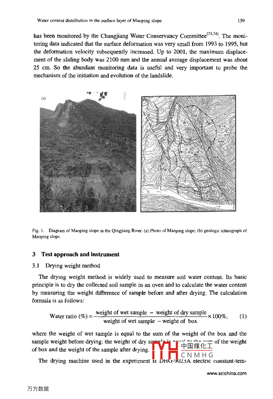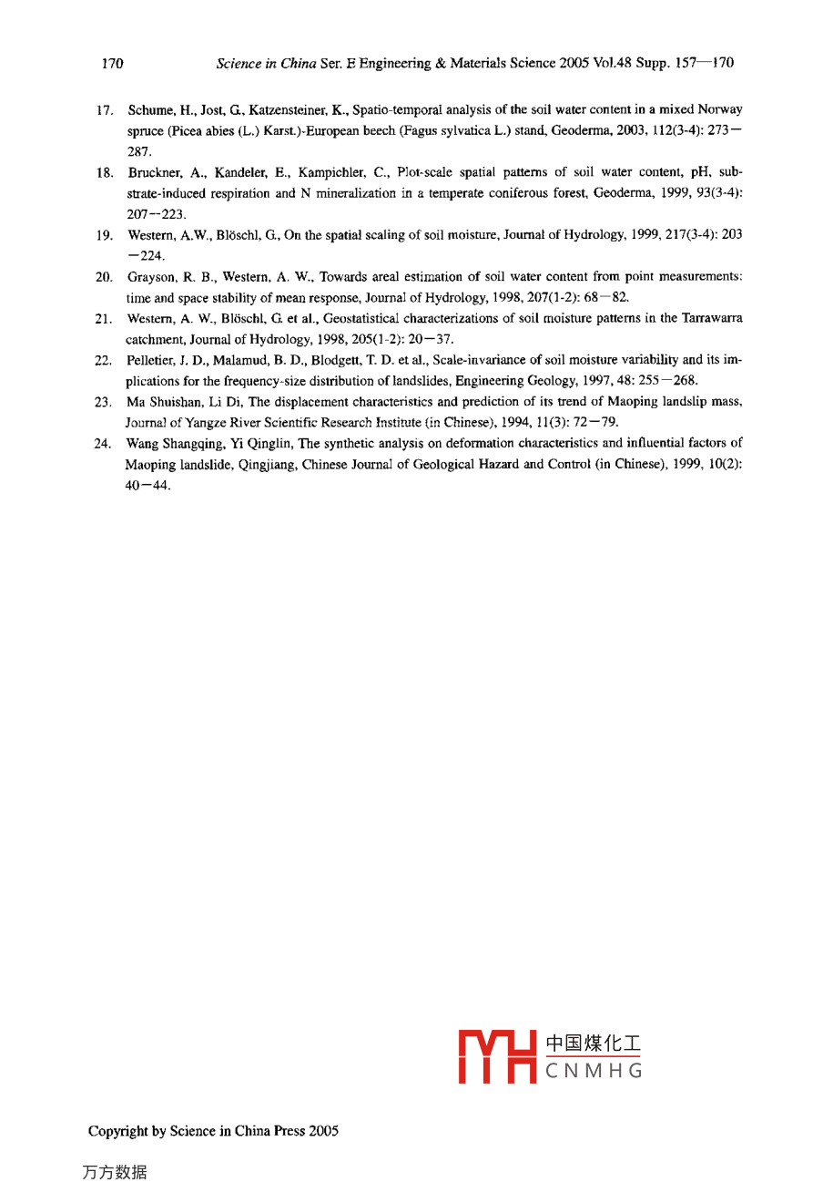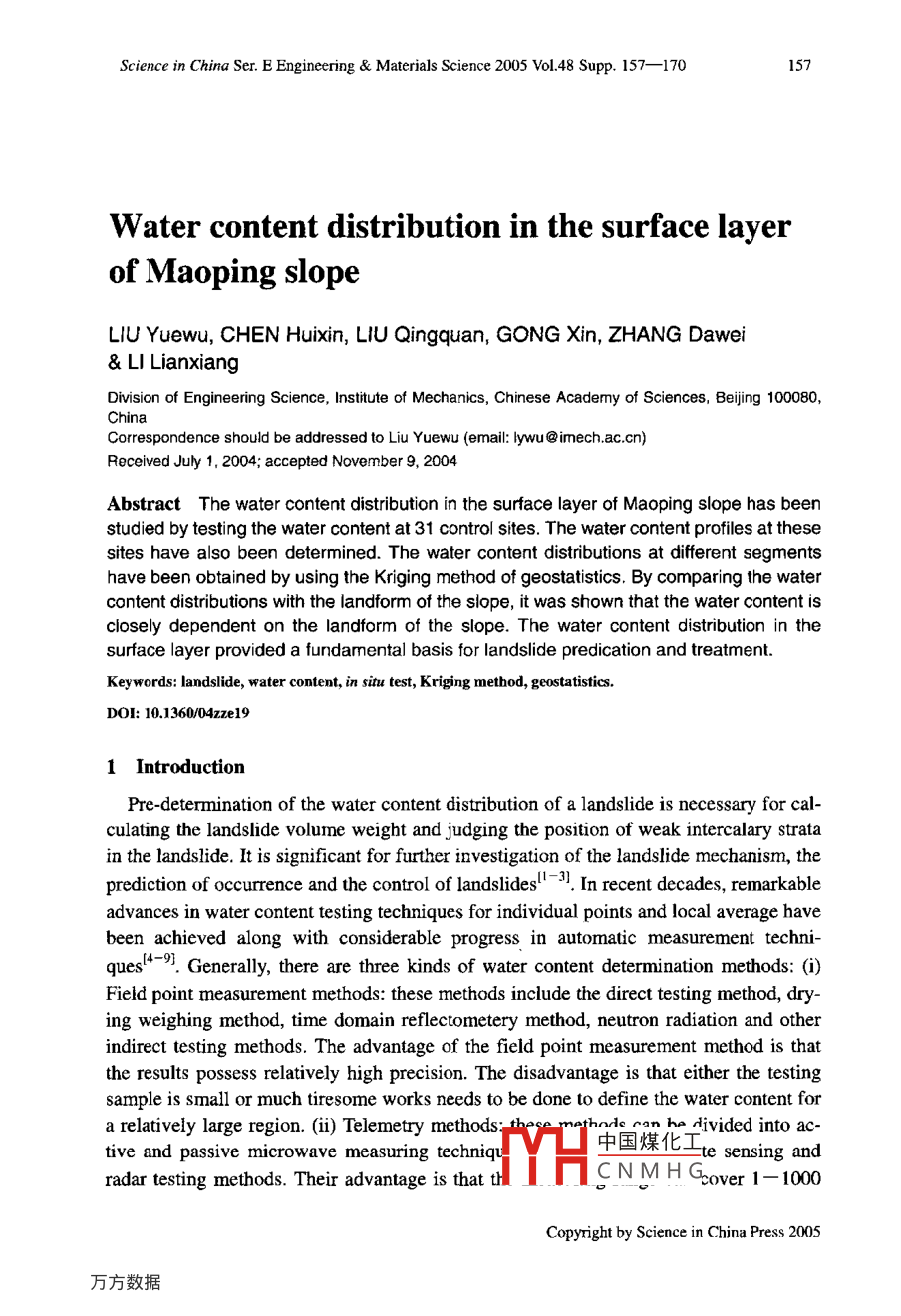 Science in China Ser. E Engineering & Materials Science 2005 Vol.48 Supp. 157- -170157Water content distribution in the surface layerof Maoping slopeLIU Yuewu, CHEN Huixin, LIU Qingquan, GONG Xin, ZHANG Dawei& L LianxiangDivision of Engineering Science, Institute of Mechanics, Chinese Academy of Sciences, Beiing 100080,ChinaCorrespondence should be addressed to Liu Yuewu (email: lywu @ imech.ac.cn)Received July 1, 2004; accepted November 9, 2004Abstract The water content distribution in the surface layer of Maoping slope has beenstudied by testing the water content at 31 control sites. The water content profiles at thesesites have also been determined. The water content distributions at different segmentshave been obtained by using the Kriging method of geostatistics. By comparing the watercontent distributions with the landform of the slope, it was shown that the water content isclosely dependent on the landform of the slope. The water content distribution in thesurface layer provided a fundamental basis for landslide predication and treatment.Keywords: landslide, water content, in situ test, Kriging method, geostatistics.DOI: 10.1360/04zze191 IntroductionPre-determination of the water content distribution of a landslide is necessary for cal-culating the landslide volume weight and judging the position of weak intercalary stratain the landslide. It is significant for further investigation of the landslide mechanism, theprediction of occurrence and the control of landslidest- 31. In recent decades, remarkableadvances in water content testing techniques for individual points and local average havebeen achieved along with considerable progress in automatic measurement techni-ques'[4-91Generally, there are three kinds of water content determination methods: (i)Field point measurement methods: these methods include the direct testing method, dry-ing weighing method, time domain reflectometery method, neutron radiation and otherindirect testing methods. The advantage of the field point measurement method is thatthe results possess relatively high precision. The disadvantage is that either the testingsample is small or much tiresome works needs to be done to define the water content fora relatively large region. (ii) Telemetry methods: these mathnds ran he Hivided into ac-tive and passive microwave measuring techniqu中國煤化工; sensing andradar testing methods. Their advantage is that thYHCNMHGover1-1000.Copyright by Science in China Press 2005158Science in China Ser. E Engineering & Materials Science 2005 Vo1.48 Supp. 157- -170km2. However, only the average water content of the whole region can be determined bythese methods. (ii) Numerical simulation methodst0- 13): these methods are based on thegeological and mechanical parameters of the slope layers. The methods partly depend onthe test results of the above two methods, so they are only an evaluation method and donot belong to the range of field tests. There exists a range (about 0.1一10 km) in whichit is difficult to obtain in situ testing results by the first and second methods mentionedabove. It was indeed within this scope where numerous landslides and other geologicalhazards happened. How to determine the water content in this scope is one of the hottopicsl14- 22 in agnicultural engineering, hydraulic engineering and hydrologic geology. Itis also one of the issues far from being resolved, including how to deduce the watercontent at untested points and the space distribution of water content based on the datafrom the tested points.Maoping slope was selected to assess the field test and to evaluate the method of wa-ter content distribution. Through more than two years of geological investigation andfield tests, 31 test sites were selected to test the water content in the surface layers byusing the drying weight and direct measurement methods. The Kriging geostatisticsmethod and other analytical methods were employed to determine the water content dis-tributions in the surface layer of Maoping slope based on the in situ tests. The watercontent distribution in the intermediate range has been obtained by combining the fieldtests and numerical analysis, and it provides the basic data for the stability analysis ofMaoping landslide.2 General geography and landform of Maoping slopeMaoping slope is located on the left bank of the Qingjiang River, 66 km above theGeheyan hydropower station and 25 km below the Shuibuya hydropower station. Ma-oping slope is the largest ancient landslide in the Geheyan Reservoir region, with alength of about 1600 m, a maximum width of 600 m, a thickness of 8- -86 m and a totalvolume of about 2.350x10' m'. Fig. 1 shows the profile and the geologic sketch of Ma-oping landslide in a birds-eye view. If the sliding body goes down at high speed, theQingjiang River would be jammed, and the normal operation of the two hydropowerstations would be affected. Additionally, Maoping slope is an ancient stack on bedrock,and this kind of slope is widely distributed within. Three Gorges Reservoir region. TheGeheyan Reservoir has been operating for more than ten years and its operational modeis similar to that of the Three Gorges reservoir. Hence, further study of the Maopinglandslide will be valuable for the evaluation and control of landslides in the ThreeGorges reservoir area.The early investigations suggested that Maoping slope is relatively stable but that lo-cal collapse or local sliding may occur in the leading edge near the Qingjiang River afterwater storage. The operation of the Geheyan Res中國煤化工j the maximumwater level was reached in the next year. SinceYHC N M H GMaoping slopeCopyright by Science in China Press 2005Water content distribution in the surface layer of Maoping slope159has been monitored by the Changjiang Water Conservancy Committee.241.The moni-toring data indicated that the surface deformation was very small from 1993 to 1995, butthe deformation velocity subsequently increased. Up to 2001, the m
