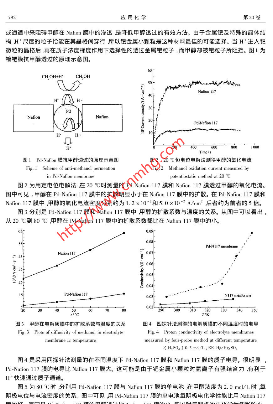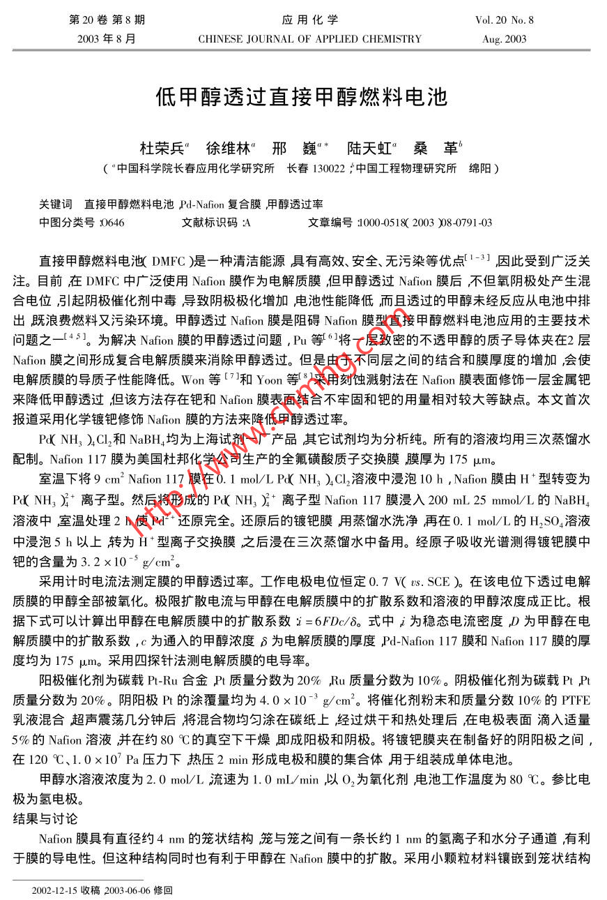 第20卷第8期應用化學Vol. 20 No. 82003年8月CHINESE JOURNAL OF APPLIED CHEMISTRYAug. 2003 .低甲醇透過直接甲醇燃料電池杜榮兵”徐維林°邢巍“*陸天虹”桑革’(“中國科學院長春應用化學研究所長春 130022 ;中國工程物理研究所綿陽 )關鍵詞直接甲醇燃料電池 ,Pd-Nafion 復合膜,甲醇透過率中圖分類號:0646文獻標識碼:A文章編號:1000-0518( 2003 )08-0791-03直接甲醇燃料電池( DMFC )是-種清潔能源具有高效、安全、無污染等優(yōu)點(1-31 ,因此受到廣泛關.注。目前在DMFC中廣泛使用Nafion膜作為電解質膜但甲醇透過Nafion膜后不但氧陰極處產生混合電位,引起陰極催化劑中毒導致陰極極化增加電池性能降低而且透過的甲醇未經反應從電池中排出既浪費燃料又污染環(huán)境。甲醇透過Nafion膜是阻礙Nafion膜型直接甲醇燃料電池應用的主要技術問題之- _[45]。 為解決Nafion膜的甲醇透過問題,Pu等61將-層致密的不透甲醇的質子導體夾在2層Nafion膜之間形成復合電解質膜來消除甲醇透過。但是由于不同層之間的結合和膜厚度的增加會使電解質膜的導質子性能降低。Won等[7l和Yoon等8采用刻蝕濺射法在Nafion膜表面修飾一層金屬鈀來降低甲醇透過但該方法存在鈀和Nafion膜表面結合不牢固和鈀的用量相對較大等缺點。本文首次報道采用化學鍍鈀修飾Nafion 膜的方法來降低甲醇透過率。Pd( NH; )4CI,和NaBH,均為上海試劑一廠產品其它試劑均為分析純。所有的溶液均用三次蒸餾水配制。Nafion 117 膜為美國杜邦化學公司生產的全氟磺酸質子交換膜膜厚為175 μm。室溫下將9 cm2 Nafion 117膜在0.1 mol/L Pd( NH, ).Cl2溶液中浸泡10 h ,Nafion 膜由H +型轉變?yōu)镻d( NH;)吊*離子型。然后將形成的Pd( NH3吊*離子型Nafion 117膜浸入200 mL 25 mmol/L的NaBH,溶液中室溫處理2 h使Pd2+還原完全。還原后的鍍鈀膜用蒸餾水洗凈再在0. 1 mol/L的H2SO,溶液中浸泡5h以上轉為H+型離子交換膜,之后浸在三次蒸餾水中備用。經原子吸收光譜測得鍍鈀膜中鈀的含量為3.2x10-s g/cm2。采用計時電流法測定膜的甲醇透過率。工作電極電位恒定0.7 V( vs. SCE )。在該電位下透過電解質膜的甲醇全部被氧化。極限擴散電流與甲醇在電解質膜中的擴散系數(shù)和溶液的甲醇濃度成正比。根據(jù)下式可以計算出甲醇在電解質膜中的擴散系數(shù)i=6FDc/8。式中i為穩(wěn)態(tài)電流密度,D為甲醇在電解質膜中的擴散系數(shù),c為通入的甲醇濃度β為電解質膜的厚度,Pd-Nafion 117膜和Nafion 117膜的厚度均為175 μm。采用四探針法測電解質膜的電導率。陽極催化劑為碳載Prt-Ru合金,Pt 質量分數(shù)為20% ,Ru 質量分數(shù)為10%。陰極催化劑為碳載Pt ,Pt質量分數(shù)為20%。陰陽極Pt的涂覆量均為4.0x10-3 g/cm2。將催化劑粉末和質量分數(shù)10%的PTFE乳液混合超聲震蕩幾分鐘后將混合物均勻涂在碳紙上經過烘干和熱處理后在電極表面滴入適量5%的Nafion溶液并在約80C的真空下干燥即成陽極和陰極。將鍍鈀膜夾在制備好的陰陽極之間,在120 °C、1.0x107 Pa壓力下熱壓2 min形成電極和膜的集合體用于組裝成單體電池。甲醇水溶液濃度為2.0 mol/L流速為1. 0 mL/min ,以02為氧化劑電池工作溫度為80 C。參比電極為氫電極。結果與討論Nafion膜具有直徑約4 nm的籠狀結構籠與籠之間有-條長約1 nm的氫離子和水分子通道,有利于膜的導電性。但這種結構同時也有利于甲醇在Nafion膜中的擴散。采用小顆粒材料鑲嵌到籠狀結構2002-12-15收稿2003-06-06修回國家科技部八六三"( 2001AA323060 )國家科技部九七三"( G2000025408 )和吉林省自然科學基金( 2000510 )資助項目通訊聯(lián)索幣郗男,1963 年生搏士研究員;E-mail xingwei@ ciac. jl. en ;研究方向質子交換膜燃料電池792應用化學第20卷或通道中來阻礙甲醇在Nafion膜中的滲透是降低甲醇透過的有效方法。由于金屬鈀及特殊的晶體結構,H*尺度的粒子恰能在其晶格間穿行所以鈀金屬小顆粒是這種材料最佳的可能選擇。當H+進入鈀微粒的晶格后再在質子濃度梯度作用下選擇性的透過金屬鈀粒子,而甲醇卻被鈀粒子所阻擋。圖1為鍍鈀膜抗甲醇透過的原理示意圖。60CH,OH+H'CH,O0H介Nafion 117H(f H.30PdNafion20Pd-Nafion 117H*H.幾H+Time/s圖1Pd-Nafion膜抗甲醇透過的原理示意圖圖220 C恒電位電解法測得甲醇的氧化電流Fig. 1 Scheme of anti-methanol permeationFig. 2 Methanol oxidation current measured byin Pd-Nafion membranepotentiostatic method at 20 C圖2為用定電位電解法在20 C時測量的Pd-Nafion 117膜和Nafion 117膜透過甲醇的氧化電流。圖中可見,甲醇在Pd-Nafion 117膜中的擴散明顯小于在Nafion 117膜中的擴散。在Pd-Nafion 117膜和Nafion 117 膜中,甲醇的氧化電流密度分別約為1.2x10-2和5.0x10-2 A/cm2后者約為前者的5倍。圖3分別是Pd-Nafion117膜和Nafion117膜中,甲醇的擴散系數(shù)與溫度的關系。從圖中可以看出,從20 C到80 C ,甲醇在Pd-Nafion 117 膜中的擴散系數(shù)都比在Nafion 117膜中的小。65F0.09r0.08-Pd-N1I7 membraneNation 117只0.06-L 350.05-225F0.04st0.03N117 membrane405060方800.02L290 300 3i0 320 330 340 3501cT/K圖3甲醇在電解質膜中的擴散系數(shù)與溫度的關系圖4四探針法測得的電解質膜的不同溫度時的電導Fig.3 Plots of diffusivity of methanol in electrolyteFig.4 Proton conductivity of electrolyte membranesmembrane 1S temperaturemeasured by four-probe method at different temperature( H2S0。)0. 5 mol/L ; RE Hg/Hg2SO。圖4是采用四探針法測量的在不同溫度下Pd-Nafion 117膜和Nafion 117膜的質子電導。很明顯Pd-Nafion 117膜的電導比Nafion