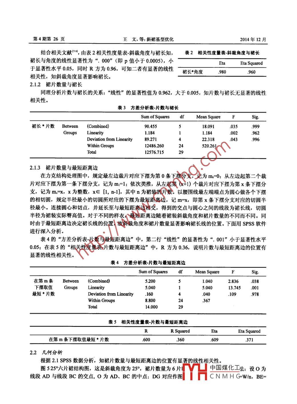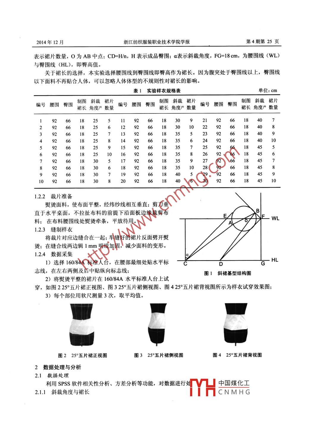 第4期第24頁浙江紡織服裝職業(yè)技術(shù)學(xué)院學(xué)報2014年12月doi: 10.3969/j.ssn. 1674-2346.2014.04.006斜裙基型優(yōu)化王文王建萍摘要: 基于已有的斜裁基型,在固定制圖裙長的情況下,制作不同角度、不同片數(shù)的30件斜裁樣衣。通過相關(guān)性分析和方差分析,分析關(guān)鍵部位實驗數(shù)據(jù),得出相關(guān)結(jié)論:斜裁角度和裙片數(shù)量顯著影響成衣裙長,并且斜裁角度顯著影響結(jié)構(gòu)圖中成衣裙長線的位置.從幾何角度分析證明斜裁裙裝的裙片數(shù)量與裙長線位置的關(guān)系,提出優(yōu)化后的斜裁裙裝基型.本課題結(jié)合平面幾何和立體結(jié)構(gòu)的相關(guān)知識,優(yōu)化斜裁裙裝制版方法,提高服裝制圖的精確性和有效性,為后續(xù)不同面料性能的斜裁裙制版研究打下基礎(chǔ)。關(guān)鍵詞:斜裁;斜裙;基型;裙長;裙片數(shù)量中圖分類號: TS941-0文獻標識碼: (文章編號: 1674-2346 (2014) 04-0024-05廣義的“斜裁(Biascut)"指服裝的垂直方向或裁片受力最大以及服裝常受力的方向與面料的經(jīng)緯方向成特殊的角度";狹義的“斜裁”特指45°方向時的裁剪技術(shù)。斜裁技術(shù)最初由法國服裝設(shè)計師Madeleine Vionnet (瑪?shù)氯R尼●維奧奈特)田基于立體裁剪技術(shù)率先提出可,她設(shè)計的服裝僅僅利用面料的斜紋伸張力,就可以輕易的穿脫,服裝造型獨特,能夠產(chǎn)生- -種近似螺旋的動感效果。 2004年,英國中圣馬丁藝術(shù)與設(shè)計學(xué)院教授Gladys Maria Baker (格拉迪●斯瑪麗●亞貝克)通過“創(chuàng)意型制板設(shè)計u”課程介紹了- -種新的斜裁制版方法。我國學(xué)者在此基礎(chǔ)上總結(jié)了-套規(guī)范的斜裁制版方法1.,但這種方法對某些部位(如腰線提高量)作圖數(shù)據(jù)來源并未做系統(tǒng)化解釋,不利于參數(shù)化應(yīng)用。有學(xué)者提出斜裁半身裙基型的制版方法,但這種方法制成的裙裝為標準圓臺型,這與人體是-一個不規(guī)則曲面體相悖,難以達到穿著合體美化身形的效果。本論文以白坯布為實驗用面料,以臀高值作為裙長,結(jié)合幾何推導(dǎo),利用SPSS軟件對不同斜裁角度、不同裁片數(shù)量的斜裁樣衣裙長進行分析,提出斜裁裙裝基型優(yōu)化制版方法,為后續(xù)不同面料性能的斜裁裙制版研究打下基礎(chǔ)。1實驗1.1 實驗材料與儀器實驗材料:白坯布,寬度為1.2 cm的直絲牽條。實驗儀器: JANOME MC 11000 數(shù)字化電腦縫紉機(日本JANOME公司),力克CAD軟件。1.2 試驗方法1.2.1已有斜裁基型裙的構(gòu)建使用力克CAD軟件,繪制不同規(guī)格斜裁裙裝結(jié)構(gòu)圖。裙裝規(guī)格如表1實驗樣衣規(guī)格表所示,其中凈腰圍W*=64cm、凈臀圍H*=90cm。結(jié)構(gòu)圖如圖1斜裙基型結(jié)構(gòu)圖所示,AB=W/n, w表示成品腰圍,n收稿日期: 2014-09-23中國煤化工作者簡介:王文,女, 東華大學(xué)服裝●藝術(shù)設(shè)計學(xué)院。(上海200051)王建萍,女東華大學(xué)服裝●藝術(shù)設(shè)計學(xué)院,教授。(上海2000JYHCNMHG.2014年12月浙江紡織服裝職業(yè)技術(shù)學(xué)院學(xué)報第4期第25頁表示裙片數(shù)量, 0為AB中點; CD=H/n, H表示成品臀圍; a表示斜裁角度, FG=18 cm,為腰圍線(WL)與臀圍線(HL), 即臀高值。關(guān)于裙長的選擇,本實驗選擇腰圍線到臀圍線即臀高作為裙長。因為腹突處于臀圍線以上,臀圍線以下面料不再貼合人體,可以忽略人體體型的不規(guī)則性對裙長的影響。限1 實驗樣衣規(guī)格表單位: cm制圖斜裁裙片編號腰圍臀圍裙長角度/0數(shù)量裙長角度/°數(shù)量251 9266092)2618406 1830 122924(56 18 2:3926618352:56 1840614 9183524104S6182:692668 352617564:302856 18 30998 4029618451320 956 1451.2.2裁片準備熨燙面料,使布面平整,經(jīng)緯紗線相互垂直;剪刀垂直于水平桌面,不拉扯布料的前提下沿面板邊緣裁剪布B_Ez644>. WL料;在布料腰圍線處熨燙牽條,平放待用。1A1.2.3縫制樣衣將裁片對應(yīng)邊縫合在一起;車縫好的裙片反面劈開熨燙;在縫合線兩邊輯1 mm明線加固,減少面料的變形。1.2.4數(shù)據(jù)采集1)選擇160/84A標準人臺,在腰部最細處貼水平標上HL志線,在左右兩側(cè)及后中貼縱向標志線;圖1斜裙基型結(jié)構(gòu)圖2)將熨燙平整的裙片在160/84A水平標準人臺上試穿,如圖225°五片裙正視圖、圖325°五片裙側(cè)視圖、圖425°五片裙背視圖所示為樣衣試穿效果圖;3)每個部位用軟尺測量3次,取平均值。圖225°五片裙正視圖圖325°五 片裙側(cè)視圖圖425°五片 裙背視圖2數(shù)據(jù)處理與分析2.1數(shù)據(jù)處理利用SPSS軟件相關(guān)性分析、方差分析等功能,對數(shù)據(jù)進行處中國煤化工2.1.1斜裁角度 與裙長YHCNMHG.第4期第26頁王文, 等:斜裙基型優(yōu)化2014年12月結(jié)合相關(guān)文獻07),由表2相關(guān)性度量表斜裁角度與裙長知,表2相關(guān)性度量表-斜裁角度與裙長裙長與角度的線性顯著性為“. 000” (即p值小于0.0005),小.Eta Squared于顯著性水平0.05,同時R方為0.96,可知二者有顯著的線性裙長*角度.980.96相關(guān)性,知斜裁角度顯著影響裙長。2.1.2裙片數(shù)量與裙長同理分析片數(shù)與裙長的關(guān)系:“線性”的顯著性值為0.962,大于0.005,知片數(shù)與裙長無顯著的線性相關(guān)性。表3方差分析表片數(shù)與裙長Sum of SquaresdfMean SquareSig.裙長*片數(shù)Between(Combined)90.45518.091.035.999GroupsLinearity1.184.002.962 .Devia