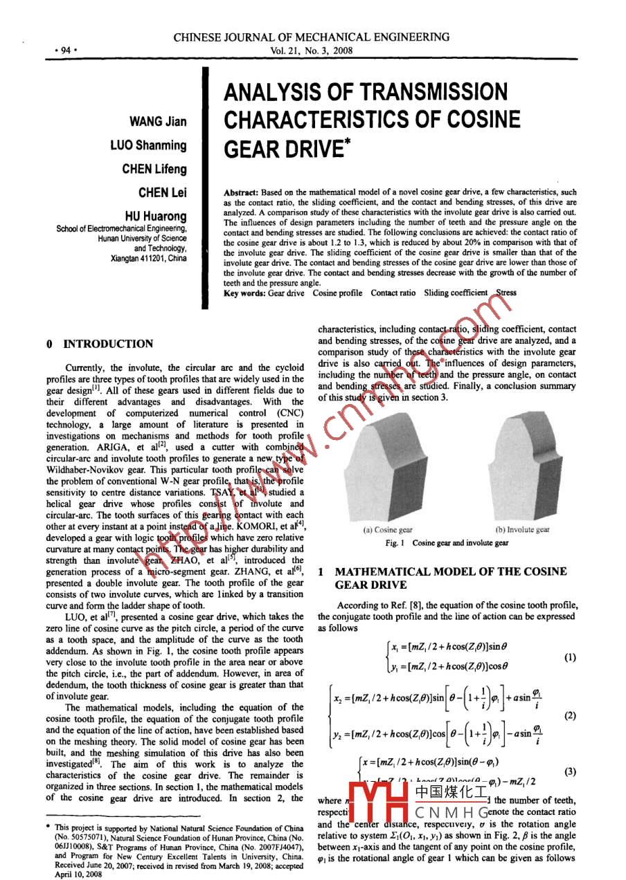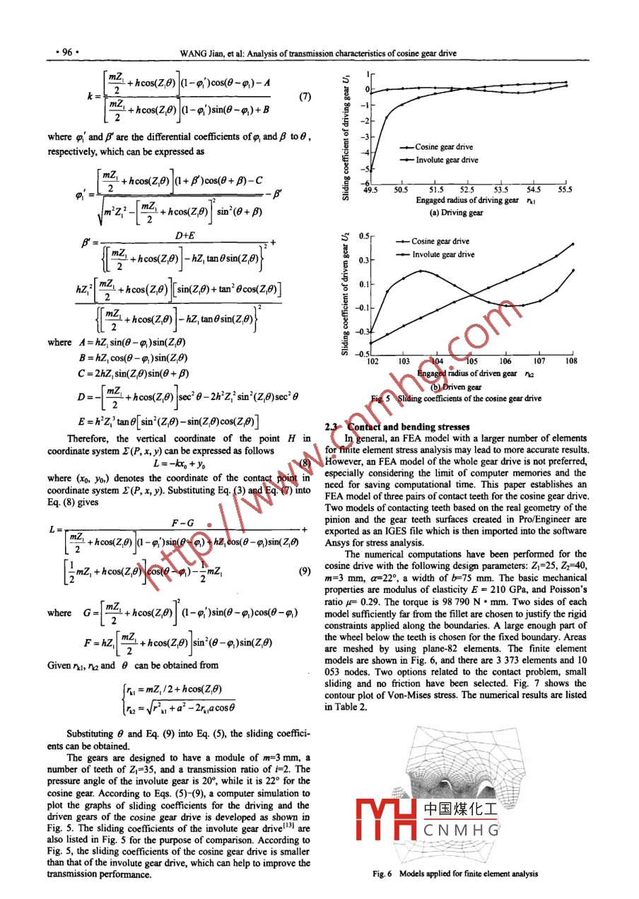 CHINESE JOURNAL OF MECHANICAL ENGINEERING●94 ●Vol.2I, No. 3, 2008ANALYSIS OF TRANSMISSIONWANG JianCHARACTERISTICS OF COSINELUO ShanmingGEAR DRIVE*CHEN LifengCHEN Lei北the contact atio. thesliding coffcient,andthe contact and bending steses. ofthis dniveareanvgzedAcomnarison shuadwofthese charaeteristieswithethe involuteeardriveisalsocariedoutHU HuarongThe influences of design parameters including the number of teeth and the pressure angle on theSchool of Electromechanical Engineering,contact and bending stresses are studied. The following conclusions are achieved: the contact ratio ofHunan Univerity of Sciencethe cosine gear drive is about 1.2 to 1.3, which is reduced by about 20% in comparison with that ofand Technology,the involute gear drive. The sliding coefficient of the cosine gear drive is smaler than that of theXiangtan 411201, Chinainvolute gear drive. The contact and bending stresses of the cosine gear drive are lower than those ofthe involute gear drive. The contact and bending stresses decrease with the growth of the number ofteeth and the pressure angle.Key words:Gear driveCosine profle Contact ratio Sliding coefficient Stresscharacteristics, including contact ratio, sliding coefficient, contact?INTRODUCTIONand bending stresses, of the cosine gear drive are analyzed, and acomparison study of these characteristics with the involute gearCurrently, the involute, the circular are and the cycloiddrive is also carried out. The influences of design parameters,profiles are three types of tooth profiles that are widely used in theincluding the number of teeth and the pressure angle, on contactgear design'". All of these gears used in different fields due toand bending stresses are studied. Finally, a conclusion summarytheir different advantages and disadvantages. With theof this study is given in section 3.development of computerized numerical control (CNC)technology, a large amount of literature is presented ininvestigations onhanisms and methodstooth profilegeneration. ARIGA, et al4, used a cutter with combinedcircular -arc and involute tooth profiles to generate a new type ofWildhaber-Novikov gear. This particular tooth profile can solvethe problem of conventional W-N gear profile, that is, the profilesensitivity to centre distance variations. TSAY, et alb), studied ahelical gear drive whose profiles consist of involute anccircular-arc. Tbe tooth surfaces of this gearing contact with eachatever yy instant at a point instead of a line. KOMORI, et aM',(a) Cosine gear(b) lnvolute geardeveloped a gear with logic tooth profiles which have zero relativeFig 1 Cosine gear and involue gearcurvature at many contact points. The gear has higher durability andstrength than involute gear. ZHAO, et als, introduced thegeneration process of a micro segment gear. ZHANG, et al,1 MATHEMATICAL MODEL OF tHE COSINEpresented a double involute gear. The tooth profile of the gearGEAR DRIVEconsists of two involute curves, which are 1inked by a transitioncurve and form the ladder shape of tooth.According to Ref. [8], the equation of the cosine tooth profile,LUO, et al", presented a cosine gear drive, which takes the the conjugate tooth profile and the line of action can be expressedzero line of cosine curvee as the pitch circle, a peniiod of the cure as fllwsas a tooth space, and the amplitude of the curve as the toothaddendum. As shown in Fig. 1, the cosine tooth profile appears[ x =[mZ,12+ hcos(Z0)]sin0very close to the involute tooth profile in the area near or above只=[mZ,/2+ hcos(Z,)]cosθ(1)the pitch circle, i.e, the part of addendum. However, in area ofdedendum, the tooth thickness of cosine gear is greater than thatof involute gear.| x =[mZ/12+ hos<(Z.)]sin+ asinThe mathermatical models, including the equation of thecosine tooth profile, the equation of the conjugate tooth profile(2)and the equation of the line of actin, have been established basedp =[mZ/2+ ho.IC.-asnoon the meshing theory, The solid model of cosine gear has beenbuilt, and the meshing simulation of this drive has also beeninvestigated8l. The aim of this work is to analyze the[x =[mZ.12+ hcos(Z0)]sin(0 -q)characteristics of the cosine gear drive. The remainder i(3)organized in three sections. In section 1, the mathematical modelsq)- mZ12中國煤化工,of the cosine gear drive are introduced. In section 2, the where rI the number of teeth,respecti:MHC N M H Genote the contat●Tbis project is supprted by National Natural Science Foundation of Chinaand the center dlstance, respecuvely, 0 is the rotation angleNo 50575071), Narural Science Foundatio ofHunan Povince, China (No. relative to system i(O,期川) as shown in Fig.2.β is the angle01J1000 S&T Programs of Hunan Province, China (No. 2007FJ4047),between x-axis and the tangent of any point on the cosine profile,and Program for New Century Excellent Talents in University, China. φ1 is the rotational angle of gear 1 which can be given as followsReceived June 20, 2007; recived in revised from March 19, 2008; acpiedApril 10, 2008CHINESE JOURNAL OF MECHANICAL ENGINEERING|o = arcsin, [mZ.12+ hcos(Z0)sin(0+f) _ BThree examples as shown in Table 1 have been caried out byusing program Matlab. The contact ratios of the involute gearmZ,12drives with the same parameters are also shown in Table 1 for the-mZ12 + hcos(Z9)]tanθ - hz, sin(Z.)purpose of comparison. According to Table 1, the contact ratio ofβ = arctan[mZ,/2+ hcos(Z,0)]- hZ, tanOsin(Z,)the cosine gear drive is about 1.2 to 1.3, which is about 20% lessthan that of the involute gear drive. According to Refs. [10-11],the contact ratio of gears applied in gear pump is about 1.1 to 1.3,therefore, such cosine gear drive can be applied in the field ofgear pump.2Table 1 Contact ratio of cosine gear driveTooth number Tooth number Modulus CosineInvolutem/mm__ gear drive__ gear drive_321-3641.6144012401.6772.2 Sliding cofficientSliding cofficient is a measure of the sliding action duringthe meshing cycle. A lower coefficient will have gr