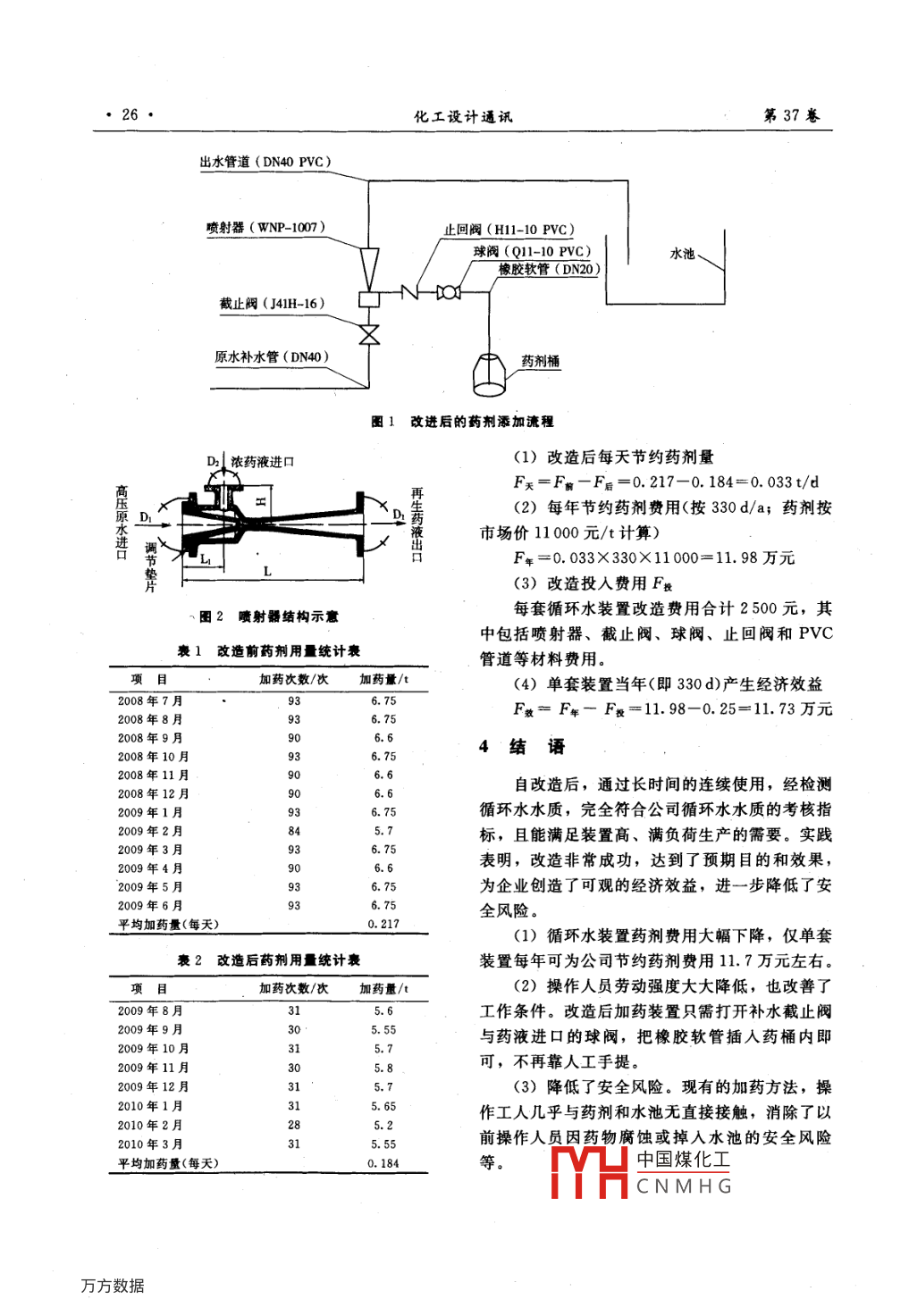 第37卷第6期化工設(shè)計通訊2011年12月Chemical Engineering Design Communications循環(huán)水加藥方法改進(jìn)張樅,金開(四川美豐化工股份有限公司化肥分公司,四川德陽618000摘要:循環(huán)水系統(tǒng)加藥方式改進(jìn)后,消除了原人工加藥的諸多不足,并帶來了良好的效益。關(guān)鍵詞:循環(huán)水;人工加藥;改進(jìn);效果中圖分類號:TQ085+,412文獻(xiàn)標(biāo)志碼:B文章編號:1003-6490(2011)06-002502Improvement of Dosing Method in Circulating Water SystemZHANG Yi, JIN Kai-jinFertilizer Branch Sichuan Meifeng Chemical Industry Co, Ltd, Deyang Sichuan 618000, China)Abstract: After dosing method is improved in circulating water system, shortcomings of artificialdosing are eliminated to have good resultsKey words: circulating water system; artificial dosing; improve; result0引言(3)安全風(fēng)險較大。循環(huán)水所加藥劑對人的皮膚及衣服等均有一定的腐蝕性,加藥時又靠近我公司現(xiàn)有五套循環(huán)水裝置,為公司的合成循環(huán)水池,加藥人員及藥劑桶有掉入池中的安全氨和尿素生產(chǎn)裝置提供優(yōu)質(zhì)、合格的循環(huán)水。循隱患等諸多問題。環(huán)水裝置藥劑的添加是通過人工(化工操作人員)手動添加實現(xiàn)的。據(jù)統(tǒng)計,正常滿負(fù)荷生產(chǎn)情況2改進(jìn)措施下,一套循環(huán)水裝置每天加緩蝕阻垢劑三次,共針對人工加藥存在的問題,我們對循環(huán)水藥計150kg;每5d加殺菌劑一次,共計350kg。劑添加方法作了如下改進(jìn)。人工加藥雖然能滿足裝置正常生產(chǎn)的需要,達(dá)到(1)在原水泵出口管線增設(shè)1根原水補水管水質(zhì)要求,但存在藥劑損失大、勞動強度大和具(DN40)和1只截止閥(J41H-16DN40),連接有較大安全風(fēng)險等隱患和諸多不足。因此,很有到噴射器(圖2)進(jìn)口端,噴射器出口端連接到循必要對藥劑添加的操作方法進(jìn)行改進(jìn)。環(huán)水池上一貯槽內(nèi),通過一節(jié)流閥緩慢流入循環(huán)水池。1人工加藥的弊端(2)在噴射器負(fù)壓端接入止回閥、閥門(球(1)加藥不均勻,藥劑損失大。人工手動加閥),再通過橡膠軟管(DN20)連接到藥劑桶,流藥是把藥劑桶提到加藥處,一次性添加,有時藥程見圖1。劑添加完畢尚未完全均勻混合時,剛好遇到循環(huán)(3)加藥時,開啟截止閥和球閥,即可利用水排污,大量藥劑被排出,造成藥劑損失,水質(zhì)流動的水流作為動力,實現(xiàn)抽負(fù)壓,將藥劑緩不達(dá)標(biāo),增大用藥量,藥劑費用高。慢、均勻地添加到循環(huán)水池中去。(2)操作工人勞動強度大。循環(huán)水加藥位置與藥劑存放位置有較遠(yuǎn)距離、較高的落差,藥劑3效益分析(一套循環(huán)水裝置)均為25kg塑料桶包裝,且循環(huán)水崗位化工操作我們對其中一套循環(huán)水裝置改造前后藥劑用人員多為女性,加藥極其不便量作了統(tǒng)計、分析和比較,詳見表1、2。M凵中國煤化工收稿日期:2011-06-28CNMHG作者簡介:張毅(1974-),男,四川闃中人,助理工程師,主要從事化工機械技術(shù)方面的工作26化工設(shè)計通訊第37卷出水管道(DN40PvC)噴射器(WNP-1007)上回閥(HIl10Pvc)/水球閥(Q截止閥(J41H-16)原水補水管(DN40)劑桶圖1改進(jìn)后的藥劑添加流程D濃藥液進(jìn)口(1)改造后每天節(jié)約藥劑量F天=F前一F后=0.217-0.184=0.033t/d(2)每年節(jié)約藥劑費用(按330d/a;藥劑按水市場價11000元/t計算)調(diào)節(jié)墊片F(xiàn)年=0.033×330×11000=11.98方元(3)改造投入費用F投圖2噴射器結(jié)構(gòu)示意每套循環(huán)水裝置改造費用合計2500元,其中包括噴射器、截止閥、球閥、止回閥和PVC衰1改造前藥劑用量統(tǒng)計衰管道等材料費用。項目加藥次數(shù)/次加藥量/t(4)單套裝置當(dāng)年(即330d)產(chǎn)生經(jīng)濟效益2008年7月6.752008年8月6.75F效=F年一F投=11.98-0.25=11.73萬元2008年9月2008年106.754結(jié)語2008年11月2008年12月年1月8809093889986.6自改造后,通過長時間的連續(xù)使用,經(jīng)檢測循環(huán)水水質(zhì),完全符合公司循環(huán)水水質(zhì)的考核指2009年2月標(biāo),且能滿足裝置高、滿負(fù)荷生產(chǎn)的需要。實踐2009年3月6.75009年4月6.6表明,改造非常成功,達(dá)到了預(yù)期目的和效果2009年5月6.75為企業(yè)創(chuàng)造了可觀的經(jīng)濟效益,進(jìn)一步降低了安2009年6月6.75全風(fēng)險平均加藥量(每天)0.217(1)循環(huán)水裝置藥劑費用大幅下降,僅單套豪2改造后藥劑用量統(tǒng)計表裝置每年可為公司節(jié)約藥劑費用11.7萬元左右。項目加藥次數(shù)/次加藥量/t(2)操作人員勞動強度大大降低,也改善了2009年8月工作條件。改造后加藥裝置只需打開補水截止閥2009年9月與藥液進(jìn)口的球閥,把橡膠軟管插入藥桶內(nèi)即2009年10月5.72009年11月可,不再靠人工手提。年12(3)降低了安全風(fēng)險。現(xiàn)有的加藥方法,操2010年1月5.65作工人幾乎與藥劑和水池?zé)o直接接觸,消除了以2010年2月2010年3月前操作人員因藥物腐蝕或掉入水池的安全風(fēng)險平均加藥量(每天)0.18中國煤化工CNMHG
