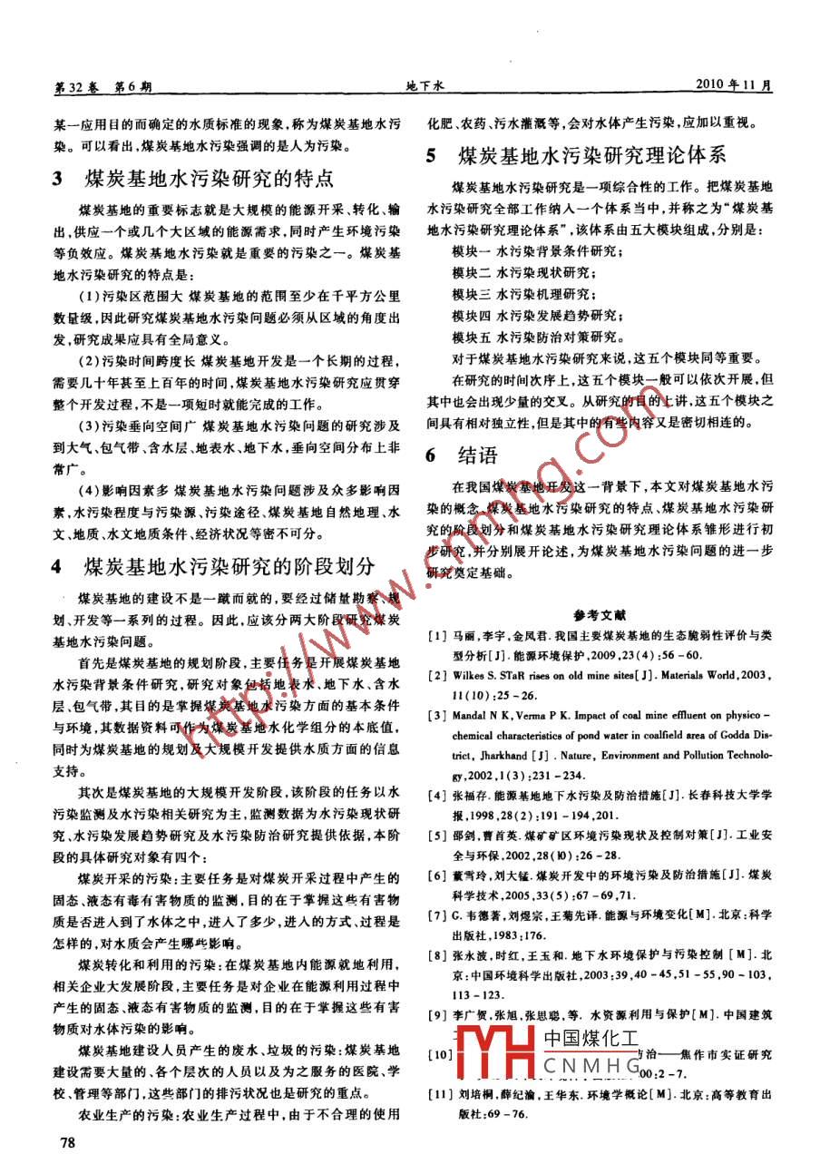 2010年11 月地下水Nov. ,2010第32卷第6期Ground waterVol.32 NO.6煤炭基地水污染研究馮建國(guó)',李云峰”,屈卉^ ,張茂省’(1.山東科技大學(xué)地質(zhì)科學(xué)與工程學(xué)院,山東青島266510;2.長(zhǎng)安大學(xué)環(huán)境科學(xué)與工程學(xué)院,陜西西安710054;3.西安地質(zhì)礦產(chǎn)研究所,陜西西安710054)[摘要]為提高煤炭的持續(xù)、穩(wěn)定供給能力,我國(guó)煤炭基地建設(shè)已經(jīng)啟動(dòng)。由以往國(guó)內(nèi)外煤炭開(kāi)發(fā)的經(jīng)驗(yàn)可知,煤炭基地的開(kāi)發(fā)建設(shè)過(guò)程中極有可能發(fā)生水污染問(wèn)題。在充分分析煤炭基地水污染相關(guān)問(wèn)題的基礎(chǔ)上,本文重點(diǎn)論述了煤炭基地水污染的概念、煤炭基地水污染研究的特點(diǎn)、煤炭基地水污染研究的階段劃分和煤炭基地水污染研究理論體系雛形,為相關(guān)問(wèn)題的進(jìn)一步研究奠定基礎(chǔ)。[關(guān)鍵詞] 煤炭基地;水污染;階段劃分;理論體系[中圖分類(lèi)號(hào)] X131.2[文獻(xiàn)標(biāo)識(shí)碼] A [文章編號(hào)] 1004 - 1184(2010)06 - 0076 -03Research on W ater Pollution in the Coal BaseFENG Jian - guo' ,LI Yun - feng ,QU Hui2 ,ZHANG Mao - sheng'(1. College of Geosciences and Technology, SUST, Qingdao266510, Shandong,2. College of environmental scienceand engineering, Chang an University, Xian710054, Shaanxi3. Xian Institute of Geology and Minerals Resources,Xian710054, Shaanxi)Absrtact: To improve sustainably and steadily supplying capacity, the coal base construction has been operated in Chi-na. According to some experience before at home and abroad, during the exploitation and utilization of the coal base construc-tion, it is very possible that the water pollution is existed. The article is based on the relative isue of fully analysis on waterpollution in the coal base and mainly discusses concept and studied characters, section division and the studied theory systemof water pollution in the coal base, laid the studied foundation futhermore.Keywords:The coal base, water pollution, section division and, theoretical system體規(guī)劃,建設(shè)大型煤炭基地,對(duì)維護(hù)國(guó)家能源安全、滿足經(jīng)濟(jì)1問(wèn)題的提出社會(huì)發(fā)展需要、調(diào)整和優(yōu)化煤炭生產(chǎn)結(jié)構(gòu)、促進(jìn)資源地區(qū)經(jīng)煤炭基地是我國(guó)對(duì)增強(qiáng)煤炭資源保障能力,在煤炭資源濟(jì)社會(huì)發(fā)展,具有十分重要的意義。相對(duì)富集的地區(qū),以大型煤埃企業(yè)為主體.綜合開(kāi)發(fā)煤炭及歷史經(jīng)驗(yàn)表明,在煤炭的開(kāi)發(fā)和利用過(guò)程中會(huì)不可避免共生或伴生資源,實(shí)現(xiàn)上下游產(chǎn)業(yè)聯(lián)營(yíng)和集聚,最終建成煤的出現(xiàn)水污染問(wèn)題12-6]。對(duì)于大型煤炭基地而言,煤炭生產(chǎn)炭調(diào)出、電力供應(yīng)、煤化工和資源綜合利用基地。2006集中、煤炭利用集中,水污染問(wèn)題更應(yīng)該加以重視。在這樣年,國(guó)家發(fā)展改革委員會(huì)將位于內(nèi)蒙古和陜西的神東、陜西的背景和前提下.研究煤炭基地水污染問(wèn)題就顯得尤為迫切陜北陜西和甘肅黃隴(華亭)、山西晉北晉中.晉東、山東魯和重要,具有很強(qiáng)的理論價(jià)值和現(xiàn)實(shí)意義。西、安徽兩淮、河北冀中、河南、云貴、蒙東(東北)、寧夏寧東2煤炭基地水污染的概念規(guī)劃建設(shè)為大型煤炭基地。這13個(gè)煤炭基地由98個(gè)礦區(qū)組成,分布在14個(gè)省,總面積287143km',煤炭保有儲(chǔ)量6908水污染問(wèn)題是一個(gè)包含范圍非常廣的問(wèn)題。由于地下水億t,占全國(guó)煤炎儲(chǔ)量的70%。和地表水之間往往存在比較密切的水力聯(lián)系.而煤炭蔫地開(kāi)2007年11月國(guó)家發(fā)展和改革委員會(huì)發(fā)布《煤炭產(chǎn)業(yè)政發(fā)有可能造成地下水和地表水的同時(shí)污染。分析煤炭基地策》,明確陜北、神東、晉北等5個(gè)大型煤炭基地主要負(fù)責(zé)向水污染的概念,可以先從地下水污染的概念人手。華東、華北、東北供給煤炭,并作為“西電東送"北通道電煤基2.1地下水污染地,可適度提高生產(chǎn)和供應(yīng)能力。這是國(guó)家對(duì)煤礦建設(shè)的總關(guān)于“地下水污染”的涵義,在現(xiàn)有的國(guó)內(nèi)外文獻(xiàn)中有多中國(guó)煤化工[收稿日期] 2010-08 -02[基金項(xiàng)目]山東科技大學(xué)科學(xué)研究'春蕾計(jì)劃'項(xiàng)月,編號(hào)“200.MHC N M H G調(diào)查局國(guó)土資源大調(diào)查項(xiàng)目"陜北能源基地地下水勘察”("中國(guó)地調(diào)局項(xiàng)目編號(hào)1212010535207" )貸助。[作者簡(jiǎn)介]馮建國(guó)(1976- -),男,河北盧龍人,工學(xué)博士,主要從事水文學(xué)及水資源方面的教學(xué)與研究工作。76第32卷第6期地下水2010年11月種多樣的提法,至今還沒(méi)有公認(rèn)的定義17-10]。然的影響的確是巨大的,而且是迅速的.逐步加劇的,廢水、有些人認(rèn)為,要對(duì)地下水污染下一個(gè)切合實(shí)際的定義就.廢氣、廢渣無(wú)時(shí)無(wú)刻不在產(chǎn)生和排放(堆放)。另一方面,自必須涉及到水質(zhì)標(biāo)準(zhǔn)問(wèn)題。德國(guó)教授馬瑟斯( C. Mathess,,然界的一 些現(xiàn)象和地球的活動(dòng)也會(huì)造成-些污染,如地震導(dǎo)1960)提出如下的定義:所謂污染地下水是指地下水由于人通優(yōu)質(zhì)水 含水層和劣
