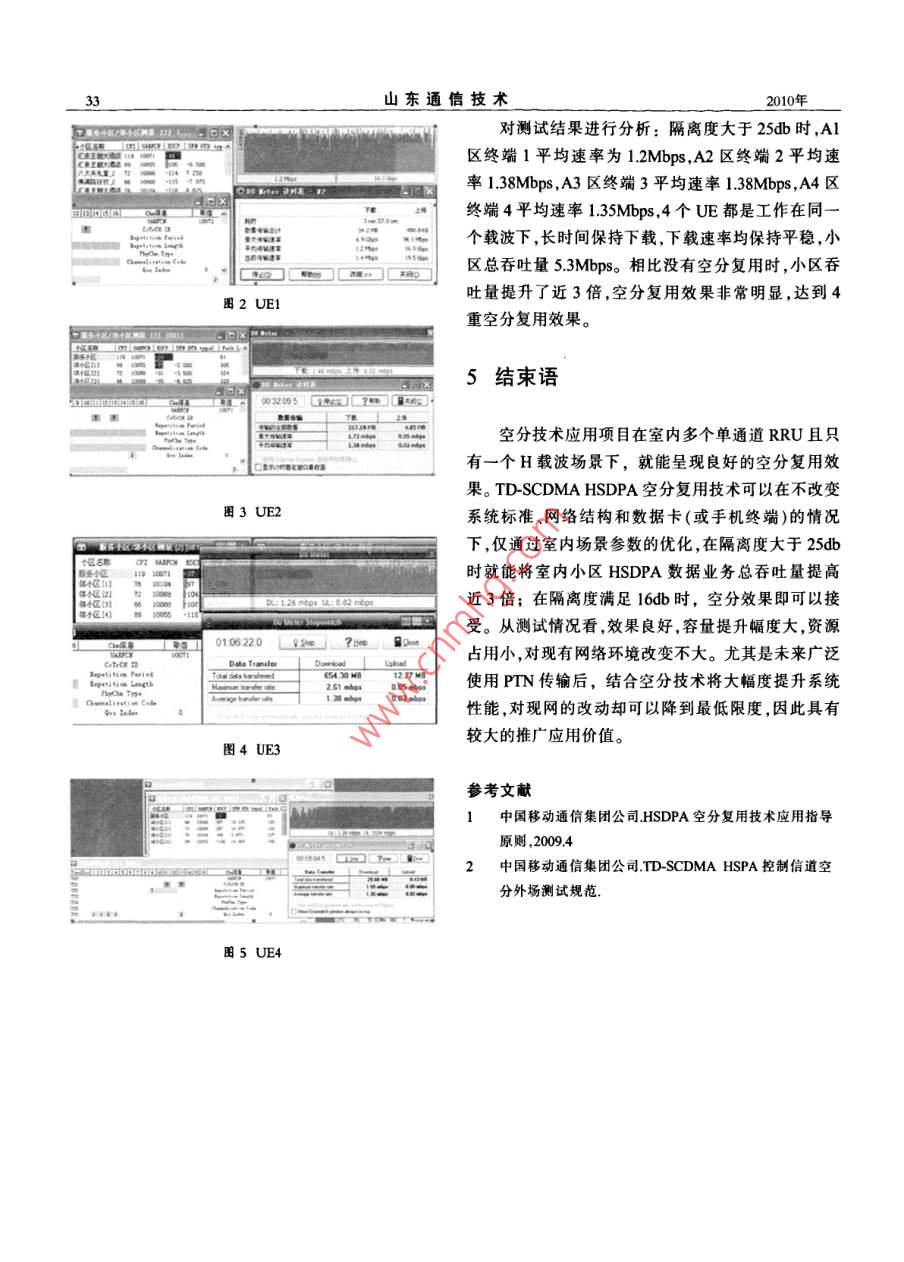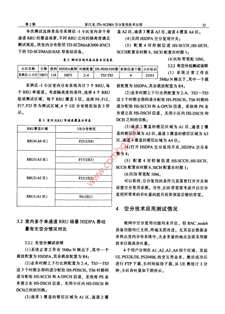 第30卷第2期山東通信技術(shù)Vol 30 No.22010年6月handong Communication TechnologyJun.2010TD-SCDMA空分復(fù)用技術(shù)應(yīng)用彭江龍(中國移動山東公司青島分公司,青島266071)要:本應(yīng)用主要是驗證TD- SCDMA HSDPA四重空分復(fù)用技術(shù)在室內(nèi)單通道多RRU覆蓋的場景下可以獲得的容量提升效果,以及該技術(shù)的適用場景和對現(xiàn)網(wǎng)性能的影響。關(guān)鍵詞:TD- SCDMA空分復(fù)用1引言商務(wù)寫字樓、高檔酒店和住宅小區(qū)等空間隔離度較好的室內(nèi)場景,開啟空分復(fù)用功能,可以對不同的鑒于目前 TD-SCDMA數(shù)據(jù)上網(wǎng)卡用戶發(fā)展迅樓層使用不同的通道進行覆蓋如圖1所示,利用室速、流量屢創(chuàng)新高的情況怎樣在有限的資源條件下內(nèi)樓板構(gòu)成用戶間天然的隔離,容易進行無線時隙容納更多的用戶數(shù)量,或在同樣的資源和用戶數(shù)下,碼道的資源復(fù)用,可以明顯提高 HSDPA小區(qū)總吞吐提高用戶的速率和感知度,是擺在我們面前的一項艱量。巨任務(wù)。因此,我們要盡可能地在不改變現(xiàn)網(wǎng)條件的基礎(chǔ)上,提高單用戶的速率質(zhì)天線在現(xiàn)網(wǎng)環(huán)境中進行 TD-SCDMA空分復(fù)用技術(shù)試驗,首先可以應(yīng)用在高層建筑室內(nèi)這對青島高層林立的環(huán)境和用戶分布的實際情況而言是迫切需要的。另一方面隨著傳輸網(wǎng)絡(luò)的升級和PIN的引人,空分復(fù)用所需增加的傳輸資源條件已經(jīng)具備。因此,開展TD-SCDMA空分復(fù)用技術(shù)試驗勢在必行。圖1 HSDPA空分復(fù)用技術(shù)原理圖2 HSDPA空分復(fù)用技術(shù)原理3技術(shù)應(yīng)用方案HSDPA空分復(fù)用技術(shù)是利用空間隔離將用戶分31測試項目和測試地點選擇割構(gòu)成不同的通道,根據(jù)用戶在不同通道上的功率電平值,計算用戶間的隔離度,選擇隔離度足夠大的用表1空分復(fù)用測試項目戶進行無線時隙碼道的資源復(fù)用從而提高系統(tǒng)總標(biāo)題測試項目吞吐能力??辗謴?fù)用技術(shù)可以有效提高系統(tǒng)總的數(shù)據(jù)四重空分室內(nèi)多個單通道RU場景 HSDPA吞吐量(無空分)吞吐量,達到提高設(shè)備利用率保護投資的目的。復(fù)用測試室內(nèi)多個單通道RRU場景 HSDPA吞吐量(有空分)第2期彭江龍: TD-SCDMA空分復(fù)用技術(shù)應(yīng)用本次測試選擇青島市某酒店-1小區(qū)室內(nèi)多個單蓋A2區(qū),通道3覆蓋A3區(qū),通道4覆蓋A4區(qū);通道RRU的覆蓋場景,不同RRU之間的隔離度滿足(4)關(guān)閉 HSDPA空分復(fù)用開關(guān)測試規(guī)范。該室內(nèi)分布使用 TD-SCDMAR3000RNC3(5)配置4對控制信道 HS-SCCH, HS-SICH下的 TD-SCDMABl8AE型基站設(shè)備。SCCH配置在時隙6,SⅠCH配置在時隙1表2測試區(qū)城內(nèi)基站基本信息表(6)UB帶寬配10M。小區(qū)名稱主頻擾碼SPA載頻時隙配置 HS-PDS義H時隙教制信道個數(shù)小區(qū)標(biāo)322有空分后測試說明某酒店-1小區(qū)10071119100712:4TS3-TSS23551(1)系統(tǒng)正常工作在5MhzN頻點下,其中一個載某酒店-1小區(qū)室內(nèi)分布系統(tǒng)共計7個RRU,每波配置為 HSDPA,其余載波配置為R4;個RRU單通道??紤]隔離度的條件選擇4個RRU(2)業(yè)務(wù)時隙上下行比例配置為2:4。TS3~Ts5組成測試區(qū)域,每個RRU覆蓋3層。選擇F6、F12、這3個時隙全部碼道分配給 HS-PDSCH。TS6時隙碼F17F25作為測試區(qū)域,4個UE分布情況如表3所道分配給 HS-SCCH和A-DPCH信道,系統(tǒng)將PS業(yè)務(wù)建立在 HS-DSCH信道,關(guān)閉小區(qū)內(nèi) HS-DSCH和表3宣內(nèi)RRU單通道覆蓋分布表DCH之間的切換;RU覆蓋區(qū)域UE分布情況(3)通道1覆蓋的樓層區(qū)域為A1區(qū),通道2覆蓋的樓層區(qū)域為A2區(qū),通道3覆蓋的樓層區(qū)域為A3RRU4(A4區(qū))F25(UE4)區(qū),通道4覆蓋的樓層區(qū)域為A4區(qū);(4)打開 HSDPA空分復(fù)用開關(guān), HSDPA空分系數(shù)為4;RRU3(A3區(qū))FI7(UE3)(5)配置4對控制信道 HS-SCCH、 HS-SICH,SCCH配置在時隙6,SCH配置在時隙1;(6)IUB帶寬配10MRU2(A2區(qū))F12(UE2)可以看到,空分復(fù)用的條件只是需要打開開關(guān)和設(shè)置空分復(fù)用系數(shù)。另外,UB帶寬需考慮開啟空分RRUI(AI區(qū))F6(UEl)復(fù)用所帶來的吞吐量的提升而要預(yù)留足夠的帶寬。4空分技術(shù)應(yīng)用測試情況32室內(nèi)多個單通道RRU場景 HSDPA春吐現(xiàn)網(wǎng)中空分復(fù)用功能均未開啟,但RNC、ndeb量有無空分情況對比設(shè)備功能均已支持,終端無需改進。尤其是在數(shù)據(jù)業(yè)務(wù)熱點室內(nèi)分布系統(tǒng)中,大業(yè)務(wù)量的地點急需采用新3.21無空分測試說明技術(shù)以提高吞吐量。(1)系統(tǒng)正常工作在5MhzN頻點下,其中一個4個用戶分別在A1、A2、A3、A4四個區(qū)域,發(fā)起載波配置為 HSDPA,其余載波配置為R4;ULPS32 K/DL PS2048K的交互類業(yè)務(wù),激活成功后2)業(yè)務(wù)時隙上下行比例配置為2:4。TS3~TS5進行FTP下載,長時間保持下載,從UE側(cè)統(tǒng)計3分這3個時隙全部碼道分配給 HS-PDSCH。TS6時隙碼鐘,小區(qū)吞吐量如下圖所示。道分配給 HS-SCCH和 A-DPCH信道,系統(tǒng)將PS業(yè)務(wù)建立在 HS-DSCH信道,關(guān)閉小區(qū)內(nèi) HS-DSCH和DCH之間的切換;(3)通道1覆蓋的樓層區(qū)域為A1區(qū),通道2覆山東通信技術(shù)對測試結(jié)果進行分析:隔離度大于25b時,A1區(qū)終端1平均速率為1Mbps,A區(qū)終端2平均速率138Mbps,A3