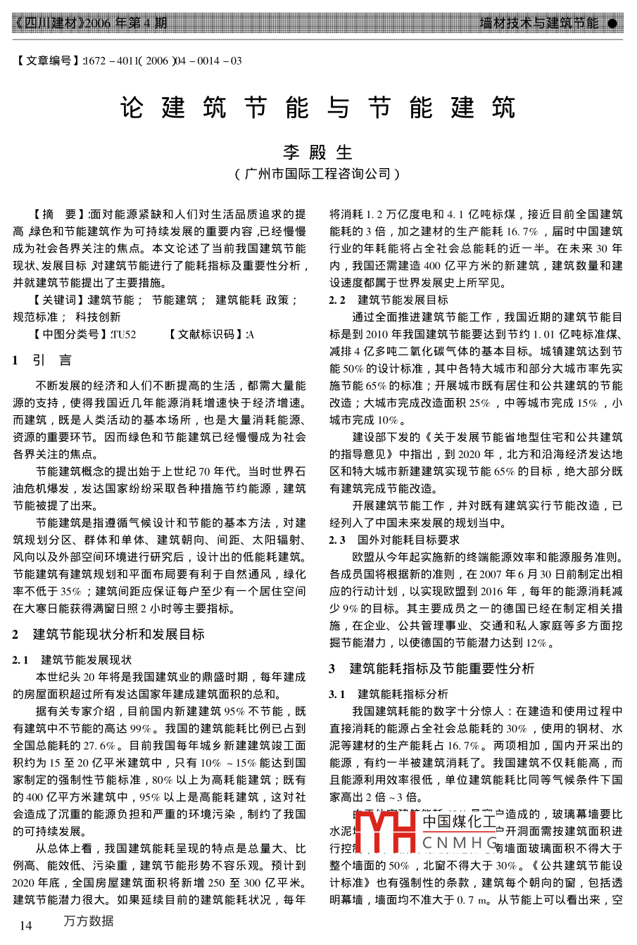 四建材》206第期「「「「「「「「「「材技術(shù)后建筑節(jié)能●l【文章編號】:672-4011(2006)4-0014-03論建筑節(jié)能與節(jié)能建筑李殿生廣州市國際工程咨詢公司)【摘要】湎對能源緊缺和人們對生活品質(zhì)追求的提將消耗1.2萬億度電和4.1億噸標(biāo)煤,接近目前全囯建筑高綠色和節(jié)能建筑作為可持續(xù)發(fā)展的重要內(nèi)容,已經(jīng)慢慢能耗的3倍,加之建材的生產(chǎn)能耗16.7%,屆時中國建筑成為社會各界關(guān)注的焦點。本文論述了當(dāng)前我國建筑節(jié)能行業(yè)的年耗能將占全社會總能耗的近一半。在未來30年現(xiàn)狀、發(fā)展目標(biāo)對建筑節(jié)能進(jìn)行了能耗指標(biāo)及重要性分析,內(nèi),我國還需建造400億平方米的新建筑,建筑數(shù)量和建并就建筑節(jié)能提出了主要措施。設(shè)速度都屬于世界發(fā)展史上所罕見【關(guān)鍵詞】建筑節(jié)能;節(jié)能建筑;建筑能耗政策2.2建筑節(jié)能發(fā)展目標(biāo)規(guī)范標(biāo)準(zhǔn);科技創(chuàng)新通過全面推進(jìn)建筑節(jié)能工作,我國近期的建筑節(jié)能目【中圖分類號】U52【文獻(xiàn)標(biāo)識碼】標(biāo)是到2010年我國建筑節(jié)能要達(dá)到節(jié)約1.01億噸標(biāo)準(zhǔn)煤、1引言減排4億多噸二氧化碳?xì)怏w的基本目標(biāo)。城鎮(zhèn)建筑達(dá)到節(jié)能50%的設(shè)計標(biāo)準(zhǔn),其中各特大城市和部分大城市率先實不斷發(fā)展的經(jīng)濟和人們不斷提高的生活,都需大量能施節(jié)能65%的標(biāo)準(zhǔn);開展城市既有居住和公共建筑的節(jié)能源的支持,使得我國近幾年能源消耗增速快于經(jīng)濟增速。改造;大城市完成改造面積25%,中等城市完成15%,小而建筑,既是人類活動的基本場所,也是大量消耗能源、城市完成10%資源的重要環(huán)節(jié)。因而綠色和節(jié)能建筑已經(jīng)慢慢成為社會建設(shè)部下發(fā)的《關(guān)于發(fā)展節(jié)能省地型住宅和公共建筑各界關(guān)注的焦點的指導(dǎo)意見》中指出,到2020年,北方和沿海經(jīng)濟發(fā)達(dá)地節(jié)能建筑概念的提岀始于上世紀(jì)η年代。當(dāng)時世界石區(qū)和特大堿市新建建筑實現(xiàn)節(jié)能65%的目標(biāo),絕大部分既油危機爆發(fā),發(fā)達(dá)國家紛紛釆取各種措施節(jié)約能源,建筑有建筑完成節(jié)能改造。節(jié)能被提了出來。開展建筑節(jié)能工作,并對既有建筑實行節(jié)能改造,已節(jié)能建筑是指遵循氣候設(shè)計和節(jié)能的基本方法,對建經(jīng)列入了中國末來發(fā)展的規(guī)劃當(dāng)中。筑規(guī)劃分區(qū)、群體和單體、建筑朝向、間距、太陽輻射、2.3國外對能耗目標(biāo)要求風(fēng)向以及外部空間環(huán)境進(jìn)行研究后,設(shè)計出的低能耗建筑。歐盟從今年起實施新的終端能源效率和能源服務(wù)準(zhǔn)則。節(jié)能建筑有建筑規(guī)劃和平面布局要有利于自然通風(fēng),綠化各成員國將根據(jù)新的準(zhǔn)則,在2007年6月30日前制定出相率不低于35%;建筑間距應(yīng)保證毎戶至少有一個居住空間應(yīng)的行動計劃,以實現(xiàn)歐盟到2016年,毎年的能源消耗減在大寒日能獲得滿窗日照2小時等主要指標(biāo)。少9%的目標(biāo)。其主要成員之一的德國已經(jīng)在制定相關(guān)措2建筑節(jié)能現(xiàn)狀分析和發(fā)展目標(biāo)施,在企業(yè)、公共管理事業(yè)、交通和私人家庭等多方面挖掘節(jié)能潛力,以使德國的節(jié)能潛力達(dá)到12%。2.1建筑節(jié)能發(fā)展現(xiàn)狀本世紀(jì)頭20年將是我國建筑業(yè)的鼎盛時期,每年建成3建筑能耗指標(biāo)及節(jié)能重要性分析的房屋面積超過所有發(fā)達(dá)國家年建成建筑面積的總和。3.1建筑能耗指標(biāo)分析據(jù)有關(guān)專家介紹,目前國內(nèi)新建建筑95%不節(jié)能,既我國建筑耗能的數(shù)字十分驚人:在建造和使用過程中有建筑中不節(jié)能旳高達(dá)φ%。我國的建筑能耗比例已占到直接消耗旳能源占全社會總能耗的30%,使用的鋼材、水全國總能耗的27.6%。目前我國毎年城鄉(xiāng)新建建筑竣工面泥等建材的生產(chǎn)能耗占16.7%。兩項相加,國內(nèi)開采出的積約為15至20億平米建筑中,只有10%~15%能達(dá)到國能源,有約一半被建筑消耗了。我國建筑不僅耗能高,而家制定的強制性節(jié)能標(biāo)準(zhǔn),80%以上為高耗能建筑;既有且能源利用效率很低,單位建筑能耗比同等氣候條件下國的400億平方米建筑中,95%以上是高能耗建筑,這對社家高出2倍~3倍會造成了沉重的能源負(fù)擔(dān)和嚴(yán)重的環(huán)境污染,制約了我國水泥中國煤化工造成的,玻璃幕墻要比的可持續(xù)發(fā)展。開洞面需按建筑面積進(jìn)從總體上看,我國建筑能耗呈現(xiàn)的特點是總量大、比行控CNMH(墻面玻璃面積不得大于例高、能效低、污染重,建筑節(jié)能形勢不容樂觀。預(yù)計到整個墻面的50%,北窗不得大于30%?!豆步ㄖ?jié)能設(shè)2020年底,全國房屋建筑面積將新增250至300億平米。計標(biāo)準(zhǔn)》也有強制性的條款,建筑毎個朝向的窗,包括透建筑節(jié)能潛力很大。如果延續(xù)目前的建筑能耗狀況,毎年明幕墻,墻面均不準(zhǔn)大于0.7m。從節(jié)能上可以看岀來,空材技術(shù)與建筑節(jié)能「「「「「「「「「「「「「「《四建材2606第期氣滲
