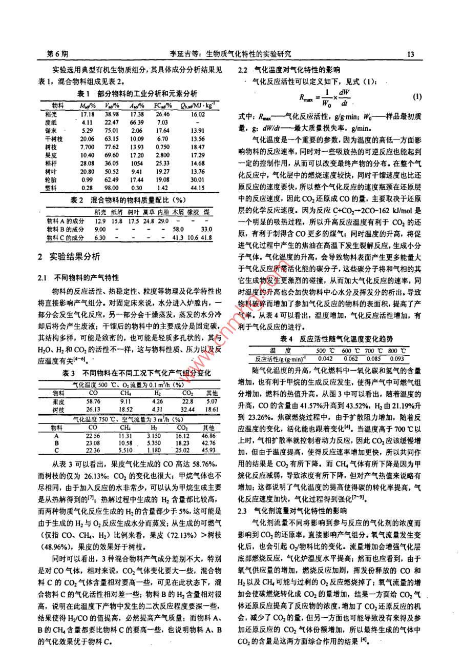 第23卷第6期電站系統(tǒng)工程VolL.23 No.62007年11月Power System Engineering12文章編號: 1005-006X(2007)06-0012-04生物質(zhì)氣化特性的實驗研究*李延吉'李潤東'李愛民’馮磊'姚偉'( 1.沈陽航空工業(yè)學院清潔能源遼寧省重點實驗室,2.大連理工大學動力工程系)摘要: 在小型固定氣化爐和中型氣化爐內(nèi)對典型生物質(zhì)進行氣化實驗,分別采用空氣、氧氣及水蒸氣作為氣化介質(zhì)。實驗分析了物料、氣化溫度、氣化劑及氣化劑流量等影喻因素發(fā)生變化時對氣化產(chǎn)氣特性的影響。研究表明,物料含可燃質(zhì)高時,產(chǎn)氣品位也好:隨著氣化溫度的升高,產(chǎn)氣中可燃氣含量增加;空氣作氣化劑時產(chǎn)氣的熱值低于氧氣作氣化劑時的產(chǎn)氣熱值;氣化劑的流量發(fā)生變化時,氣化產(chǎn)氣成分也相應改變。關鍵詞:生物質(zhì):氣化;產(chǎn)氣特性中圖分類號: TK16文獻標識碼: AExperimental Study on Characteristic of Biomass GasificationLI Yan-ji, LI Run-dong, LI Ai-min, et al.Abstract: Typical biomass gasification in pilot fixed and suffer type gasifier is studied using the air and oxygen andsteam as gasification medium respectively. When the factors, such as the material, gasification temperature, gasificationmedium and the flux of the gasification medium are changed, the infection to the gasifcation charaterstic is analyzed.The experimental results indicate when the flammable component in the material is high, the gas quality is good. Whenthe gasification temperature is increased, the fammable component in the gas is increased. The calorific power is lowerwhen using air as the gasification medium. When the fux of the gasification medium is changed, the gas component ischanged correspondingly.Key words: biomass; gasification; performance of production氣化是在氣化介質(zhì)的參與下,通過部分氧化或還原反應一3將有機原料轉化成為載能氣體的過程,它可以對廢物進行分解破壞,實現(xiàn)快速、顯著減容的同時可以實現(xiàn)資源化利用??缮镔|(zhì)氣化技術作為-項可再生能源利用技術,引起了國內(nèi)外學者的普遍重視。本文實驗基于自行設計的小型固定氣化爐和中型氣化爐(移動床),實驗用物料中混有生物質(zhì)、紙張、廢輪胎、橡膠等多種物料,為了研究與煤混合使用的效11果,也加入部分煤.影響有機固體廢棄物氣化特性的因素眾多,如爐型、氣化溫度、氣化劑、物料以及氣化劑/物料等,圖1生物質(zhì)固定床 氣化實驗系統(tǒng)圖把每種因素做詳細分析是不現(xiàn)實的。本實驗目的就是以不同1.物料2.固定床3.采樣裝置4煙邋5.電控裝置6.流量計7.減壓閥的混合物料在不同的氣化劑、氣化溫度、氣化劑流量條件下8.氧氣瓶9.導線10.熱電偶11.支架對氣化產(chǎn)氣組分的變化進行實驗性研究,從而得到規(guī)律性結論與數(shù)據(jù),可供實際工程應用參考1-5。1實驗實驗采用小型固定床批量實驗(見圖1)和中型規(guī)模移動床連續(xù)式氣化實驗(見圖2).氣體分析儀器使用島津公司生產(chǎn)的GC-14B 氣相色譜1儀。其工作條件為:熱導檢測器(TCD),載氣為熱導率較ie高的He氣,固定相為碳分子篩,流量為20 mU/min,初溫為130C,終溫180C,升溫速率5C/min,橋流為60mA,圖2生物質(zhì)中型移動床連續(xù)氣化實驗 系統(tǒng)裝置圖TCD溫度為180 C,檢測器溫度為180 C.1.風機2.閥門3.臧壓閥4.流量計5.氣化爐6.料斗7.絞龍收稿日期: 200704178.煙邋9.導線10熱電偶 11.集氣袋12.燃燒器13.引|風機李延吉(1974-).男,碩土,講師。沈陽,11003414.煙道15.煙道分析儀16.二次焚燒室17.電控箱18.電子秤*國家自然科學基金資助項目(50606028);遼寧省教育廳計劃項目19蒸汽發(fā)生器20.氧氣瓶(0SL323);學院自選課題(200614Y)第6期李延吉等:生物質(zhì)氣化特性的實驗研究13實驗選用典型有機生物質(zhì)組分,其具體成分分析結果見2.2氣化溫度對氣化特性的影響表1,混合物料組成見表2.氣化反應活性可以定義如下,見式(1);表1部分物料的工 業(yè)分析和元素分析Rma=Wxa(1)My'% V2w% Aw% FCW% Qx/MJ.kg稠殼17.18 38.98 17.38 26 4616.02式中: Rmx-氣化反應活性,g/gmin; Wo一樣 品最初質(zhì)廢紙4.11 22.47 66.39 7.035.29 75.01 2.06 17.6413.91量,g; dW/dt- - 最大質(zhì)量損失率,g/min.干樹枝20.06 63.15 10.09 6.7013.56氣化溫度是一個重要的參數(shù),因為溫度的高低-方面影樹枝7.700 77.62 13.93 0.7508.47響物料的反應速率,同時對一些吸放熱的可逆反應也能起到果皮10.40 69.60 17.20 2.8007.29稻稈28.08 36.05 1054 25 3314.68- -定的控制作用,從而可以改變最終產(chǎn)物的分布。在整個氣20.80 50.52 9.41 19273.76輪胎0.99 62.49 17.44 19.0830.0化反應中,氣化層中的燃燒速度較快,同時干餾速度也比還剪料3898.000.3014244.15原反應的速度要快,所以整個氣化反應的速度瓶頸在還原層表2混合 物料的物料質(zhì)量配比(%)中的反應速度,因此CO2還原成Co的量,主要取決于還原和殼紙居樹葉萬草內(nèi)胎木屑橡膠煤層的化學反應速度。因為反應C+C02-2C0-162 kJ/mol 是物料A的成分12.915.817.524.829.0-一個明顯的吸熱過程,所以升高反應溫度有利于CO2的還物料B的成分9.0058.0 33.0原,有利于制得含CO更多的煤氣;同時溫度的升高,將促物料C的成分6.30413 10.6 41.8進氣化過程中產(chǎn)生的焦油在高溫下發(fā)生裂解反應,生成小分2實驗結果分析子氣體。氣化溫度的升高,會導致物料表面產(chǎn)生更多能量大于氣化反應所需活化能的碳分子,這些碳分子將和氣相的其2.1不同物料的產(chǎn)氣特性它生成物發(fā)生更激烈的碰撞,