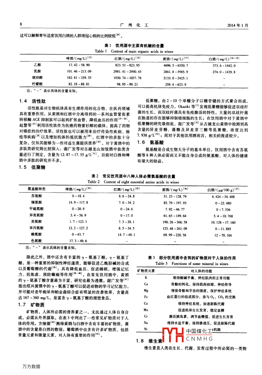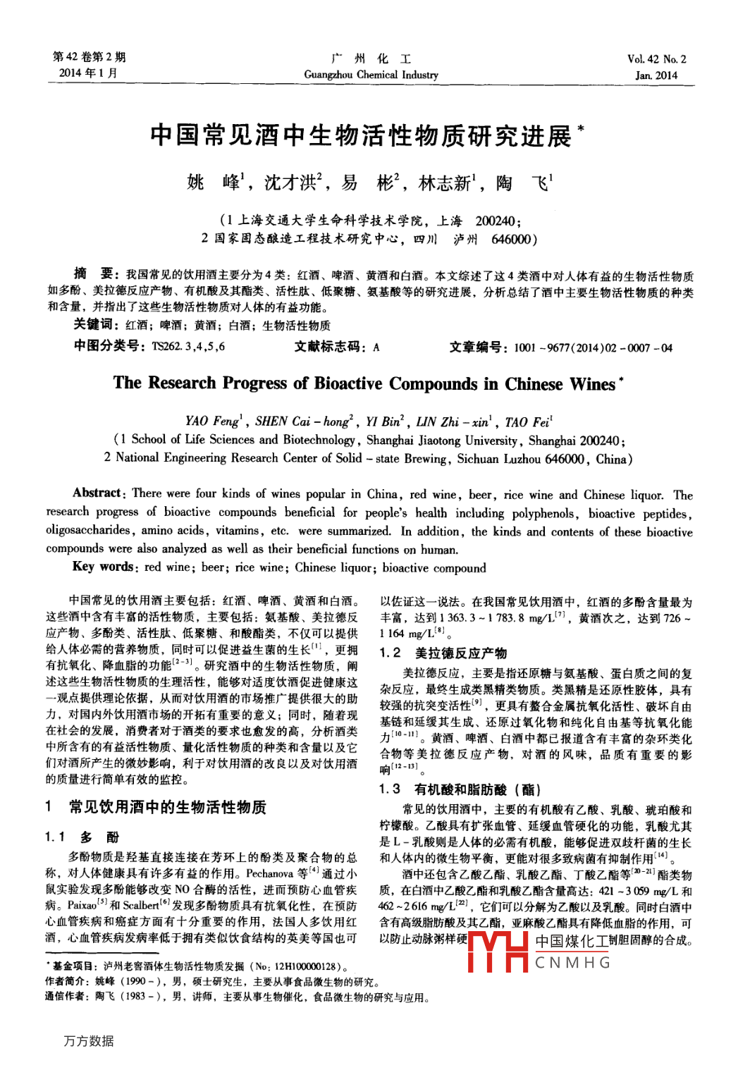 第42卷第2期廣州化工Vol. 42 No. 22014年1月Guangzhou Chemical IndustryJan.2014中國常見酒中生物活性物質研究進展姚峰,沈才洪2,易彬,林志新',陶飛1上海交通大學生命科學技術學院,上海2002402國家固態(tài)釀造工程技術研究中心,四川瀘州646000摘要:我國常見的飲用酒主要分為4類:紅酒、啤酒、黃酒和白酒。本文綜述了這4類酒中對人體有益的生物活性物質如多酚、美拉德反應產物、有機酸及其酯類、活性肽、低聚糖、氨基酸等的研究進展,分析總結了酒中主要生物活性物質的種類和含量,并指出了這些生物活性物質對人體的有益功能關鍵詞:紅酒;啤酒;黃酒;白酒;生物活性物質中圖分類號:TS262.3,4,5,6文獻標志碼:A文章編號:1001-96772014)02-0007-04The Research Progress of Bioactive Compounds in Chinese WinesYAO Feng, SHEN Cai-hong, YI Bin, LIN Zhi-xin, TAO Fe(1 School of Life Sciences and Biotechnology, Shanghai Jiaotong University, Shanghai 200240;National Engineering Research Center of Solid -state Brewing, Sichuan Luzhou 646000, China)Abstract: There were four kinds of wines popular in China, red wine, beer, rice wine and Chinese liquor.Theresearch progress of bioactive compounds beneficial for peoples health including polyphenols, bioactive peptidesoligosaccharides, amino acids, vitamins, etc. were summarized. In addition, the kinds and contents of these bioactivecompounds were also analyzed as well as their beneficial functions on humanKey words: red wine; beer; rice wine; Chinese liquor; bioactive compound中國常見的飲用酒主要包括:紅酒、啤酒、黃酒和白酒。以佐證這一說法。在我國常見飲用酒中,紅酒的多酚含量最為這些酒中含有豐富的活性物質,主要包括:氨基酸、美拉德反豐富,達到1363.3-1783.8mg/1”),黃酒次之,達到726應產物、多酚類、活性肽、低聚糖、和酸酯類,不僅可以提供1164mg/L。給人體必需的營養(yǎng)物質,同時可以促進益生菌的生長,更擁1.2美拉德反應產物有抗氧化、降血脂的功能12-。研究酒中的生物活性物質,闡美拉德反應,主要是指還原糖與氨基酸、蛋白質之間的復述這些生物活性物質的生理活性,能夠對適度飲酒促進健康這雜反應,最終生成類黑精類物質。類黑精是還原性膠體,具有觀點提供理論依據(jù),從而對飲用酒的市場推廣提供很大的助較強的抗突變活性,更具有螯合金屬抗氧化活性、破壞自由力,對國內外飲用酒市場的開拓有重要的意義;同時,隨著現(xiàn)基鏈和延緩其生成、還原過氧化物和純化自由基等抗氧化能在社會的發(fā)展,消費者對于酒類的要求也愈發(fā)的高,分析酒類力黃酒、啤酒、白酒中都已報道含有豐富的雜環(huán)類化中所含有的有益活性物質、量化活性物質的種類和含量以及它合物等美拉德反應產物,對酒的風味,品質有重要的影們對酒所產生的微妙影響,利于對飲用酒的改良以及對飲用酒響的質量進行簡單有效的監(jiān)控。1.3有機酸和脂肪酸(酯)1常見飲用酒中的生物活性物質常見的飲用酒中,主要的有機酸有乙酸、乳酸、琥珀酸和檸檬酸。乙酸具有擴張血管、延緩血管硬化的功能,乳酸尤其1.1多酚多酚物質是羥基直接連接在芳環(huán)上的酚類及聚合物的總和人體內的微生物平衡,更能對很多致病菌有抑制作用是L-乳酸則是人體的必需有機酸,能夠促進雙歧桿菌的生稱,對人體健康具有許多有益的作用。 Pechanova等通過小酒中還包含乙酸乙酯、乳酸乙酯、丁酸乙酯等2酯類物鼠實驗發(fā)現(xiàn)多酚能夠改變NO合酶的活性,進而預防心血管疾質,在白酒中乙酸乙酯和乳酸乙酯含量高達:421-3069mg/L和病。 Paixao0和 Scalbert發(fā)現(xiàn)多酚物質具有抗氧化性,在預防462-2616mg/2,它們可以分解為乙酸以及乳酸。同時白酒中心血管疾病和癌癥方面有十分重要的作用,法國人多飲用紅含有高級脂肪酸及其乙酯,亞麻酸乙酯具有降低血脂的作用,可酒,心血管疾病發(fā)病率低于擁有類似飲食結構的英美等國也可以防止動脈粥樣硬中國煤化工制膽固醇的合成基金項目:瀘州老窖酒體生物活性物質發(fā)掘(No:12H00028)。CNMHG作者簡介:姚峰(1990-),男,碩士研究生,主要從事食品微生物的研究通信作者:陶飛(1983-),男,講師,主要從事生物催化,食品微生物的研究與應用8廣州化工2014年1月這可以解釋常年適度飲用白酒的人群得冠心病的比例較低。表1飲用酒中主要有機酸的含量Table I Content of main organic acids in wines啤酒L)1酒/(mg/L)(l6黃酒/(mg/L){7白酒/(mg/L乙酸17.42-58.90823.51-823.95373.6~1442.0乳酸10l.46~213.092981.41-2990.452861.8~5985.9274.0-1439.8琥珀酸182.81-259331030.74~1037.762133.0~2425.1檸檬酸82.18-88.8198.95-99.21259.4-623.9注表示具體的含量未知1.4活性肽低聚糖,由2~10個單糖分子以糖苷鍵的方式聚合而成,活性肽是對生物機體具有生理作用的化合物,在醫(yī)藥領域可以提高機體免疫力, Okaziki等山發(fā)現(xiàn)低聚糖能夠促進雙歧桿具有重要作用,從黃酒和紅酒中分離得到的一系列血管緊張素菌的生長,而雙歧桿菌具有免疫激活的特性,大量的雙歧桿菌轉移酶ACE抑制肽可以起到擴張血管,降低血壓的作用22)。在腸道的存在能夠抑制癌細胞的生長;在飲用酒中對于黃酒中趙慧等利用活性肽作為抗癌藥物紫杉醇的載體,提高了藥物低驟糖的研究最徹底,謝廣發(fā)等從古越龍山黃酒中檢測到高對癌癥的治療效果?;钚噪囊部梢员挥脕碇委焸魅拘约膊?、痤含量的異麥芽糖、潘糖及異麥芽三糖等低聚糖,濃度達到瘡等疾病2以及增加機體的抵抗能力。紅酒中的多肽十