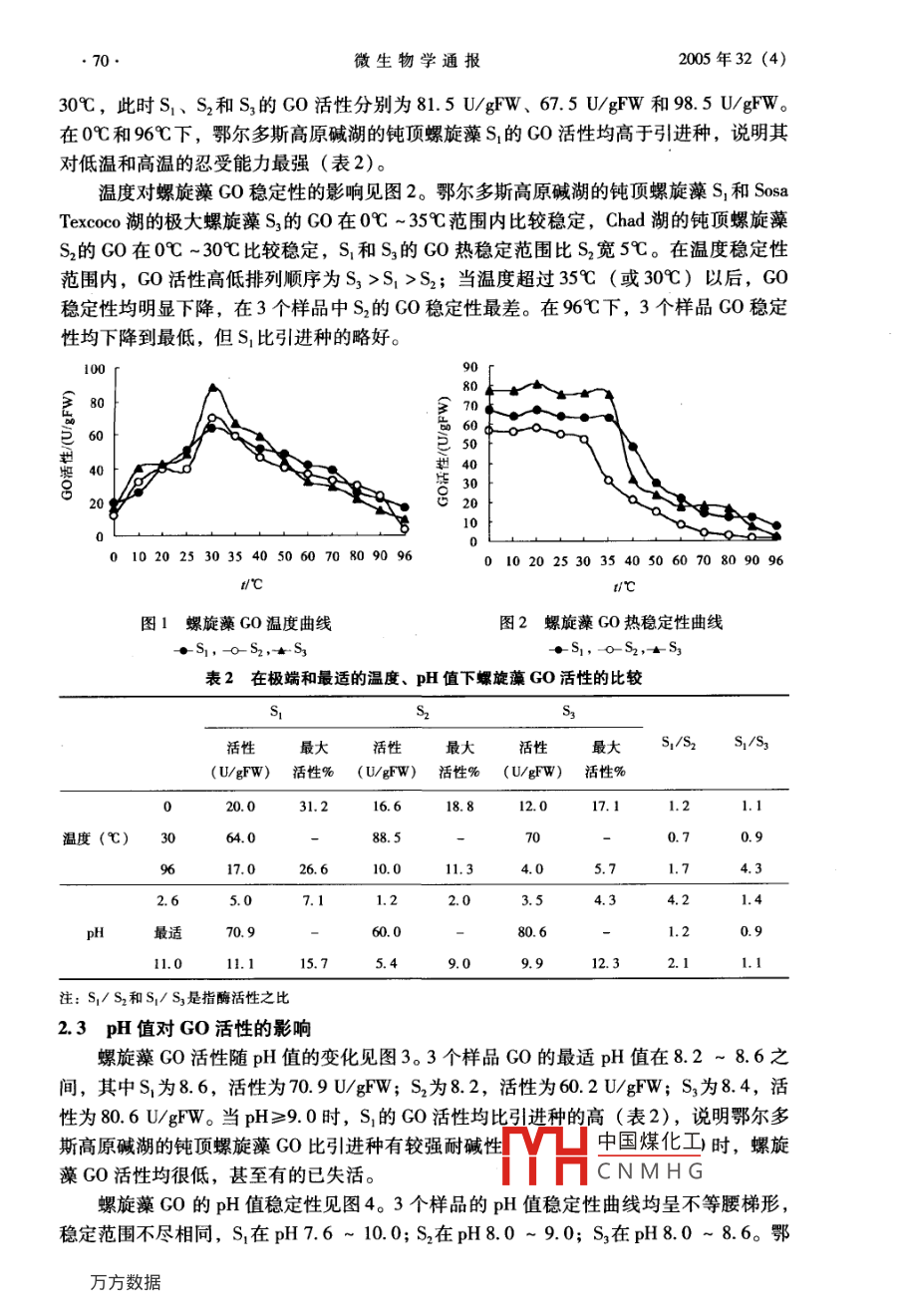 微生物學(xué)通報(bào)2005年32(4)螺旋藻乙醇酸氧化酶(GO)的研究王志忠鞏東輝劉華喬辰(內(nèi)蒙古農(nóng)業(yè)大學(xué)農(nóng)學(xué)院呼和浩特010019)摘要:采用比色法對(duì)鄂爾多斯高原堿湖的鈍頂螺旋藻(S)與國外引進(jìn)的鈍頂螺旋藻(S2)和極大螺旋藻(S3)的乙醇酸氧化酶(CO)進(jìn)行了比較研究。結(jié)果表明:在25℃、pH8.0條件下,S1、S2和S3的GO活性分別為70.9U/gFW、59.6U/gFW和80.9U/gFW;最適溫度均為30℃;在0℃~35℃(30℃)范圍內(nèi)比較穩(wěn)定;最適pH值分別為8.6、8.2和84;pH值穩(wěn)定范圍,S1為7.6-10.0、S2為8.0-9.0;S3為80-8.6。S1的GO對(duì)溫度和pH適應(yīng)范圍最寬,且在低溫、高溫、強(qiáng)酸和強(qiáng)堿下的活性均比引進(jìn)種的高。關(guān)鍵詞:螺旋藻,乙醇酸氧化酶,酶動(dòng)力學(xué),鄂爾多斯高原堿湖中圖分類號(hào):Q55.9文獻(xiàn)標(biāo)識(shí)碼:A文章編號(hào):0253-2654(2005)04006804Study on Glycolic Acid Oxidase(Go) of Spirulina(Arthrospira)WANG Zhi-Zhong GONG Dong-Hui LIU Hua QIAO ChenDepartment of Agronomy, Inner Mongolia Agricultural University, Huhehaote 010019)Abstract: A comparative study on the glycolic acid oxidase(Go)of the domestic Spirulina(Arthrospira) plat-ensis(S, )from alkaline lake in Erdos Plateau and the imported S.(A.)platensis(S2)and S.(A.)maxima(S3)as well is made with colorimetric method. The results show that activity of GO (25C, pH 8. 0)of S1, S2and S, is 70.9 U/gFW, 59.6 U/gFW and 80.9 U/gFW respectively: the GO,'s optimum temperature of $1, S2and S, is 30; the GOs optimum pH value of S, is 8. 6, while that of $28. 2 and that of sy 8.4; the Go of Syis stable from0℃to35℃ and from pH7.6topH10.0, while that of s2 from O℃to30℃ and from pH8.0topH 9.0 and that of S, from 0C to 35C and from pH 8.0 to pH 8. 6. Adaptive range of $, Go for temperatureand ph is wider, and activity at low and high temperature and under strong acidand alkali conditions is higherthan that of the imported species.Key words: Spirulina( Arthrospira), Glycolic acid oxidase(Go), Enzyme kinetics, Alkaline lake in Erdosplateau乙醇酸氧化酶( Glycolic acid oxidase,簡寫GO)(EC1.1.3.15)廣泛存在于光合生物中,是光呼吸代謝中的關(guān)鍵酶,其活性高低與光呼吸強(qiáng)弱呈正相關(guān)。研究證明光呼吸釋放的CO2約占C3植物凈光合速率所同化CO2的20%~50%2,這對(duì)植物的生長和干物質(zhì)積累都有很大的影響。因此,研究乙醇酸氧化酶無論是篩選低光呼吸品種,還是調(diào)控光呼吸代謝均具有重要意義。螺旋藻是一類光合放氧的絲狀藍(lán)藻,屬于C3植物。其富含優(yōu)質(zhì)蛋白(60%70%)和多種生物活性物質(zhì),是人們廣泛接受的功能性食品之一3。目前,有關(guān)螺旋藻生長和光合作用等研究較多,但酶的研究相對(duì)較中國煤化研究未見報(bào)國家自然科學(xué)基金項(xiàng)目(No.30460104)CNMHG內(nèi)蒙古自然科學(xué)基金項(xiàng)目(No9903034)通訊作者Tel:04716946216,E-mail:qiao-chen@sohu.com收稿日期:2004-10-13,修回日期:2004-12012005年32(4)微生物學(xué)通報(bào)道。本文以鄂爾多斯高原堿湖的鈍頂螺旋藻與國外引進(jìn)種為材料,對(duì)其乙醇酸氧化酶進(jìn)行了比較研究,一則豐富該地區(qū)螺旋藻種質(zhì)資源的基礎(chǔ)研究;二則為已初具規(guī)模的鄂爾多斯高原螺旋藻產(chǎn)業(yè)篩選低光呼吸品種提供理論依據(jù)。1材料與方法1.1材料實(shí)驗(yàn)材料見表1。表1實(shí)驗(yàn)材料一覽表樣品物種產(chǎn)地(來源)鈍頂螺旋藻鄂爾多斯高原巴彥淖爾堿湖Spirulina( Arthrospira) platensis(內(nèi)蒙古農(nóng)業(yè)大學(xué)鈍頂螺旋藻非洲Chad湖S.(A) platensis(南京大學(xué)生物科學(xué)與技術(shù)系)極大螺旋藻墨西哥 Sosa Texcod湖S.(A)maxima(南京大學(xué)生物科學(xué)與技術(shù)系)注:下文對(duì)應(yīng)樣品以此表為準(zhǔn)1.2方法1.2.1藻的培養(yǎng):采用 Zarrouk培養(yǎng)液在室溫自然光照下通氣培養(yǎng)。1.2.2粗酶液制備:準(zhǔn)確稱取處于對(duì)數(shù)生長期新鮮藻3g,置于預(yù)冷研缽中,加入少許pH8.0的磷酸緩沖液及石英砂,在冰浴中研磨成勻漿,離心5min(3,500r/min)取上清液定容至20mL備用。123Go活性測定:采用比色法,略有改動(dòng)。以△0.01A/min所需的酶量定義為一個(gè)酶活力單位(U)1.24溫度對(duì)GO影響:在0℃~96℃和pH8.0的0.1mo/L的磷酸緩沖液條件下分別測定酶活性,繪制酶活性-溫度曲線;將酶液在上述各溫度條件下保溫15min,后在25℃下測定酶活性,繪制酶穩(wěn)定性一溫度曲線。每個(gè)處理重復(fù)3次1.2.5pH值對(duì)GO影響:在pH2.6~120范圍內(nèi)分別測定酶活性,pH26~7.0用檸檬酸-磷酸緩沖液,pH7.6~9.0用硼酸-硼砂緩沖液,pH10.0~12.0用磷酸氫二鈉和NaOH調(diào)配成的,繪制酶活性-pH值曲線。將酶液在各相應(yīng)的pH條件下保溫15min,在25℃時(shí)測定酶活性,繪制酶穩(wěn)定性-pH曲線。每個(gè)處理重復(fù)3次。2結(jié)果與分析2.1螺旋藻GO活性在25℃、pH8.0時(shí), Sosa Texcoco湖的極大螺旋藻(S3)GO活性(80.9U/gFW)最高,鄂爾多斯高原堿湖的鈍頂螺旋藻(S1)活性(709UFW)居中,Chad湖的鈍頂螺旋藻(S2)活性(59.6U/gFW)最低,且中國煤化工co活性均低于極大螺旋藻。CNMHG2.2溫度對(duì)螺旋藻GO的影響溫度對(duì)螺旋藻GO活性的影響見圖1。螺旋藻GO活性呈鐘形曲線,最適溫度為微生物學(xué)通報(bào)2005年32(4)30℃,此時(shí)S1、S2和S3的GO活性分別為81.5U/gFW、67.5U/gFW和98.5U/gFW。在0℃和96℃下,鄂爾多斯高原堿湖的鈍頂螺旋藻S1的GO活性均髙于引進(jìn)種,說明其對(duì)低