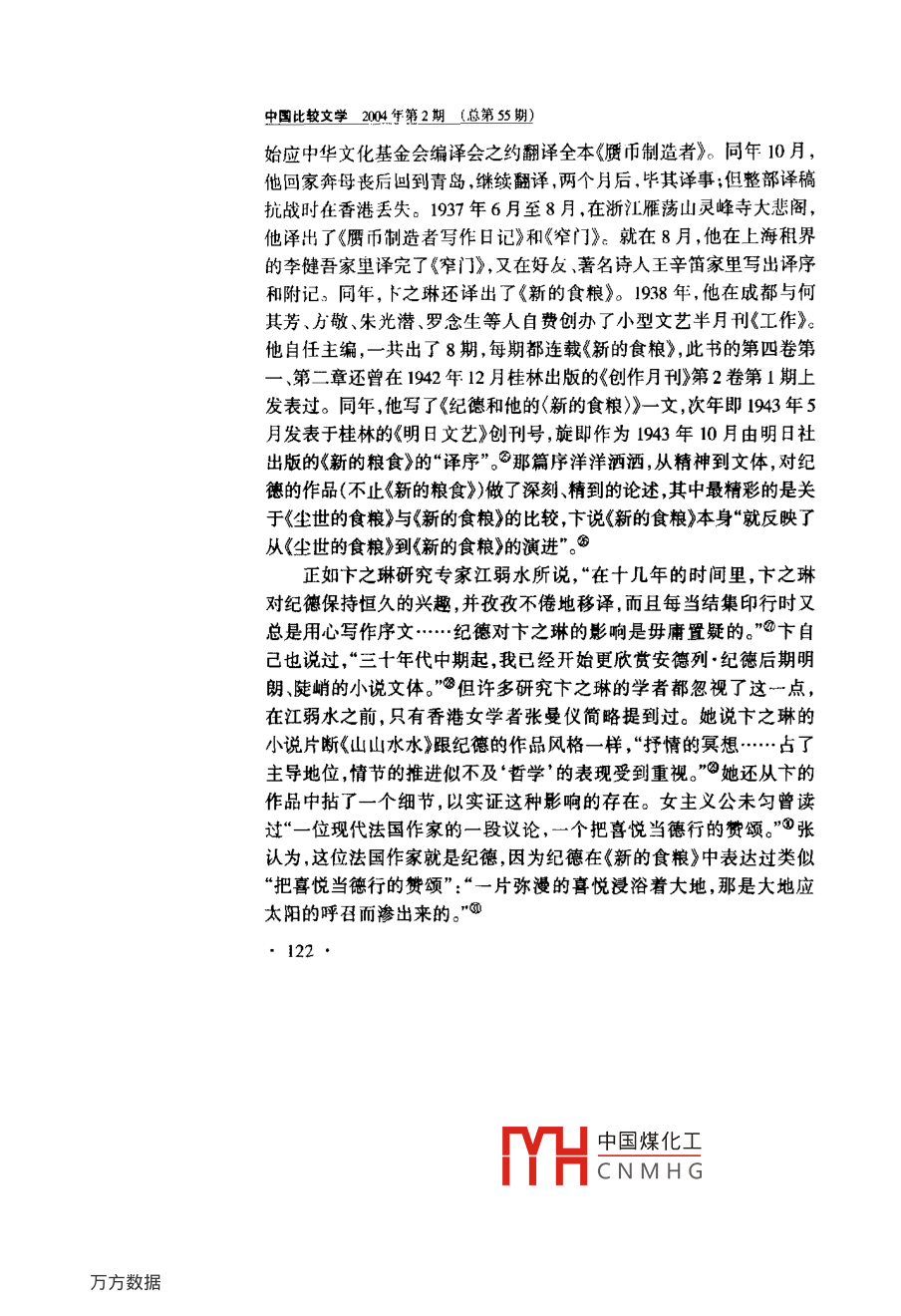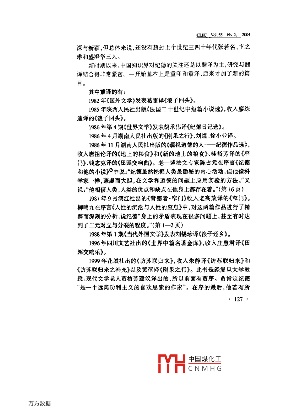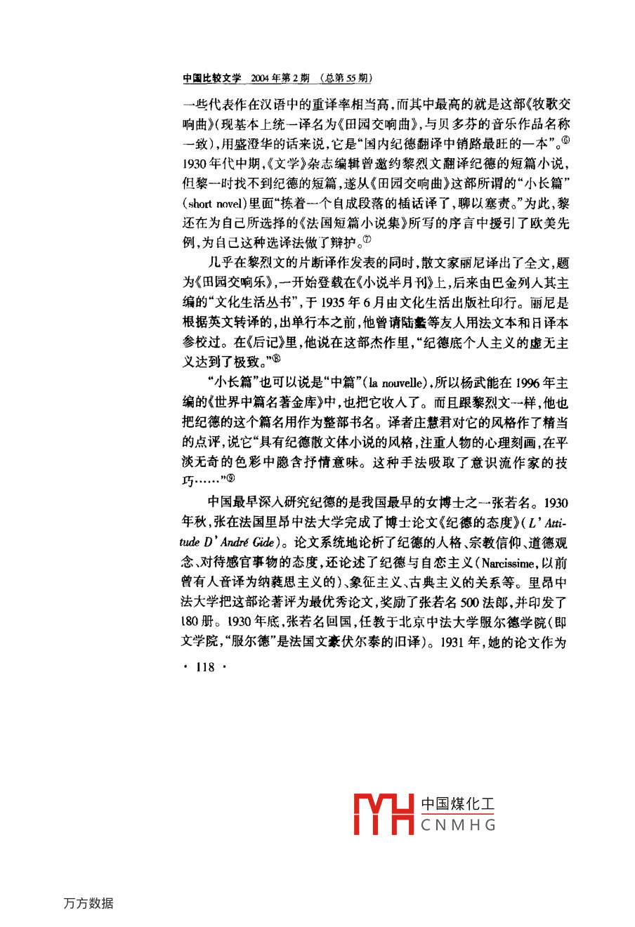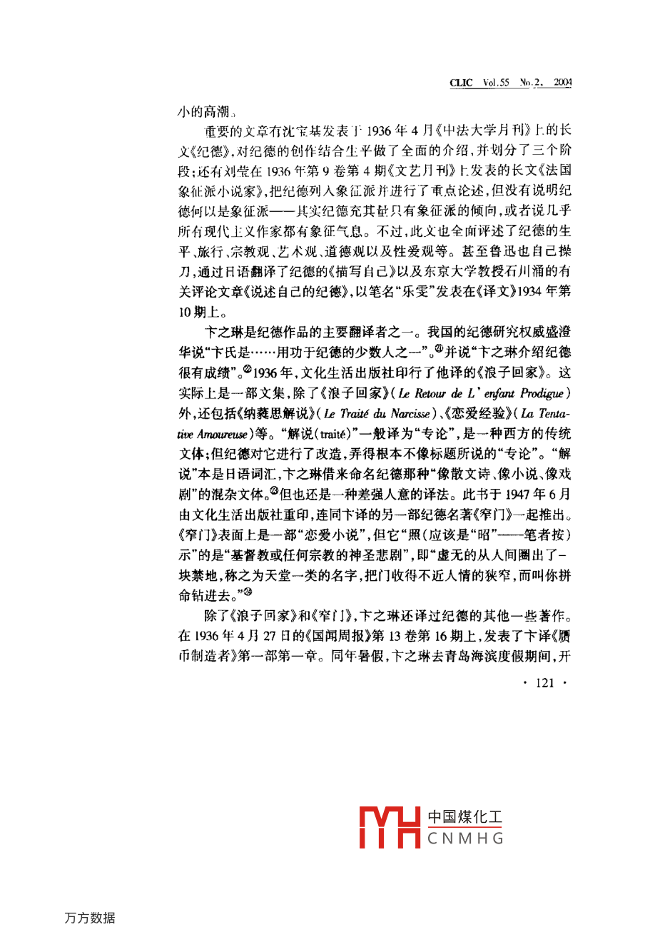 中國比較文學(xué)24年第2期(總第55期)紀(jì)德在中國北塔(中國現(xiàn)代文學(xué)館,北京100029)摘要:本文以詳實(shí)的資料,全面介紹了紀(jì)德在中國被介紹、翻譯和評論的實(shí)況,并進(jìn)行了一定的考辨。我國最早提到紀(jì)德的是趙景深,最早翻譯紀(jì)德的是穆木天解放前紀(jì)德的主要譯者是卞之琳和盛澄華,主要研究者是張若名和盛澄華。解放后,也許是因?yàn)榧o(jì)德的反蘇問題使人聯(lián)想到他的反共,所以國內(nèi)基本上不再有對他的譯介和研究;只有在1957年第9期的《譯丈》上有一篇完全否定他的文章。直到1982年思想解放之后,紀(jì)德才再次引起中國知識界的注意。至今,紀(jì)德在中國的形象和聲音有“愈演愈烈”之勢,主要表現(xiàn)在大量的翻譯上關(guān)鬟詞:紀(jì)德;中國;譯介Abstract: This article delivers an entire survey on the facts of the introduction, translationand comments of andre Cide in China with detailed data and certain argumentations. In Chinu, the first scholar mentioning gide was Zhao Jingshen, and the first translator of Gide wasMu Mutian. Before 1949, the main translators of Gide were Bian Zhilin and ShengChenghua, and the main researchers were Zhang Ruoming and Sheng Chenghua. Thereafterthere were few translation and study on gide perhaps because of his problem of anti-USSRwhich reminded people of his attitude of Anti- Communism at thut time, except an article seenin the 9th issue of the magazine "Translation", which denied him absolutely. Since: 1982after the new liberation of thought, Gide began to be noticed by Chinese elites once againNowadays, his image and voice have become more and more welcome, which mainly revealson a mass of translation and retranslation of his worksey words: Gide; China; trans旅法女學(xué)者金絲燕在談?wù)搹?917年到1949年之間中國對法國文l16中國煤化工CNMHGCCVo.55W2,2004學(xué)的接受狀況時(shí),曾列過個(gè)表格。我們從中可以看出,在那些年代里,中國對紀(jì)德作品的翻譯是相當(dāng)可觀的,達(dá)12篇,僅次于莫泊桑(39)、巴爾扎克(24)左拉(20)莫里哀(18)、羅曼·羅蘭(15)、雨果(14)等如雷貫耳的名字,超過福樓拜(6)、都德(5)、司湯達(dá)(4)、盧梭(3)、伏爾泰(3)等同樣耳熟能詳?shù)拿帧5c巴爾扎克、盧梭等大師相比,紀(jì)德在中國的名聲似乎還相當(dāng)小,甚至比福樓拜等人的還小?!霸谥袊o(jì)德好像是人們熟悉的作家,但實(shí)在乂并不熟悉,甚至可以說還很陌生?!边@是為何呢?讓我們從紀(jì)德來到中國的第一個(gè)腳步談起。早在1923年第14卷第1期《小說月報(bào)》上,在沈雁冰所寫的“法國文壇雜訊”中,紀(jì)德就在中國首度出場了,茅盾說他“頗為…般人所喜”。在這本著名文學(xué)雜志的1925年第20卷第9期中,趙景深寫了一篇短文《康拉特的后繼者紀(jì)德》。趙認(rèn)為,紀(jì)德《剛果旅行記》(Wyagau congo)“應(yīng)該放在康拉特異國情調(diào)小說的一起”實(shí)際上,《剛果旅行記》是一部游記,而不是小說;可見,趙在當(dāng)時(shí)根本沒有看過原文,只是私自揣測或人云亦云。趙文只是簡單的介紹而已,我國最早翻譯紀(jì)德的是穆木天。穆是1920年代著名的象征主義詩人,他精通法文,尤其熱衷于翻譯、模仿法國象征派作品。穆譯紀(jì)德小說《窄門》( La porte etoile)于1928年ll月由上海北新書局出版。據(jù)盛澄華說,穆很早就譯出了紀(jì)德的另一部名著《牧歌交響曲》( La symphonie Pastorale)°那大概是在1920年代和1930年代之交吧。此譯本于1936年也由北新書局出版,譯者署名為木天”。正如解放前的許多譯著一樣,此書沒有前言后記,完全是赤裸裸的作品本身,顯得很純凈。具有先進(jìn)意味的是,此書用的是從左到右的橫排法?!赌粮杞豁懬肥羌o(jì)德旅居英國時(shí)所寫的一部H記體故事。紀(jì)德的中國煤化工CNMHG中國比較文學(xué)2004年第2期(總第5期一些代表作在漢語中的重譯率相當(dāng)高,而其中最高的就是這部《牧歌交響曲》(現(xiàn)基本上統(tǒng)一譯名為《田園交響曲》,與貝多芬的音樂作品名稱一致),用盛澄華的話來說,它是“國內(nèi)紀(jì)德翻譯中銷路最旺的一本”。1930年代中期,《文學(xué)》雜志編輯曾邀約黎烈文翻譯紀(jì)德的短篇小說但黎一時(shí)找不到紀(jì)德的短篇,遂從《田園交響曲》這部所謂的“小長篇”( short novel)里面“棟著一個(gè)自成段落的插話譯了,聊以塞責(zé)。”為此,黎還在為自己所選擇的《法國短篇小說集》所寫的序言中援引了歐美先例,為自己這種選譯法做了辯護(hù)幾乎在黎烈文的片斷譯作發(fā)表的同時(shí)散文家麗尼譯出了全文,題為《田園交響樂》,一開始登載在《小說半月刊》上,后來由巴金列人其主編的“文化生活叢書”,于1935年6月由文化生活出版社印行。麗尼是根據(jù)英文轉(zhuǎn)譯的,出單行本之前,他曾請陸蠡等友人用法文本和日譯本參校過。在《后記》里,他說在這部杰作里,“紀(jì)德底個(gè)人主義的虛無主義達(dá)到了極致“小長篇”也可以說是“中篇”( la nouvelle),所以楊武能在199年主編的《世界中篇名著金庫》中,也把它收人了。而且跟黎烈文一樣,他也把紀(jì)德的這個(gè)篇名用作為整部書名。譯者莊慧君對它的風(fēng)格作了精當(dāng)?shù)狞c(diǎn)評,說它“具有紀(jì)德散文體小說的風(fēng)格,注重人物的心理刻畫,在平淡無奇的色彩中隱含抒情意味。這種手法吸取了意識流作家的技中國最早深入研究