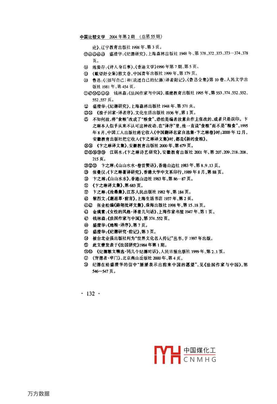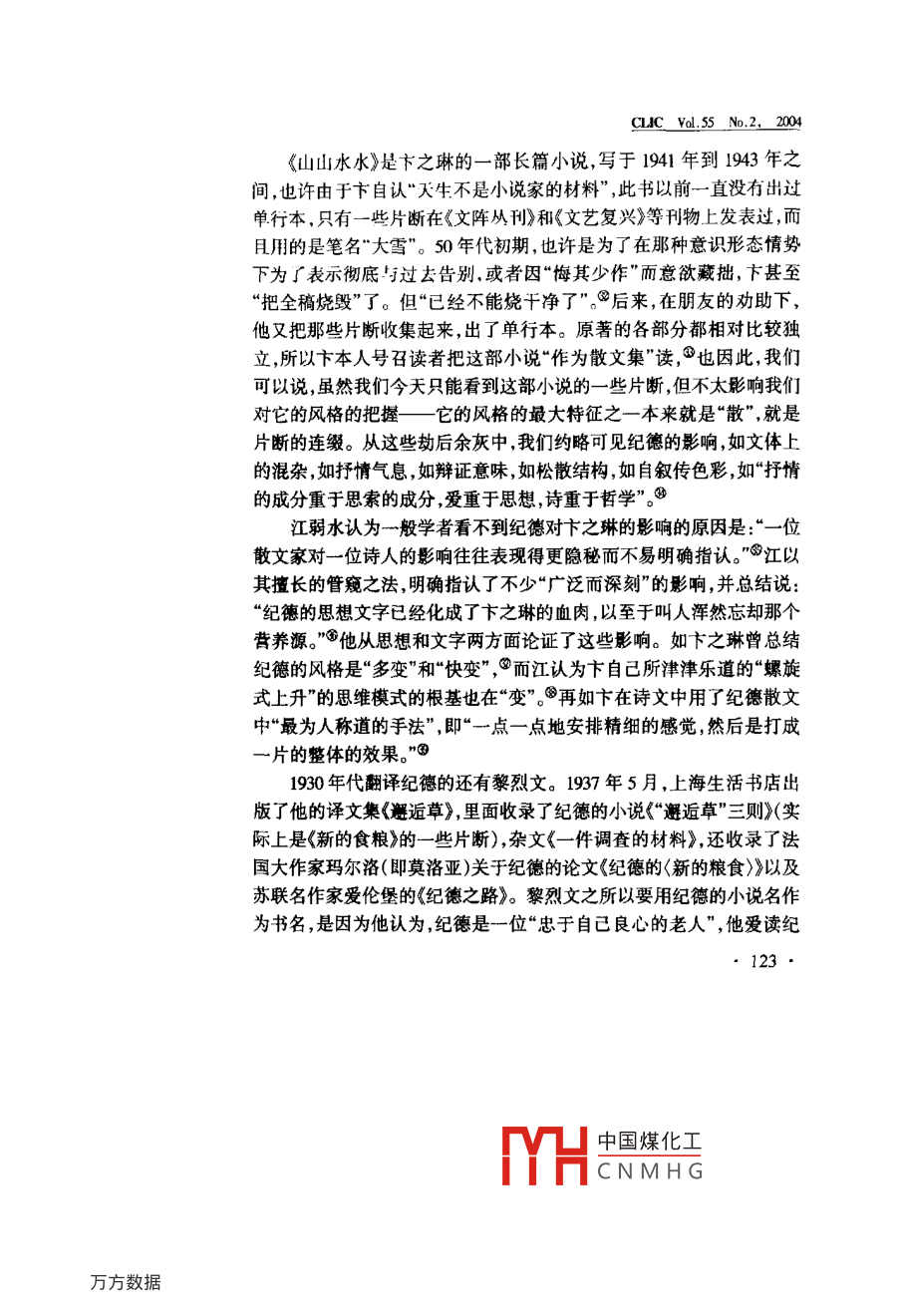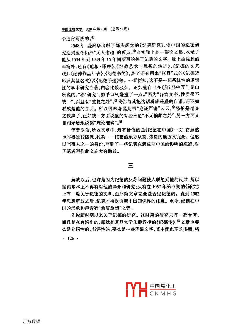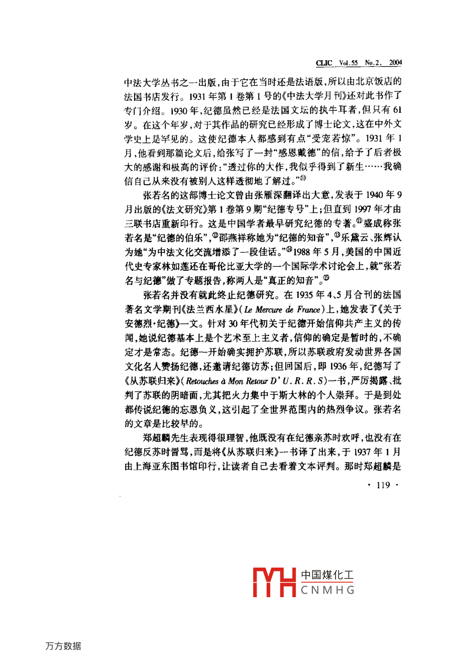 中國比較文學(xué)24年第2期(總第55期)紀(jì)德在中國北塔(中國現(xiàn)代文學(xué)館,北京100029)摘要:本文以詳實(shí)的資料,全面介紹了紀(jì)德在中國被介紹、翻譯和評論的實(shí)況,并進(jìn)行了一定的考辨。我國最早提到紀(jì)德的是趙景深,最早翻譯紀(jì)德的是穆木天解放前紀(jì)德的主要譯者是卞之琳和盛澄華,主要研究者是張若名和盛澄華。解放后,也許是因?yàn)榧o(jì)德的反蘇問題使人聯(lián)想到他的反共,所以國內(nèi)基本上不再有對他的譯介和研究;只有在1957年第9期的《譯丈》上有一篇完全否定他的文章。直到1982年思想解放之后,紀(jì)德才再次引起中國知識界的注意。至今,紀(jì)德在中國的形象和聲音有“愈演愈烈”之勢,主要表現(xiàn)在大量的翻譯上關(guān)鬟詞:紀(jì)德;中國;譯介Abstract: This article delivers an entire survey on the facts of the introduction, translationand comments of andre Cide in China with detailed data and certain argumentations. In Chinu, the first scholar mentioning gide was Zhao Jingshen, and the first translator of Gide wasMu Mutian. Before 1949, the main translators of Gide were Bian Zhilin and ShengChenghua, and the main researchers were Zhang Ruoming and Sheng Chenghua. Thereafterthere were few translation and study on gide perhaps because of his problem of anti-USSRwhich reminded people of his attitude of Anti- Communism at thut time, except an article seenin the 9th issue of the magazine "Translation", which denied him absolutely. Since: 1982after the new liberation of thought, Gide began to be noticed by Chinese elites once againNowadays, his image and voice have become more and more welcome, which mainly revealson a mass of translation and retranslation of his worksey words: Gide; China; trans旅法女學(xué)者金絲燕在談?wù)搹?917年到1949年之間中國對法國文l16中國煤化工CNMHGCCVo.55W2,2004學(xué)的接受狀況時(shí),曾列過個(gè)表格。我們從中可以看出,在那些年代里,中國對紀(jì)德作品的翻譯是相當(dāng)可觀的,達(dá)12篇,僅次于莫泊桑(39)、巴爾扎克(24)左拉(20)莫里哀(18)、羅曼·羅蘭(15)、雨果(14)等如雷貫耳的名字,超過福樓拜(6)、都德(5)、司湯達(dá)(4)、盧梭(3)、伏爾泰(3)等同樣耳熟能詳?shù)拿帧5c巴爾扎克、盧梭等大師相比,紀(jì)德在中國的名聲似乎還相當(dāng)小,甚至比福樓拜等人的還小?!霸谥袊o(jì)德好像是人們熟悉的作家,但實(shí)在乂并不熟悉,甚至可以說還很陌生?!边@是為何呢?讓我們從紀(jì)德來到中國的第一個(gè)腳步談起。早在1923年第14卷第1期《小說月報(bào)》上,在沈雁冰所寫的“法國文壇雜訊”中,紀(jì)德就在中國首度出場了,茅盾說他“頗為…般人所喜”。在這本著名文學(xué)雜志的1925年第20卷第9期中,趙景深寫了一篇短文《康拉特的后繼者紀(jì)德》。趙認(rèn)為,紀(jì)德《剛果旅行記》(Wyagau congo)“應(yīng)該放在康拉特異國情調(diào)小說的一起”實(shí)際上,《剛果旅行記》是一部游記,而不是小說;可見,趙在當(dāng)時(shí)根本沒有看過原文,只是私自揣測或人云亦云。趙文只是簡單的介紹而已,我國最早翻譯紀(jì)德的是穆木天。穆是1920年代著名的象征主義詩人,他精通法文,尤其熱衷于翻譯、模仿法國象征派作品。穆譯紀(jì)德小說《窄門》( La porte etoile)于1928年ll月由上海北新書局出版。據(jù)盛澄華說,穆很早就譯出了紀(jì)德的另一部名著《牧歌交響曲》( La symphonie Pastorale)°那大概是在1920年代和1930年代之交吧。此譯本于1936年也由北新書局出版,譯者署名為木天”。正如解放前的許多譯著一樣,此書沒有前言后記,完全是赤裸裸的作品本身,顯得很純凈。具有先進(jìn)意味的是,此書用的是從左到右的橫排法?!赌粮杞豁懬肥羌o(jì)德旅居英國時(shí)所寫的一部H記體故事。紀(jì)德的中國煤化工CNMHG中國比較文學(xué)2004年第2期(總第5期一些代表作在漢語中的重譯率相當(dāng)高,而其中最高的就是這部《牧歌交響曲》(現(xiàn)基本上統(tǒng)一譯名為《田園交響曲》,與貝多芬的音樂作品名稱一致),用盛澄華的話來說,它是“國內(nèi)紀(jì)德翻譯中銷路最旺的一本”。1930年代中期,《文學(xué)》雜志編輯曾邀約黎烈文翻譯紀(jì)德的短篇小說但黎一時(shí)找不到紀(jì)德的短篇,遂從《田園交響曲》這部所謂的“小長篇”( short novel)里面“棟著一個(gè)自成段落的插話譯了,聊以塞責(zé)。”為此,黎還在為自己所選擇的《法國短篇小說集》所寫的序言中援引了歐美先例,為自己這種選譯法做了辯護(hù)幾乎在黎烈文的片斷譯作發(fā)表的同時(shí)散文家麗尼譯出了全文,題為《田園交響樂》,一開始登載在《小說半月刊》上,后來由巴金列人其主編的“文化生活叢書”,于1935年6月由文化生活出版社印行。麗尼是根據(jù)英文轉(zhuǎn)譯的,出單行本之前,他曾請陸蠡等友人用法文本和日譯本參校過。在《后記》里,他說在這部杰作里,“紀(jì)德底個(gè)人主義的虛無主義達(dá)到了極致“小長篇”也可以說是“中篇”( la nouvelle),所以楊武能在199年主編的《世界中篇名著金庫》中,也把它收人了。而且跟黎烈文一樣,他也把紀(jì)德的這個(gè)篇名用作為整部書名。譯者莊慧君對它的風(fēng)格作了精當(dāng)?shù)狞c(diǎn)評,說它“具有紀(jì)德散文體小說的風(fēng)格,注重人物的心理刻畫,在平淡無奇的色彩中隱含抒情意味。這種手法吸取了意識流作家的技中國最早深入研究
