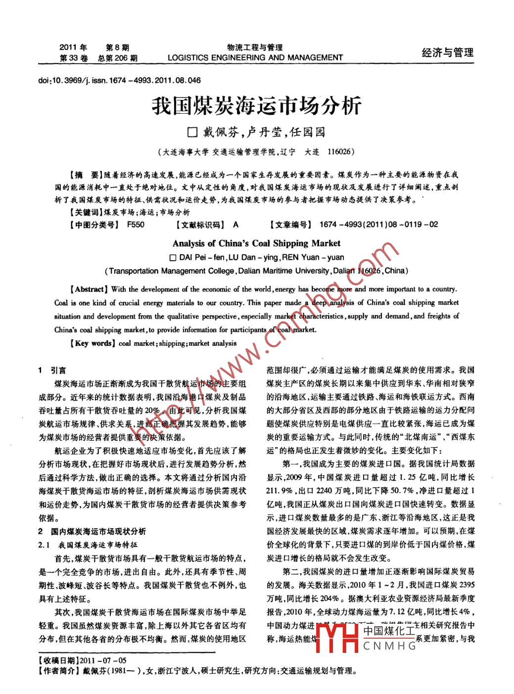 2011年第8期物流工程與管理經(jīng)濟(jì)與管理第33卷總第206 期LOGISTICS ENGINEERING AND MANAGEMENTdoi:10. 3969/j. issn. 1674 - 4993.2011.08.046我國(guó)煤炭海運(yùn)市場(chǎng)分析口戴佩芬,盧丹瑩,任園園(大連海事大學(xué)交通運(yùn)輸管理學(xué)院,遼寧大連116026)[摘要]隨著經(jīng)濟(jì)的高速發(fā)展,能源已經(jīng)成為一個(gè)國(guó)家生存發(fā)展的重要因素。煤炭作為一種主要的能源物資在我國(guó)的能源消耗中一-直處于絕對(duì)地位。文中從定性的角度,對(duì)我國(guó)煤炭海運(yùn)市場(chǎng)的現(xiàn)狀及發(fā)展進(jìn)行了詳細(xì)闡述,重點(diǎn)剖析了我國(guó)煤炭市場(chǎng)的特征、供需狀況和運(yùn)價(jià)走勢(shì),為我國(guó)煤炭市場(chǎng)的參與者把握市場(chǎng)動(dòng)態(tài)提供了決策參考。.[關(guān)鍵詞]煤炭市場(chǎng);海運(yùn);市場(chǎng)分析[中圖分類號(hào)] F550. I文獻(xiàn)標(biāo)識(shí)碼] A[文章編號(hào)] 1674 -4993(2011 )08 -0119 -02Analysis of China's Coal Shipping Market0 DAI Pei-fen,LU Dan -ying,REN Yuan - yuan(Transportation Management College, Dalian Maritime University , Dalian 116026 ,China)[ Abstract] With the development of the economic of the world , energy has become more and more important to a country.Coal is one kind of crucial energy materials to our country. This paper made a deep analysis of China's coal shipping marketsituation and development from the qualitative perspective , especialy market charaterstics , 8upply and demand , and freights ofChina's coal shipping market , to provide information for participants of coal market.[Key words] coal market ; shipping; market analysis1引言范圍卻很廣,必須通過(guò)運(yùn)輸才能滿足煤炭的使用需求。我國(guó)煤炭海運(yùn)市場(chǎng)正漸漸成為我國(guó)千散貨航運(yùn)市場(chǎng)的主要組煤炭主產(chǎn)區(qū)的煤炭長(zhǎng)期以來(lái)集中供應(yīng)到華東、華南相對(duì)狹窄成部分。近年來(lái)的統(tǒng)計(jì)數(shù)據(jù)表明,我國(guó)沿海港口煤炭及制品的沿海地區(qū),運(yùn)輸主要通過(guò)鐵路、海運(yùn)和海鐵聯(lián)運(yùn)方式。西南吞吐量占所有干散貨吞吐量的20%。由此可見(jiàn),分析我國(guó)煤的大部分省區(qū)及西部的部分地區(qū)由于鐵路運(yùn)輸?shù)倪\(yùn)力分配問(wèn)炭航運(yùn)市場(chǎng)規(guī)律、供求關(guān)系,進(jìn)而正確把握其發(fā)展趨勢(shì),能夠題使煤炭供應(yīng)特別是電煤供應(yīng)一直比較 緊張,海運(yùn)已成為煤為煤炭市場(chǎng)的經(jīng)營(yíng)者提供重要的決策依據(jù)。炭的重要運(yùn)輸方式。與此同時(shí),傳統(tǒng)的“北煤南運(yùn)”、“西煤東航運(yùn)企業(yè)為了積極快速地適應(yīng)市場(chǎng)變化,首先應(yīng)該了解運(yùn)"的格局也正發(fā)生著微妙的變化。主要變化如下:分析市場(chǎng)現(xiàn)狀,在把握好市場(chǎng)現(xiàn)狀后,進(jìn)行發(fā)展趨勢(shì)分析,然第一,我國(guó)成為主要的煤炭進(jìn)口國(guó)。據(jù)我國(guó)統(tǒng)計(jì)局?jǐn)?shù)據(jù)后通過(guò)科學(xué)方法,做出正確的選擇。本文將通過(guò)分析國(guó)內(nèi)沿顯示,2009年,中國(guó)煤炭進(jìn)口量超過(guò)1.25億噸,同比增長(zhǎng).海煤炭干散貨海運(yùn)市場(chǎng)的特征,剖析煤炭海運(yùn)市場(chǎng)供需現(xiàn)狀211. 9% ,出口2240萬(wàn)噸,同比下降50.79% ,凈進(jìn)口量超過(guò)1和運(yùn)價(jià)走勢(shì),為國(guó)內(nèi)煤炭干散貨市場(chǎng)的經(jīng)營(yíng)者提供決策參考億噸,我國(guó)正從煤炭出口國(guó)向煤炭進(jìn)口國(guó)快速轉(zhuǎn)變。數(shù)據(jù)顯示,進(jìn)口煤炭數(shù)量最多的是廣東、浙江等沿海地區(qū),這正是我2國(guó)內(nèi)煤炭海運(yùn) 市場(chǎng)現(xiàn)狀分析國(guó)經(jīng)濟(jì)發(fā)展最快的區(qū)域.煤炭需求逐年增加??梢灶A(yù)期,在煤.1 我國(guó)煤炭海運(yùn)市場(chǎng)特征價(jià)全球化的背景下,只要進(jìn)口煤的到岸價(jià)低于國(guó)內(nèi)煤價(jià)格,煤首先,煤炭干散貨市場(chǎng)具有一般干散貨航運(yùn)市場(chǎng)的特點(diǎn),炭進(jìn)口增長(zhǎng)的格局就不會(huì)發(fā)生改變。是一個(gè)完全競(jìng)爭(zhēng)的市場(chǎng),進(jìn)出自由。此外,還具有季節(jié)性、周第二,我國(guó)煤炭的進(jìn)口量增加正逐漸影響國(guó)際煤炭貿(mào)易期性.波峰短、波谷長(zhǎng)等特點(diǎn)。我國(guó)煤炭干散貨也不例外,也的發(fā)展。海關(guān)數(shù)據(jù)顯示,2010年1 ~2月,我國(guó)進(jìn)口煤炭2395具有上述特征。萬(wàn)噸,同比增長(zhǎng)204%。據(jù)澳大利亞農(nóng)業(yè)資源經(jīng)濟(jì)局最新季度其次,我國(guó)煤炭干散貨海運(yùn)市場(chǎng)在國(guó)際煤炭市場(chǎng)中舉足報(bào)告,2010年,全球動(dòng)力煤海運(yùn)最為7.12億噸,同比增長(zhǎng)4%,輕重。我國(guó)雖然煤炭資源豐富,除上海以外其它各省區(qū)均有中國(guó)動(dòng)力煤進(jìn)中國(guó)煤化工相關(guān)研研究報(bào)告中分布,但在其他各省的分布極不均衡。然而,煤炭的使用地區(qū)稱,海運(yùn)熱能熔系更加緊密,與我YHCNMH G'[收稿日期]2011-07-05.[作者簡(jiǎn)介]戴佩芬(1981- ),女,浙江寧波人,碩士研究生,研究方向:交通運(yùn)輸規(guī)劃與管理。120物流工程與管理。第33卷國(guó)巨大且不斷增加的進(jìn)口密不可分。,運(yùn)量的70%以上。而鐵路運(yùn)輸