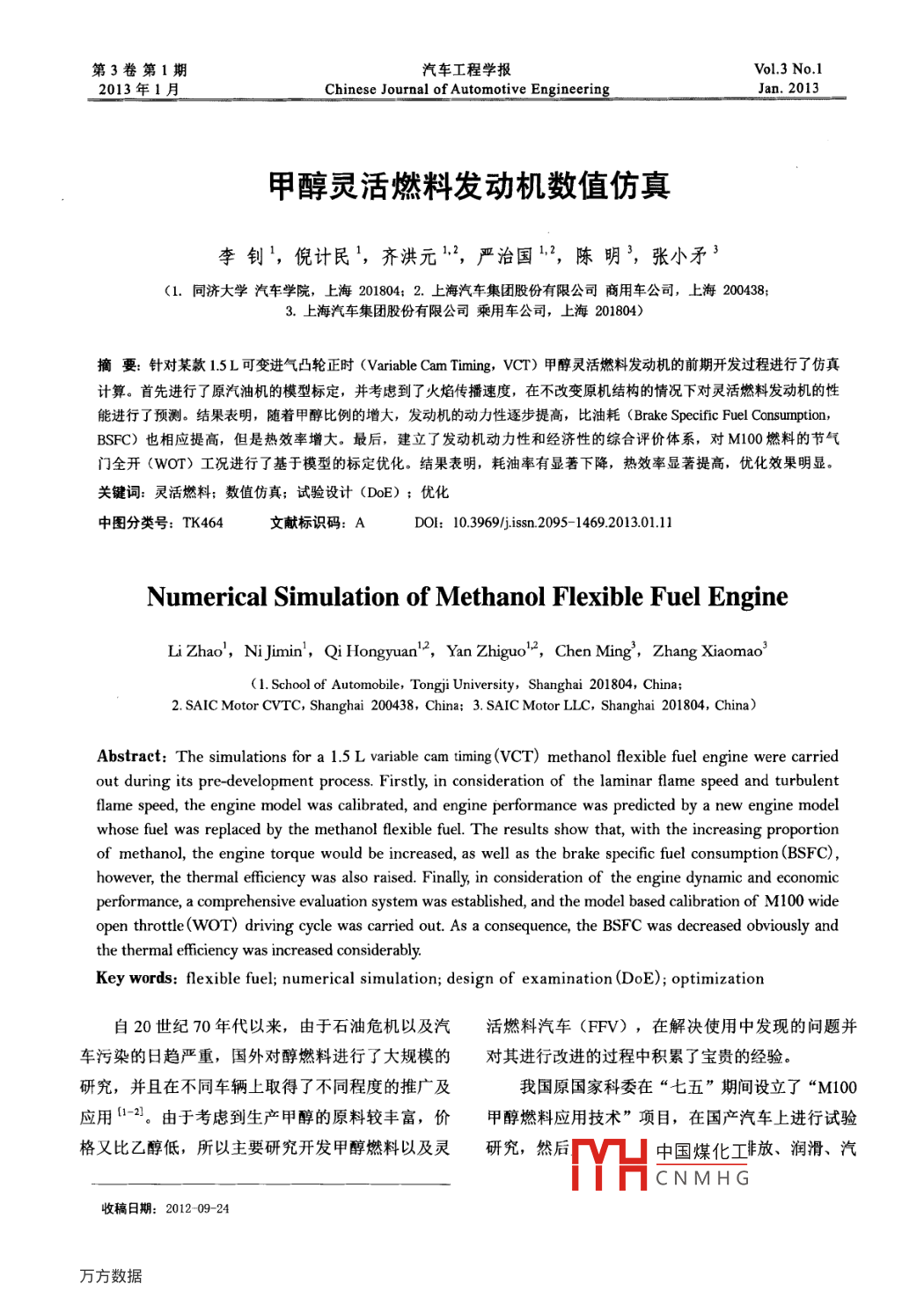 第3卷第1期汽車工程學報Vol 3 No. 12013年1月Chinese Journal of Automotive engineeringJan.2013甲醇靈活燃料發(fā)動機數(shù)值仿真李釗',倪計民',齊洪元,2,嚴治國1,陳明3,張小矛(1.同濟大學汽車學院,上海201804;2.上海汽車集團股份有限公司商用車公司,上海2004383.上海汽車集團股份有限公司乘用車公司,上海201804)摘要:針對某款15L可變進氣凸輪正時( Variable Cam Timing,vCT)甲醇靈活燃料發(fā)動機的前期開發(fā)過程進行了仿真計算。首先進行了原汽油機的模型標定,并考慮到了火焰?zhèn)鞑ニ俣?在不改變原機結構的情況下對靈活燃料發(fā)動機的性能進行了預測。結果表明,隨著甲醇比例的增大,發(fā)動機的動力性逐步提高,比油耗( Brake Specific Fuel Consumption,BSFC)也相應提高,但是熱效率增大。最后,建立了發(fā)動機動力性和經(jīng)濟性的綜合評價體系,對M100燃料的節(jié)氣門全開(woT)工況進行了基于模型的標定優(yōu)化。結果表明,耗油率有顯著下降,熱效率顯著提高,優(yōu)化效果明顯。關鍵詞:靈活燃料;數(shù)值仿真;試驗設計(DoE);優(yōu)化中圖分類號:TK464文獻標識碼:ADO:10.3969/issn.2095-14692013.01.11Numerical Simulation of Methanol Flexible Fuel EngineLi Zhao, Ni Jimin,, Qi Hongyuan, Yan Zhiguo", Chen Ming, Zhang Xiaomao(1. School of Automobile, Tongji University, Shanghai 201804, China2. SAIC Motor CVTC, Shanghai 200438, China; 3. SAIC Motor LLC, Shanghai 201804, China)Abstract: The simulations for a 1.5 L variable cam timing (VcT)methanol flexible fuel engine were carriedout during its pre-development process. Firstly, in consideration of the laminar flame speed and turbulentflame speed, the engine model was calibrated, and engine performance was predicted by a new engine modelwhose fuel was replaced by the methanol flexible fuel. The results show that, with the increasing proportionof methanol, the engine torque would be increased, as well as the brake specific fuel consumption (BSFC)however, the thermal efficiency was also raised. Finally, in consideration of the engine dynamic and economicerformance, a comprehensive evaluation system was established and the model based calibration of m100 wideopen throttle(wot)driving cycle was carried out. As a consequence, the BSFC was decreased obviously andthe thermal efficiency was increased considerablKey words: flexible fuel; numerical simulation; design of examination (DoE);optimization自20世紀70年代以來,由于石油危機以及汽活燃料汽車(FFV),在解決使用中發(fā)現(xiàn)的問題并車污染的日趨嚴重,國外對醇燃料進行了大規(guī)模的對其進行改進的過程中積累了寶貴的經(jīng)驗。研究,并且在不同車輛上取得了不同程度的推廣及我國原國家科委在“七五”期間設立了“M100應用-23。由于考慮到生產(chǎn)甲醇的原料較豐富,價甲醇燃料應用技術”項目,在國產(chǎn)汽車上進行試驗格又比乙醇低,所以主要研究開發(fā)甲醇燃料以及靈研究,然后中國煤化工非放、潤滑、汽CNMHG收稿日期:2012-09-24第1期李釗等:甲醇靈活燃料發(fā)動機數(shù)值仿真067車實際使用等試驗研究;山西云岡汽車集團公司也1.2發(fā)動機建模在車用汽油機的基礎上開發(fā)成功M00發(fā)動機;GT- Power一維仿真模型如圖1所示。西安交通大學和天津大學分別對靈活燃料缸內(nèi)直噴模型包括進氣系統(tǒng)、排氣系統(tǒng)、氣缸、曲柄發(fā)動機和甲醇H燃燒特性與排放進行了研究6。連桿機構等。其中發(fā)動機結構參數(shù)、空燃比、配氣本文針對靈活燃料發(fā)動機的前期開發(fā),使用一相位等直接輸入到模型中,在管內(nèi)流體計算上,用款國產(chǎn)15LVCT發(fā)動機,進行了甲醇靈活燃料發(fā)維非定常流動來代替實際復雜的三維流動,用動機的數(shù)值仿真研究,針對M100燃料的WTo工 Woschni傳熱模型來計算發(fā)動機的傳熱,在燃燒方?jīng)r進行了基于模型的標定,對點火提前角以及過量面,采用湍流火焰?zhèn)鞑ツP涂諝庀禂?shù)進行了優(yōu)化,為靈活燃料發(fā)動機的前期開1.2.1湍流火焰?zhèn)鞑ツP桶l(fā)提供了依據(jù)。湍流火焰?zhèn)鞑ツP涂紤]到了氣缸的尺寸,點火發(fā)動機數(shù)值模型的建立與標定提前角、氣流運動和燃料性質(zhì)。進入火焰前鋒的質(zhì)量卷吸率和燃燒速率可以由以下幾個方程來表示。1.1發(fā)動機基本參數(shù)質(zhì)量卷吸率:發(fā)動機的基本參數(shù)見表1。Ae(S+sn)表11.5LV0T發(fā)動機參數(shù)缸徑B/mm質(zhì)量燃燒速率:沖程S/mm84.8dM,M。-M1最大轉矩TN·m135(5000r/min最大功率P/kW78(6000r/min)并且壓縮比VCT型式進氣排氣雙CT(3)式中:M為未燃混合氣卷吸質(zhì)量,kg;p為未燃混合氣密度,g/cm3;A為火焰前鋒面積,m2;Sr為湍流火焰速度,kg:S2為層流火焰速度,kg;M為燃混合氣質(zhì)量,kg;τ為時間常數(shù),s;λ為 Taylor微尺度,從式(1)~(3)中可知,卷入火焰前鋒的未燃混合氣的速率與湍流火焰速度和層流火焰速度之和成正比,燃燒速率與未燃混合氣質(zhì)量成正比,比例為時間常數(shù)r(s)的倒數(shù),時間常數(shù)為 Taylor微尺度比層流火焰速度。其中,火焰?zhèn)鞑ニ俣葹閷恿骰鹧嫠俣扰c湍流火焰速度之和,且層流火焰?zhèn)鞑ニ俣惹袨橄暺髋c催化器,8YH國化圖115 L VCT GT- power發(fā)動機模型(1-2.06(Dilution)(4)068汽車工程學報第3卷湍流火焰?zhèn)鞑ニ俣葹镾=S4+002v',(5)式中:Bn為最大層流火焰速度,m/s;B為層流速度衰減值,m/s;中為過量空氣系數(shù);φn為最大層流火焰速度對應的過量空氣系數(shù);Tm=298K;Pmr=100kPa;T為未燃氣體溫度,K;p為缸內(nèi)壓試