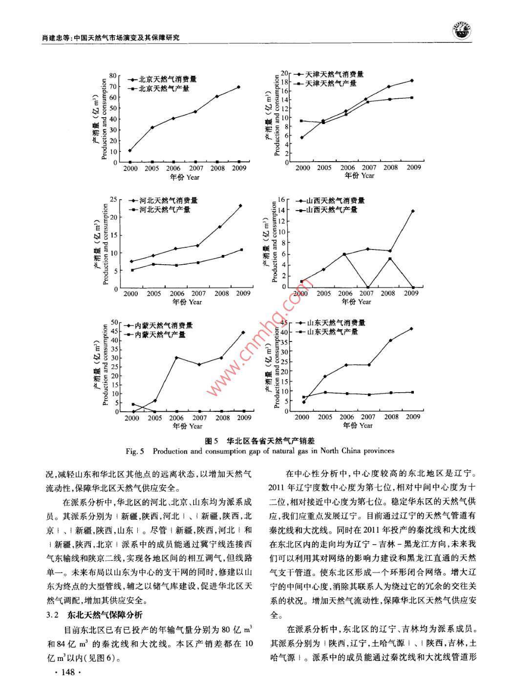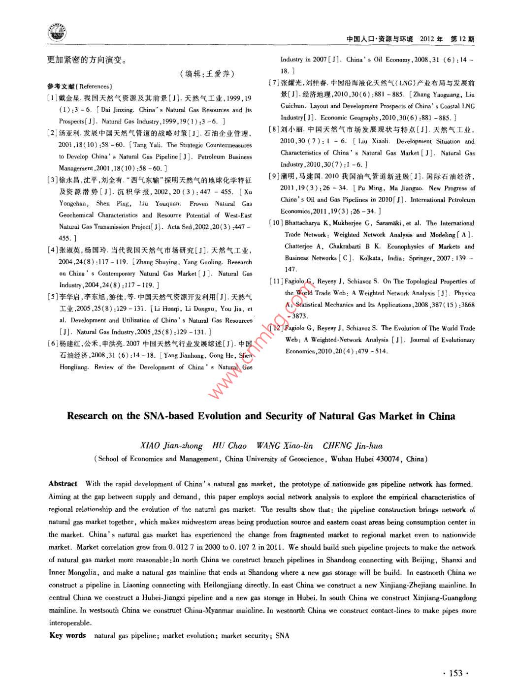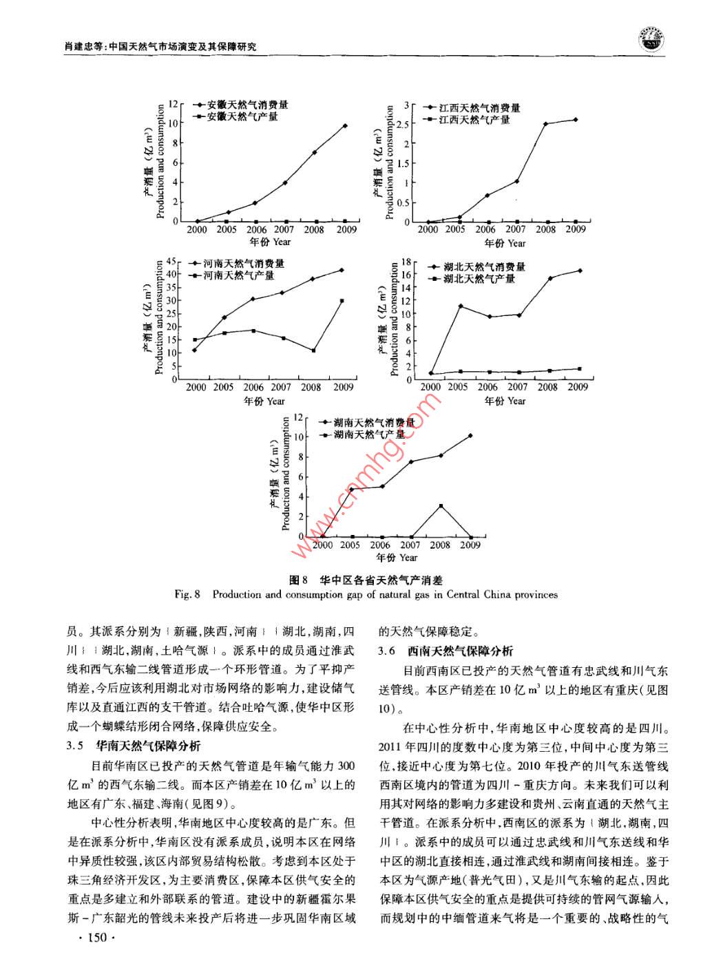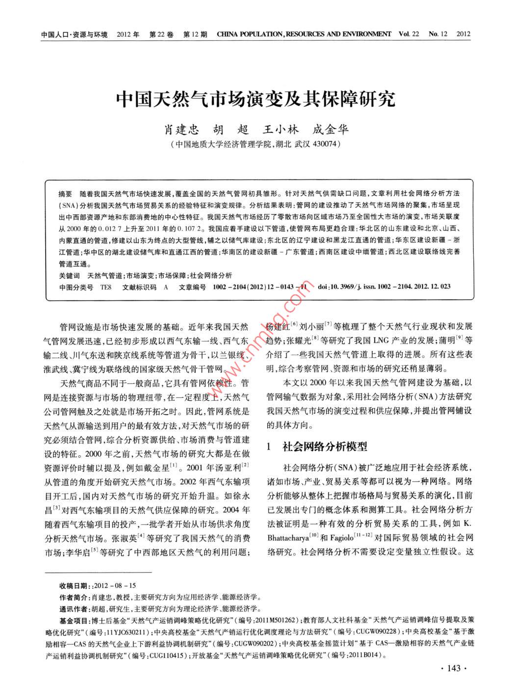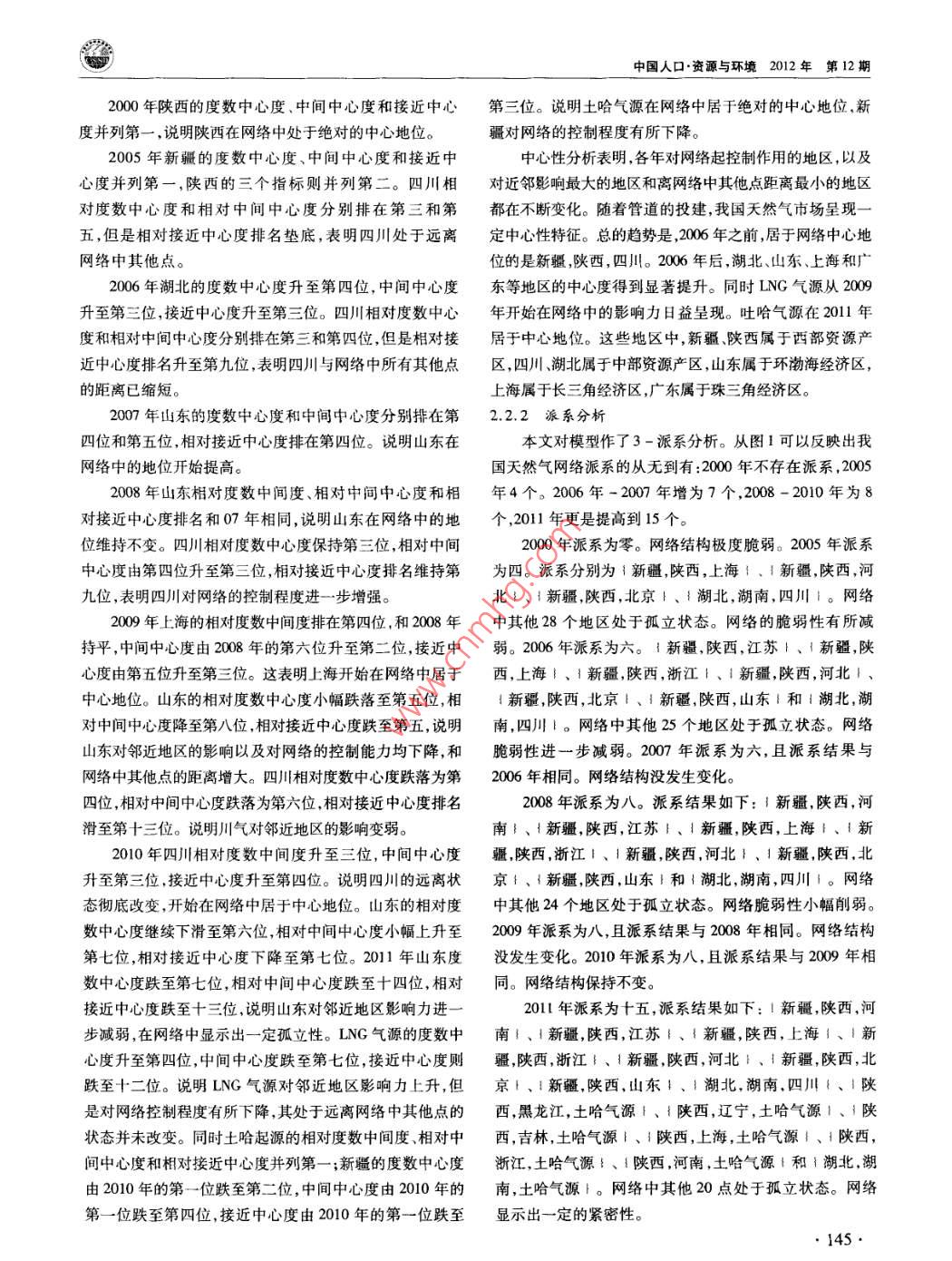 中國人口·資源與環(huán)境2012年第22卷第12期 CHINA POPULATION, RESOURCES AND ENVIRONMENT Vol22N0.122012中國天然氣市場演變及其保障研究肖建忠胡超王小林成金華(中國地質(zhì)大學(xué)經(jīng)濟(jì)管理學(xué)院,湖北武漢430074)摘要隨著我國天然氣市場快速發(fā)展,覆蓋全國的天然氣管網(wǎng)初具雛形。針對天然氣供需缺口問題,文章利用社會網(wǎng)絡(luò)分析方法SNA)分析我國天然氣市場貿(mào)易關(guān)系的經(jīng)驗(yàn)特征和演變規(guī)律。分析結(jié)果表明:管網(wǎng)的建設(shè)推動了天然氣市場網(wǎng)絡(luò)的聚集,市場呈現(xiàn)出中西部資源產(chǎn)地和東部消費(fèi)地的中心性特征。我國天然氣市場經(jīng)歷了零散市場向區(qū)域市場乃至全國性大市場的演變,市場關(guān)聯(lián)度從2000年的0.0127上升至2011年的0.1072。我國應(yīng)著手建設(shè)以下管道,使管網(wǎng)布局更趨合理:華北區(qū)的山東建設(shè)和北京、山西、內(nèi)蒙直通的管道,修建以山東為終點(diǎn)的大型管線,輔之以儲氣庫建設(shè);東北區(qū)的遼寧建設(shè)和黑龍江直通的管道;華東區(qū)建設(shè)新疆-浙江管道;華中區(qū)的湖北建設(shè)儲氣庫和直通江西的管道;華南區(qū)的建設(shè)新疆-廣東管道;西南區(qū)建設(shè)中緬管道;西北區(qū)建設(shè)聯(lián)絡(luò)線完善管道互通。關(guān)鍵詞天然氣管道;市場演變;市場保障;社會網(wǎng)絡(luò)分析中圖分類號TE8文獻(xiàn)標(biāo)識碼A文章編號1002-2104(2012)12-0143-11doi:10.3969/Jisn1002-21042012.12.023管網(wǎng)設(shè)施是市場快速發(fā)展的基礎(chǔ)。近年來我國天然楊建紅劉小麗等梳理了整個天然氣行業(yè)現(xiàn)狀和發(fā)展氣管網(wǎng)發(fā)展迅速,已經(jīng)初步形成以西氣東輸一線、西氣東趨勢;張耀光等研究了我國LNG產(chǎn)業(yè)的發(fā)展;蒲明”等輸二線、川氣東送和陜京線系統(tǒng)等管道為骨干,以蘭銀線、介紹了一些我國天然氣管道上取得的進(jìn)展。所有這些表淮武線、冀寧線為聯(lián)絡(luò)線的國家級天然氣骨干管網(wǎng)。明,綜合考察管網(wǎng)、資源和市場的研究還稍顯薄弱。天然氣商品不同于一般商品,它具有管網(wǎng)依賴性。管本文以2000年以來我國天然氣管網(wǎng)建設(shè)為基礎(chǔ),以網(wǎng)是連接資源與市場的物理紐帶,在一定程度上,天然氣管網(wǎng)輸氣數(shù)據(jù)為對象,采用社會網(wǎng)絡(luò)分析(SNA)方法研究公司管網(wǎng)觸及之處就是市場開拓之時。因此,管網(wǎng)系統(tǒng)是我國天然氣市場的演變過程和供應(yīng)保障,并提出管網(wǎng)鋪設(shè)天然氣從源輸送到用戶的最有效方法,對天然氣市場的研的具體方向。究必須結(jié)合管網(wǎng),綜合分析資源供給、市場消費(fèi)與管道建設(shè)的特征。2000年之前,天然氣市場的研究大都是在做1社會網(wǎng)絡(luò)分析模型資源評價時輔以提及,例如戴金星。2001年湯亞利2社會網(wǎng)絡(luò)分析(SNA)被廣泛地應(yīng)用于社會經(jīng)濟(jì)系統(tǒng)從管道的角度開始研究天然氣市場。2002年西氣東輸項(xiàng)諸如市場、產(chǎn)業(yè)、貿(mào)易關(guān)系等都可以視為一種網(wǎng)絡(luò)。網(wǎng)絡(luò)目開工后,國內(nèi)對天然氣市場的研究開始升溫。如徐永分析能夠從整體上把握市場格局與貿(mào)易關(guān)系的演化,目前昌3對西氣東輸項(xiàng)目的天然氣供應(yīng)保障的研究。2004年已發(fā)展出專門的概念體系和測算工具。社會網(wǎng)絡(luò)分析方隨著西氣東輸項(xiàng)目的投產(chǎn),一批學(xué)者開始從市場供求角度法被證明是一種有效的分析貿(mào)易關(guān)系的工具,例如K分析天然氣市場。張淑英4等研究了我國天然氣的消費(fèi) Bhattacharya和 Fagiolo-12對國際貿(mào)易領(lǐng)域的社會網(wǎng)市場;李華啟5等研究了中西部地區(qū)天然氣的利用問題;絡(luò)研究。社會網(wǎng)絡(luò)分析不需要設(shè)定變量獨(dú)立性假設(shè)。這收稿日期::2012-08-15作者簡介:肖建忠,教授,主要研究方向?yàn)閼?yīng)用經(jīng)濟(jì)學(xué)能源經(jīng)濟(jì)學(xué)通訊作者:胡超,研究生,主要研究方向?yàn)槔碚摻?jīng)濟(jì)學(xué)、能源經(jīng)濟(jì)學(xué)基金項(xiàng)目:博士后基金“天然氣產(chǎn)運(yùn)銷調(diào)峰策略優(yōu)化研究”(編號:2011M501262);教育部人文社科基金“天然氣產(chǎn)運(yùn)銷調(diào)峰信號提取及策略優(yōu)化研究”(編號:11YJC630211);中央高校基金“天然氣產(chǎn)銷運(yùn)行優(yōu)化調(diào)度理論與方法研究”(編號:CUGW090228);中央高?;稹盎诩钕嗳荨狢AS的天然氣企業(yè)上下游利益協(xié)調(diào)機(jī)制研究”(編號:CUGW090202);中央高?;饟u籃計劃“基于CAS激勵相容的天然氣產(chǎn)業(yè)鏈產(chǎn)運(yùn)銷利益協(xié)調(diào)機(jī)制研究”(編號:CUG110415);開放基金“天然氣產(chǎn)運(yùn)銷調(diào)峰策略優(yōu)化研究”(編號:2011B∞014)。肖建忠等:中國天然氣市場演變及其保障研究在處理關(guān)系數(shù)據(jù)時擁有了比其他統(tǒng)計方法極大的優(yōu)勢。黃海這三大海上天然氣富集區(qū)、進(jìn)口LNG以及西氣東輸SNA方法中采用較為普遍的指標(biāo)是中心性、派系以及關(guān)聯(lián)二線境外段的土庫曼斯坦-哈薩克斯坦管道以供給氣源度等,本文將對以上指標(biāo)展開分析。形式納入我國天然
